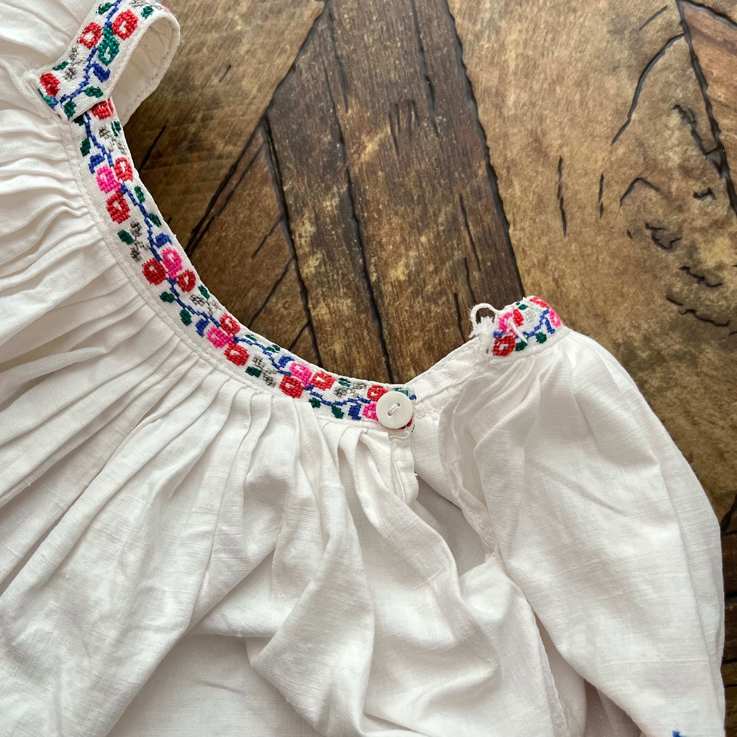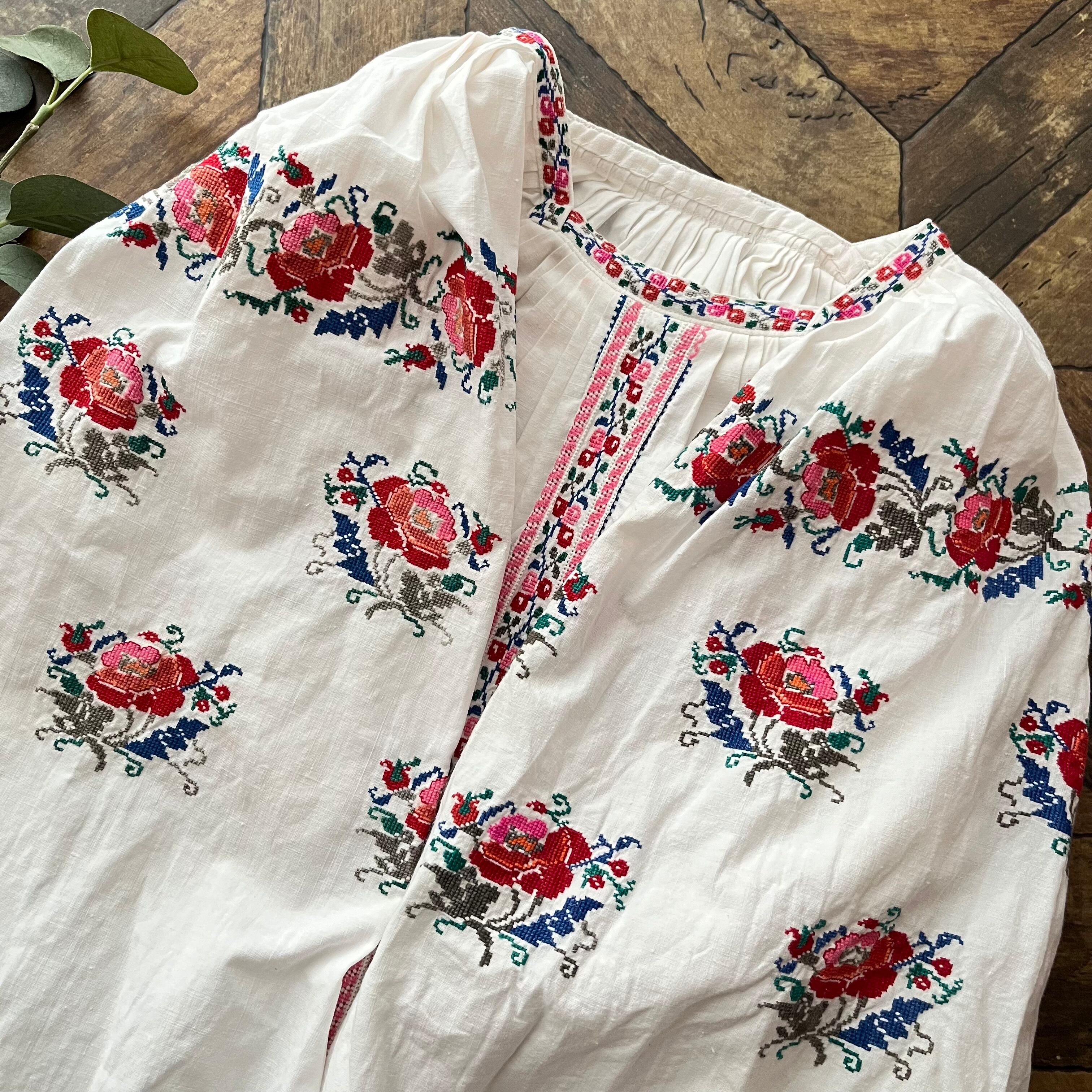 新鮮なスクエアネックとピンク×赤のバラ刺繍がとてもキュートなウクライナ刺繡ワンピース。