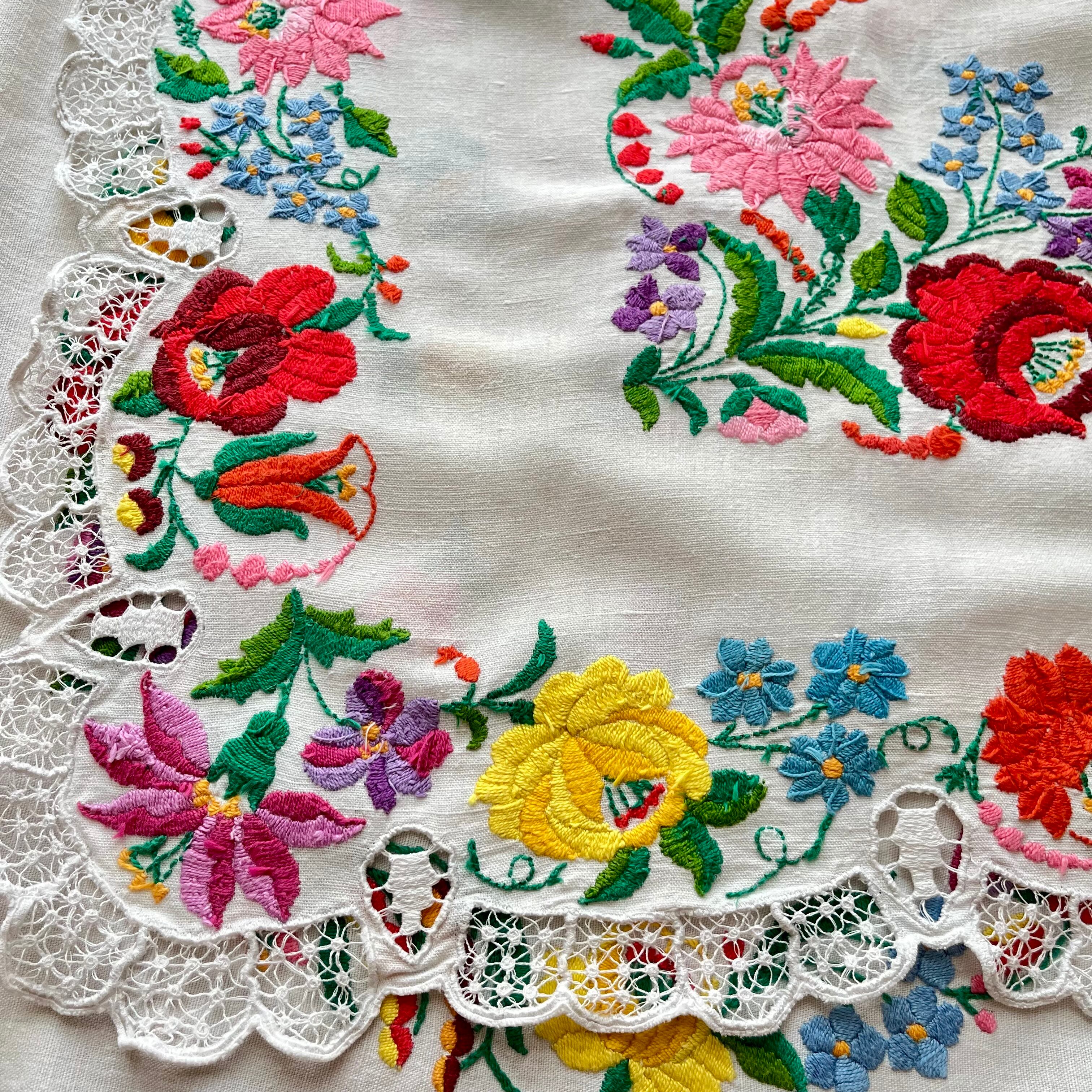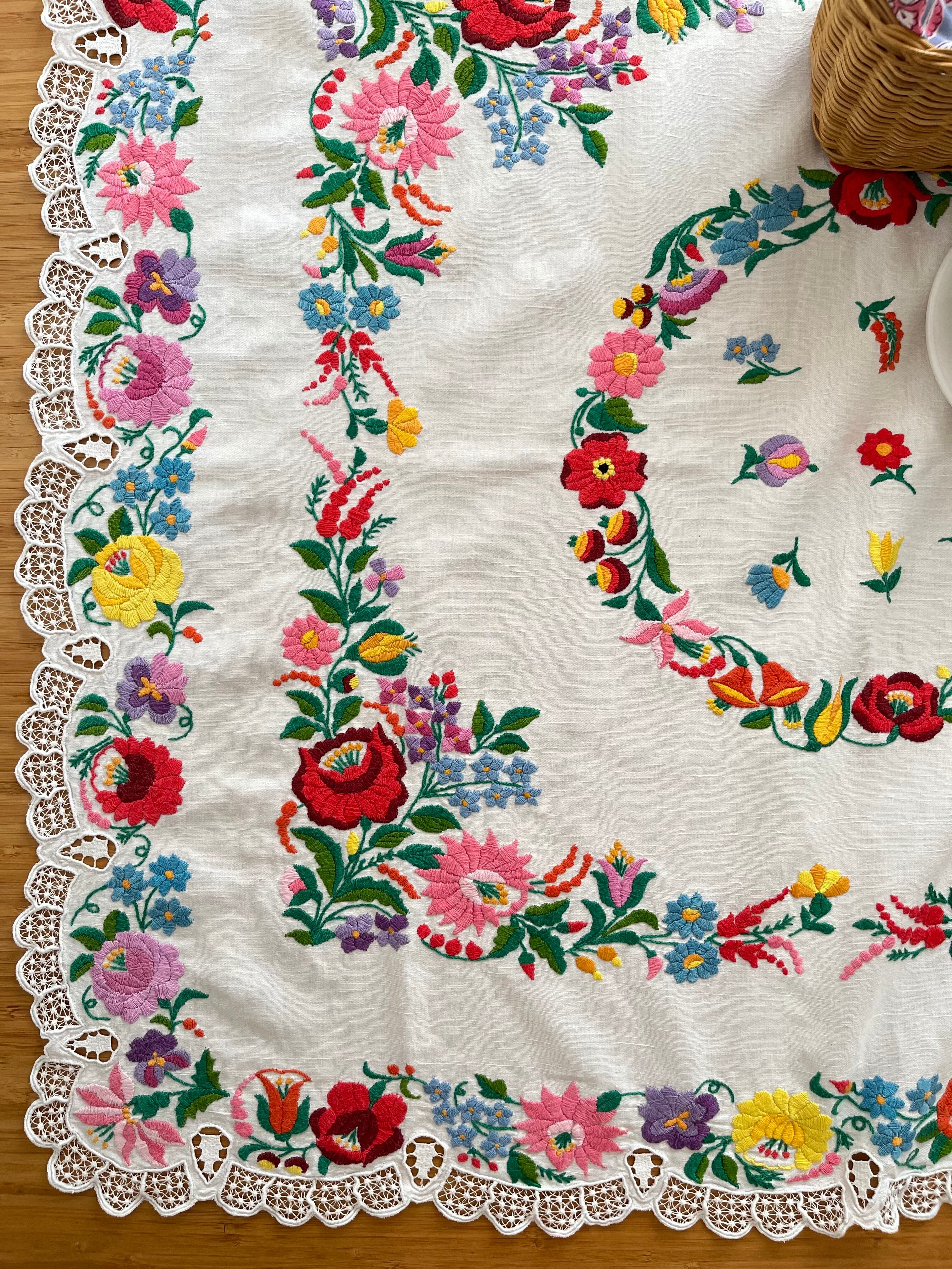 【超傑作】リネンのカロチャ刺繍テーブルクロス ヴィンテージ カロチャ刺繍 100 ×91 cm