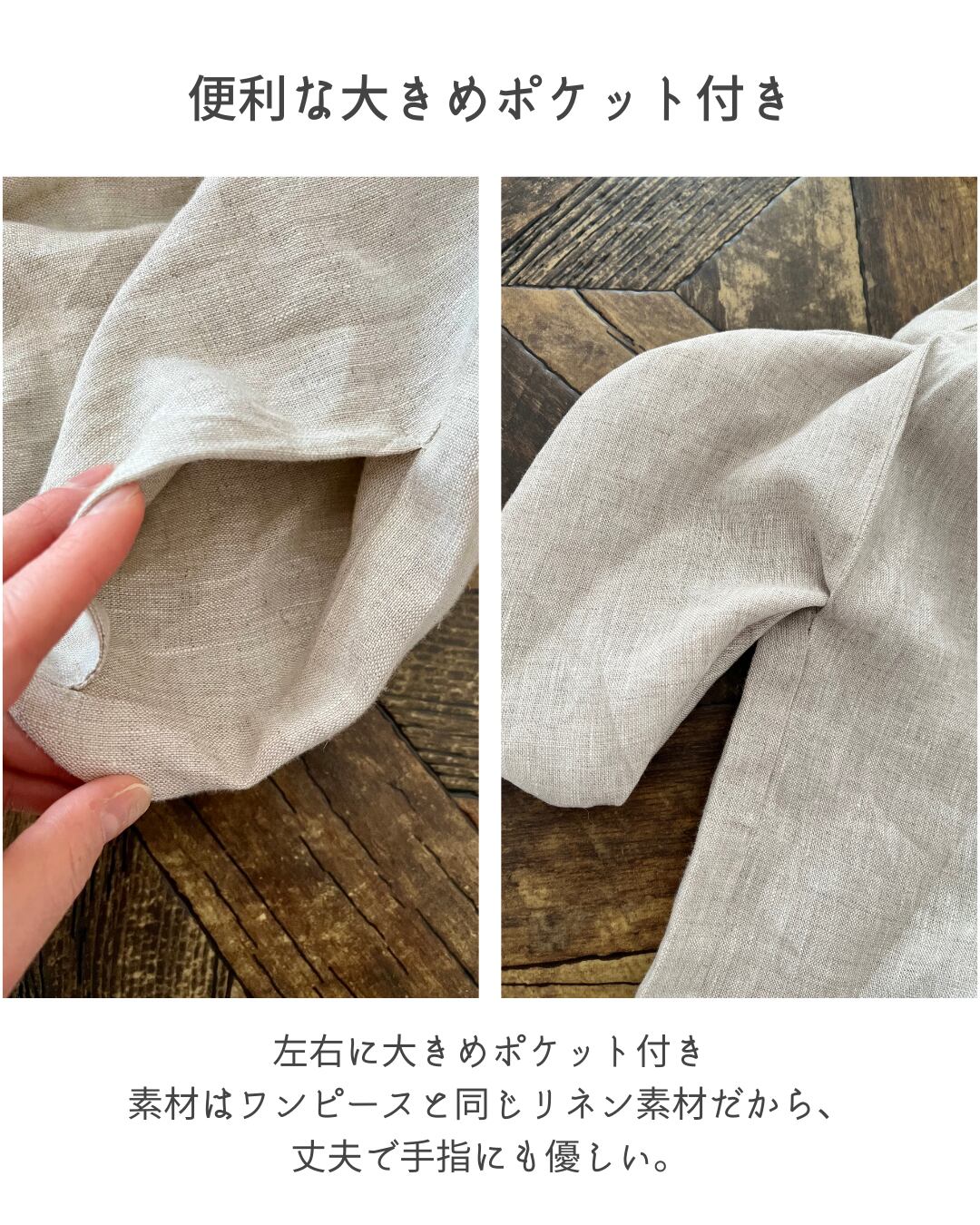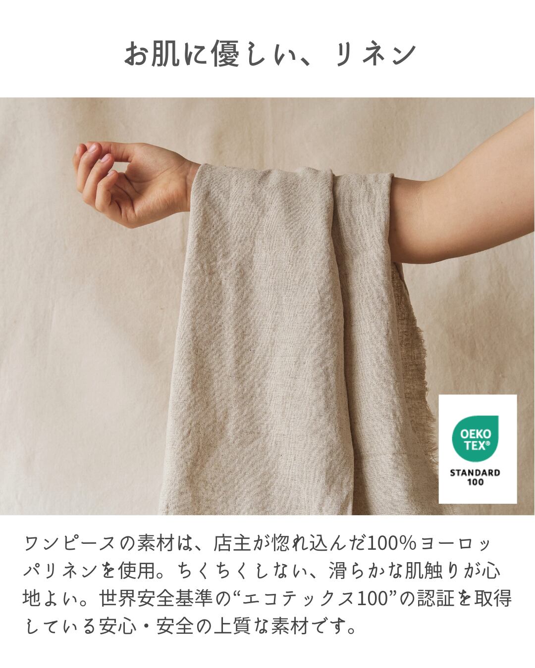 ワンピースの素材は、店主が惚れ込んだヨーロッパリネン100%。ちくちくしない、滑らかな肌触りが心地よい。