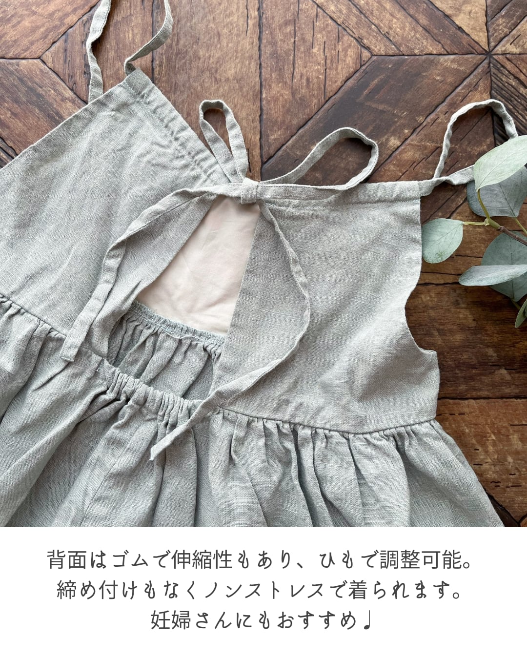 背面のリネンひもで着丈を自由自在に調節できます。約110~130cmくらいまで着丈の長さを変えられるため、身長に合わせられるのはもちろん、さまざまな着こなしを楽しめます。