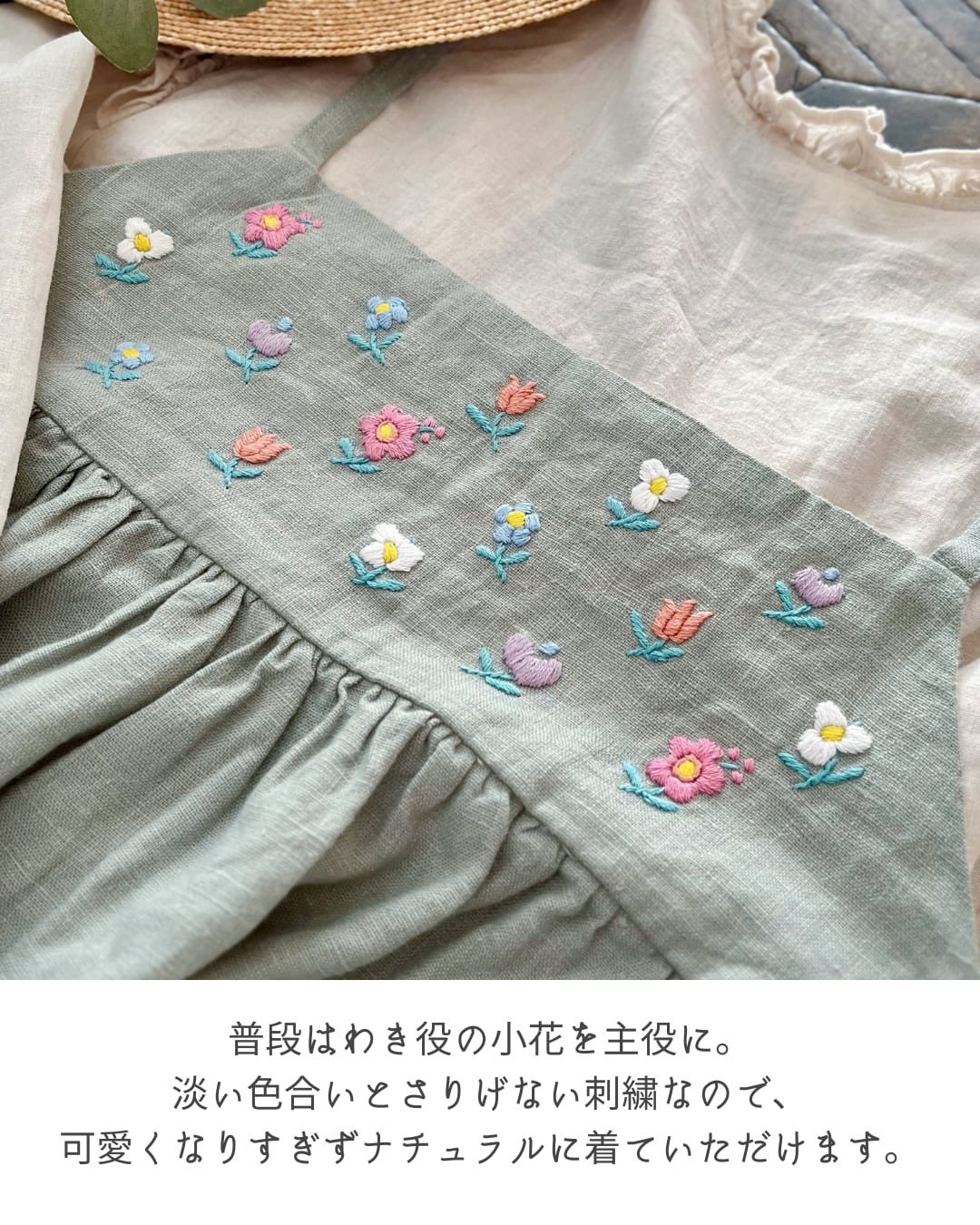●永くご着用いただくために、中性洗剤にてドライコース(おしゃれ着コース)で単品洗い、陰干しいただくことをおすすめします。優しくお手入れしていただくことで、リネンへのダメージや刺繍の色をキープできます。
