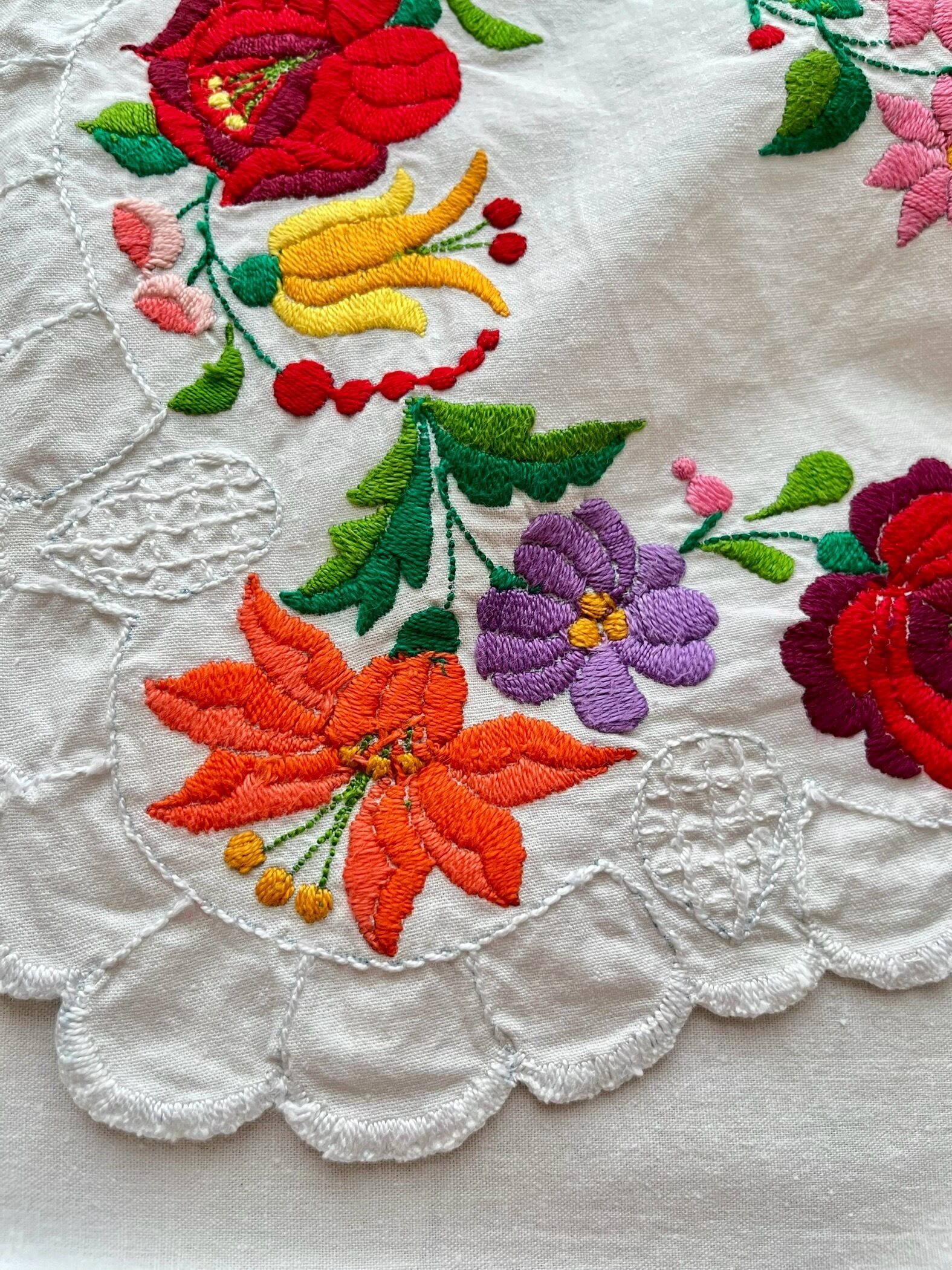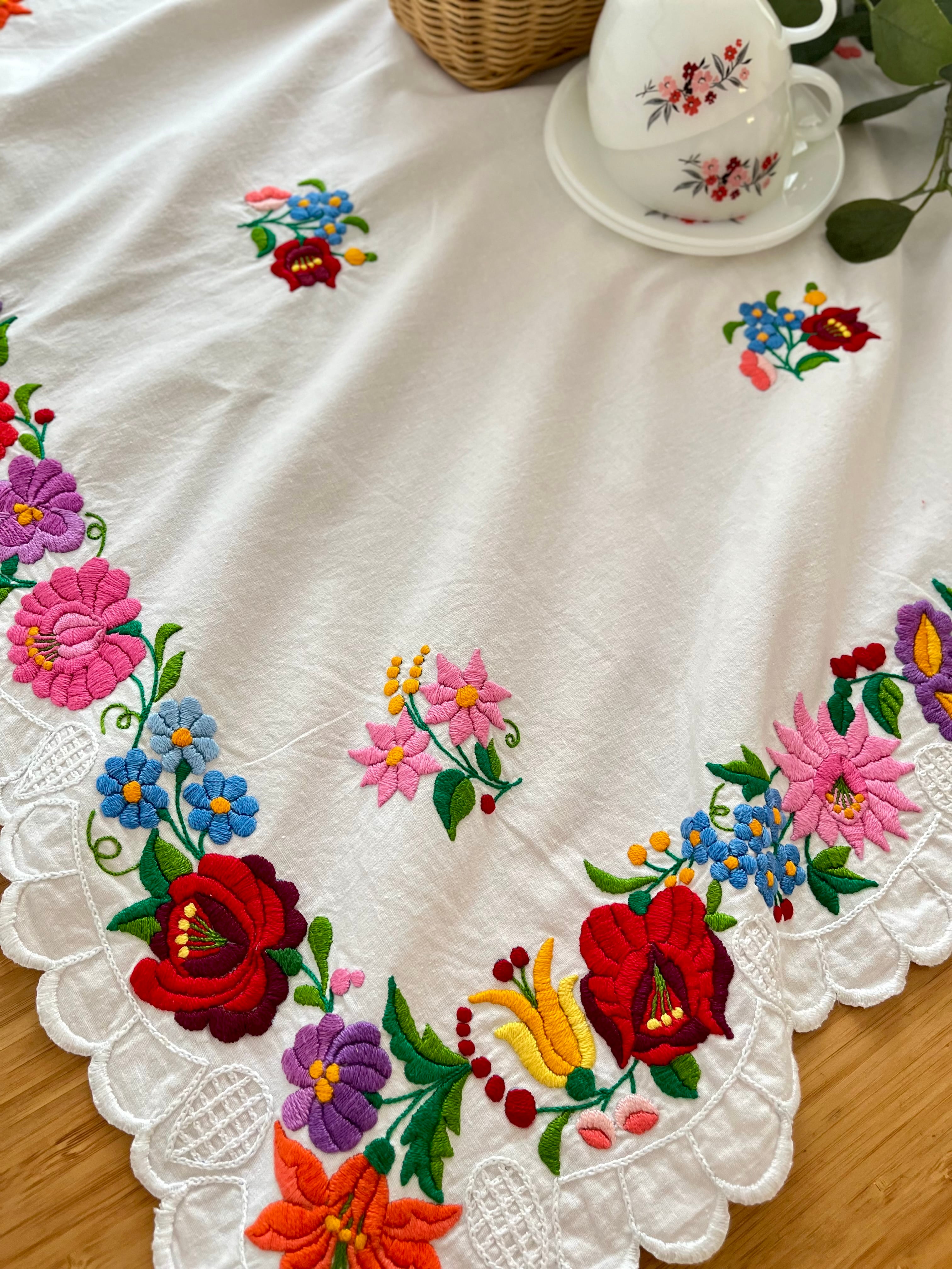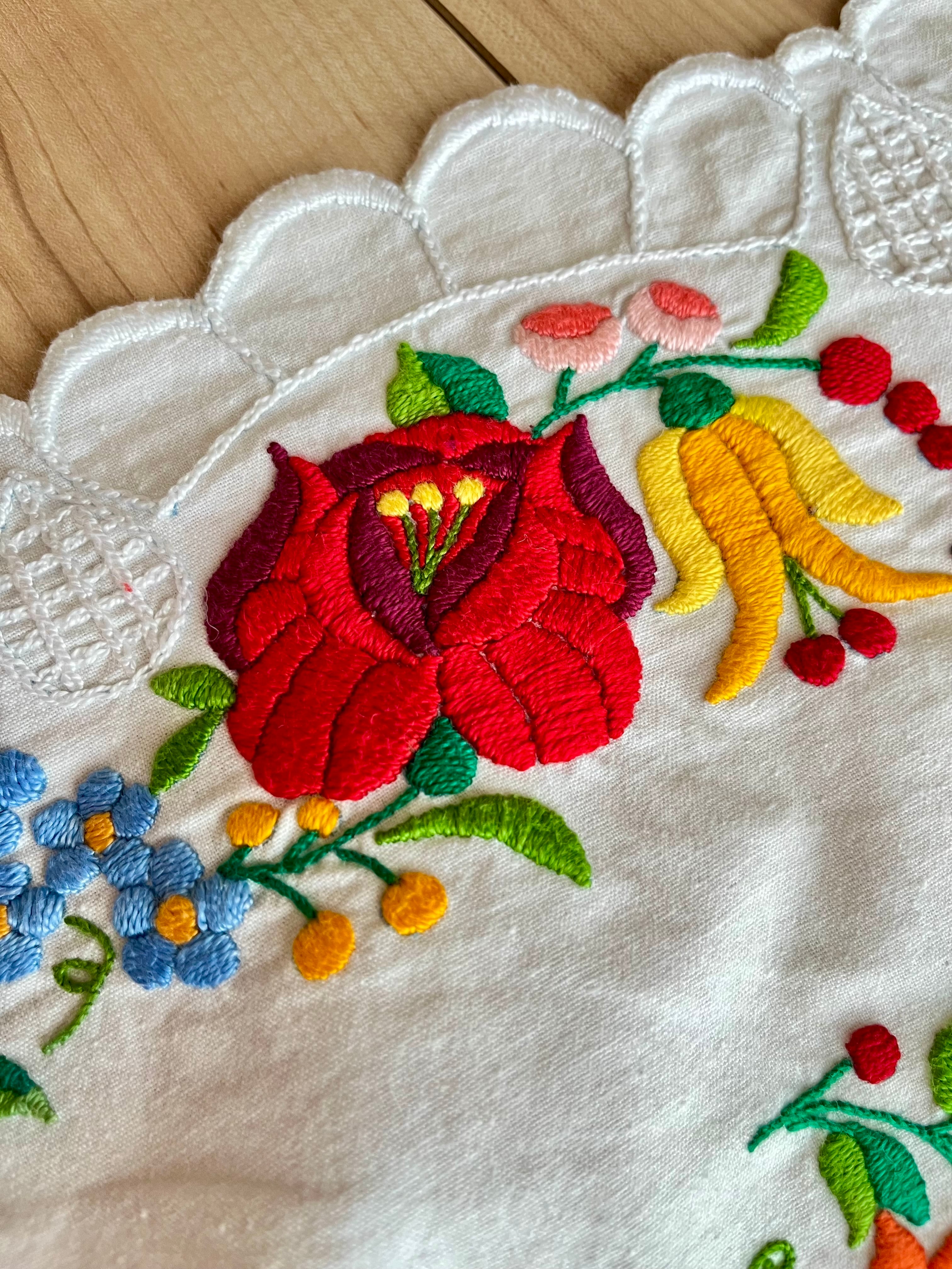 フリル縁がかわいいテーブルクロス ヴィンテージ カロチャ刺繍 87×80cm