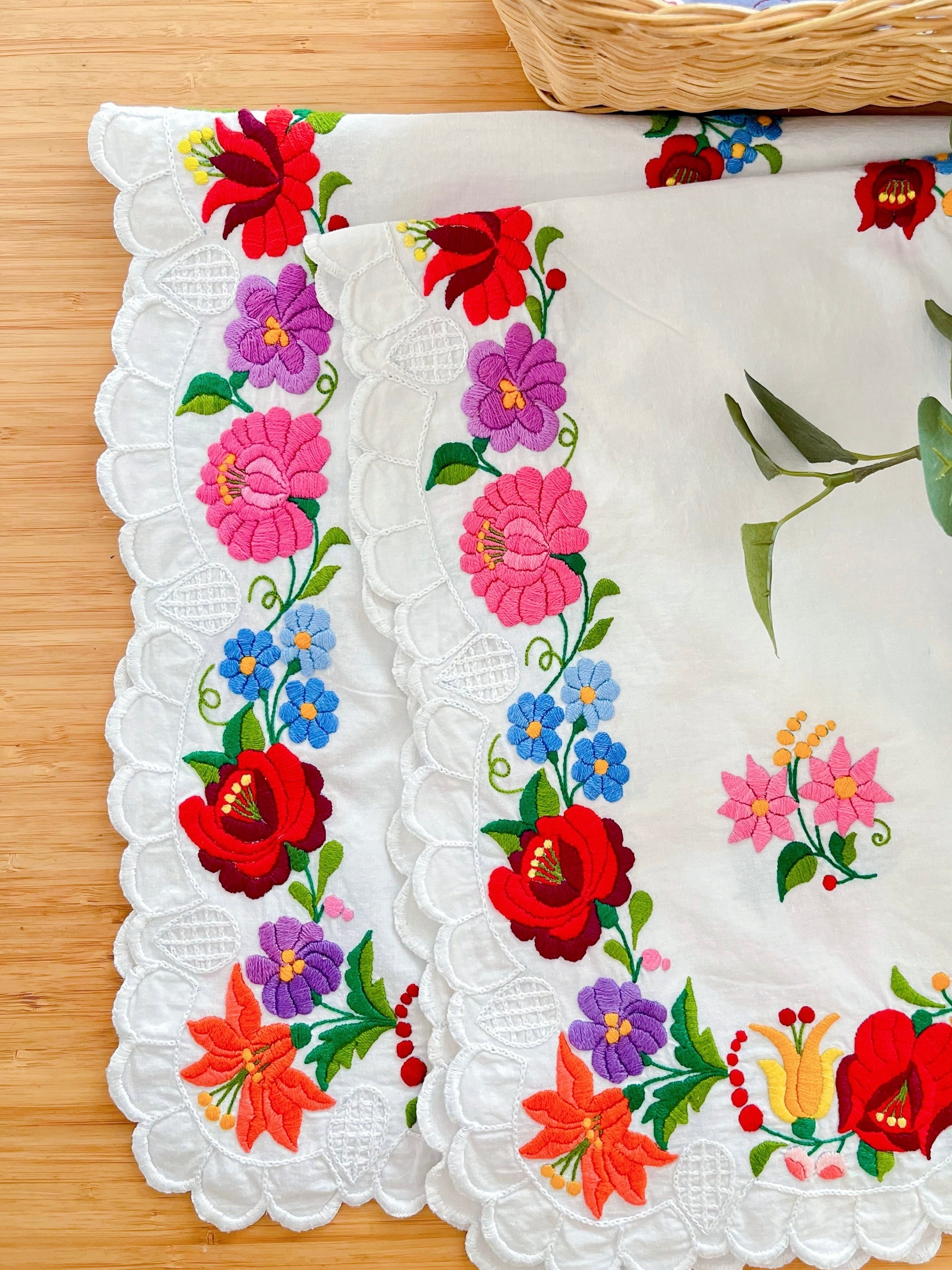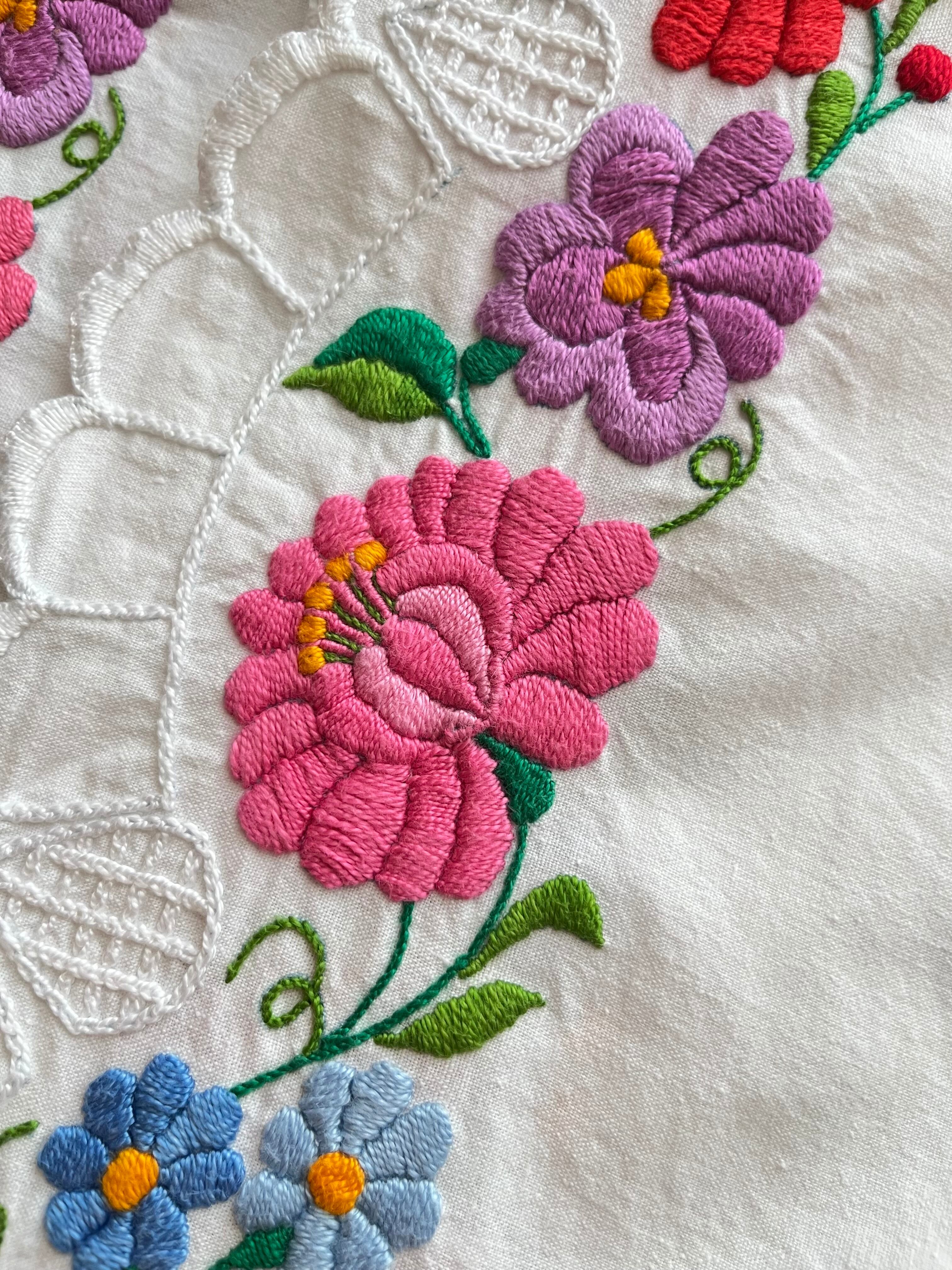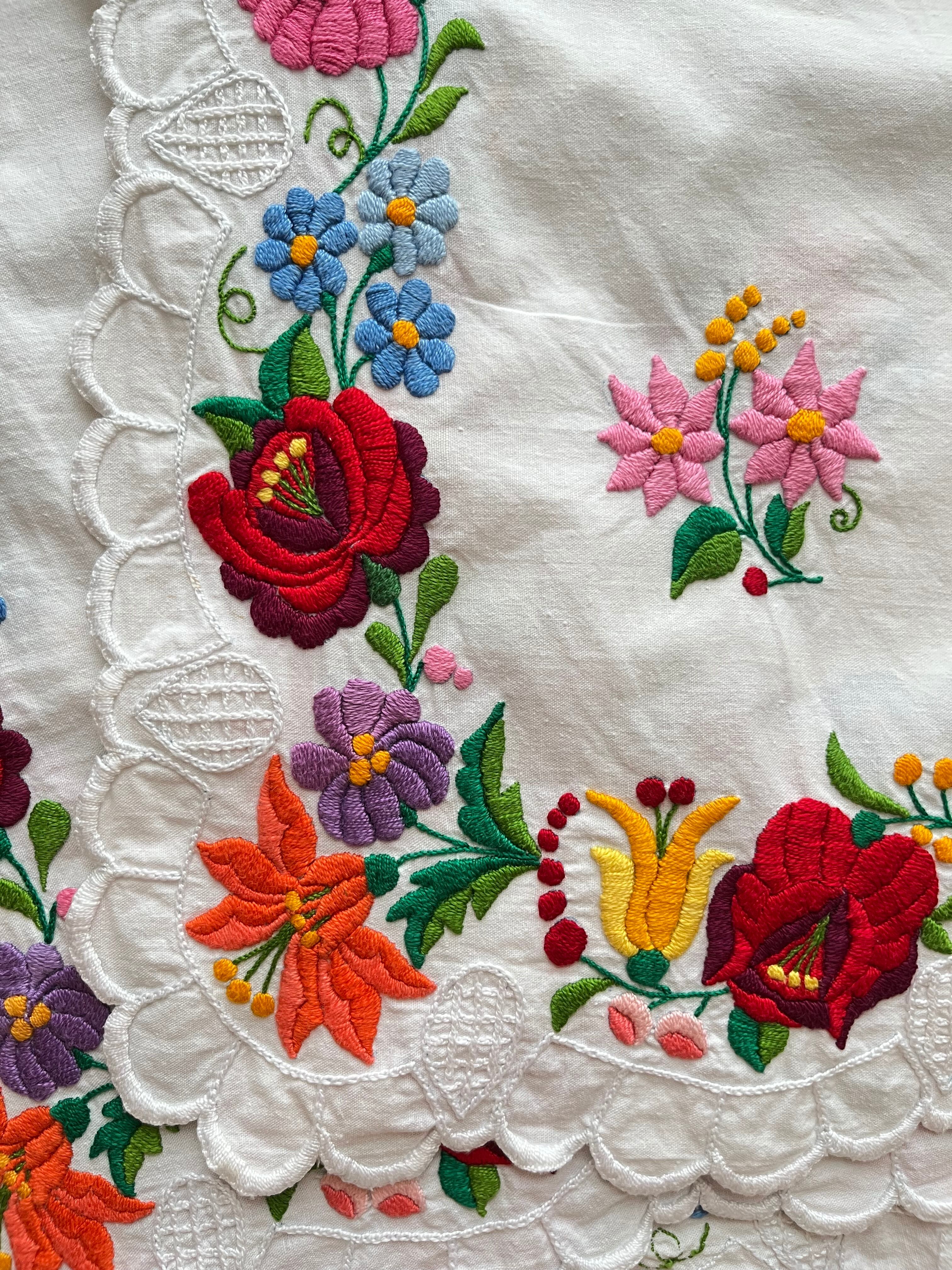 フリル縁がかわいいテーブルクロス ヴィンテージ カロチャ刺繍 87×80cm