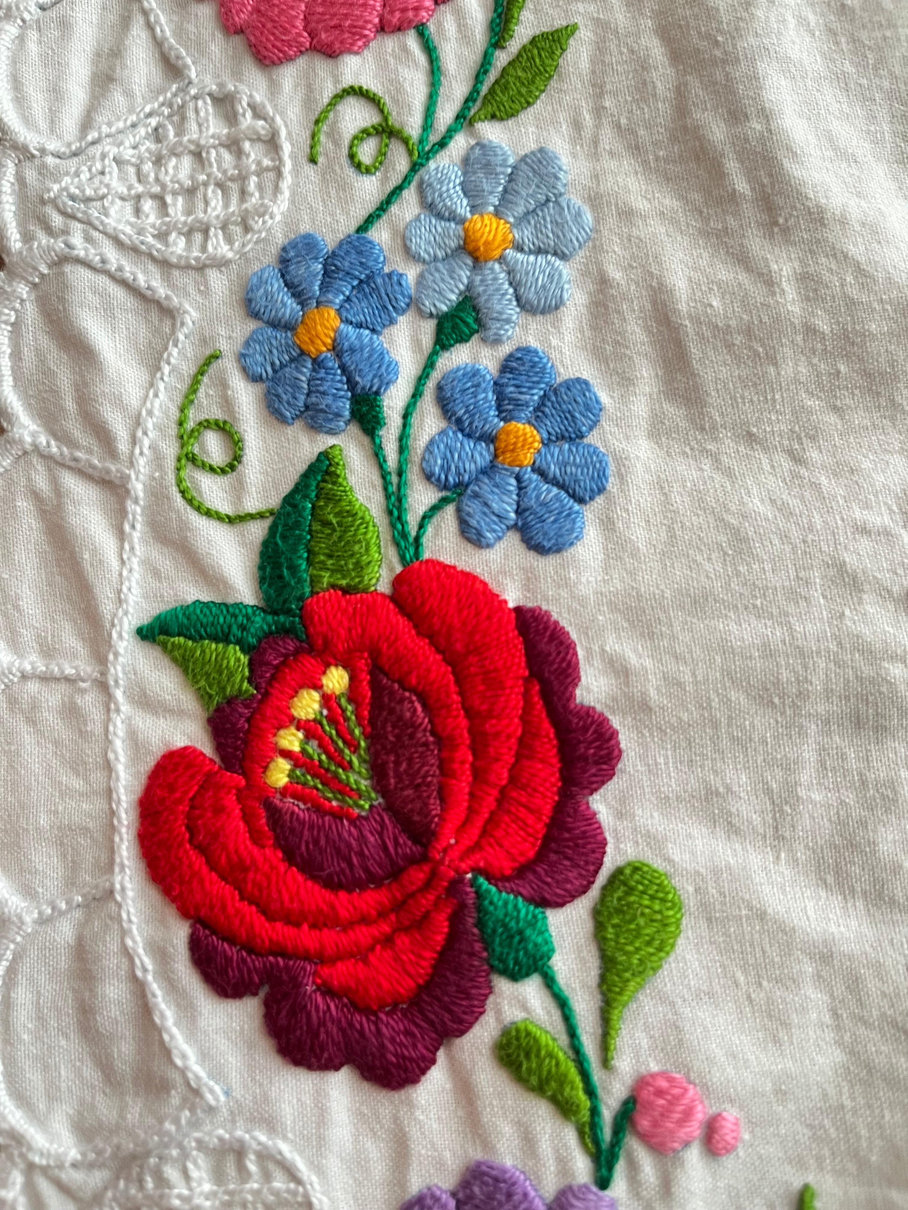カロチャ刺繍に使用される糸(特に赤)は、稀に色移りすることがあります。