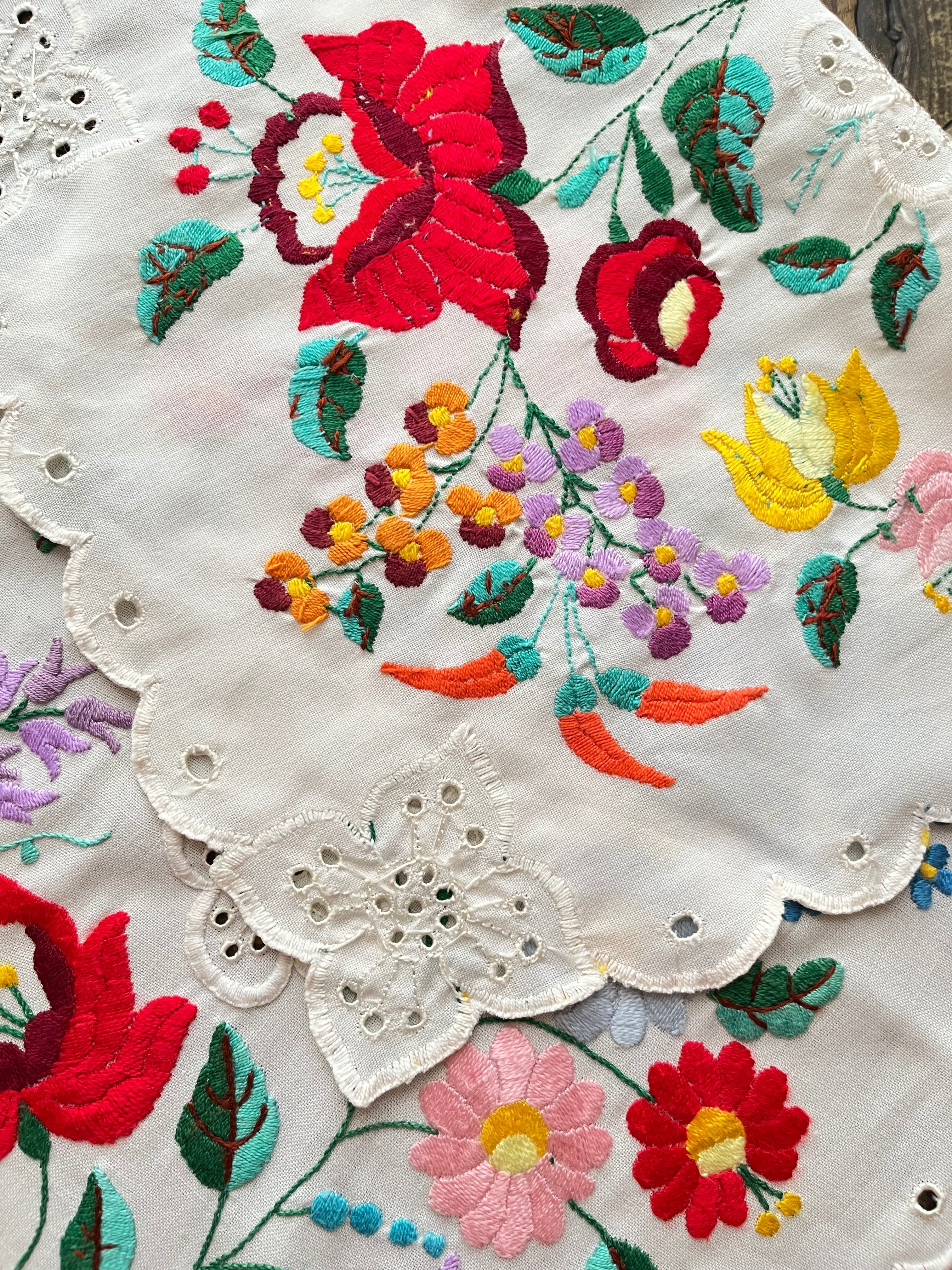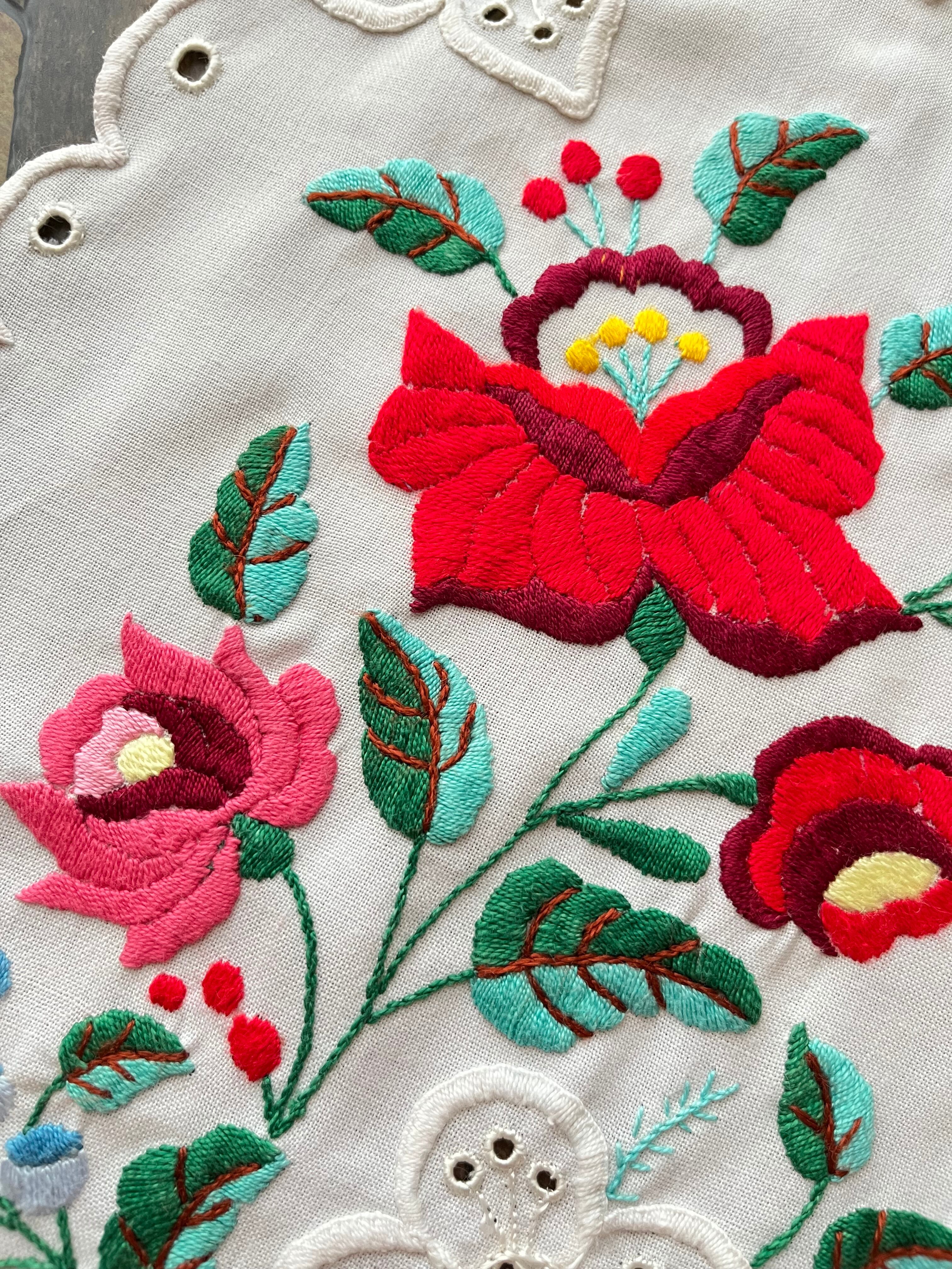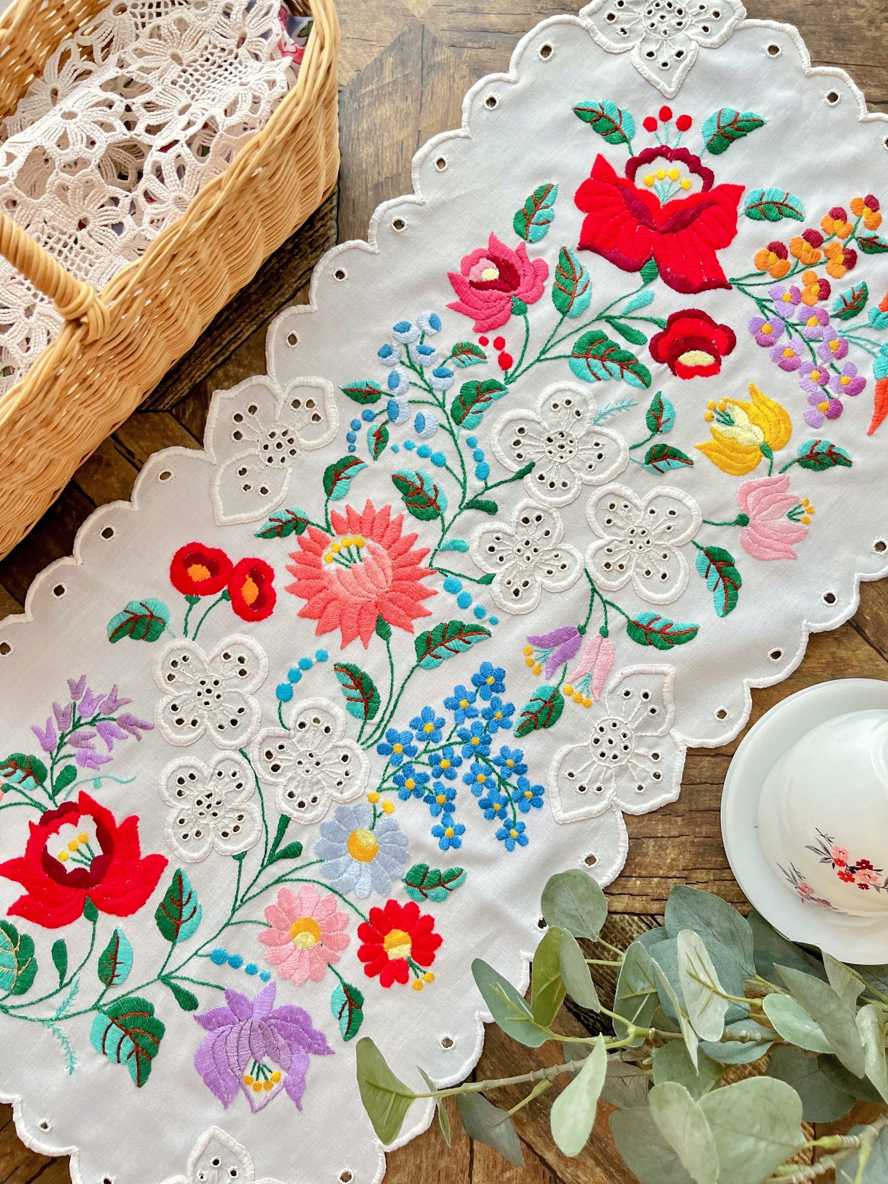 カットワークの爽やかテーブルランナー ヴィンテージ カロチャ刺繍 74×36cm