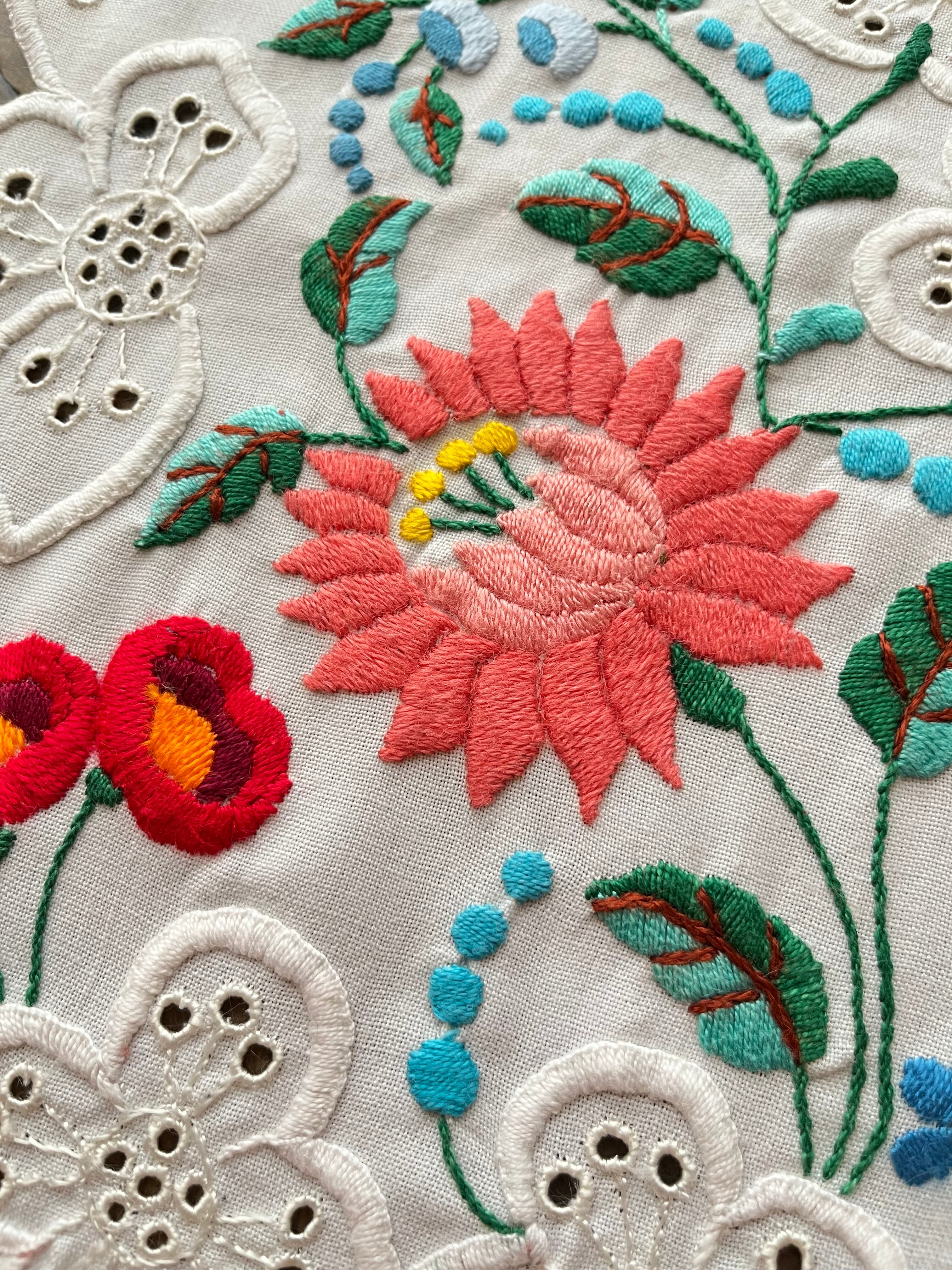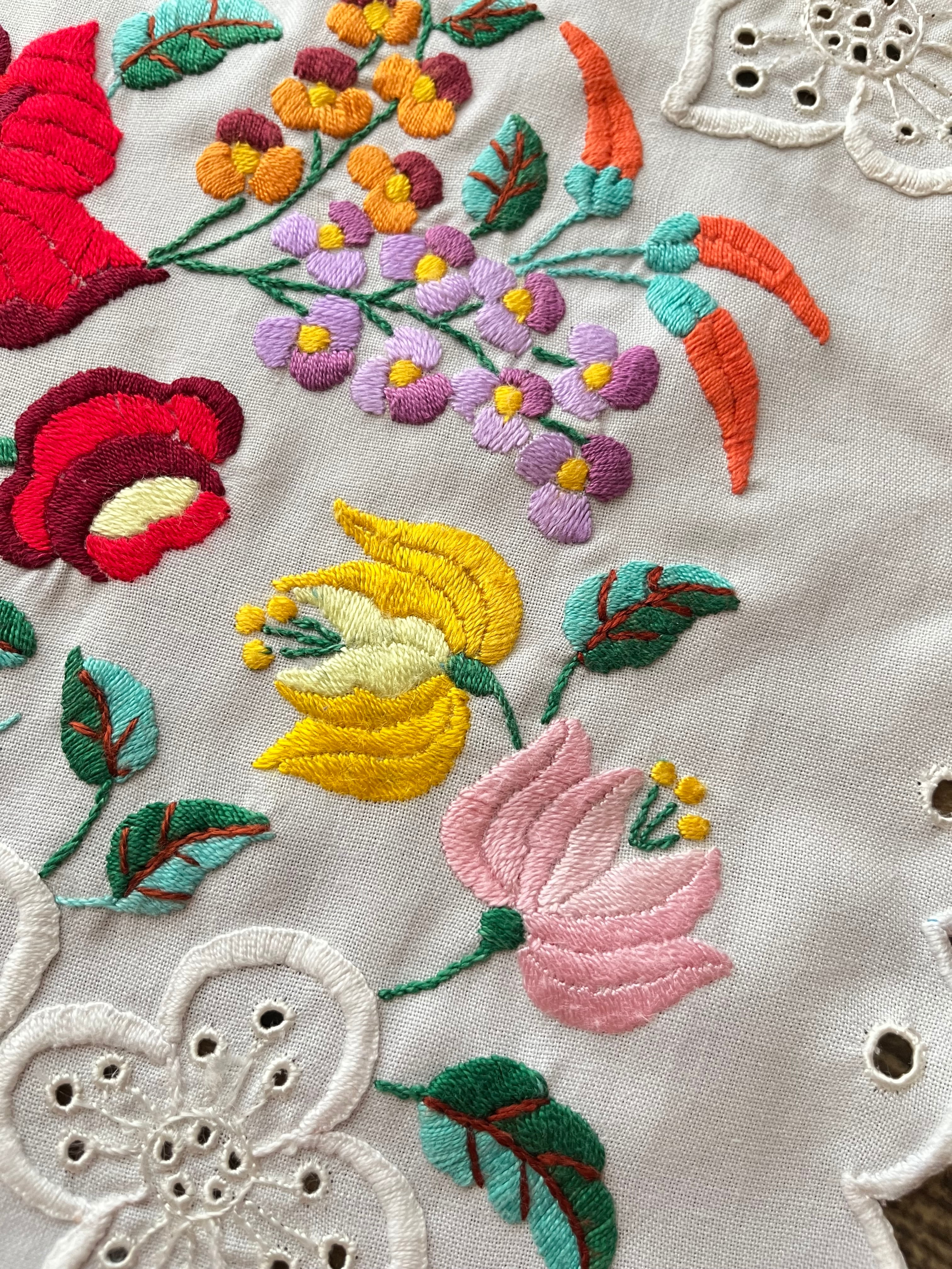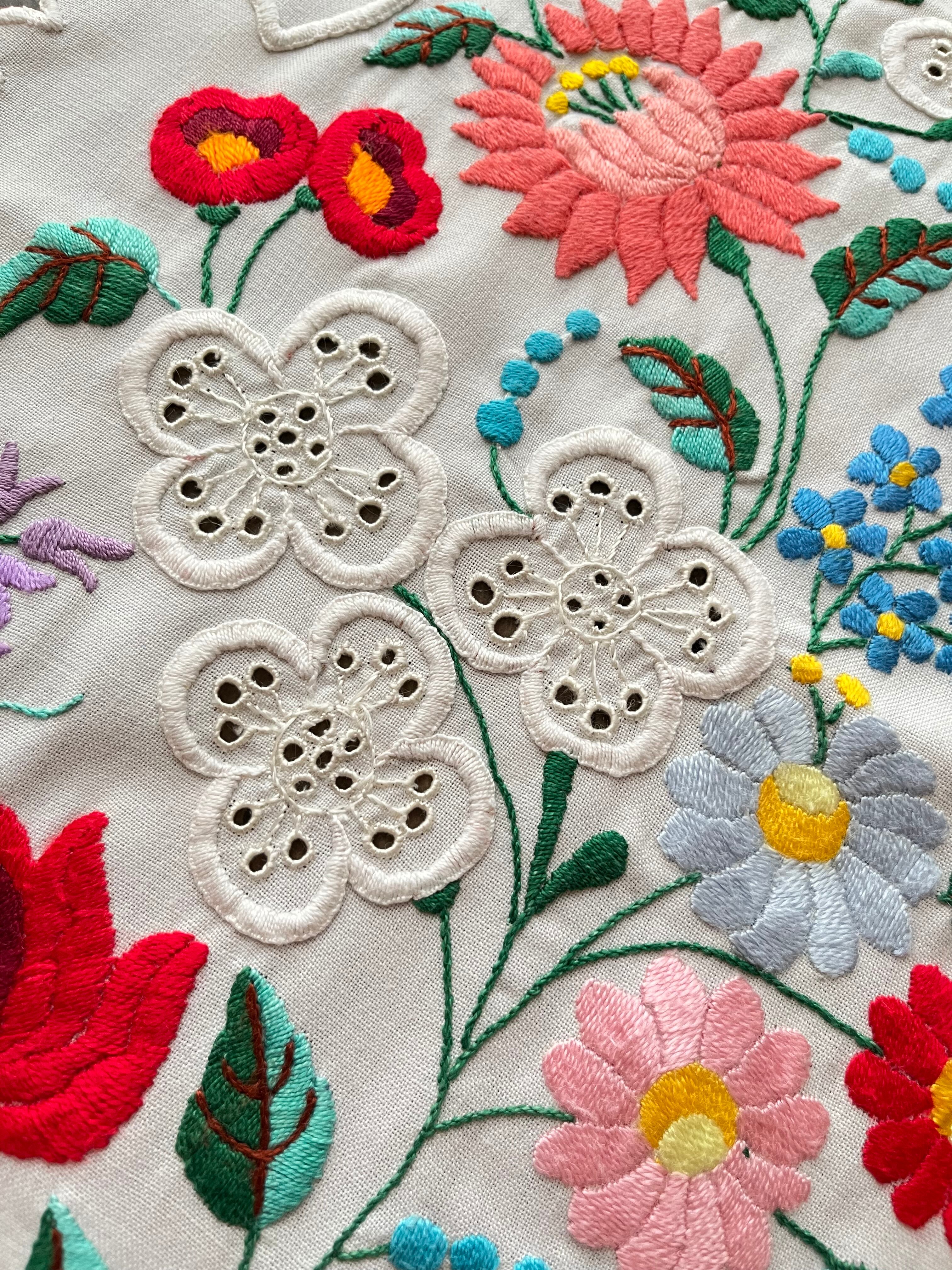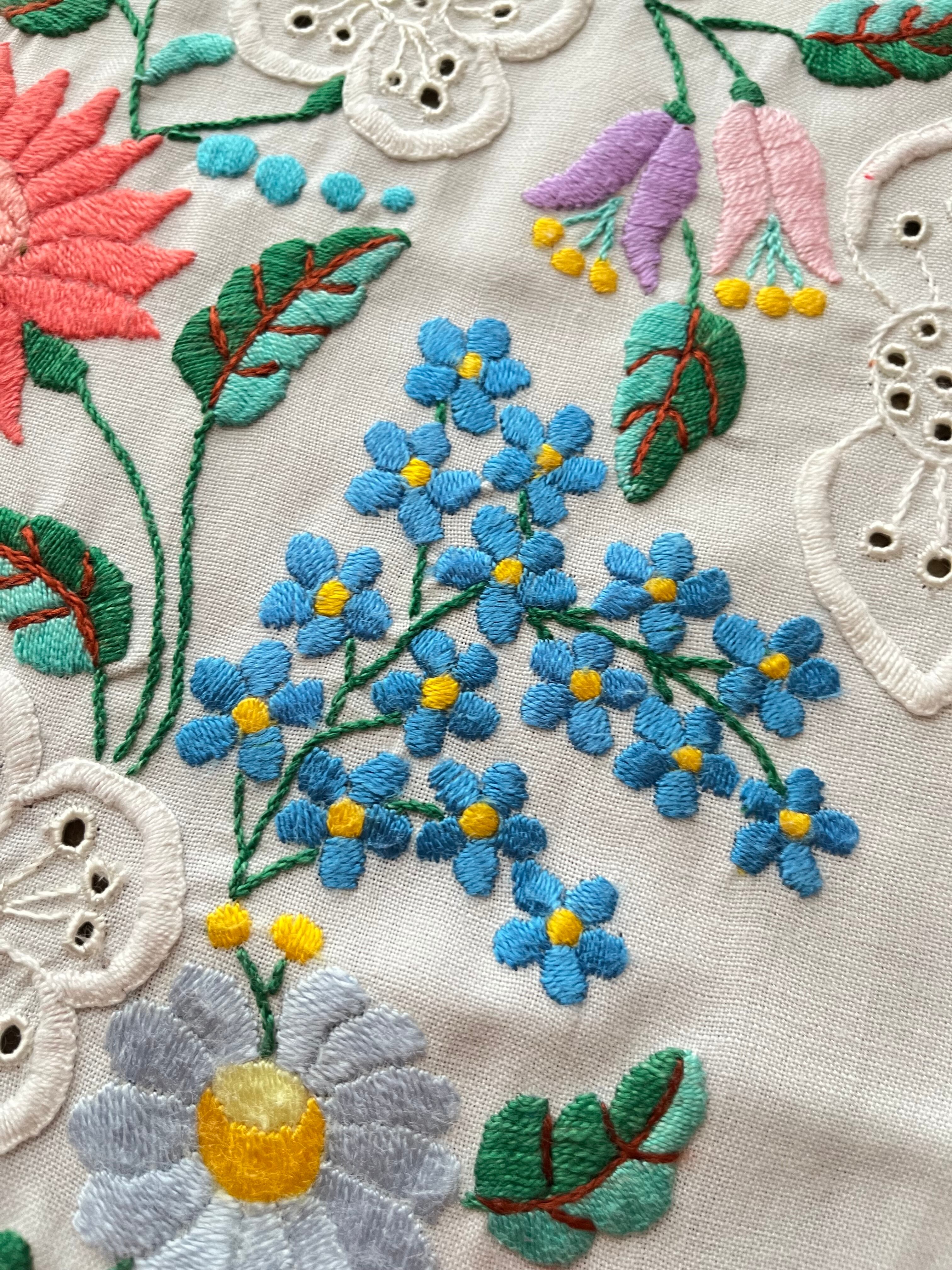 草花の刺繍の色はカラフルでありながら少し淡めのトーンで爽やかさを感じます。主張しすぎないけれど魅力が詰まったとても美しい1枚です。