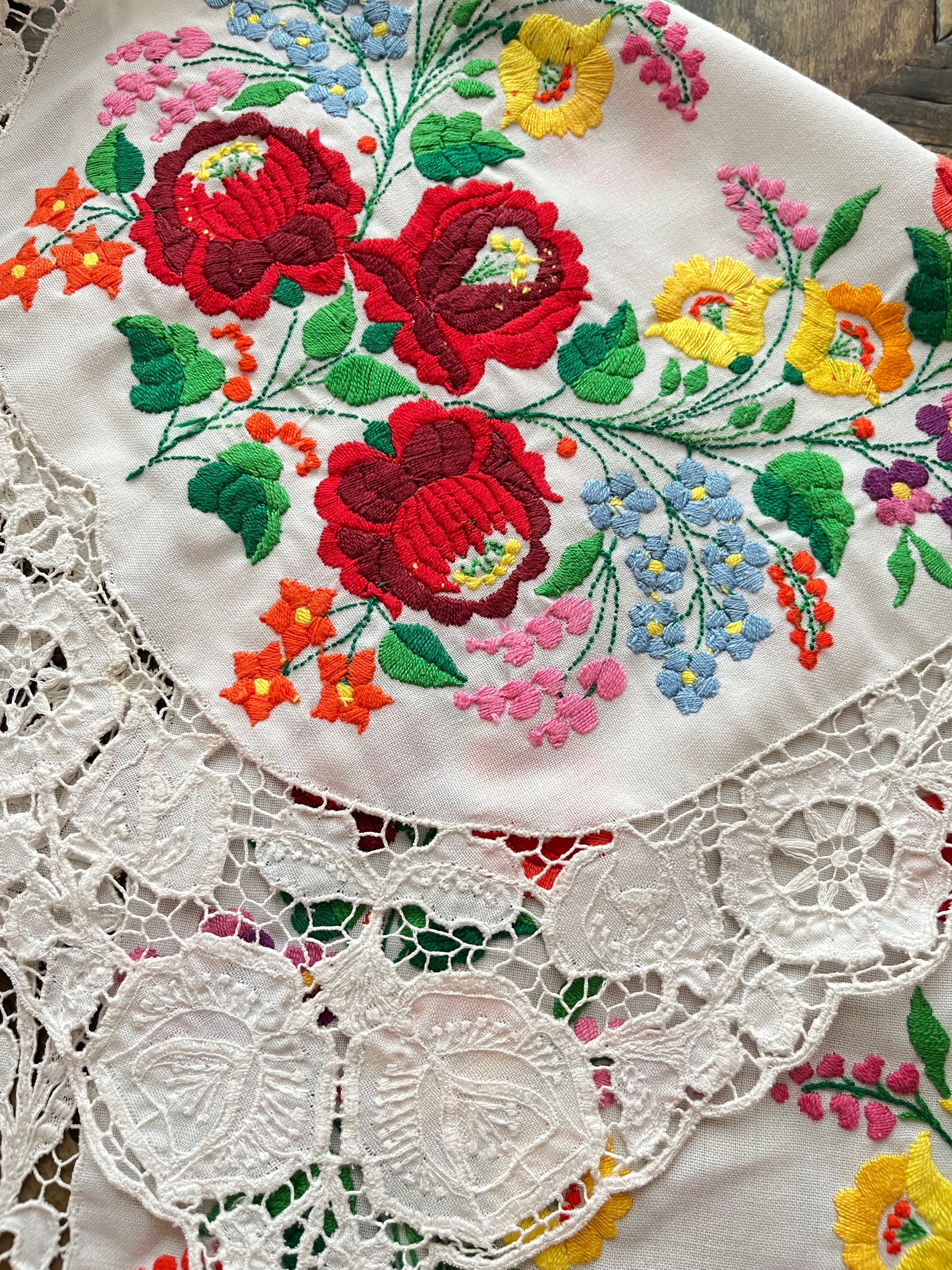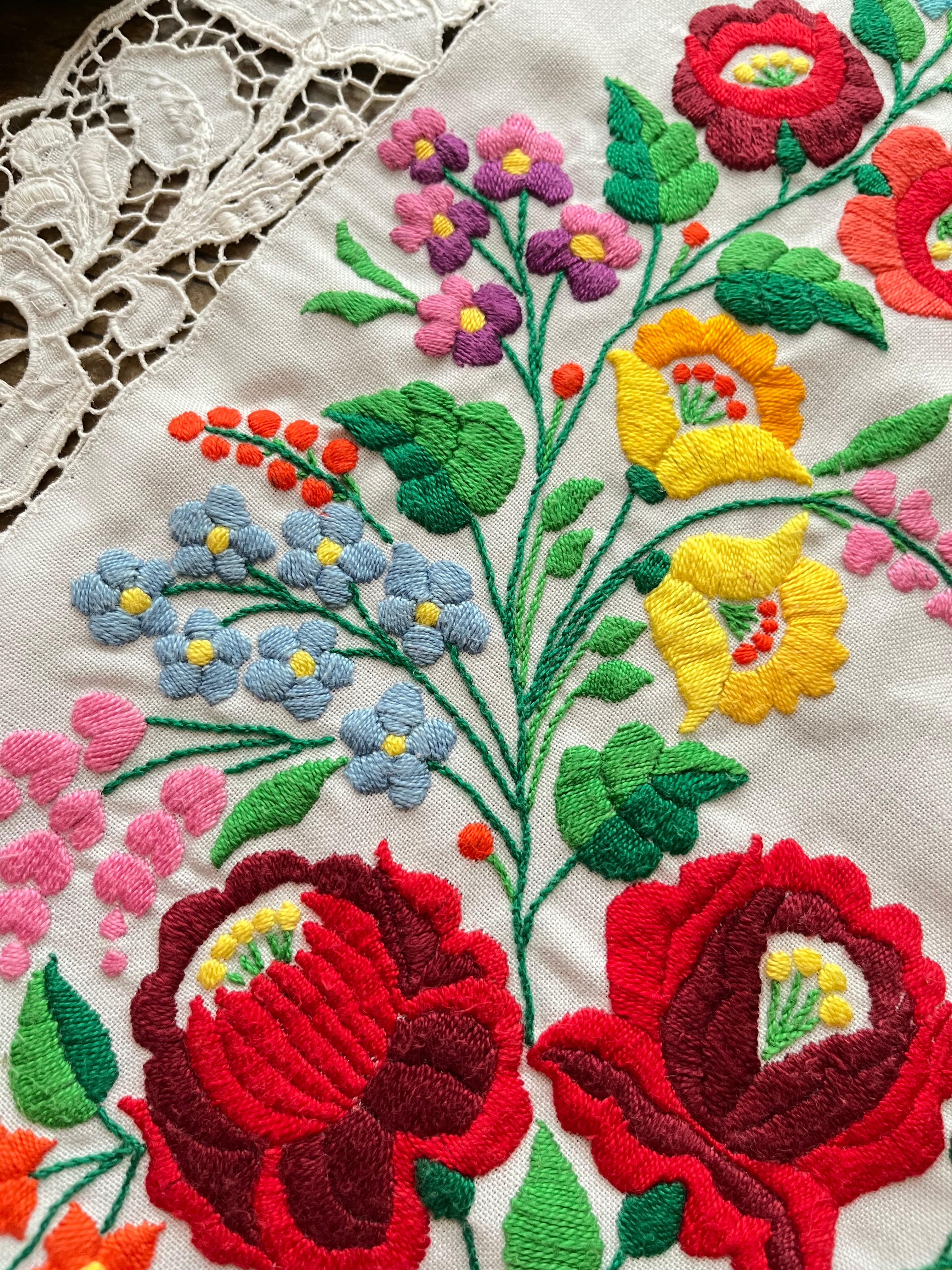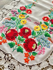 ふだんのカロチャ刺繍を手縫いで仕上げた後にもうひと仕事。レースを作りたい部分を小さなはさみで切り取り、穴の周りを糸で縁取り、さらに花や車輪などの模様を描いていくのです。なんて気の遠くなる作業でしょうか…