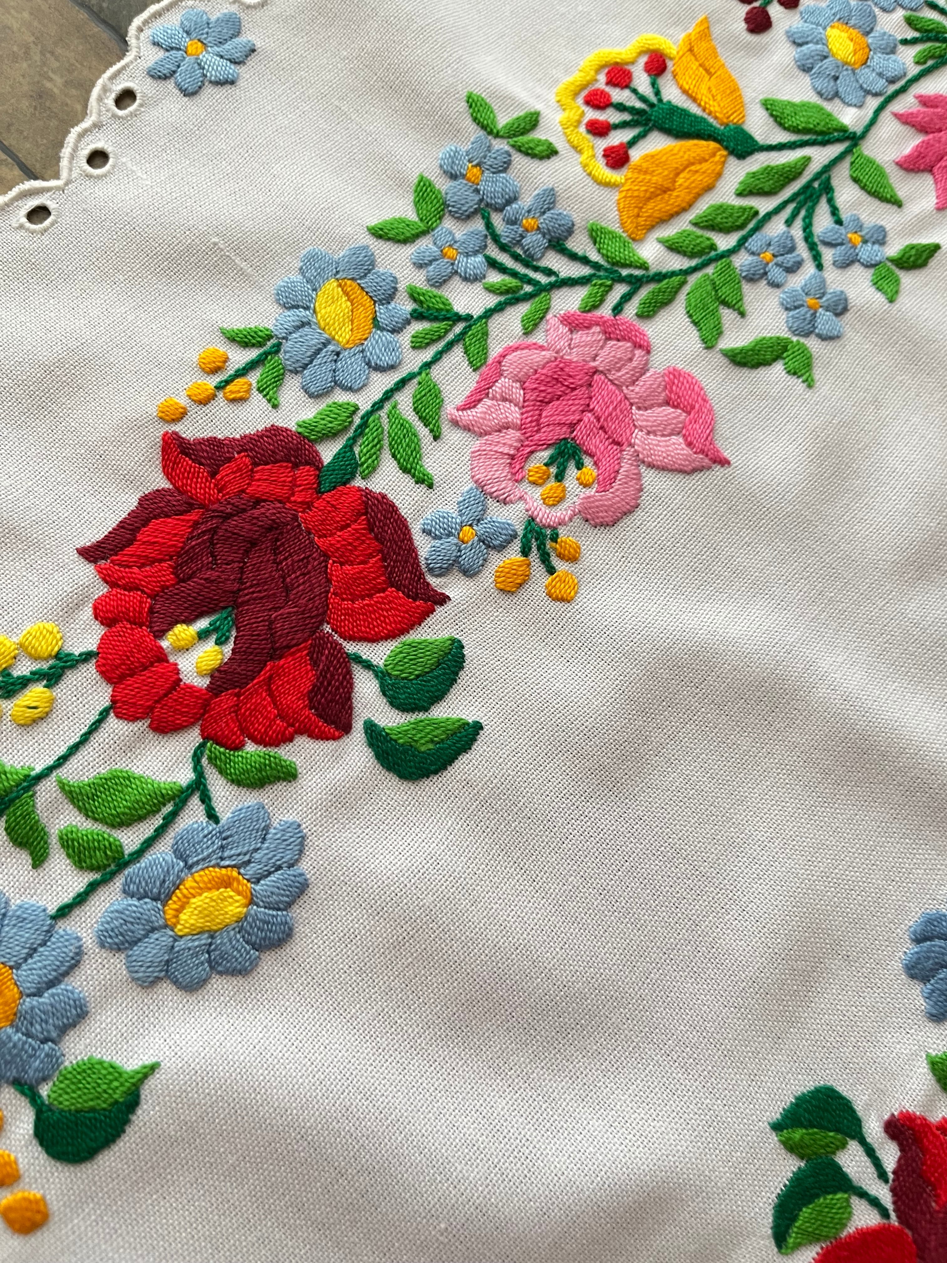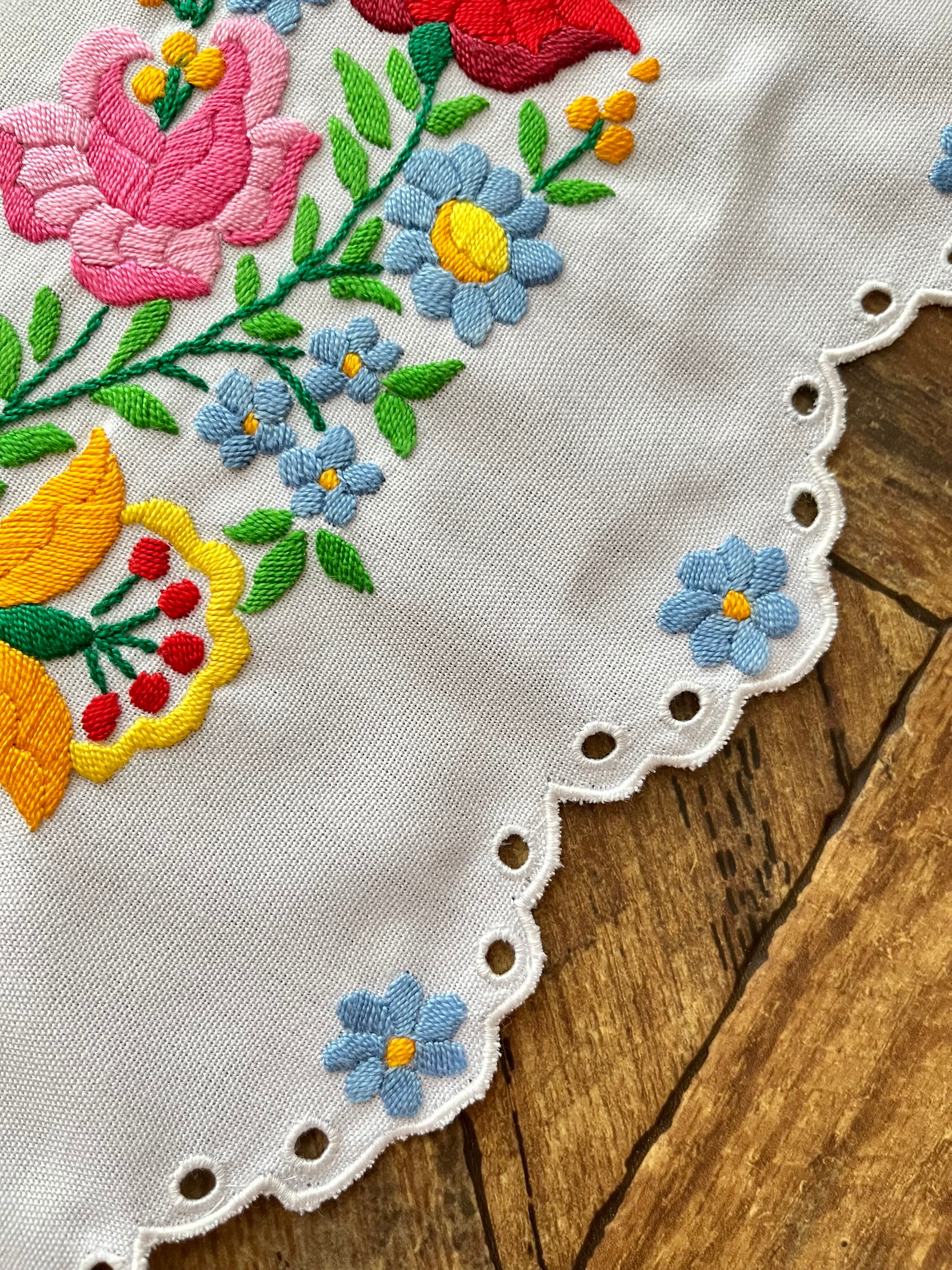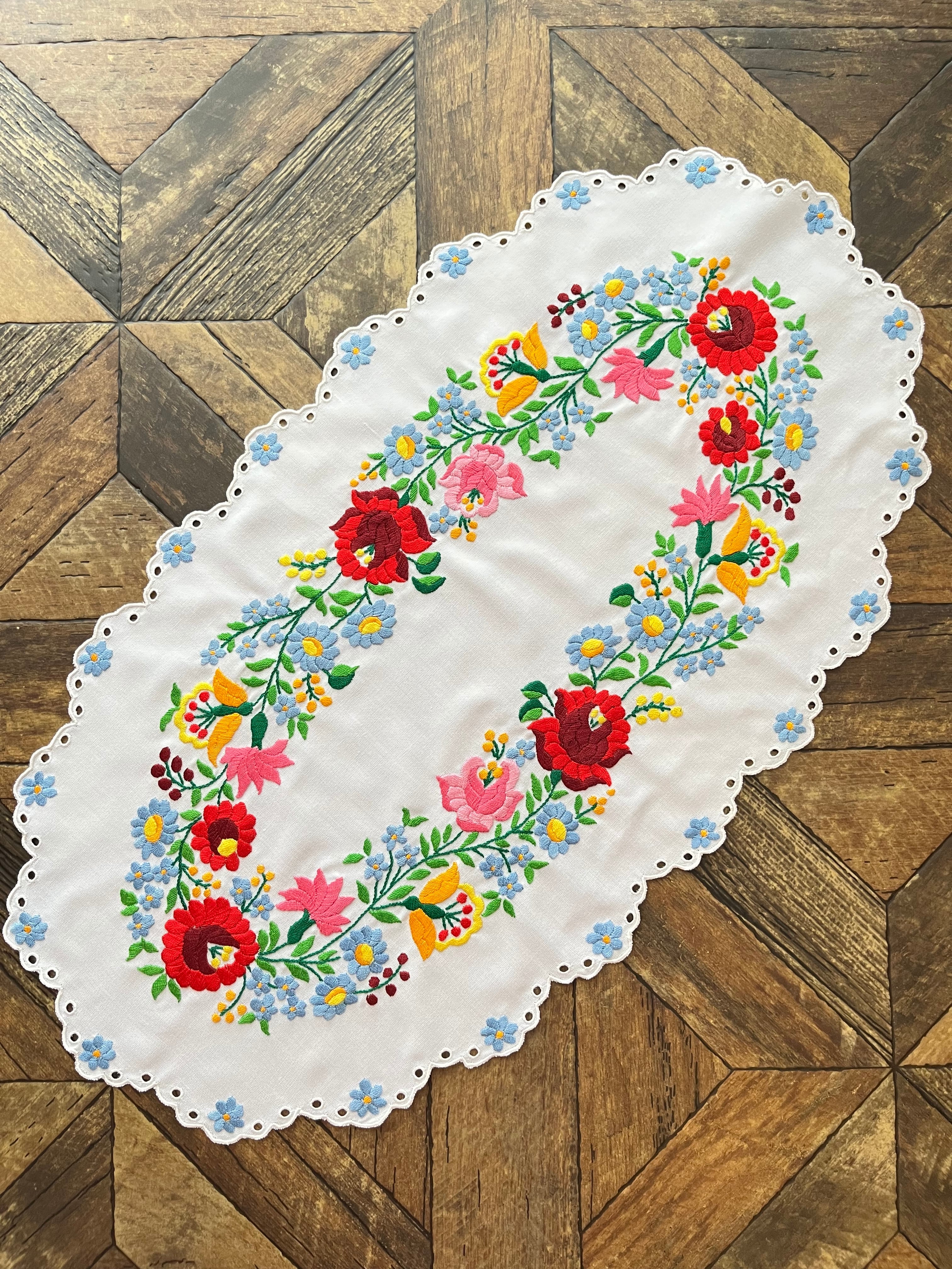 ピュアで可憐な水色テーブルランナー ヴィンテージ カロチャ刺繍 69×38 cm