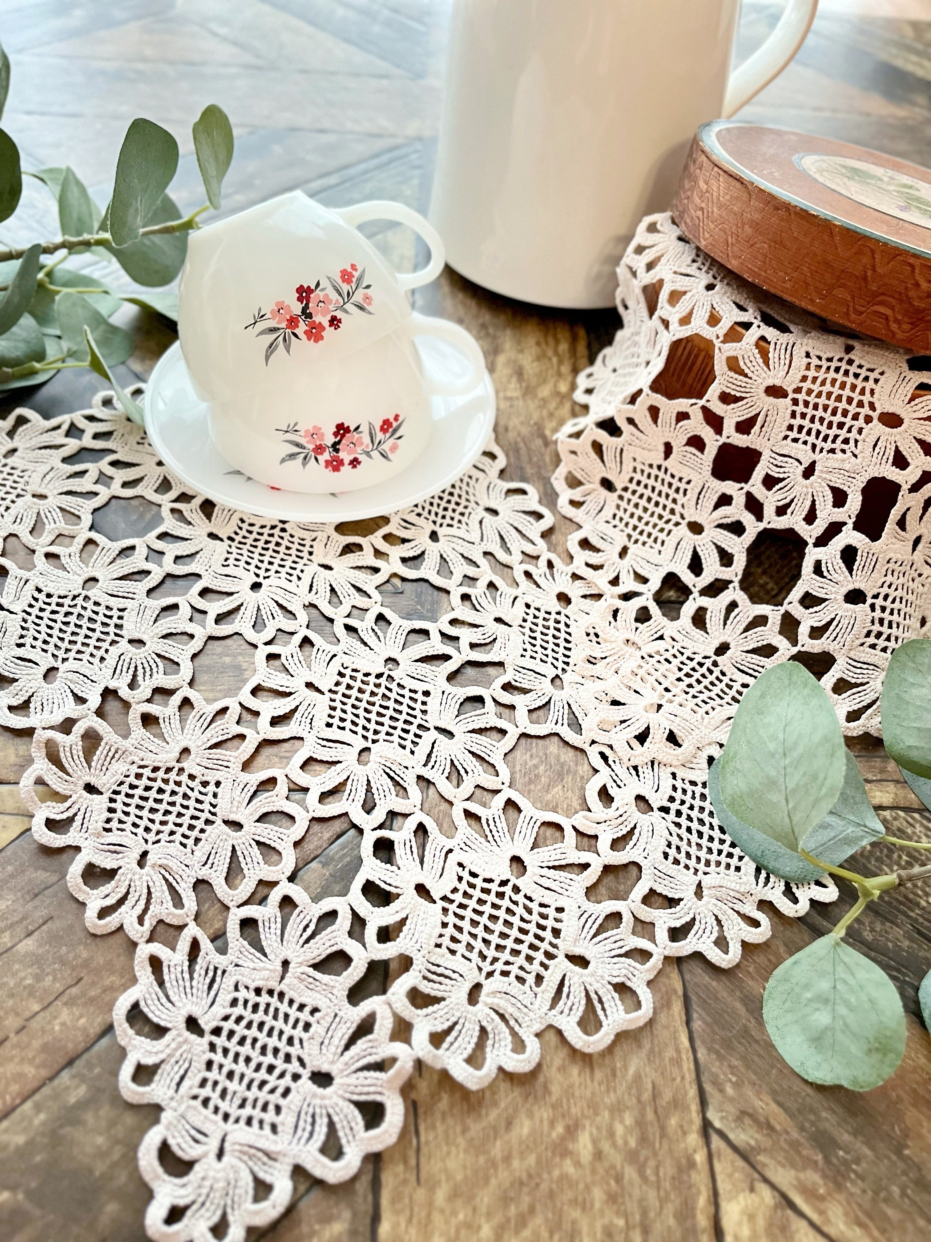 ドイリーとしてはもちろん、キャビネットの上に敷いたり、ランチョンマットとして、カゴの目隠しとしてお使いいただいても素敵です。是非さまざまな使い方をお楽しみください。