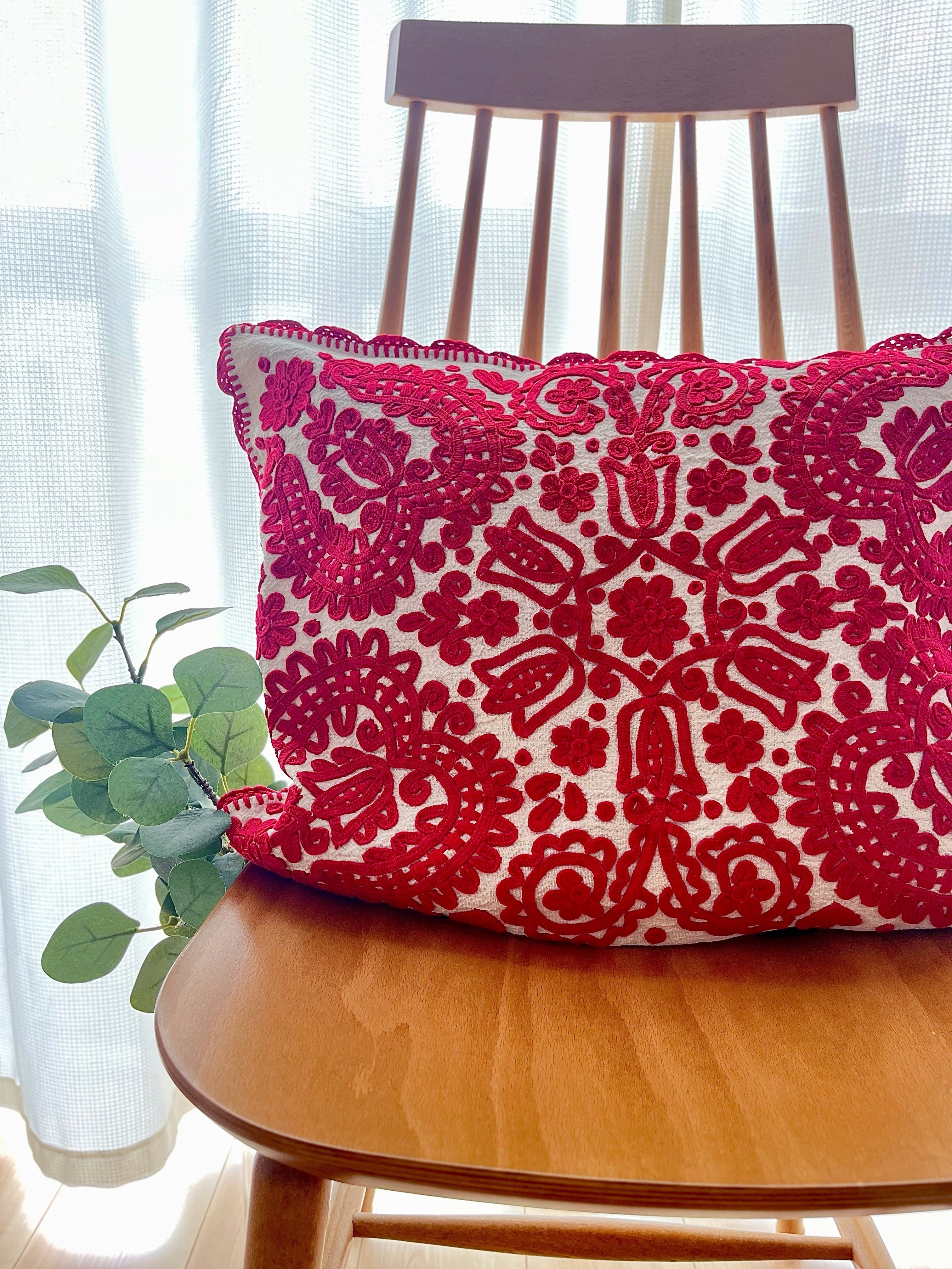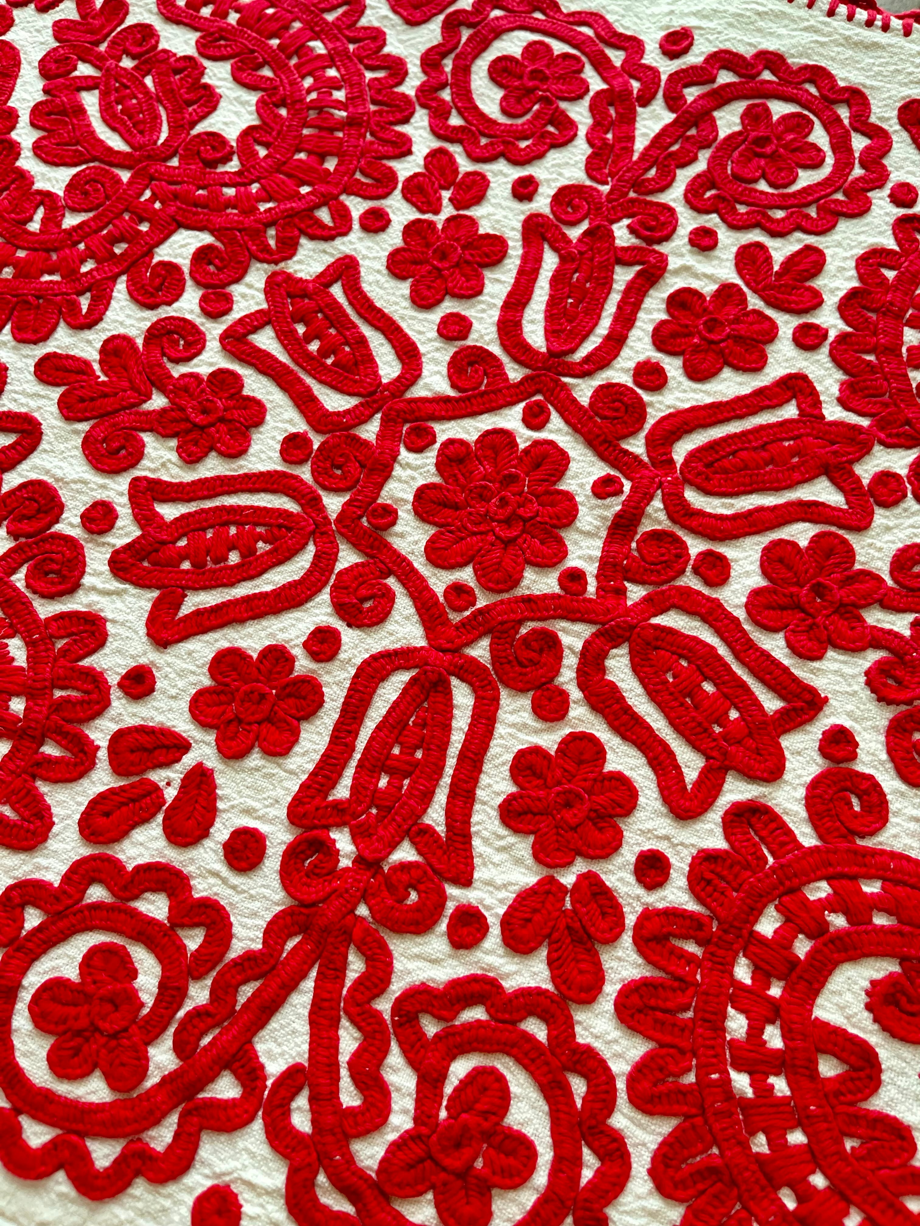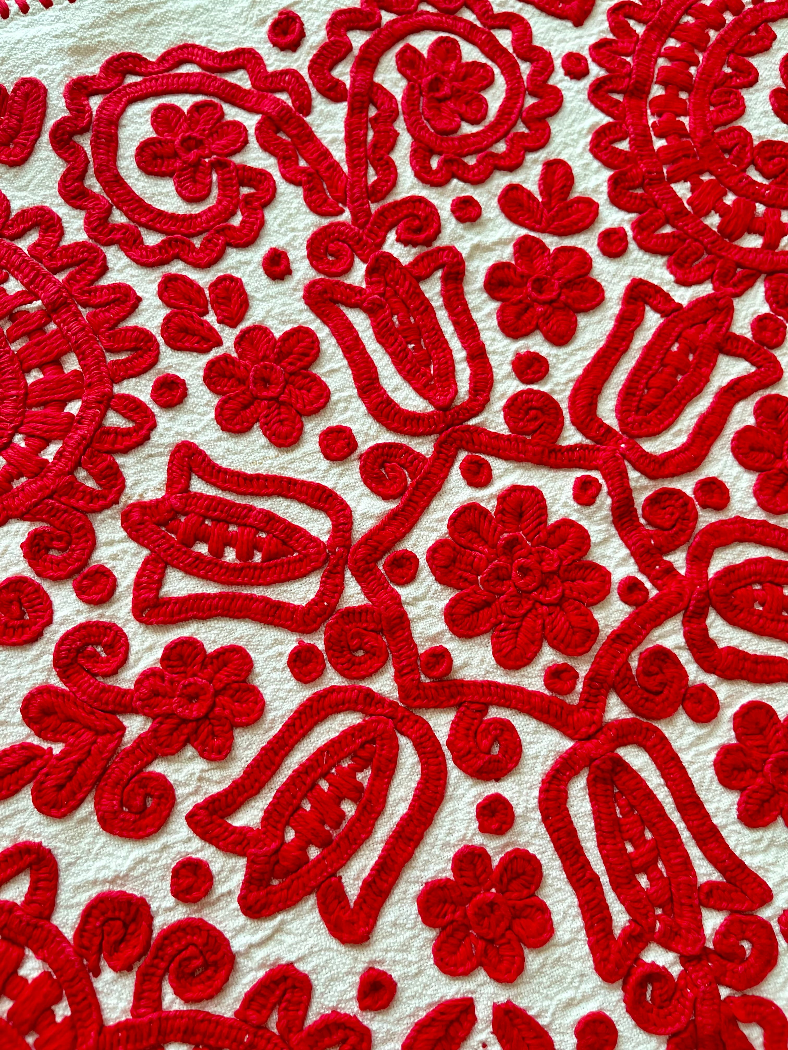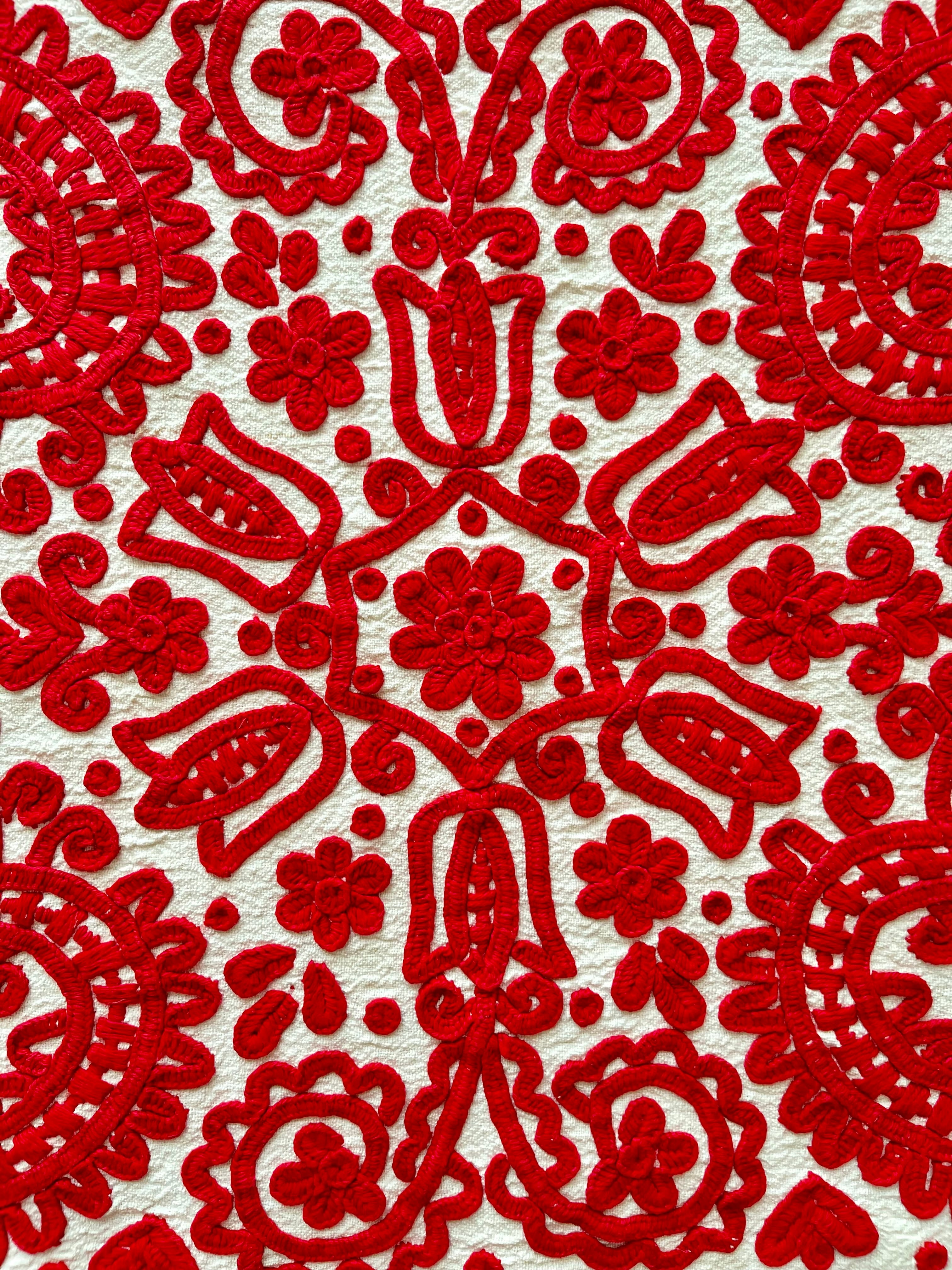 パワフルな赤で刺繍されたお花やハートのモチーフは、近くで見ても遠くから見ても圧巻の一枚!こんなに力強いのに、とても精巧に刺繍が施され目にする度に惹きこまれます。