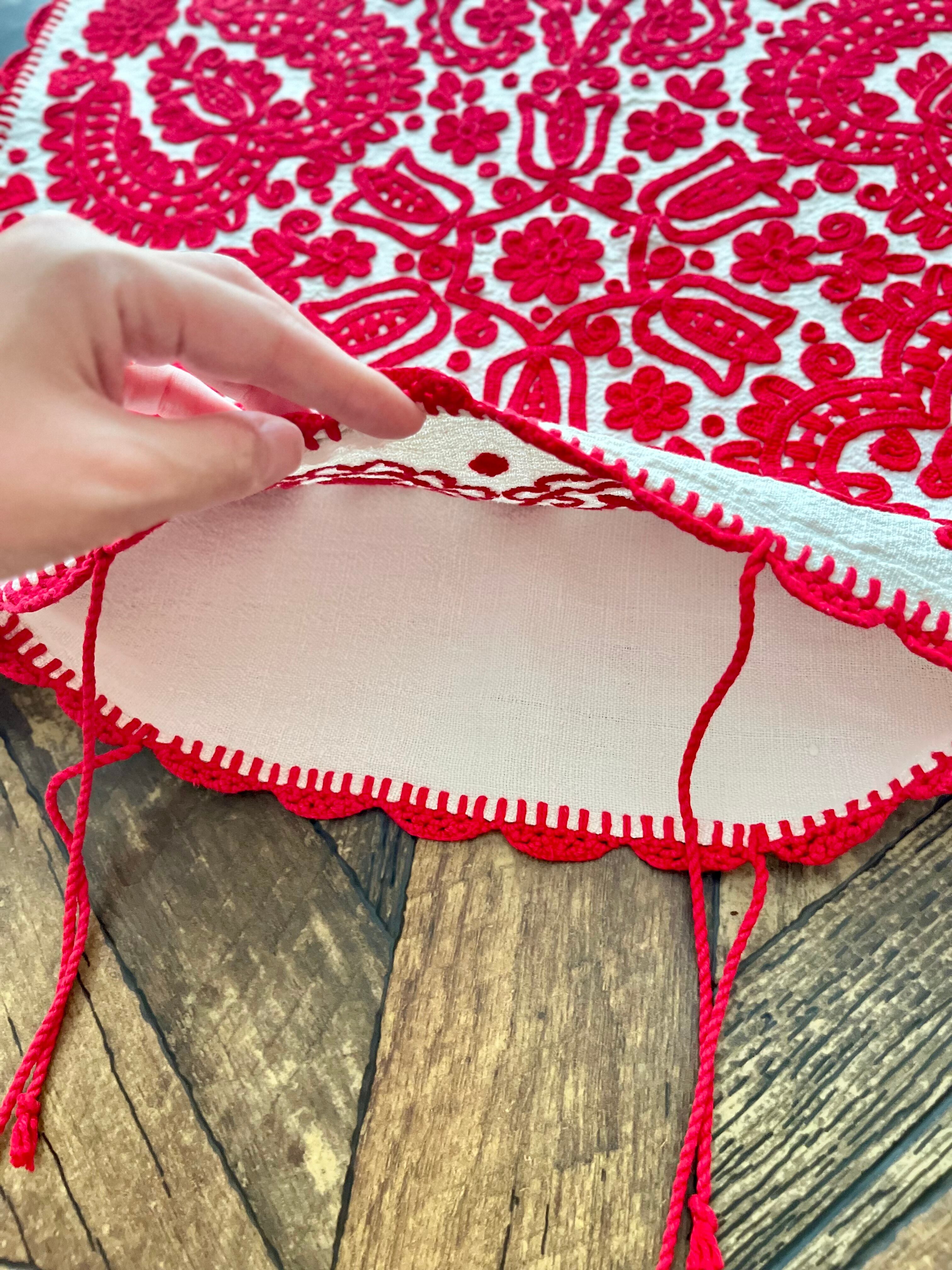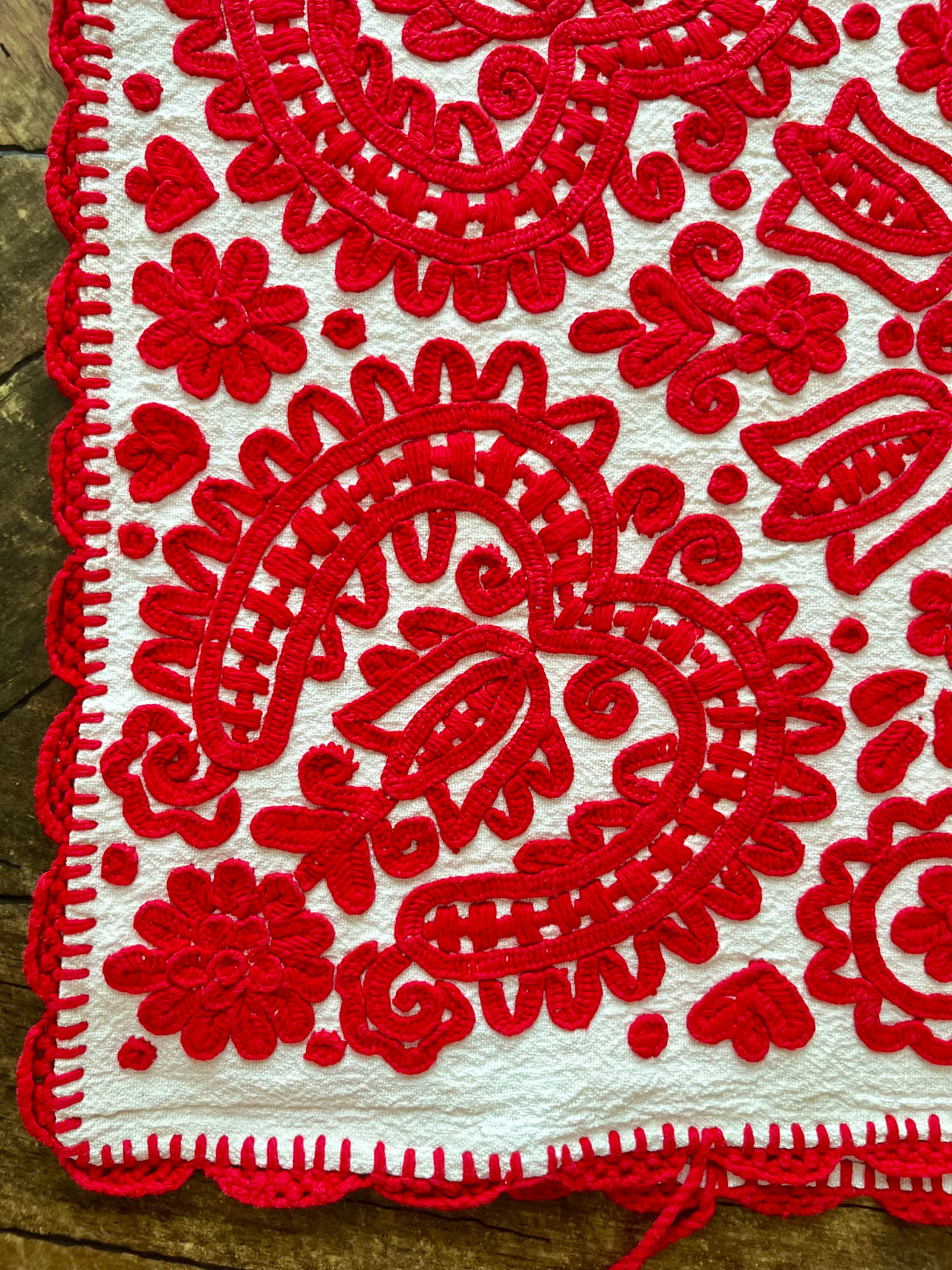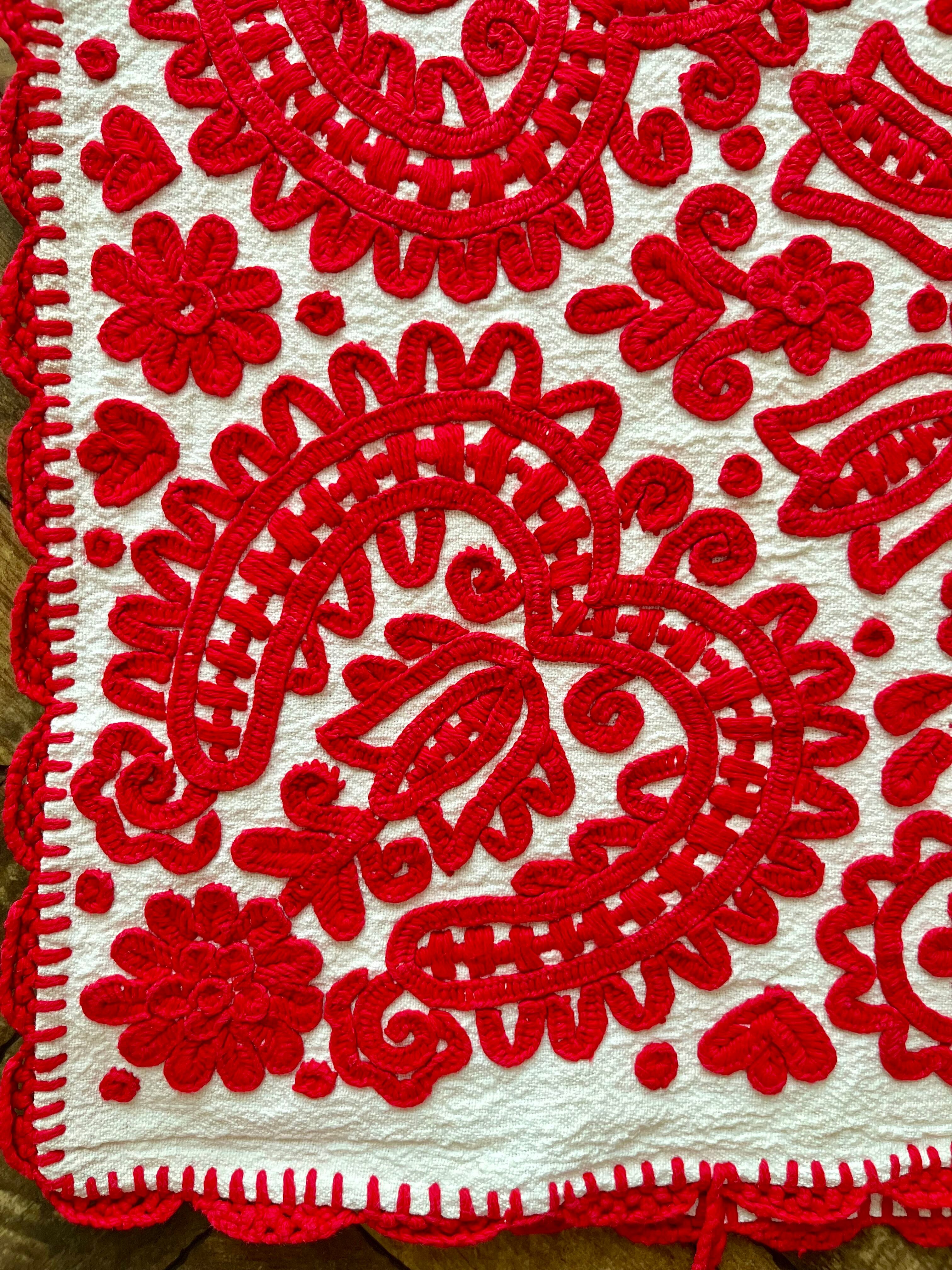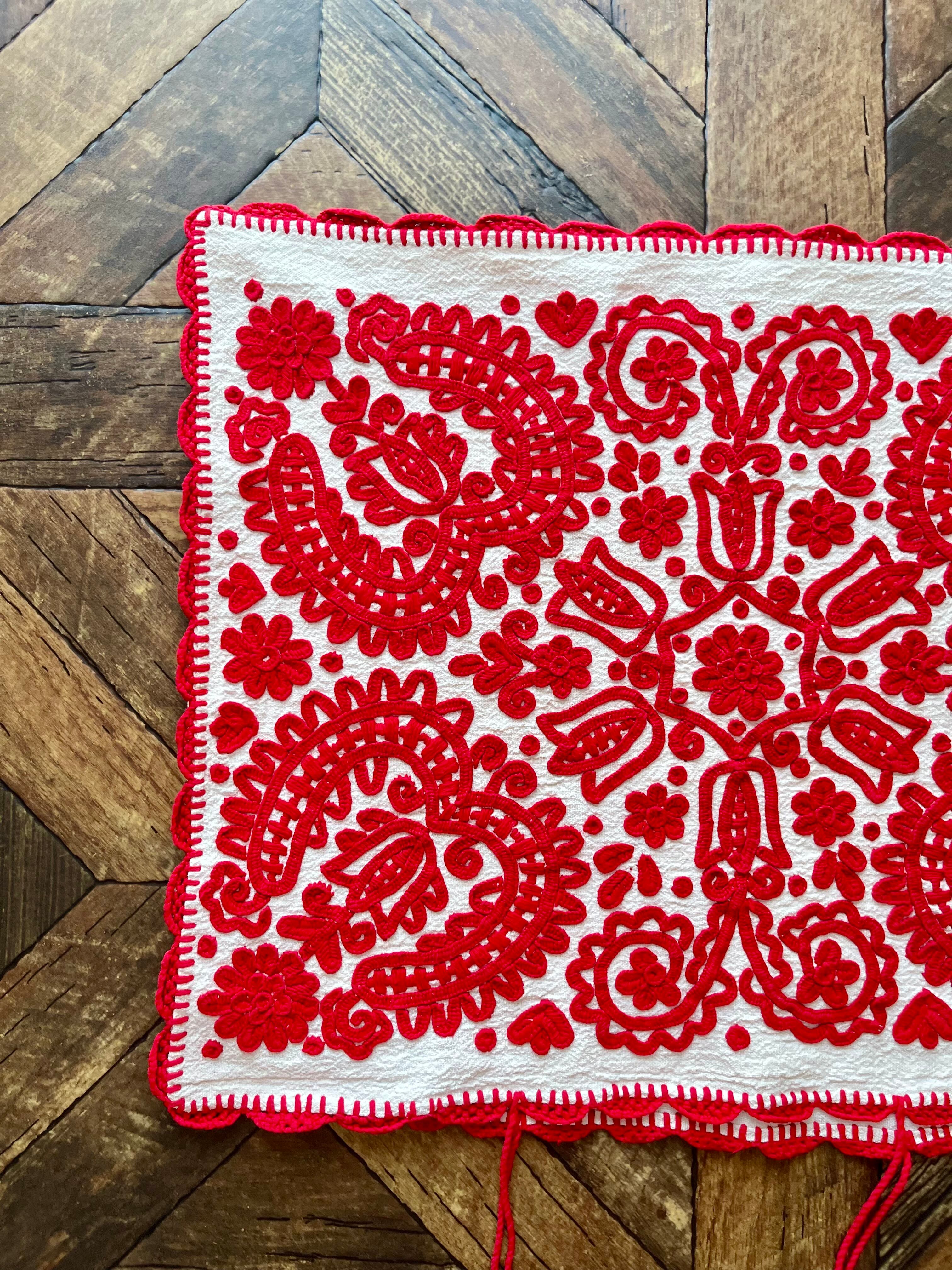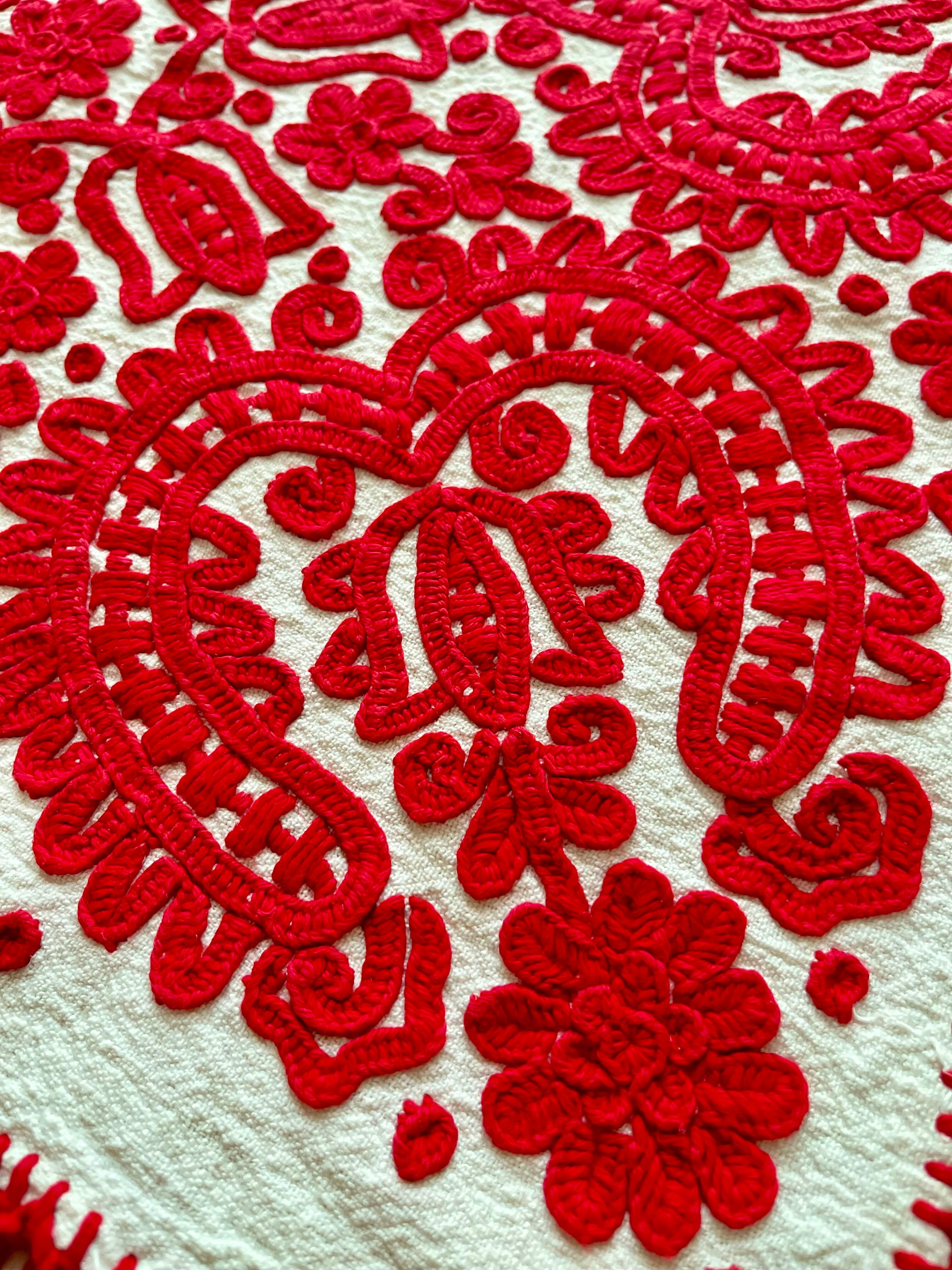 パワフルな赤で刺繍されたお花やハートのモチーフは、近くで見ても遠くから見ても圧巻の一枚!こんなに力強いのに、とても精巧に刺繍が施され目にする度に惹きこまれます。
