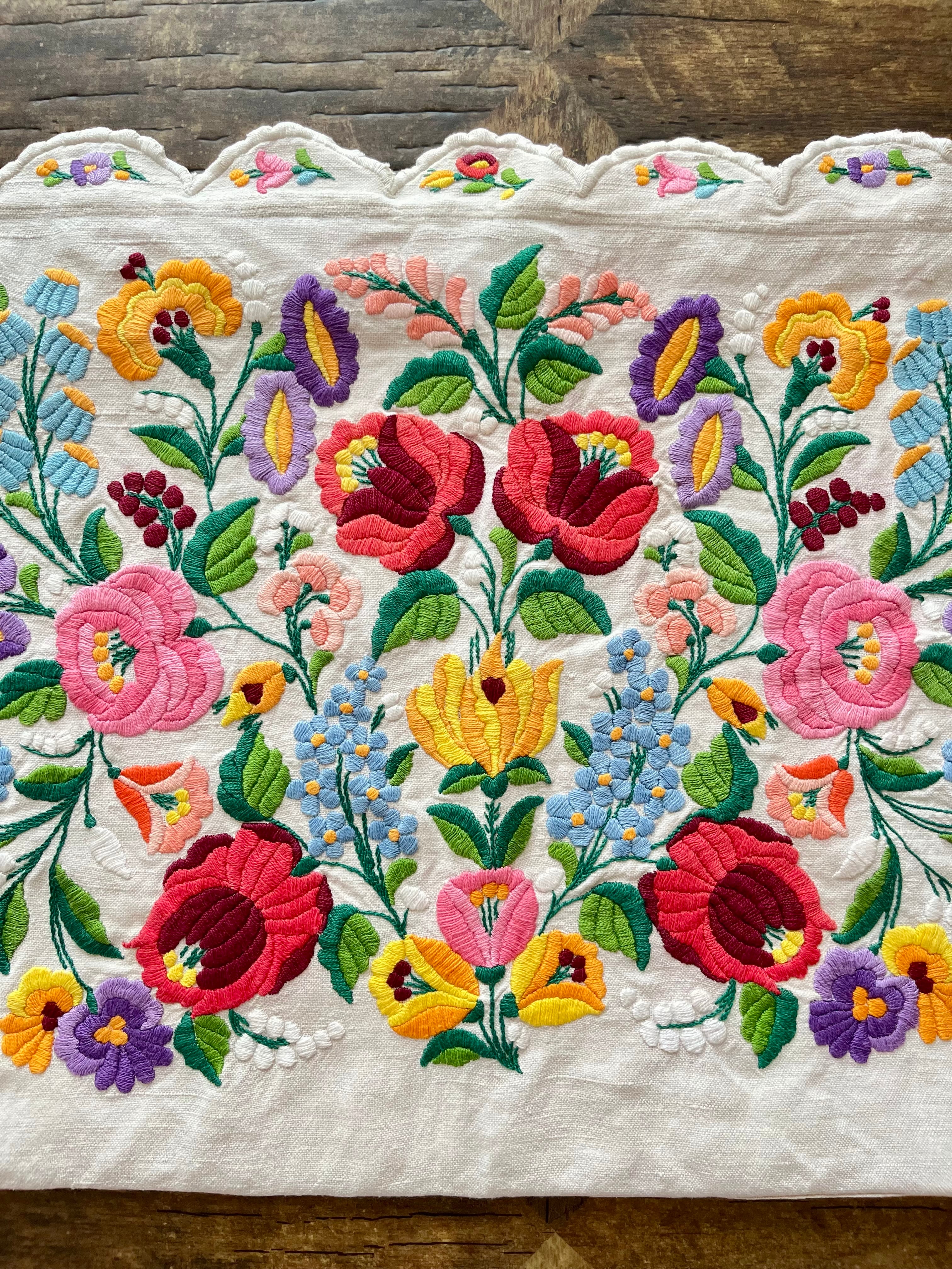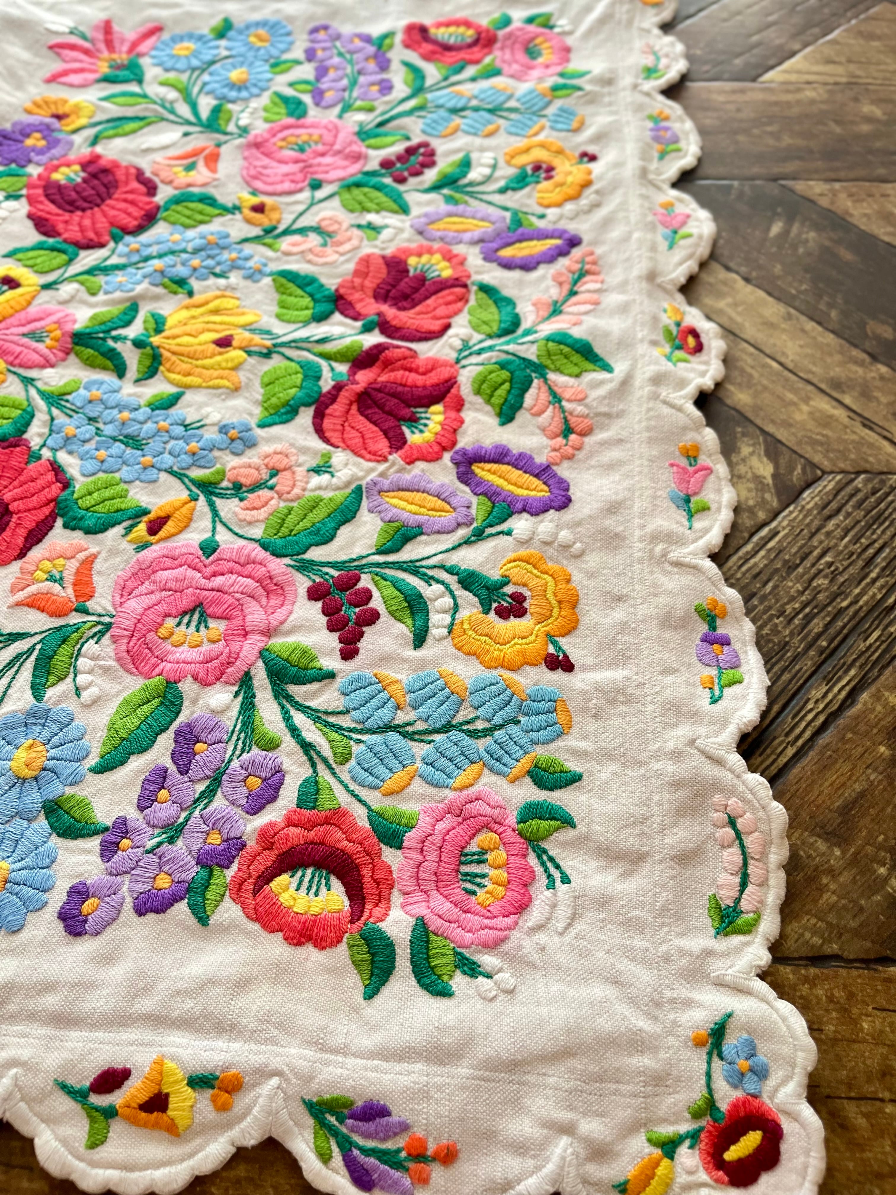 熟練の技を持つ作り手さんが施したと思われるカロチャ刺繍は、立体感と躍動感が際立ちます。手仕事のすばらしさをダイレクトに感じられるスペシャルな1枚です!