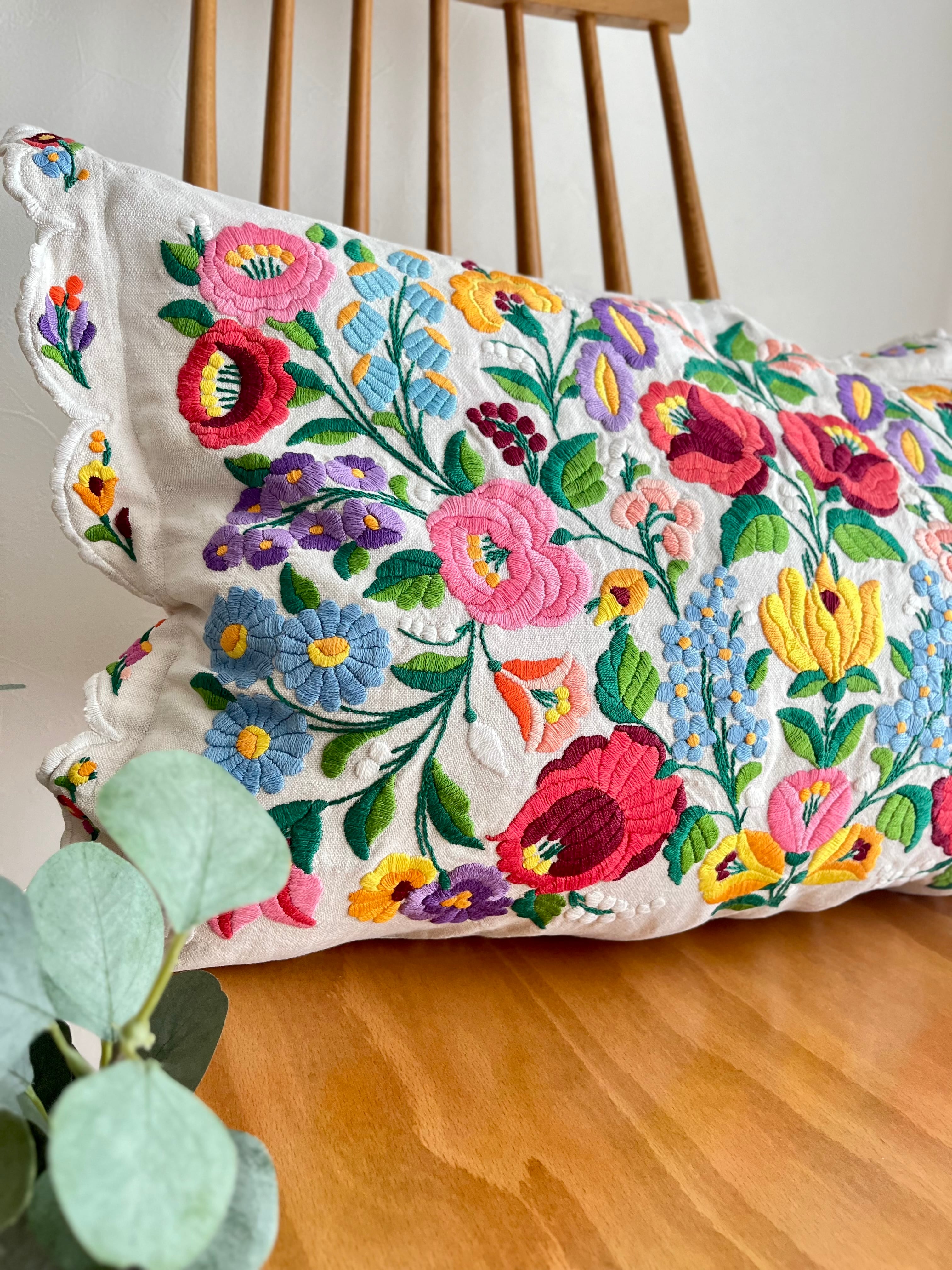 《圧巻の手しごと》リネンのカロチャ刺繍ピローカバー ヴィンテージカロチャ刺繍 64.5×42cm