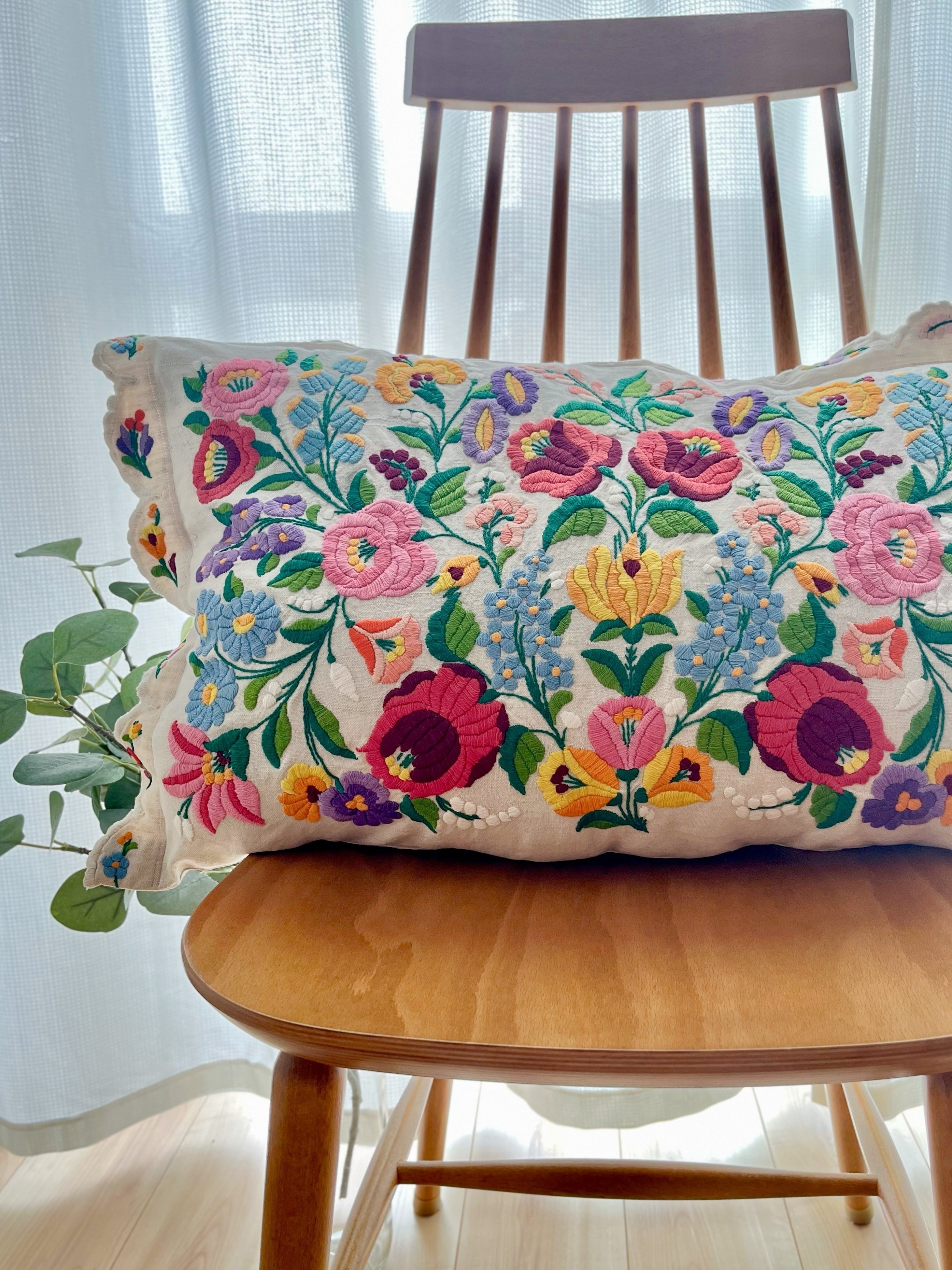 一面をすべて埋め尽くしそうなほどに、豪華な刺繍が施されたピローカバー。