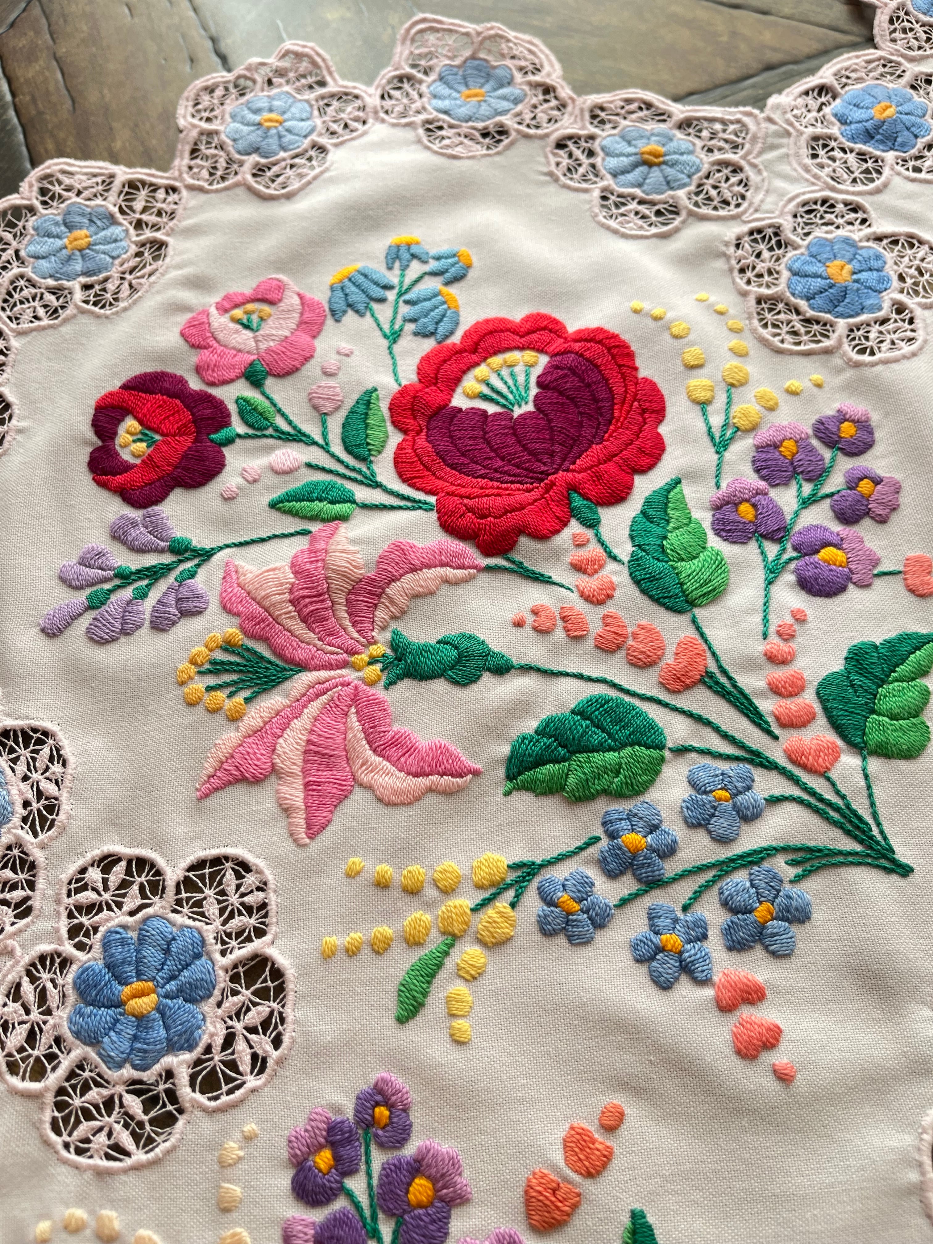 ぐるりと一周を囲うお花の縁は、リシェリューレースが施され真ん中には可憐な水色お花の刺繍が施された非常に贅沢な1枚。内側のカロチャ刺繍もとても丁寧で、熟練の技がたっぷりと詰まっています。