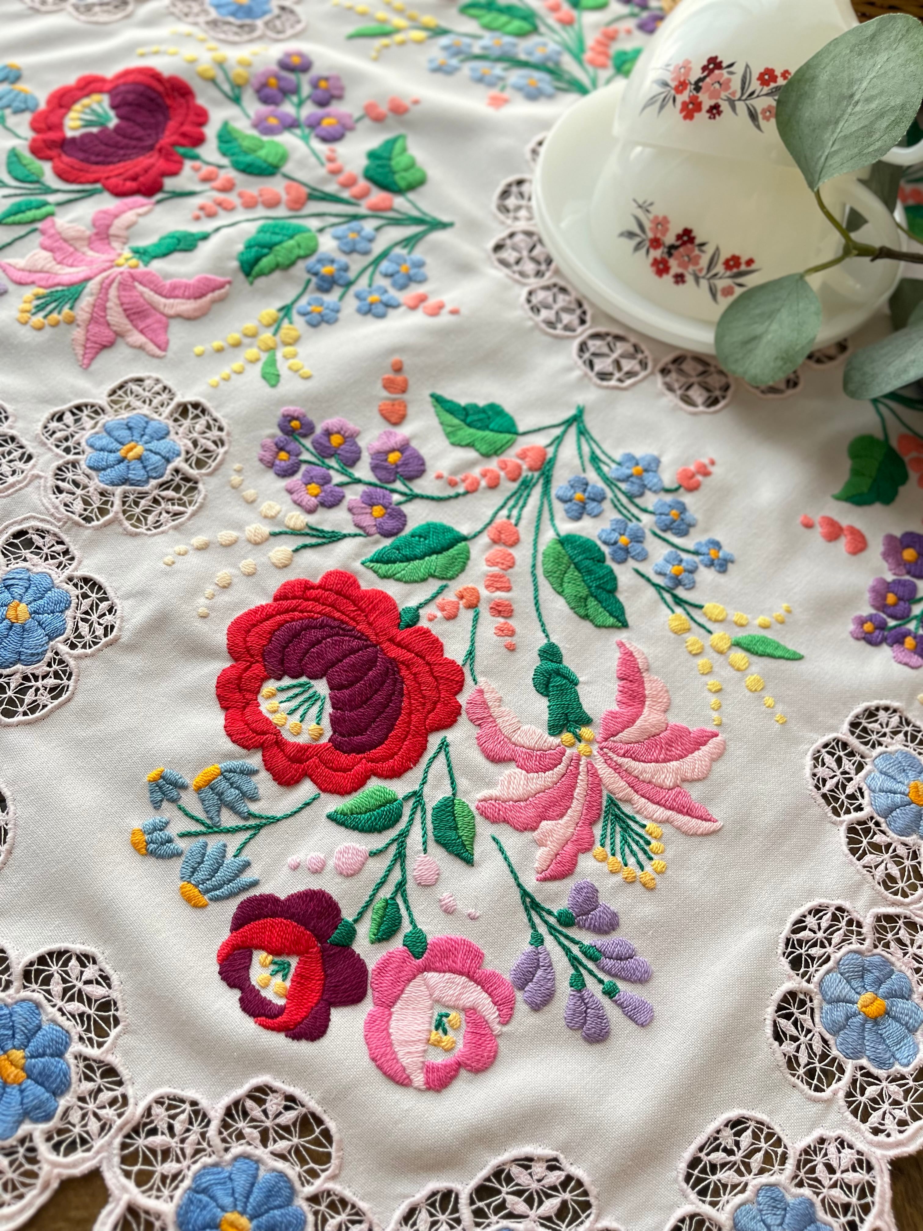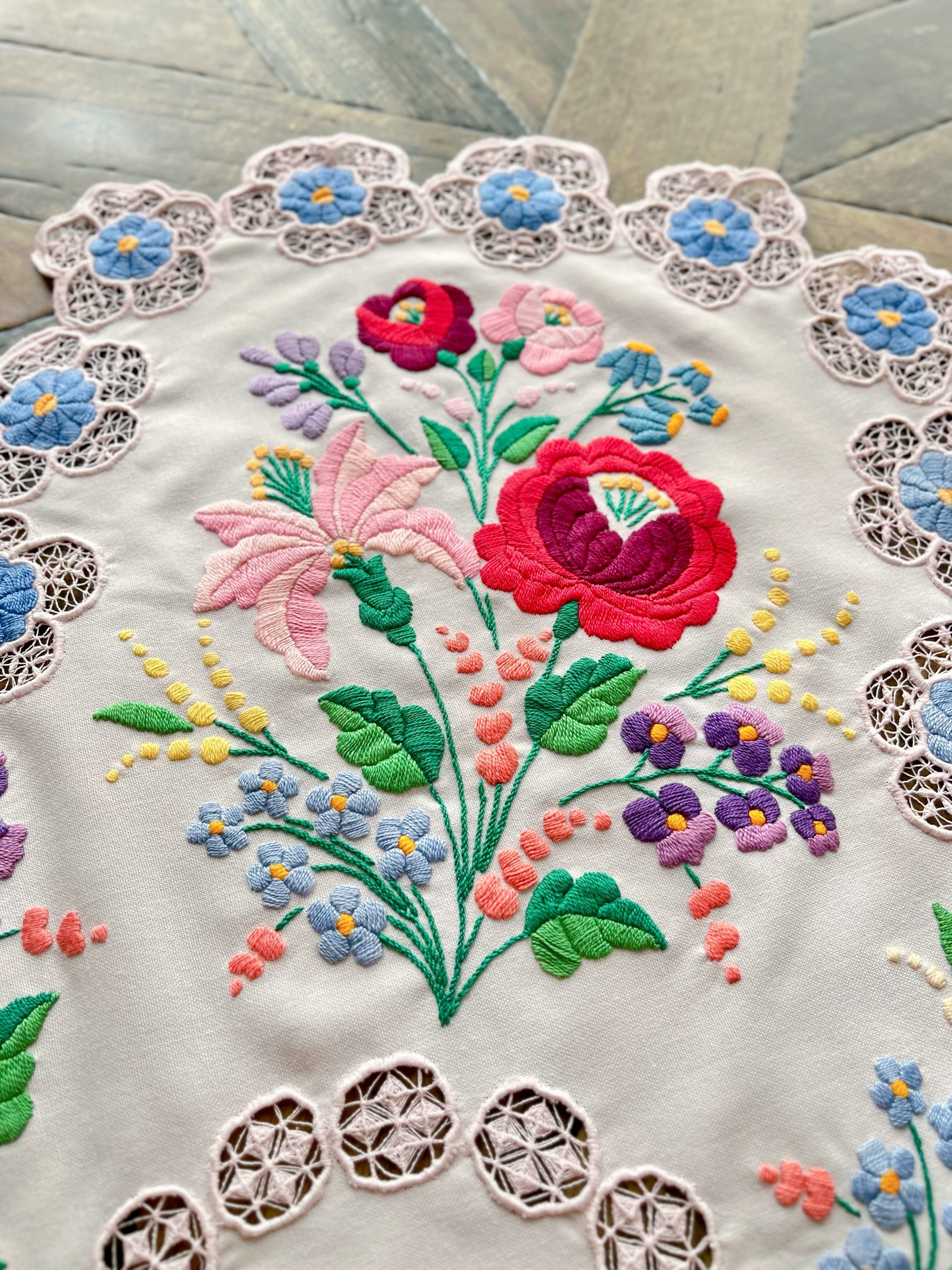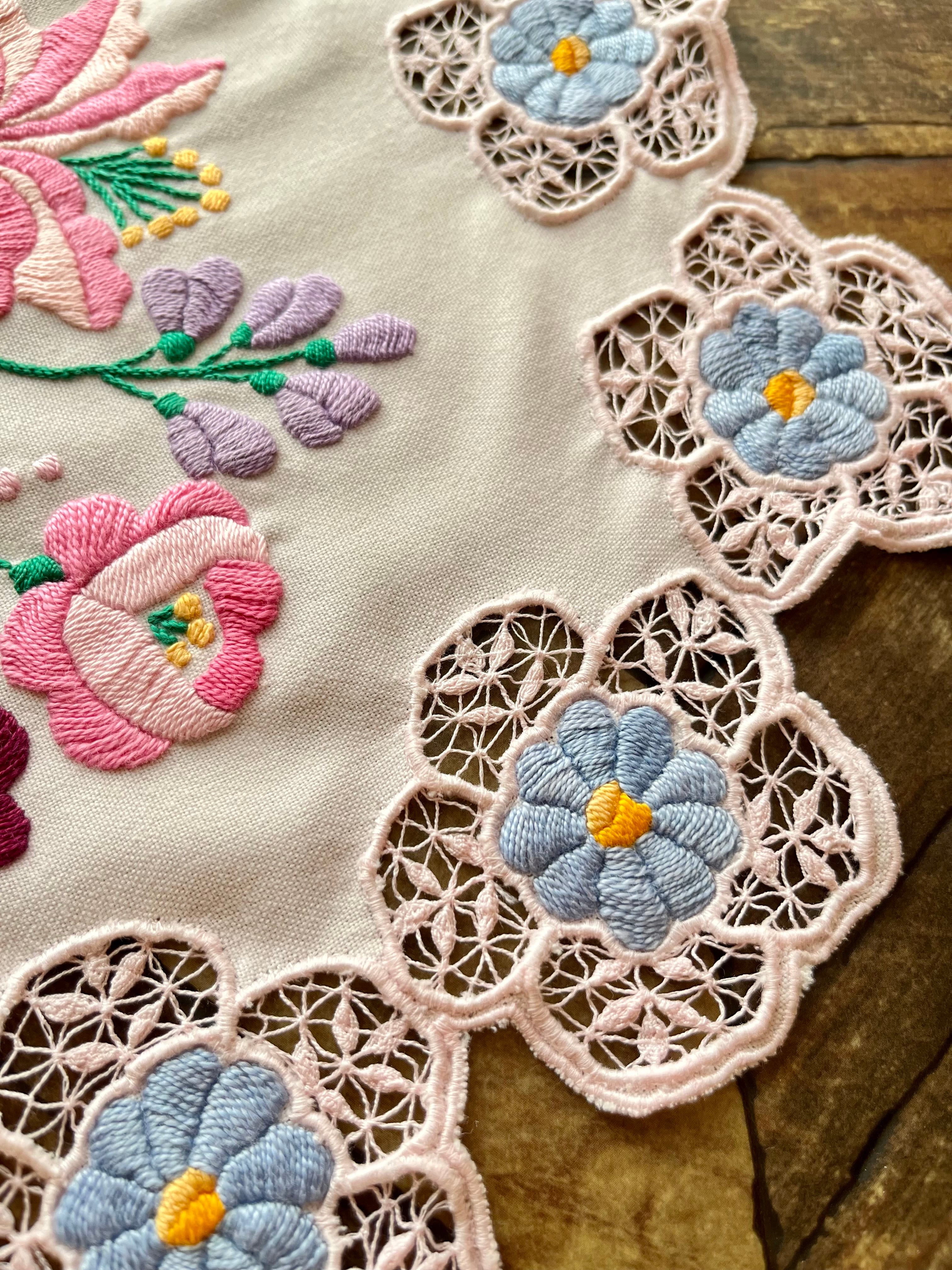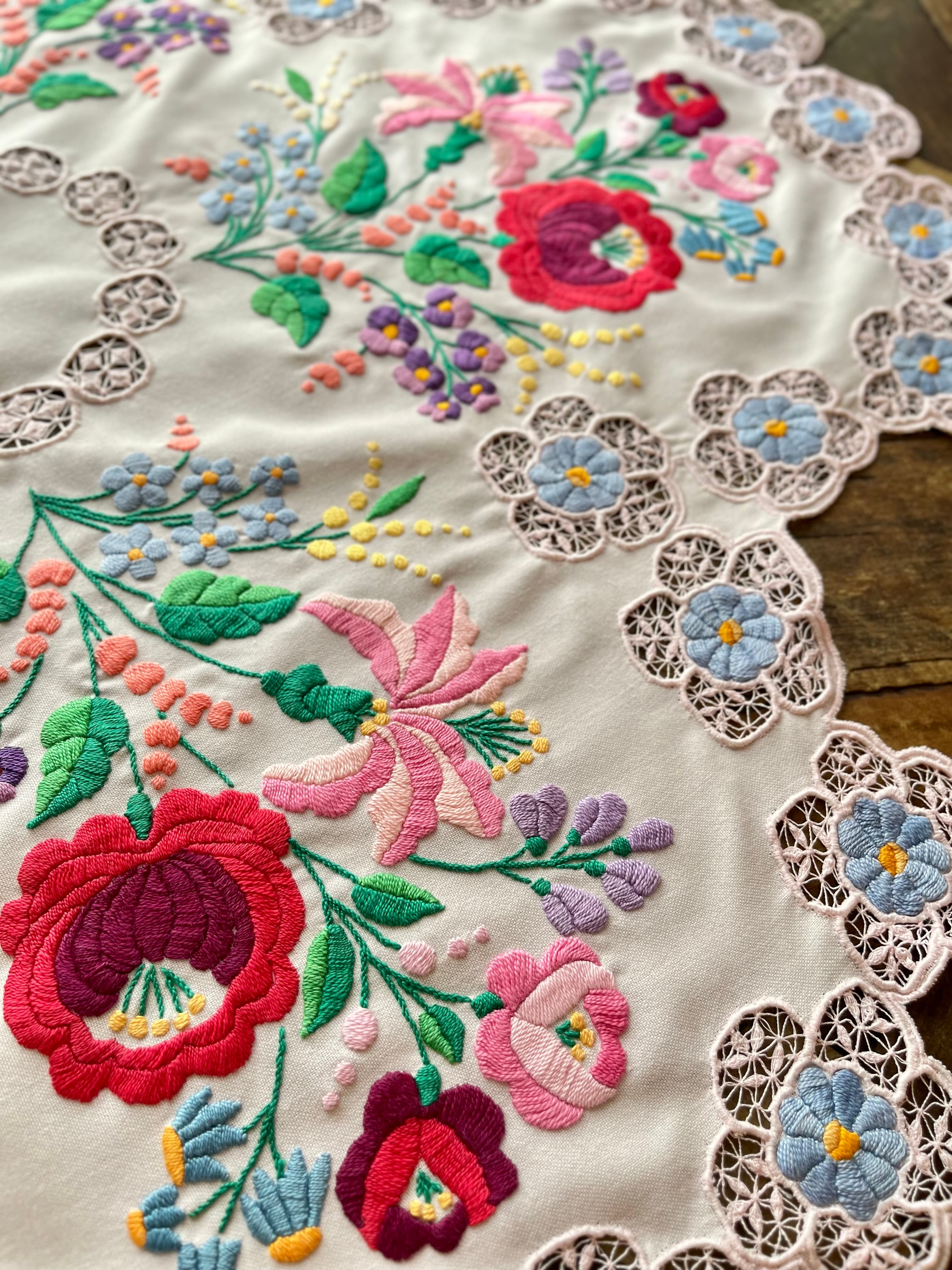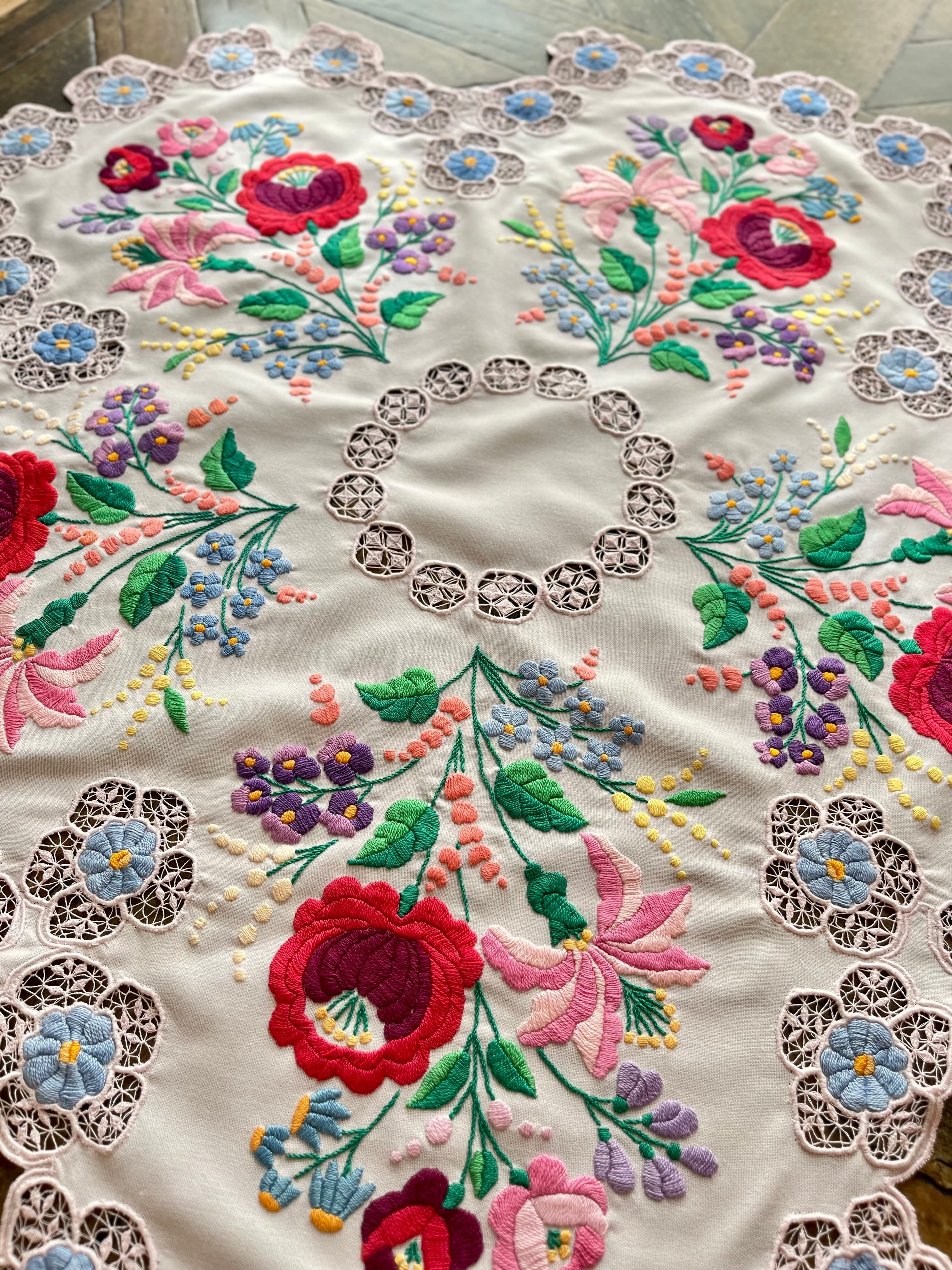 満開!ほんのりピンクの花型リシェリュークロス カロチャ刺繍 78.5×77cm