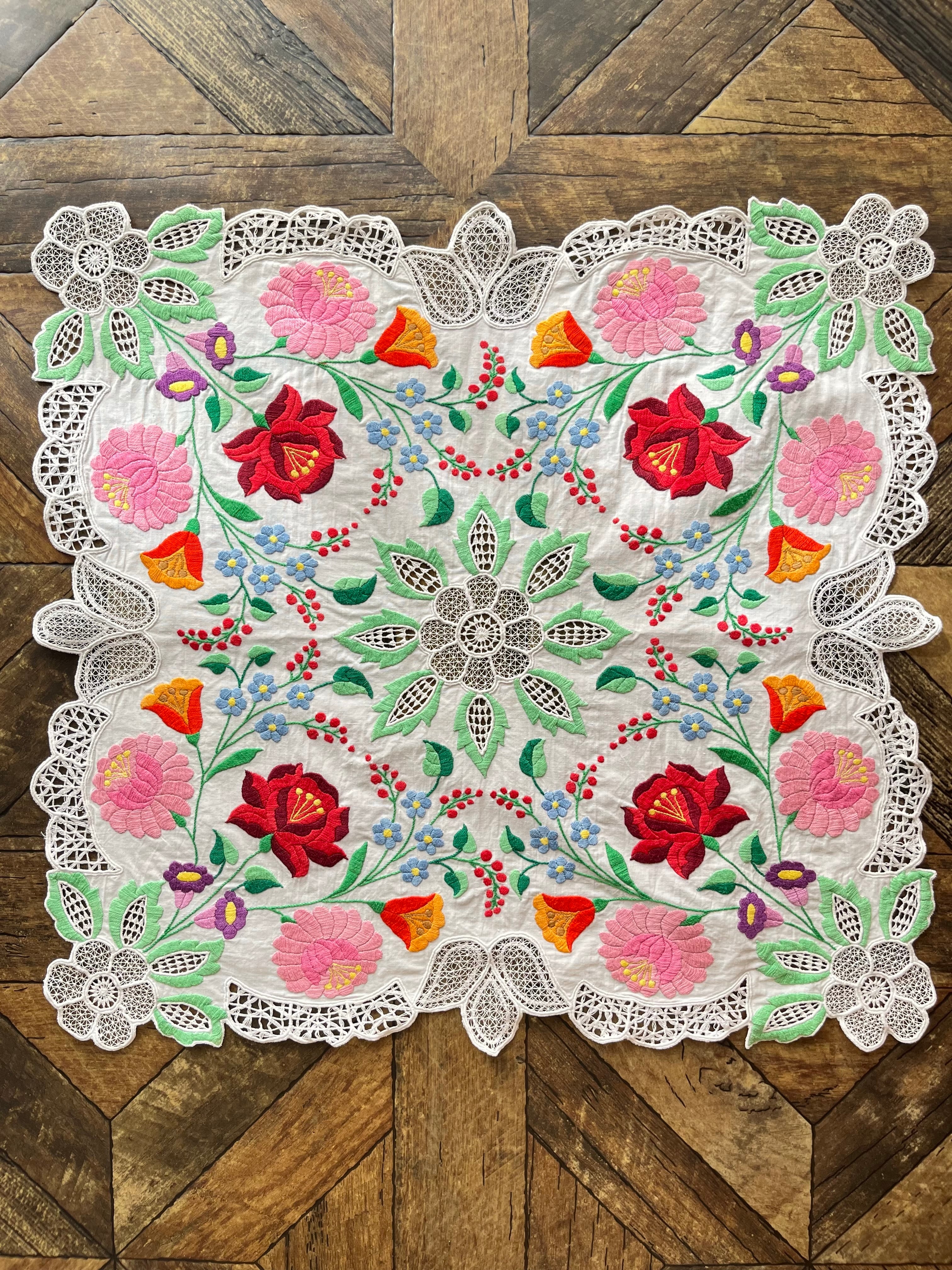 圧巻!爽やかカラーのリシェリュークロス カロチャ刺繍 58.5×55.5cm