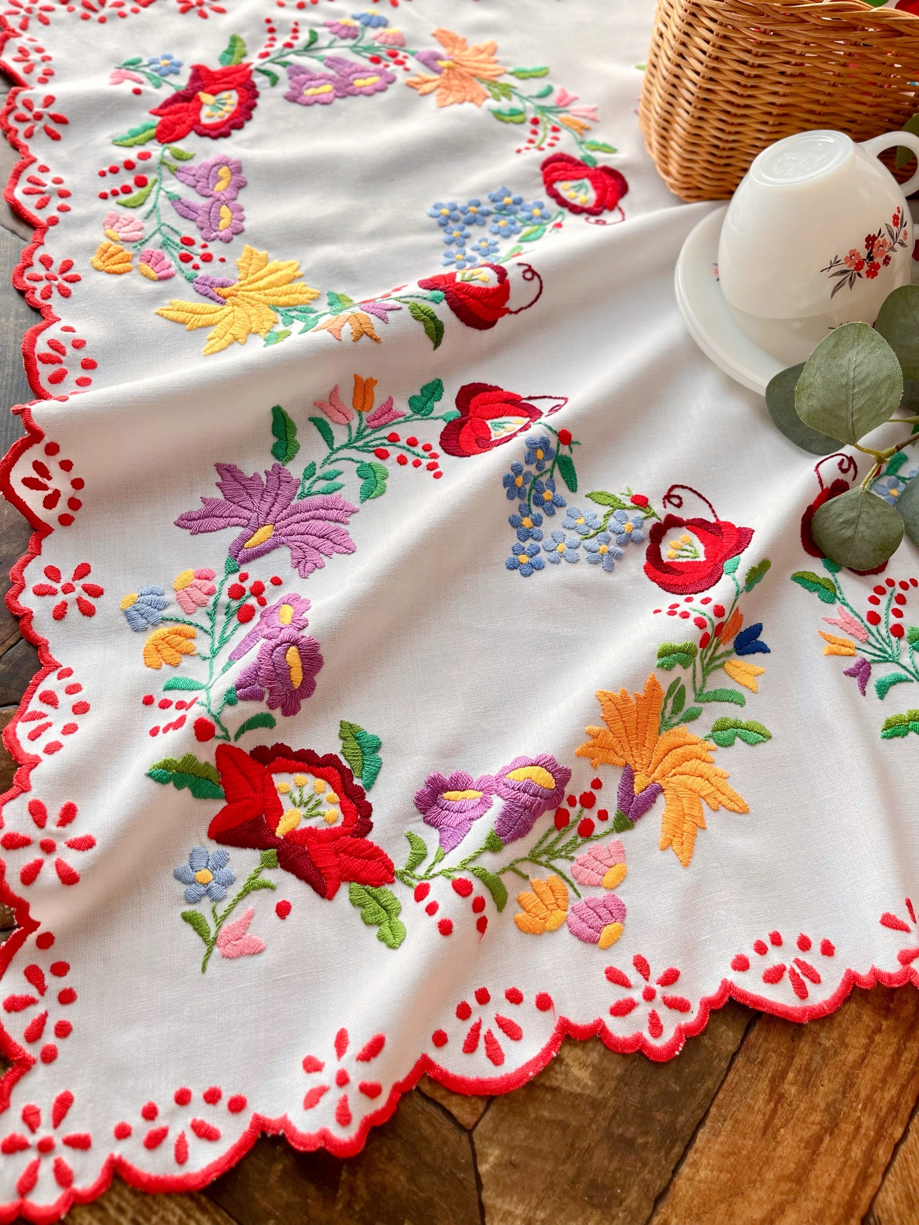 縁までこだわり!ハートのカロチャ刺繍のテーブルクロス ヴィンテージ 72×50cm