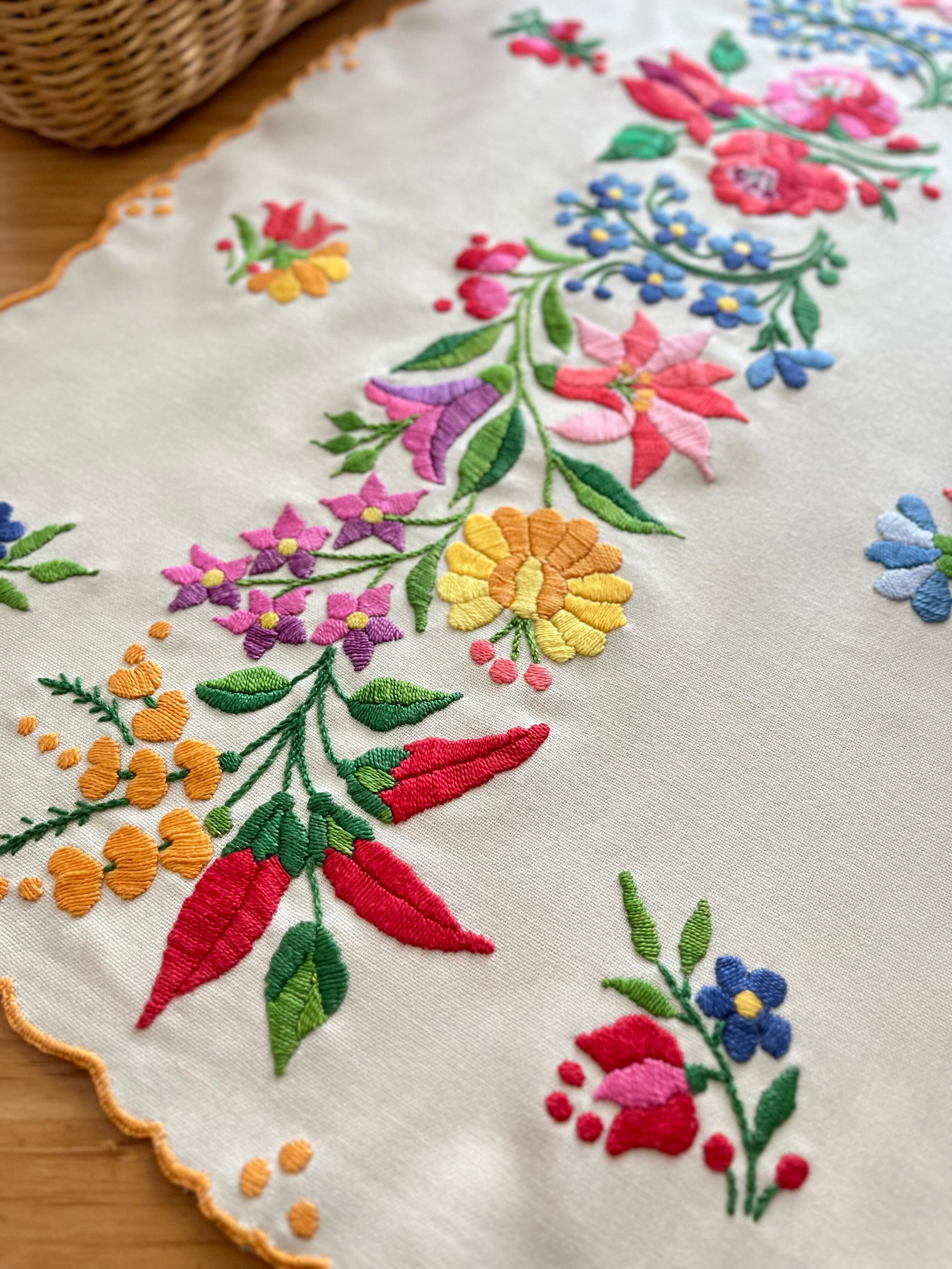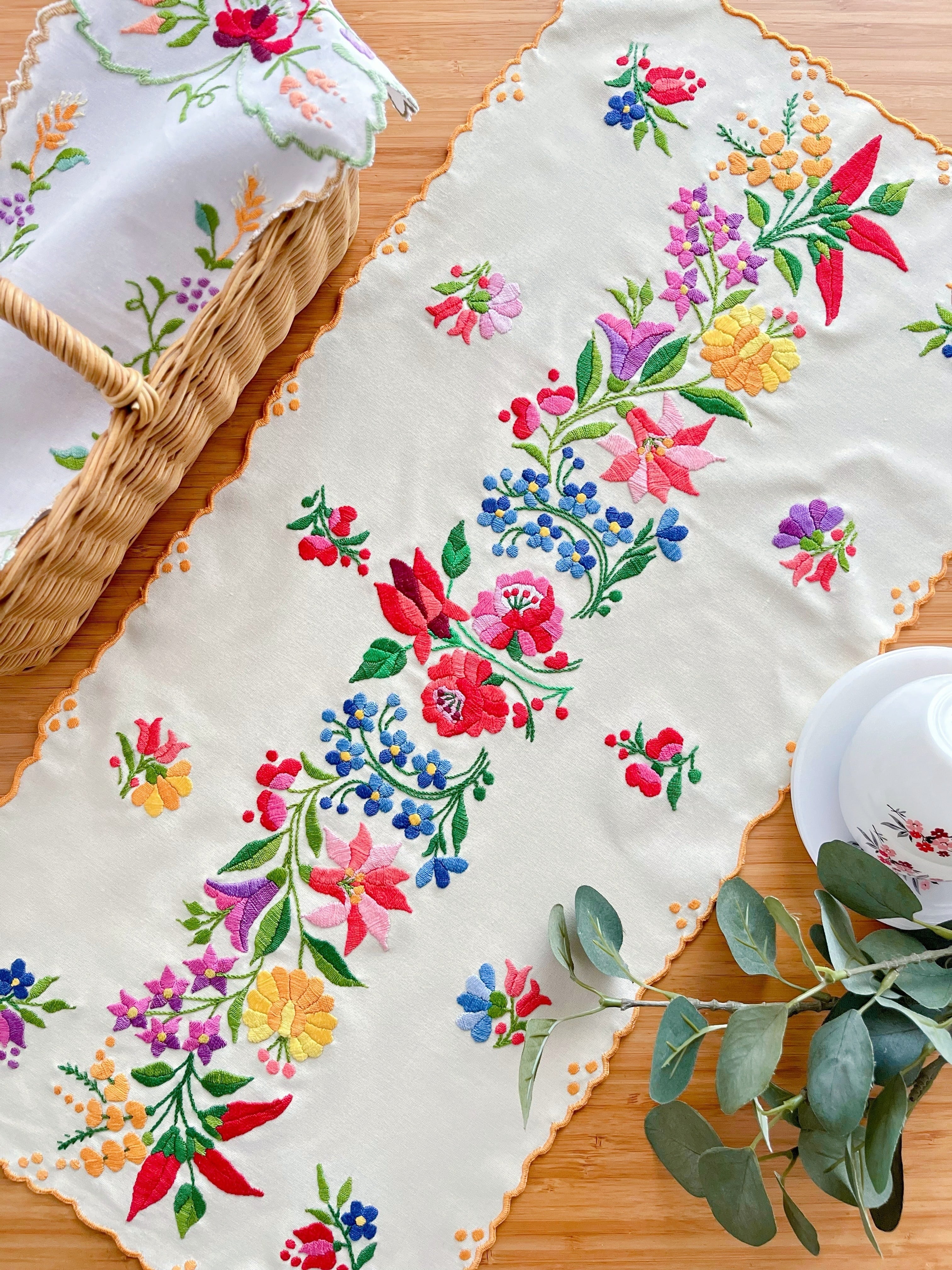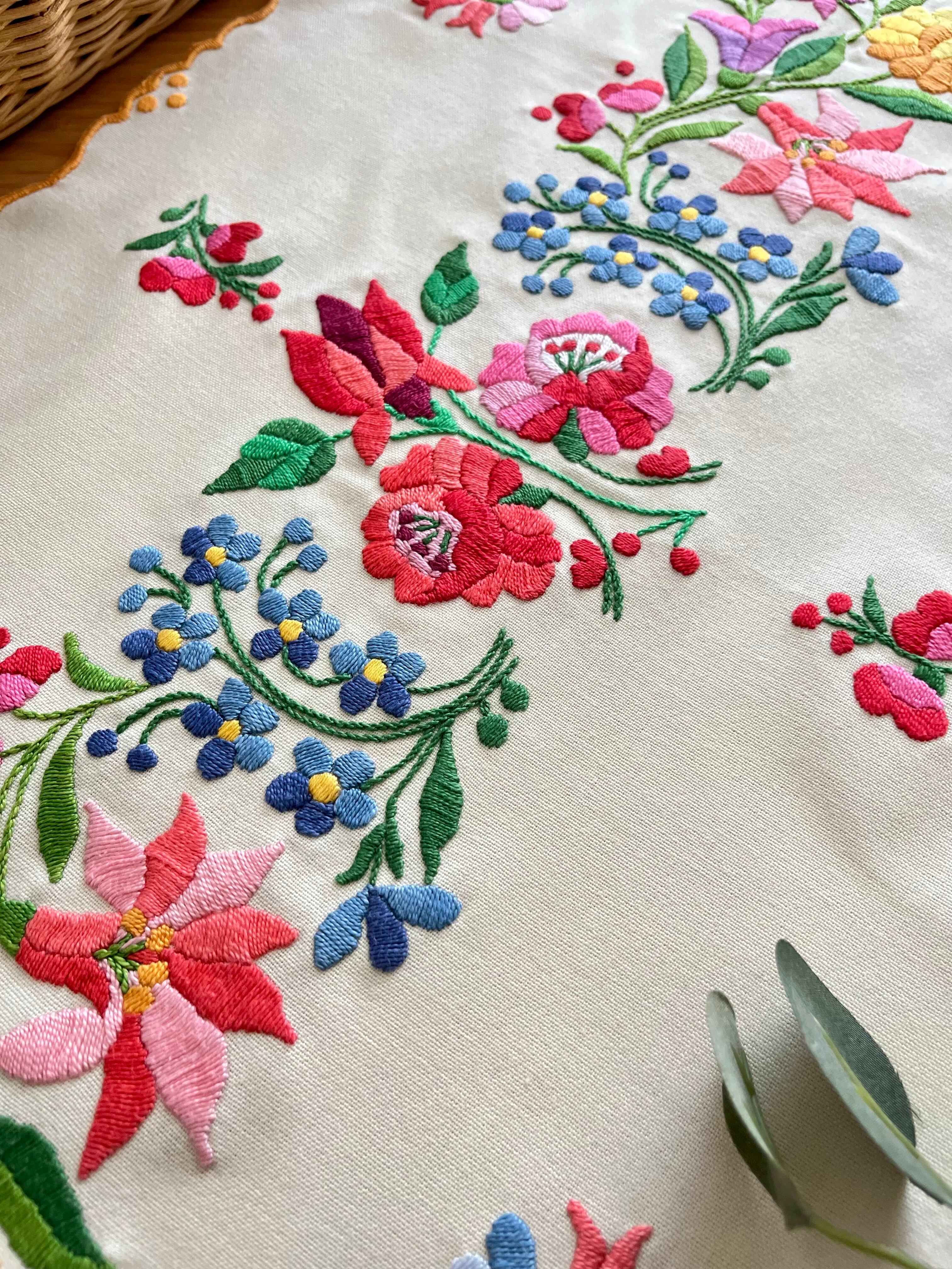 イエローの縁とみちみちの刺繍がキュートなテーブルランナー!
