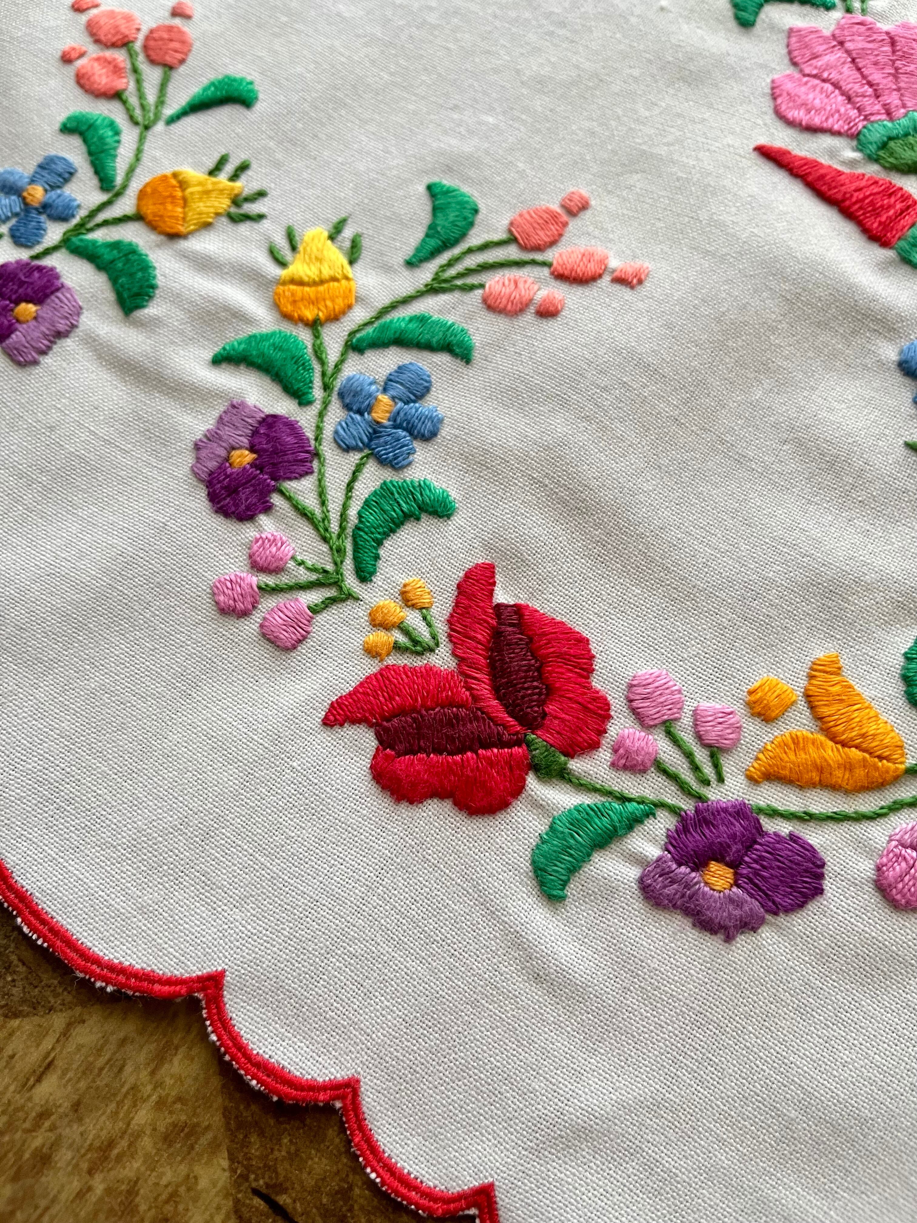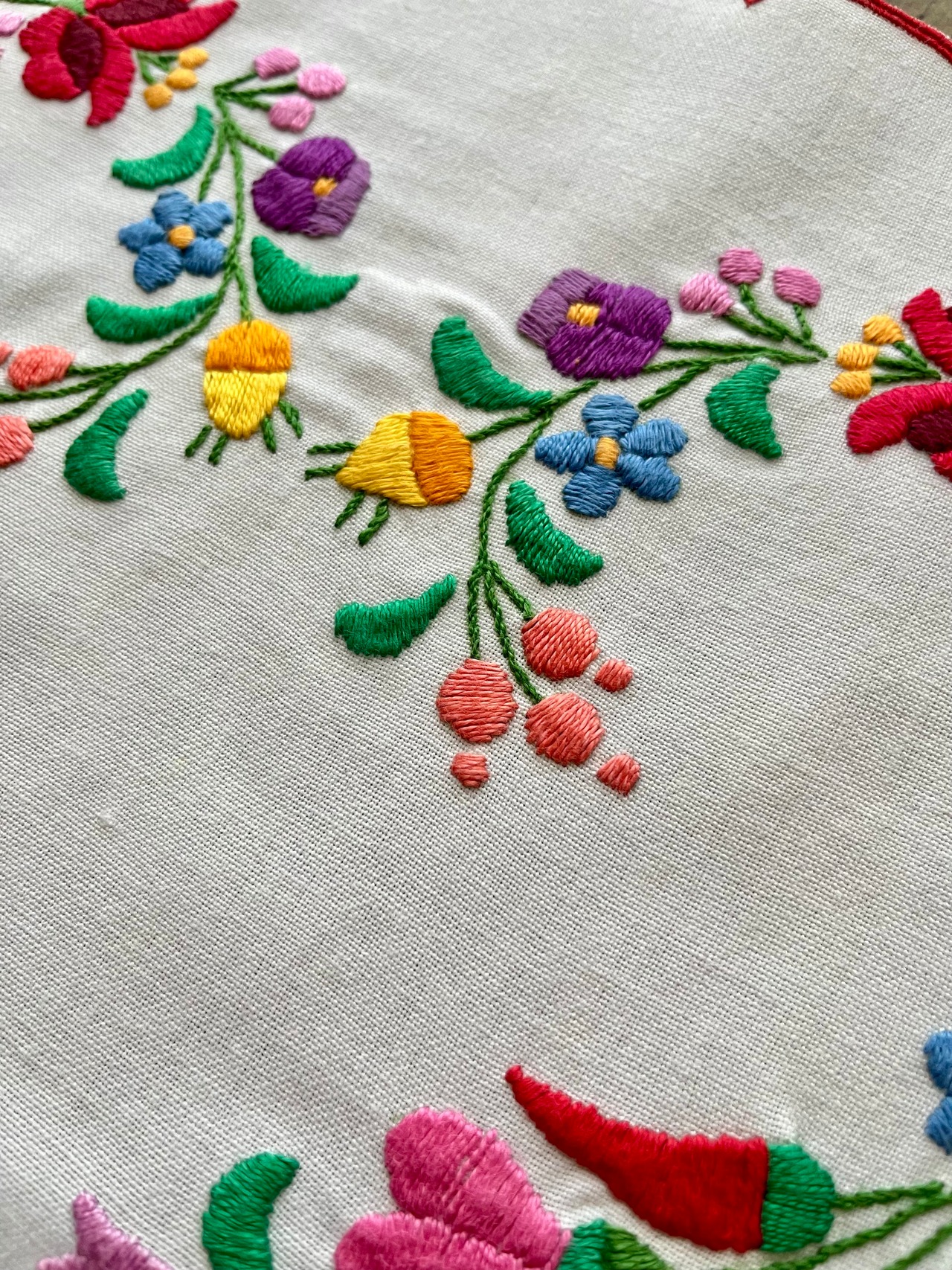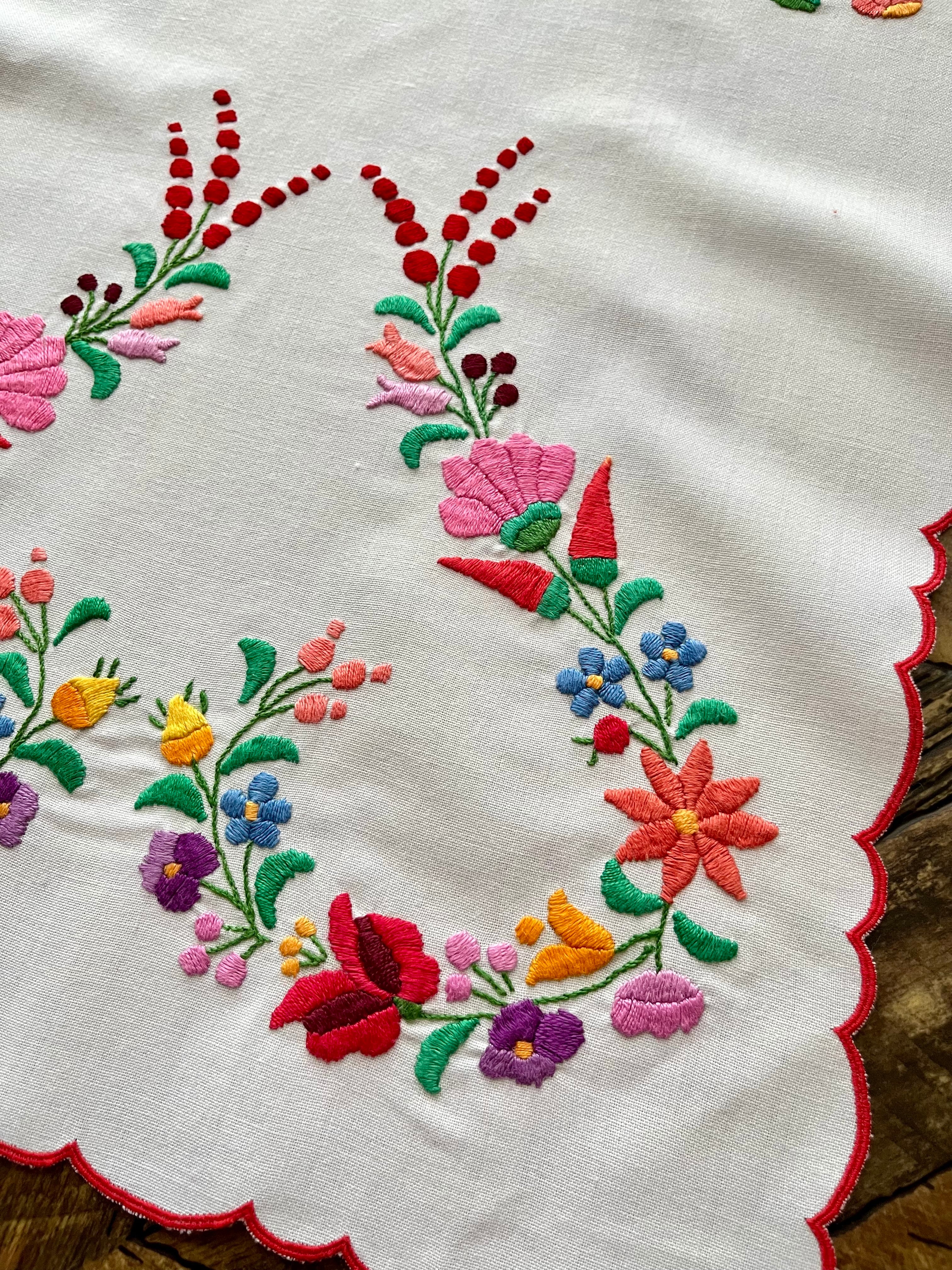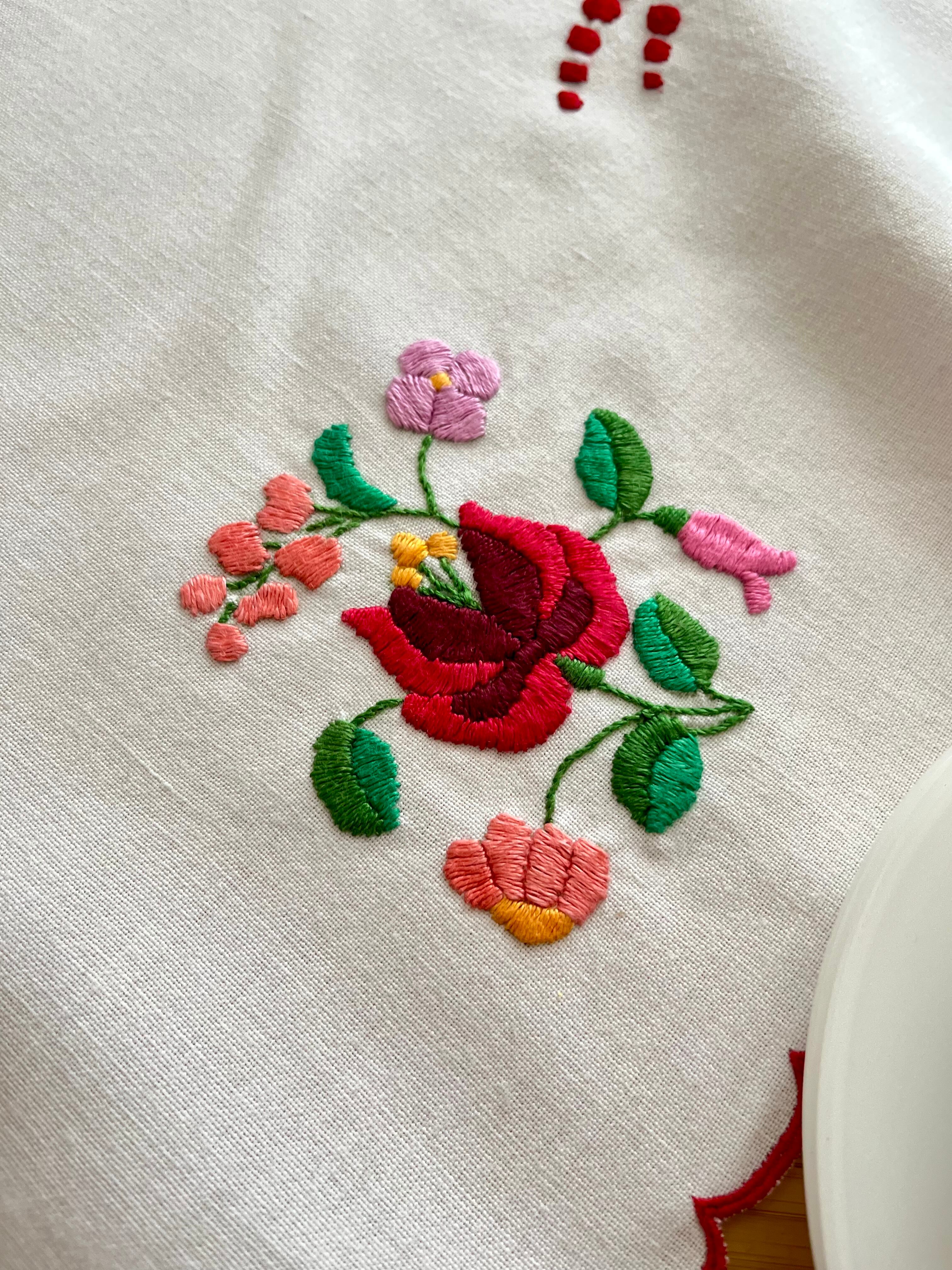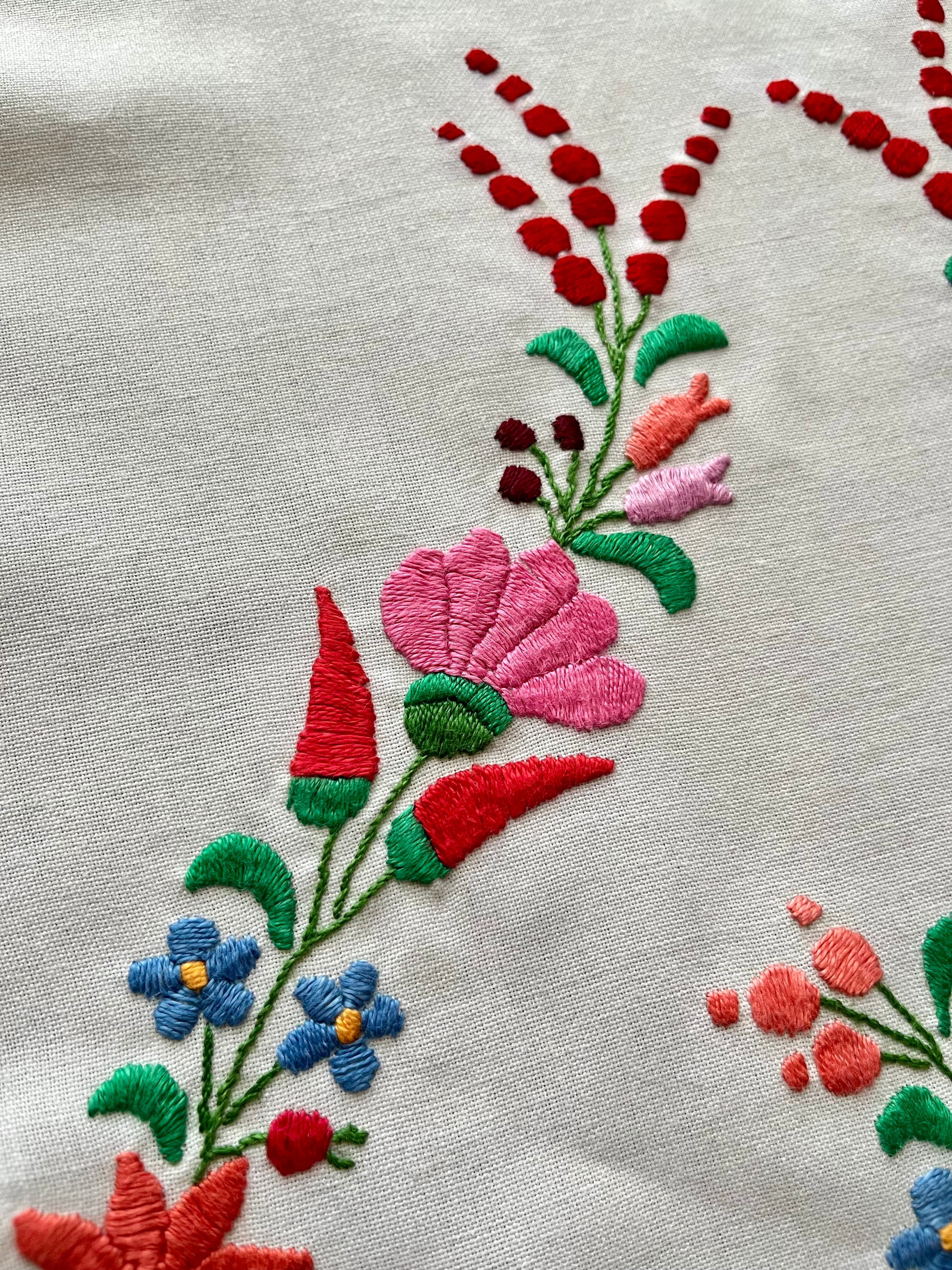 赤とピンクがメインカラーで、カロチャ刺繍の可憐さがより引き出されている特別な1枚。