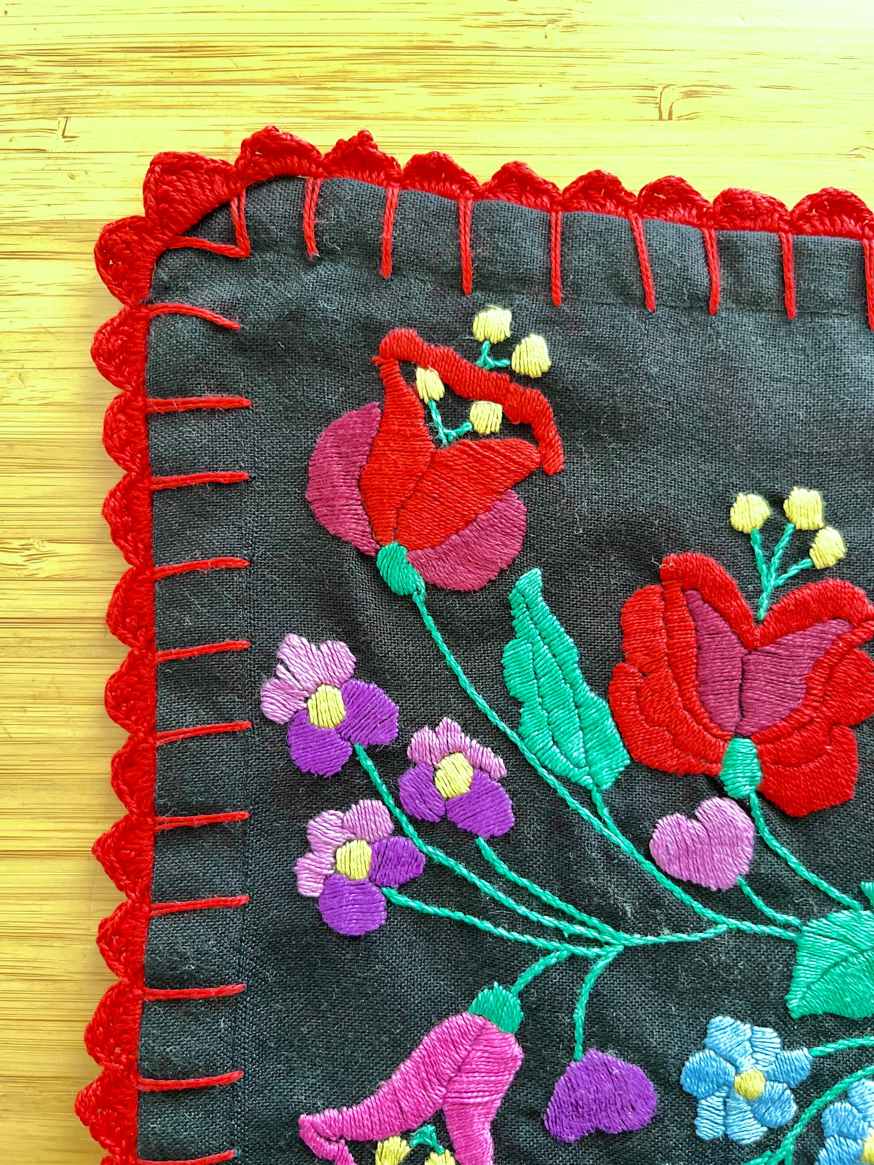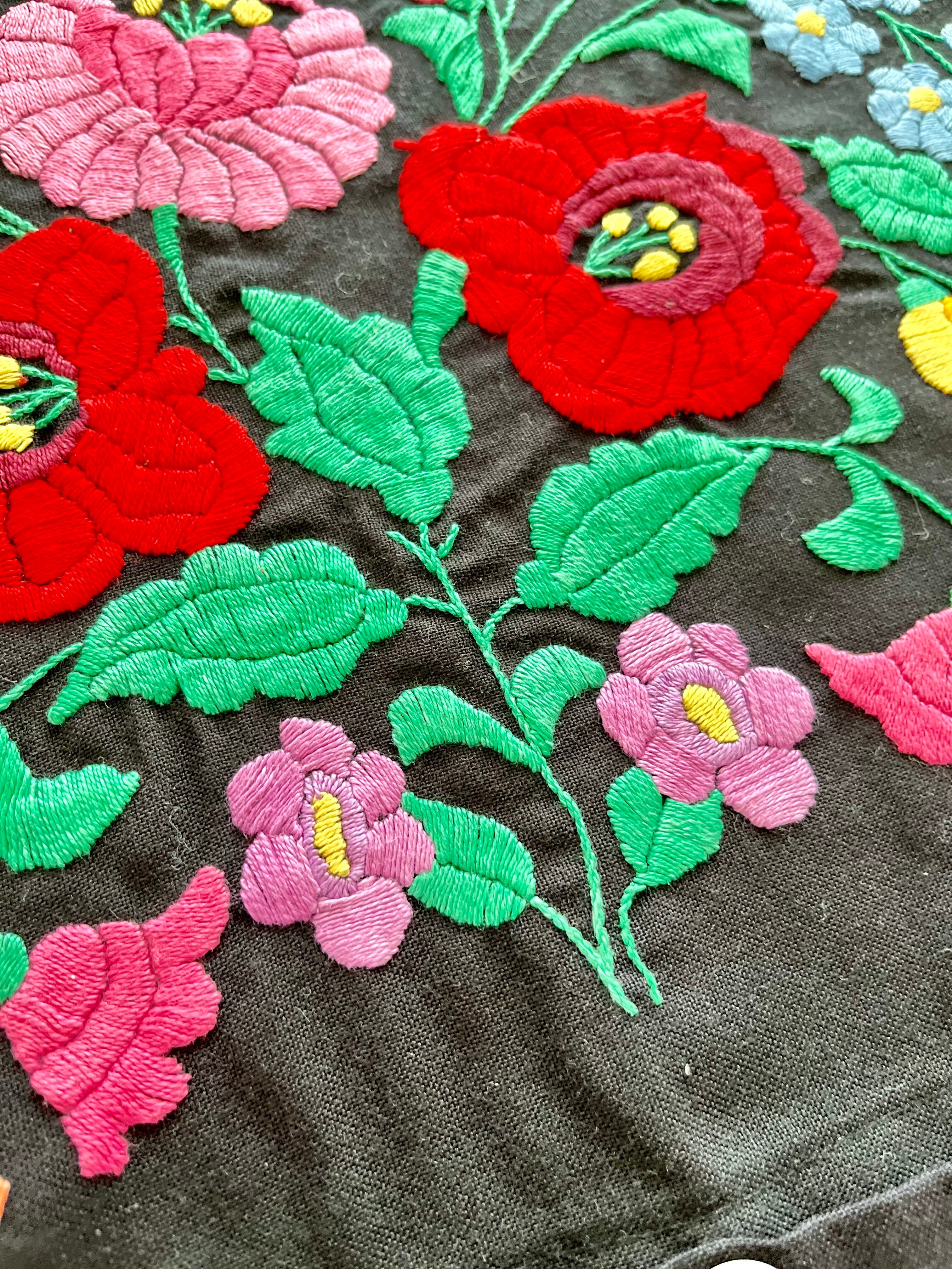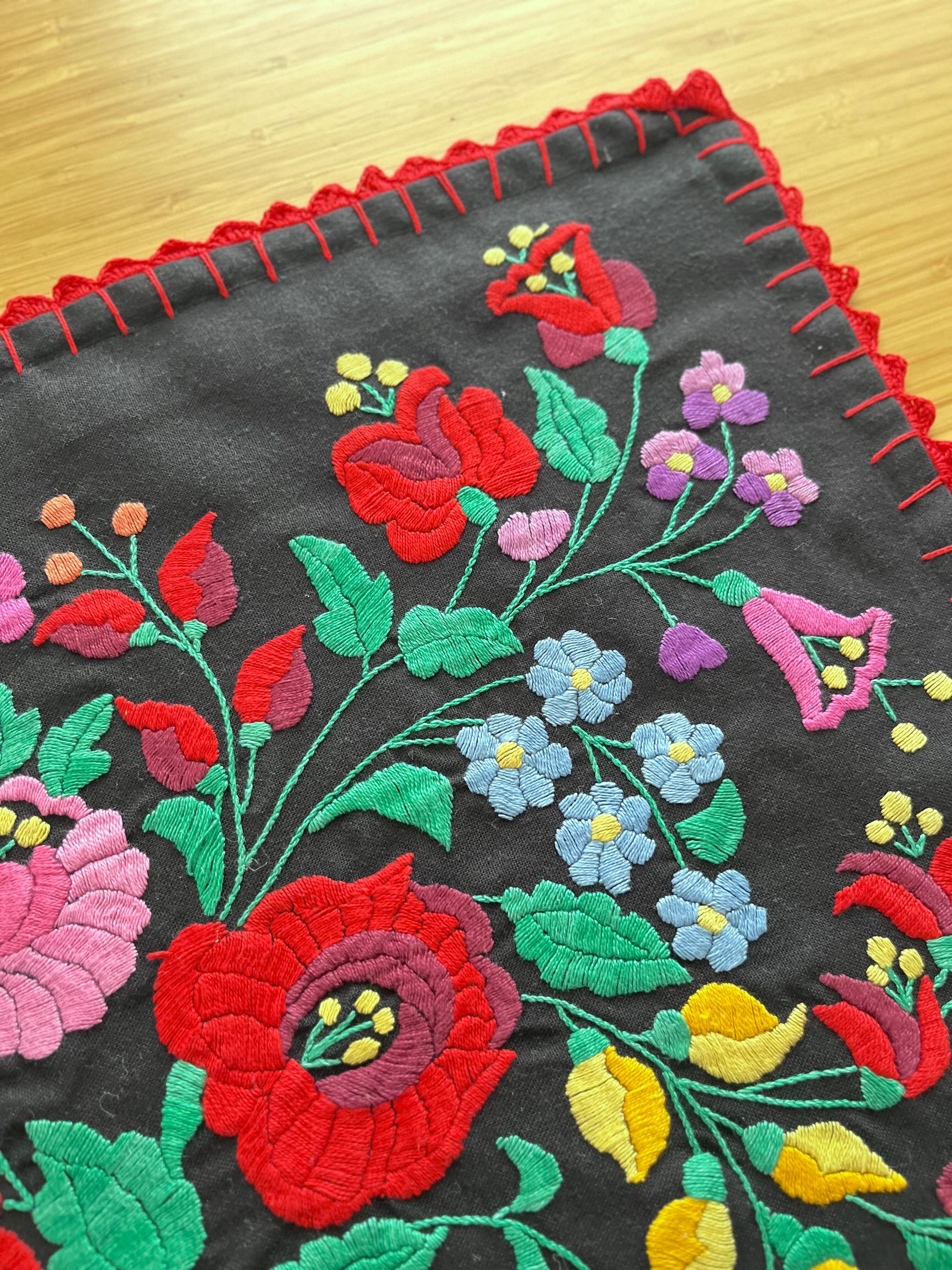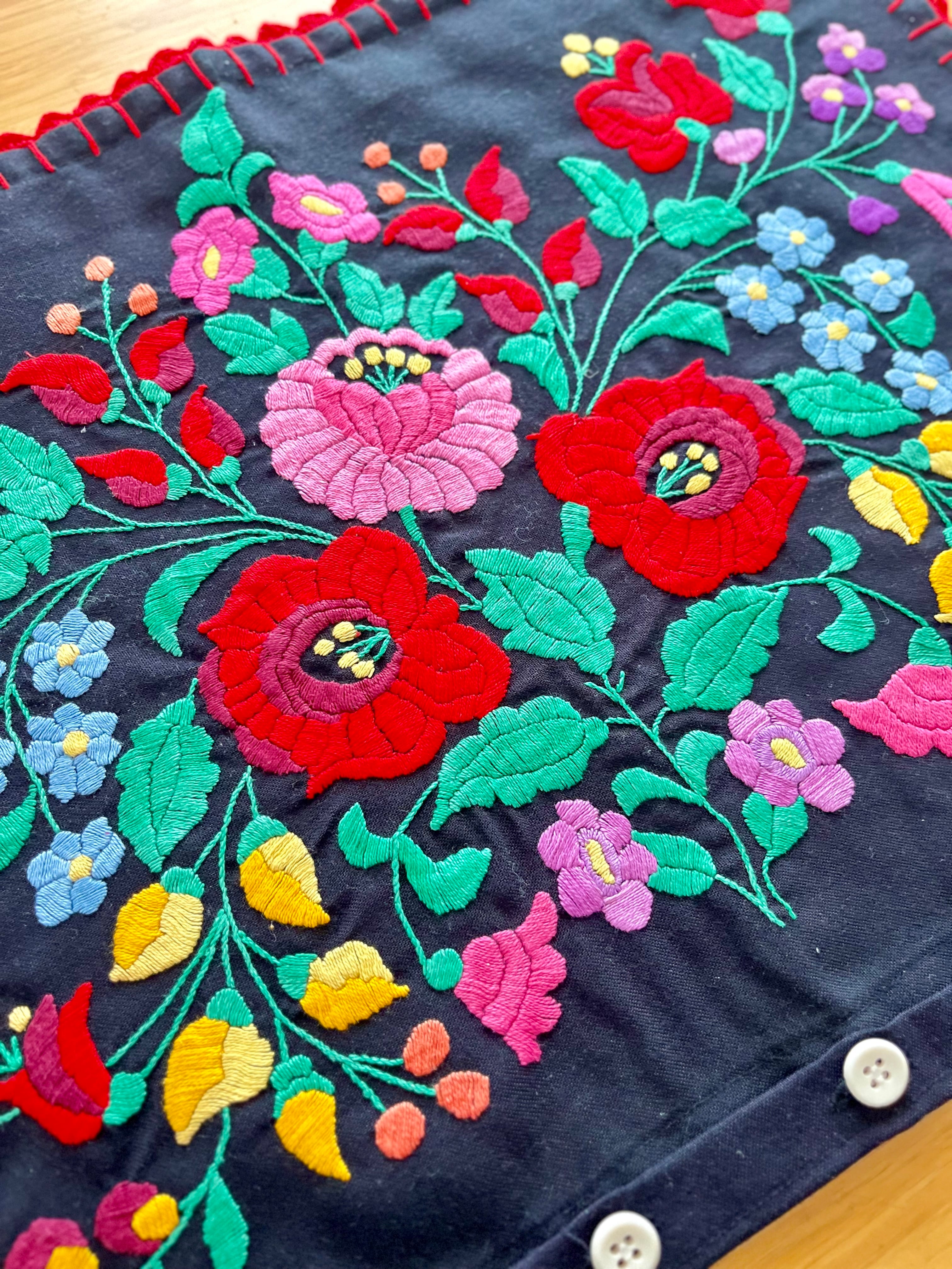ブラックの布地にカロチャ刺繍が施された貴重な逸品です。