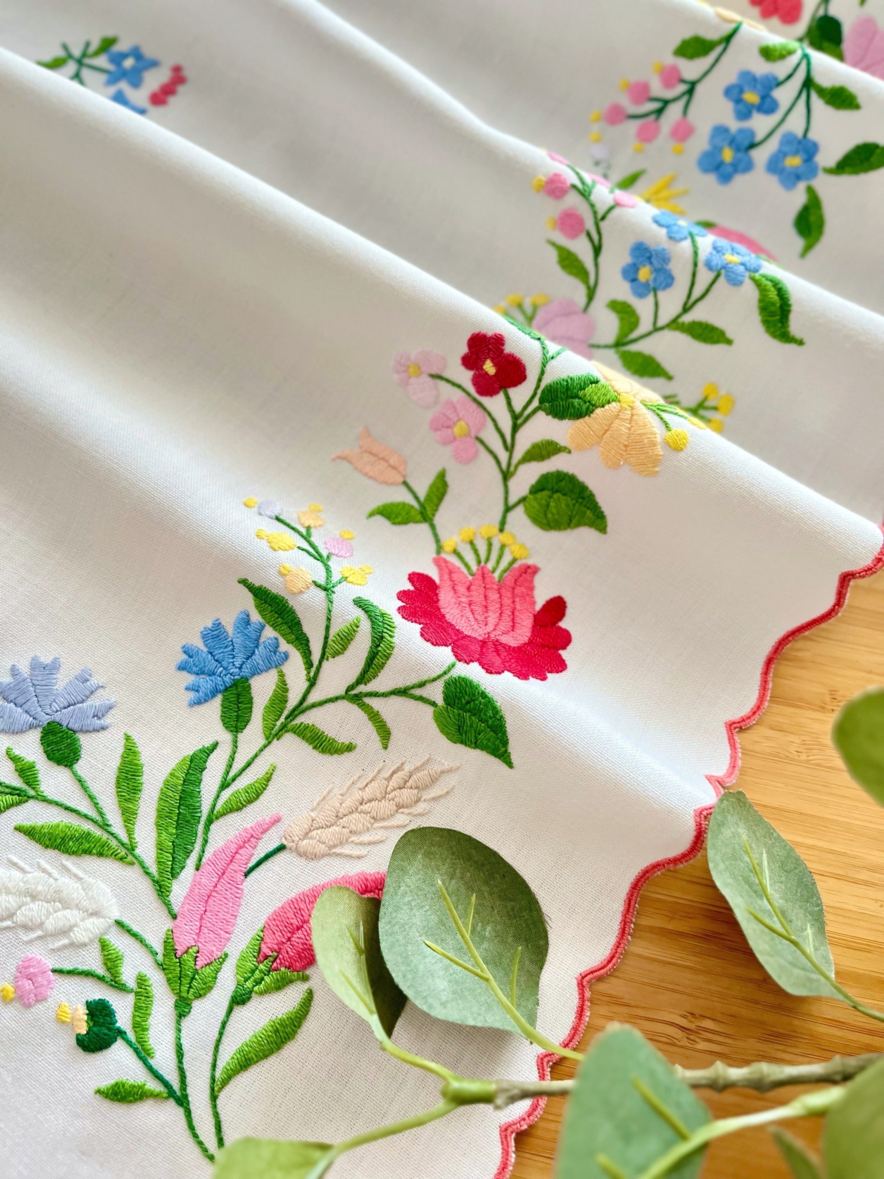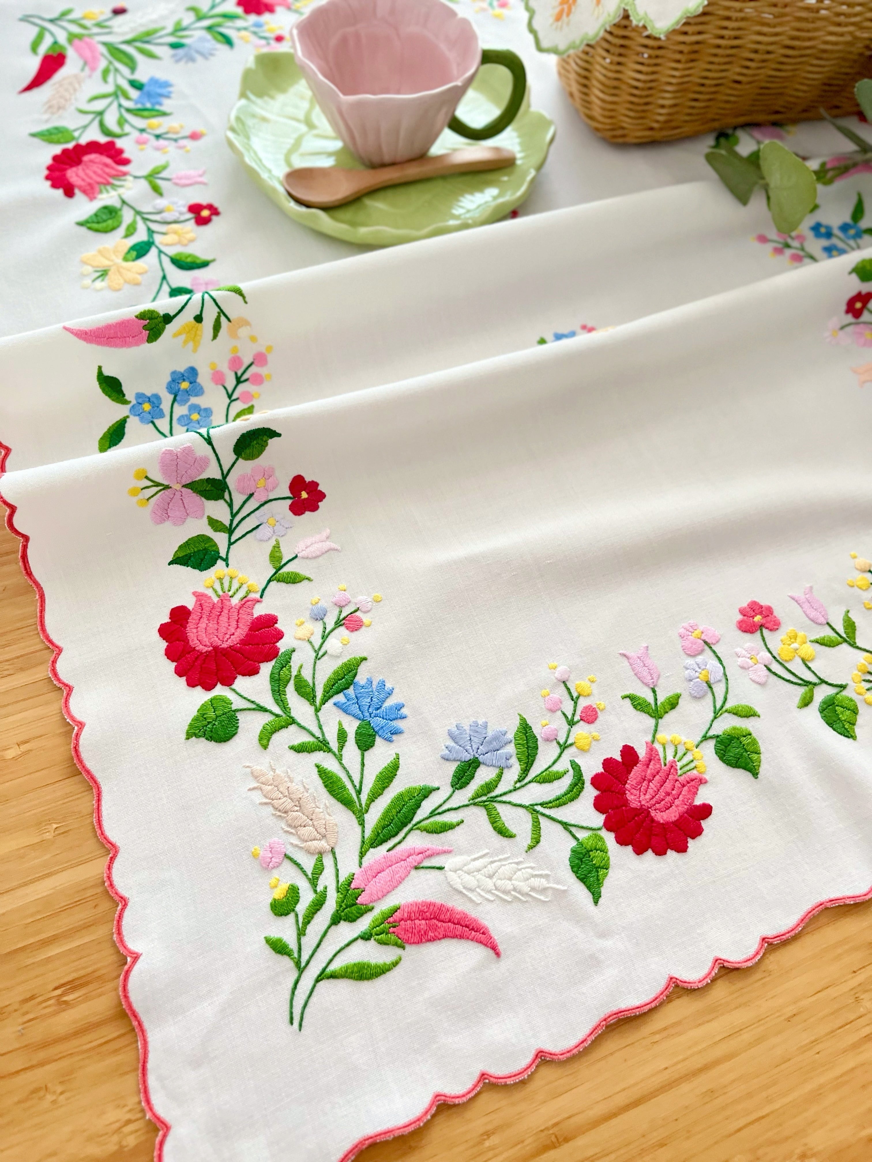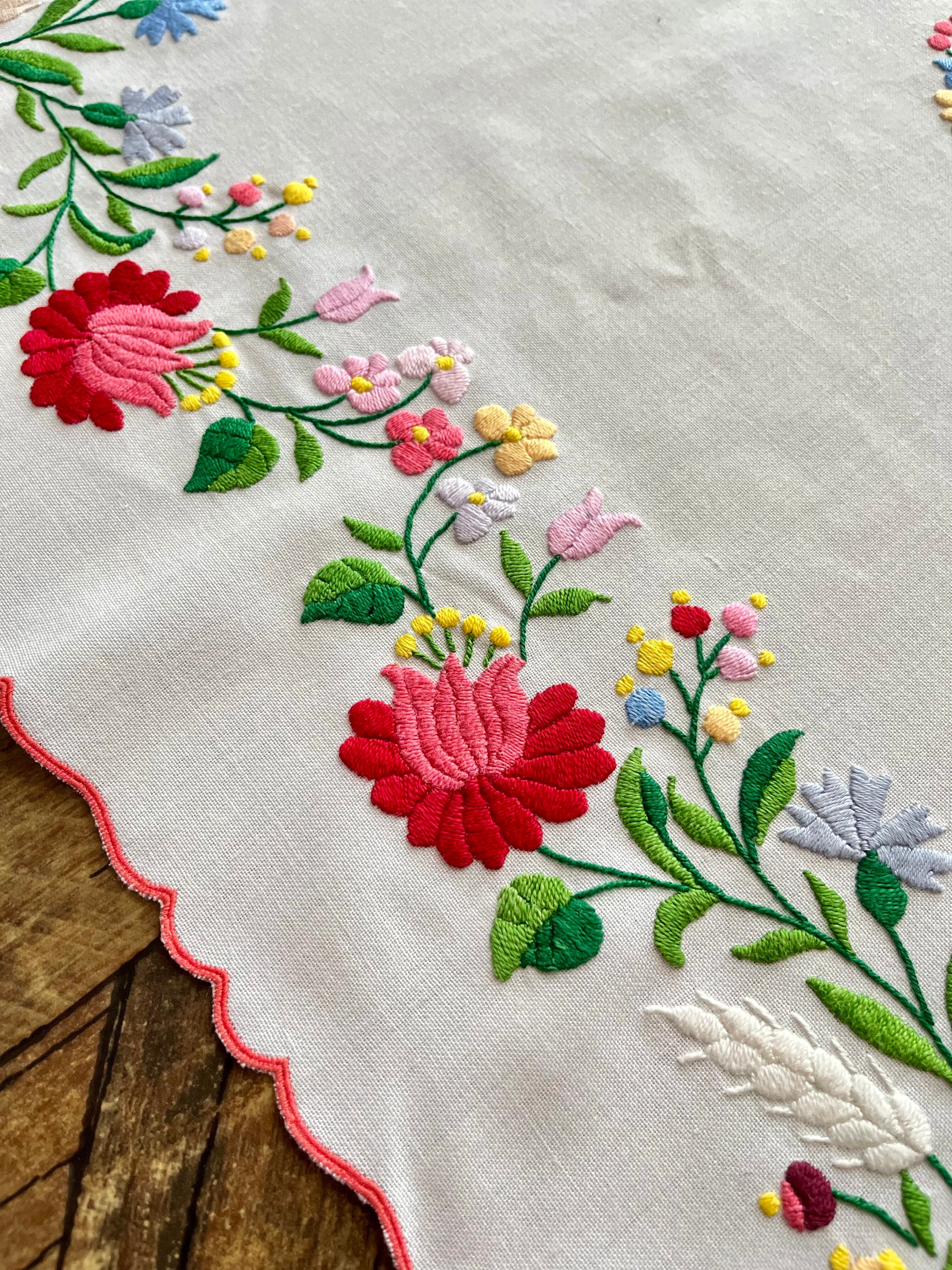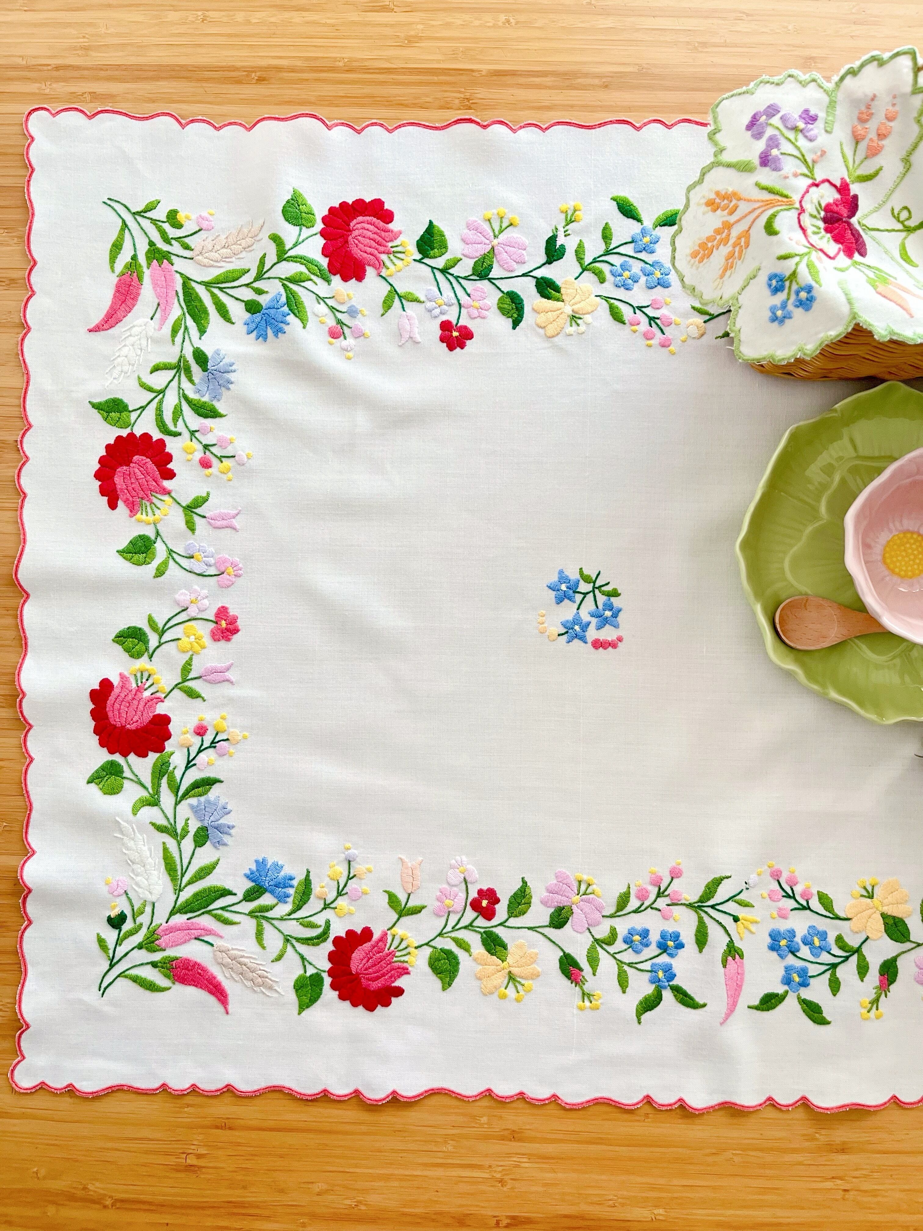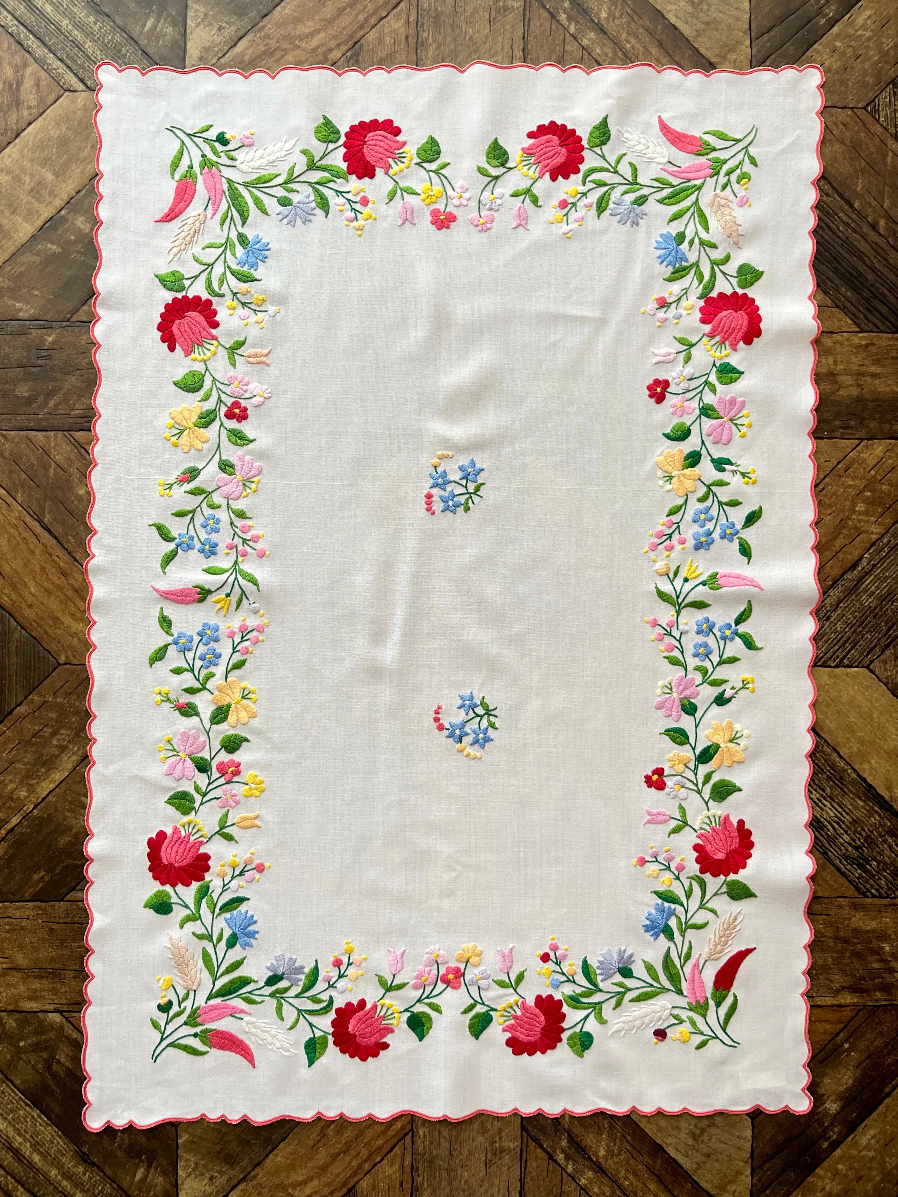 明るいパステル調のカラーリングがキュートなカロチャ刺繍。珍しい長方形の小さめテーブルクロスです。