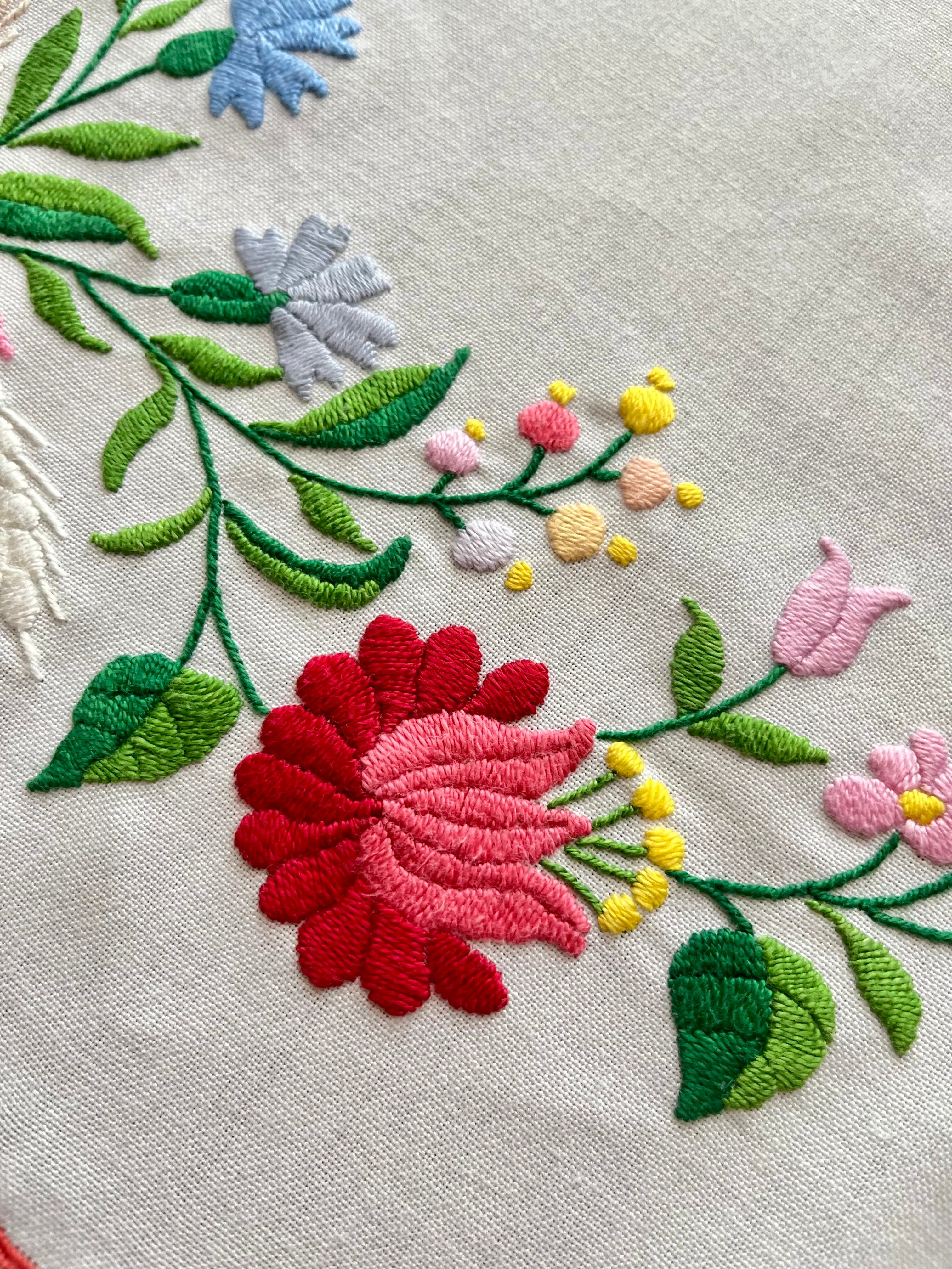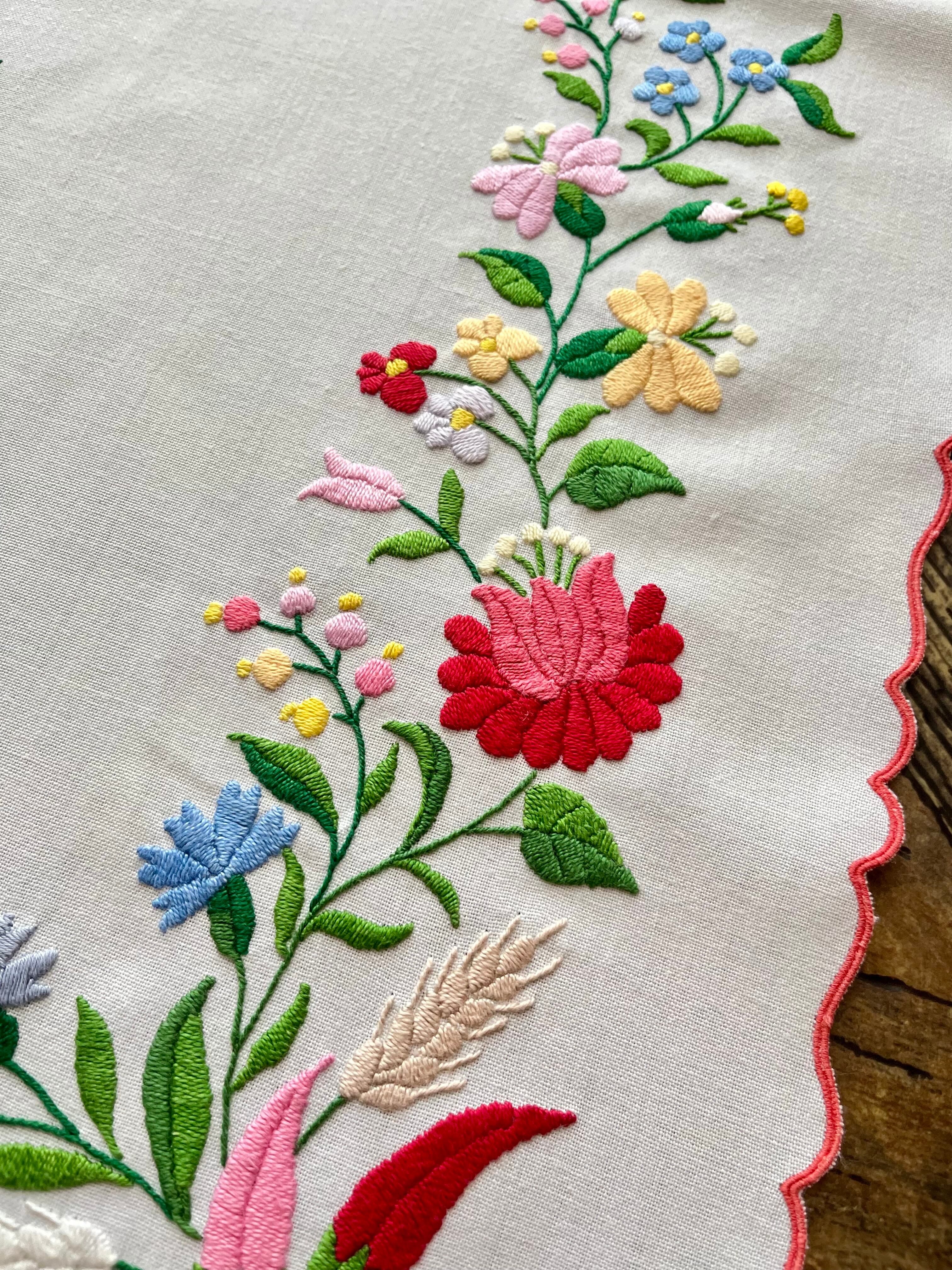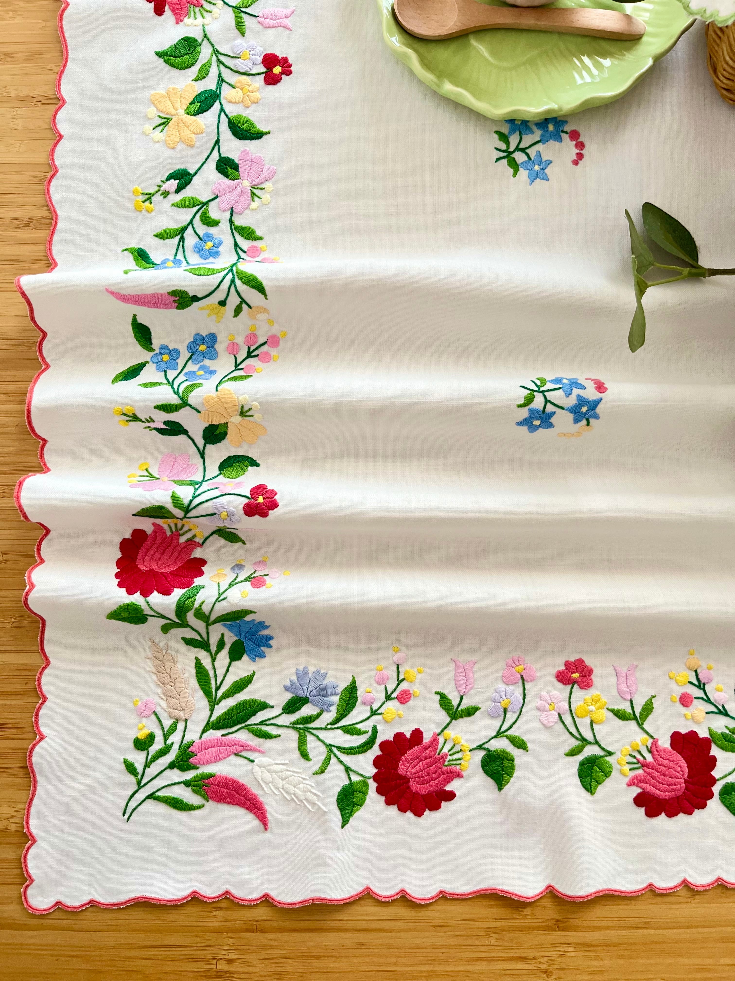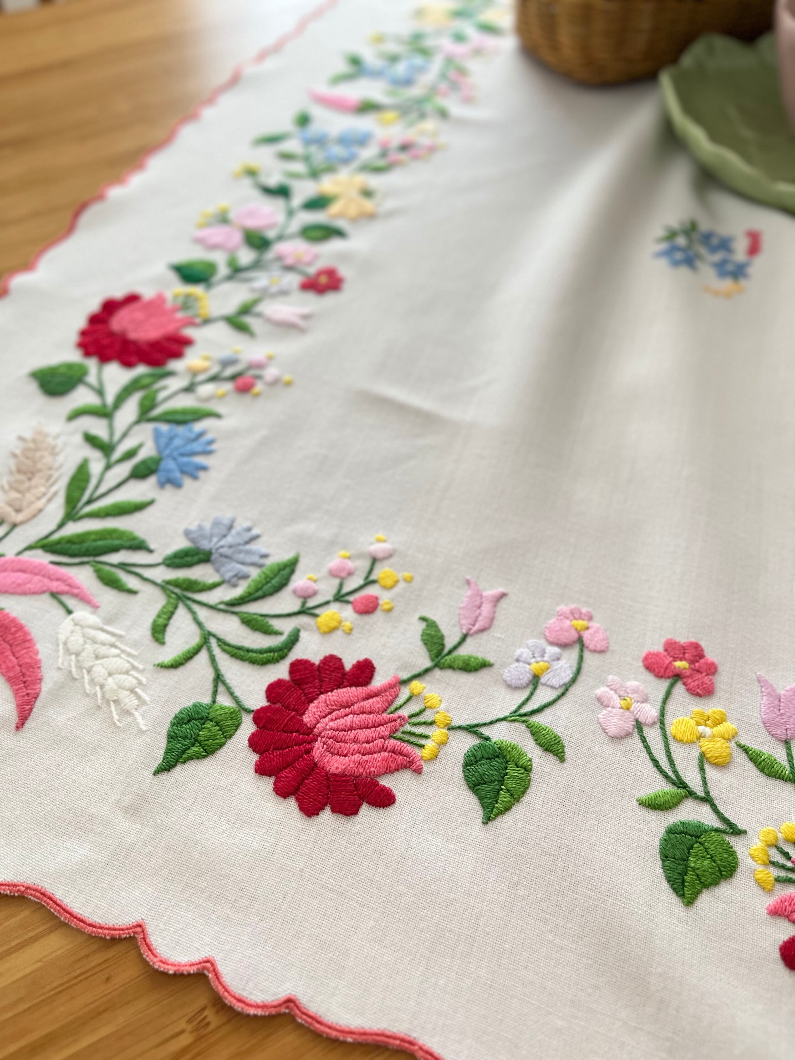 明るいパステル調のカラーリングがキュートなカロチャ刺繍。珍しい長方形の小さめテーブルクロスです。