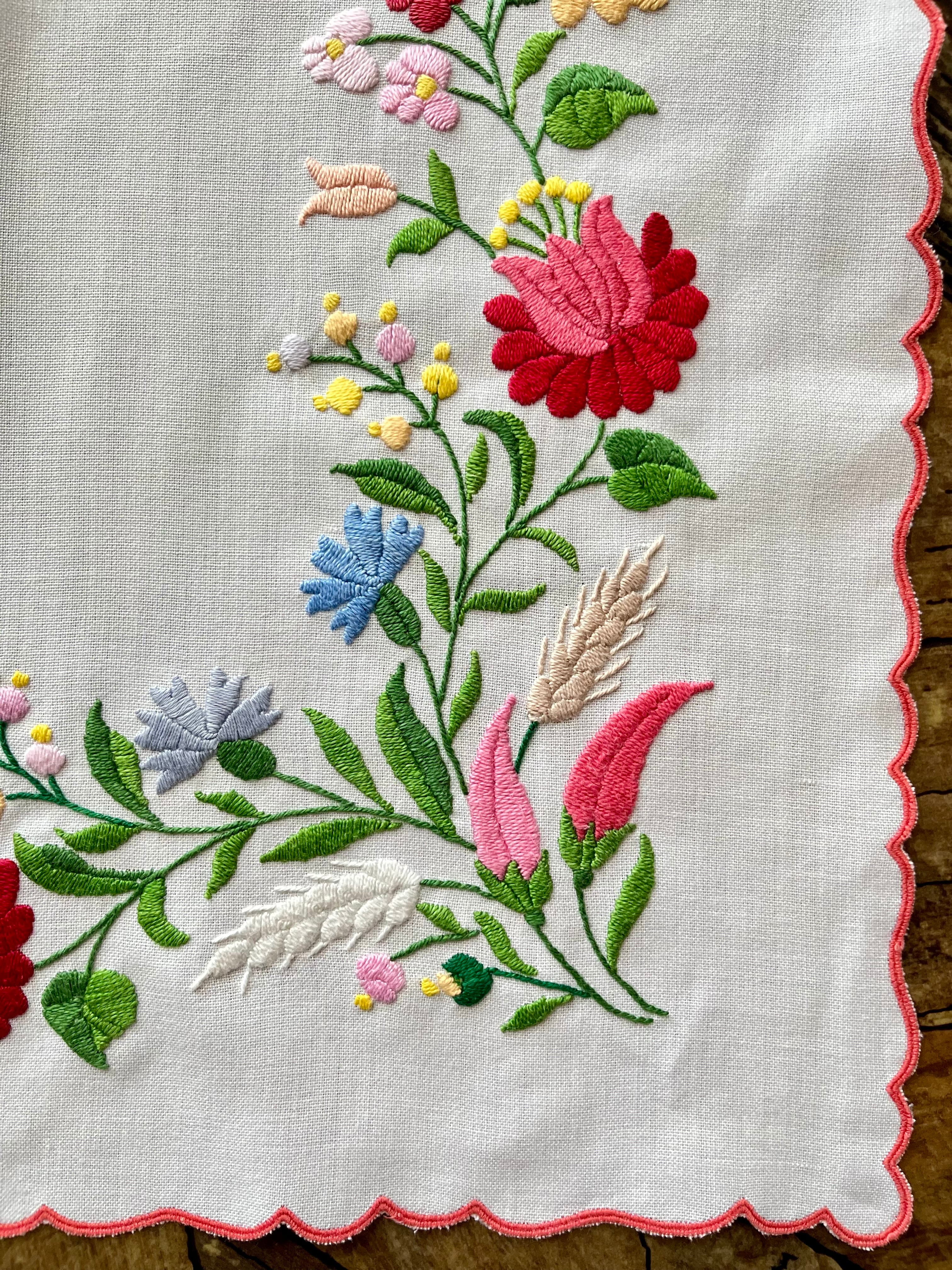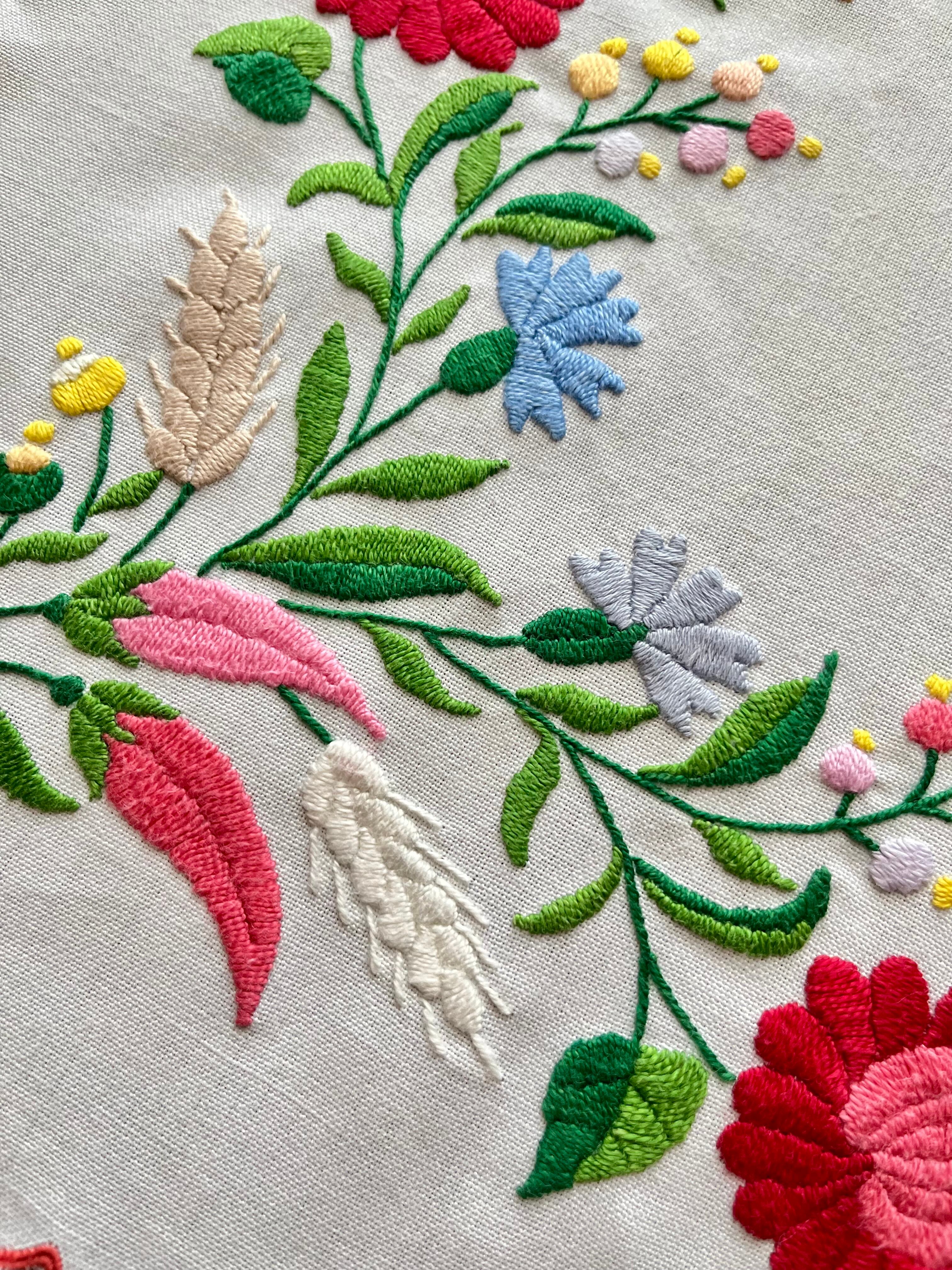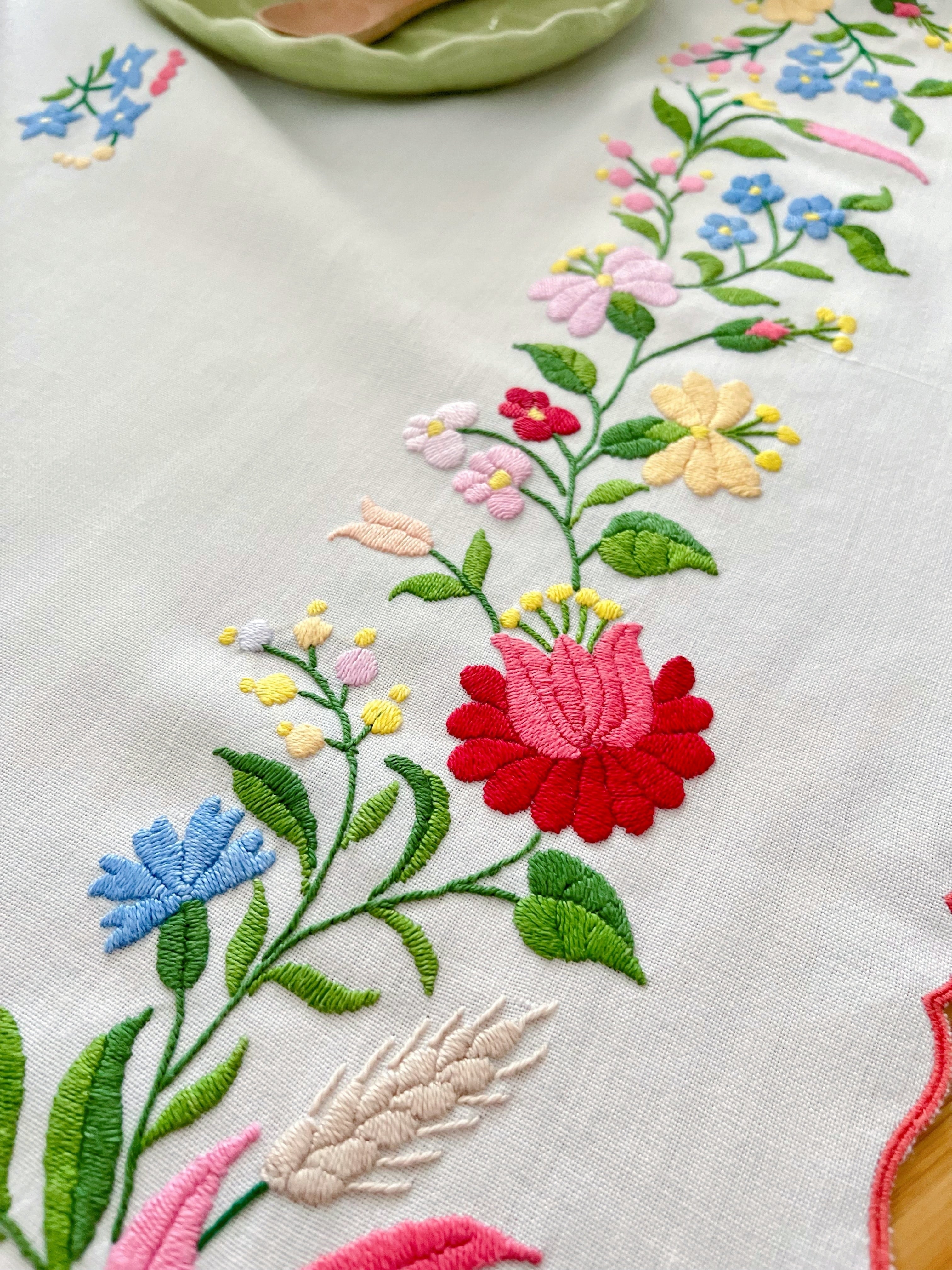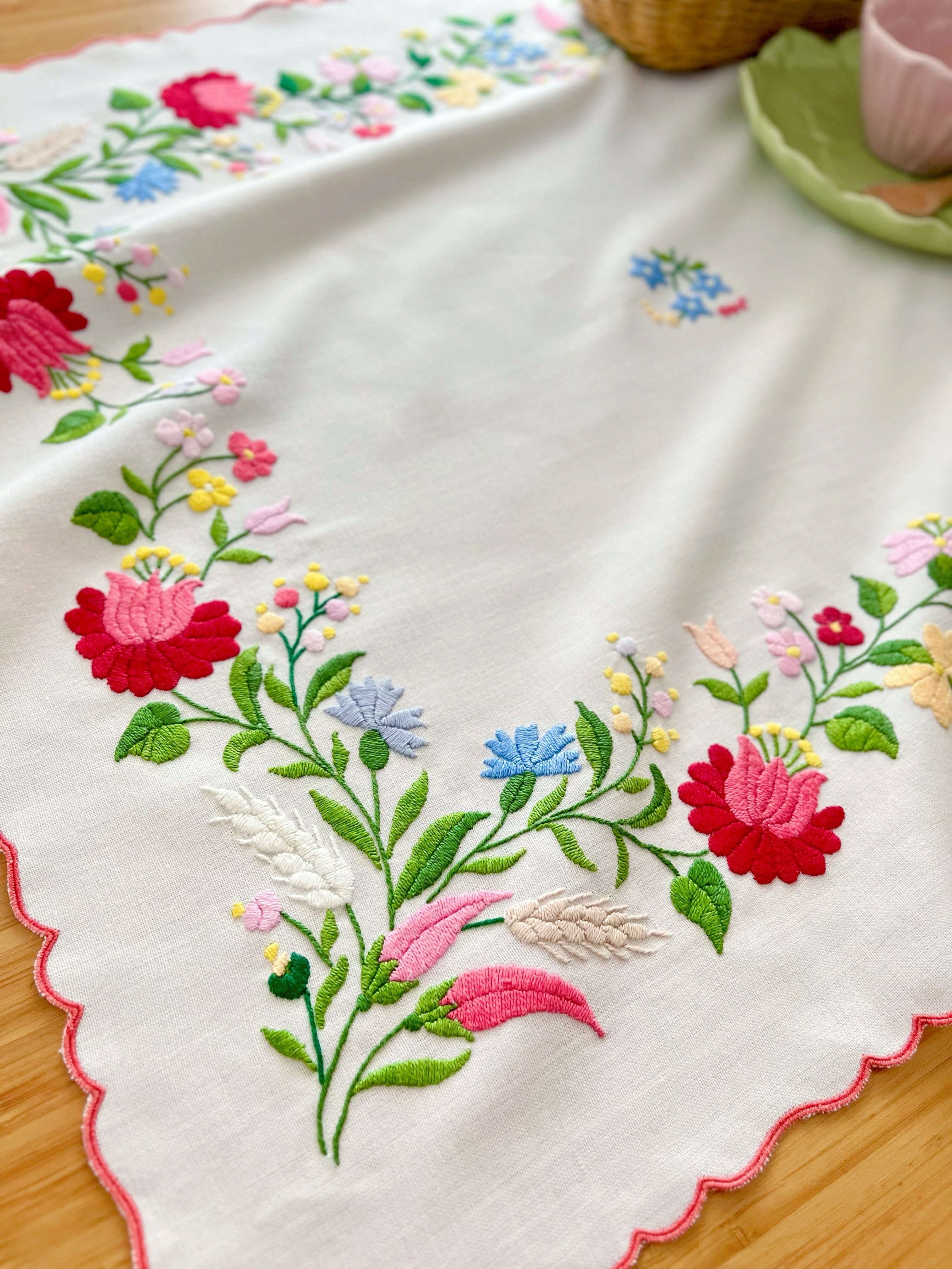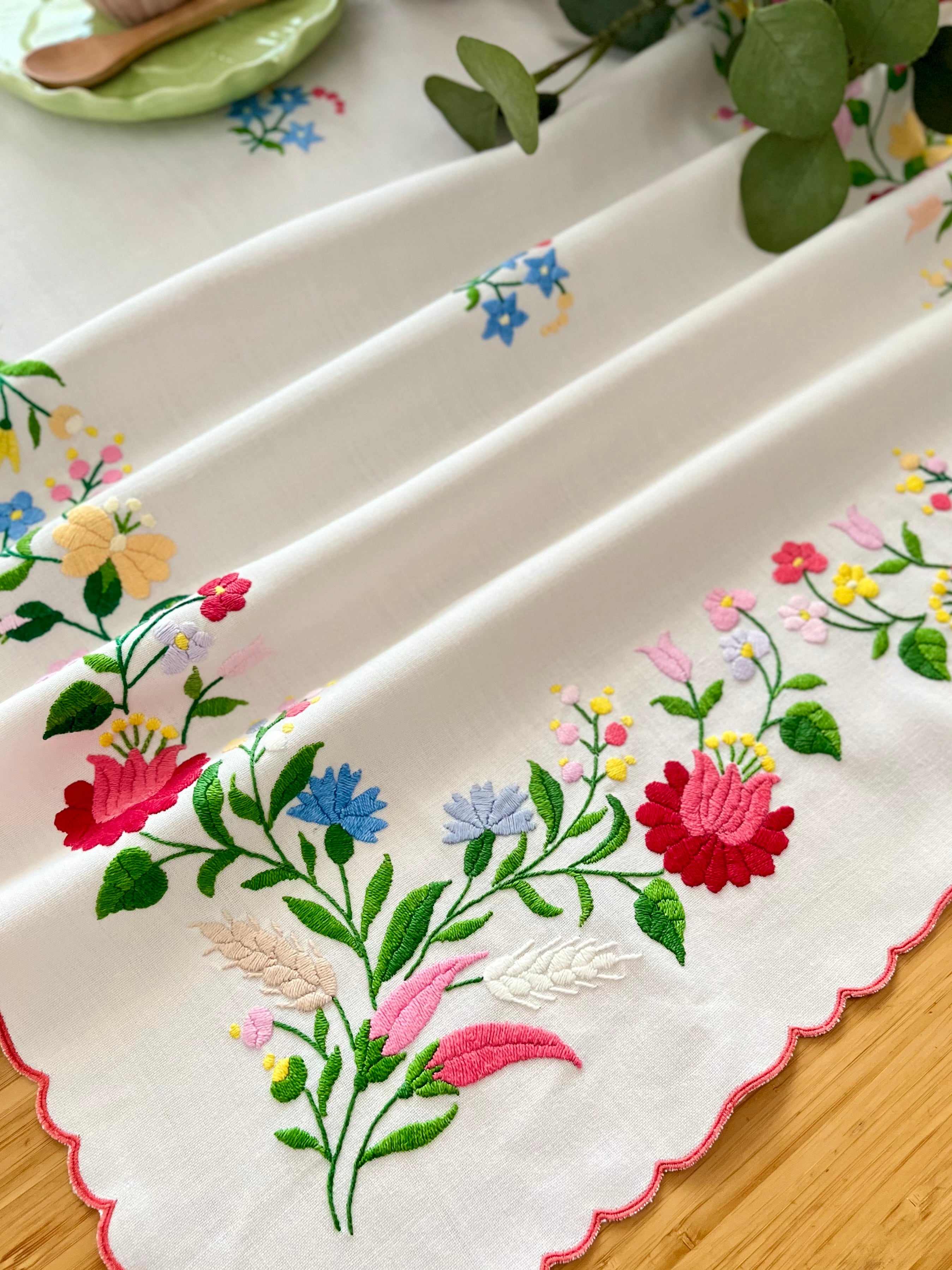 明るいパステル調のカラーリングがキュートなカロチャ刺繍。珍しい長方形の小さめテーブルクロスです。