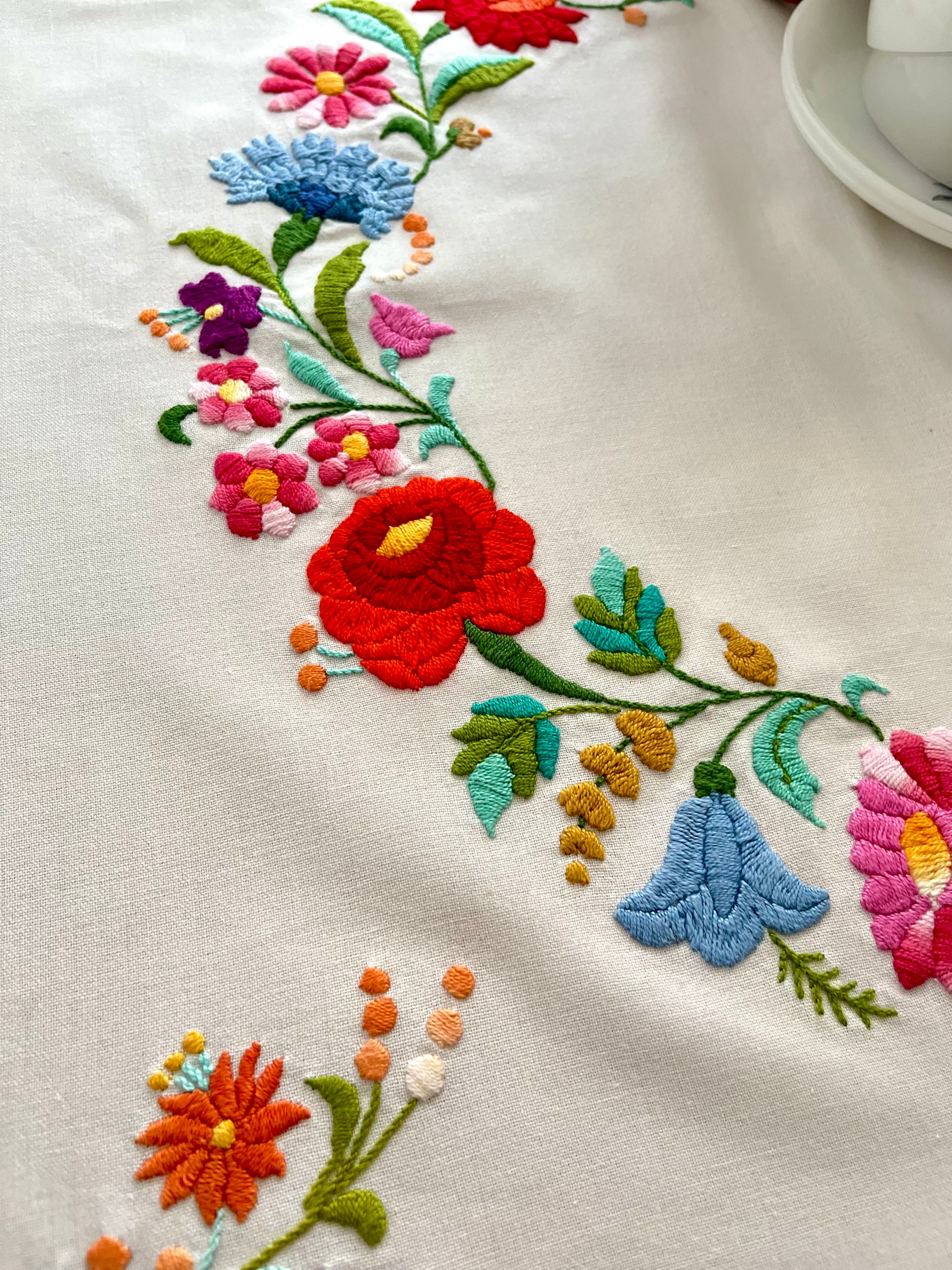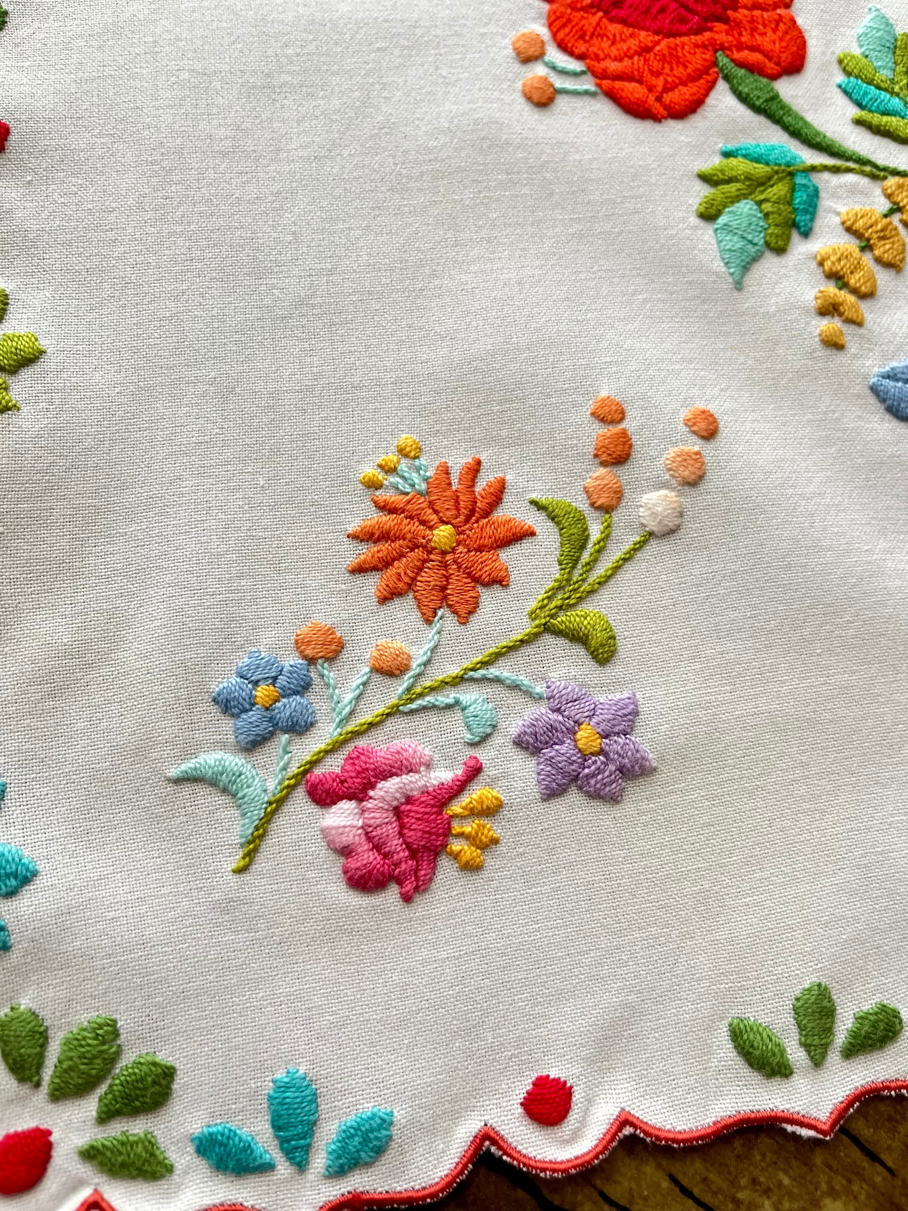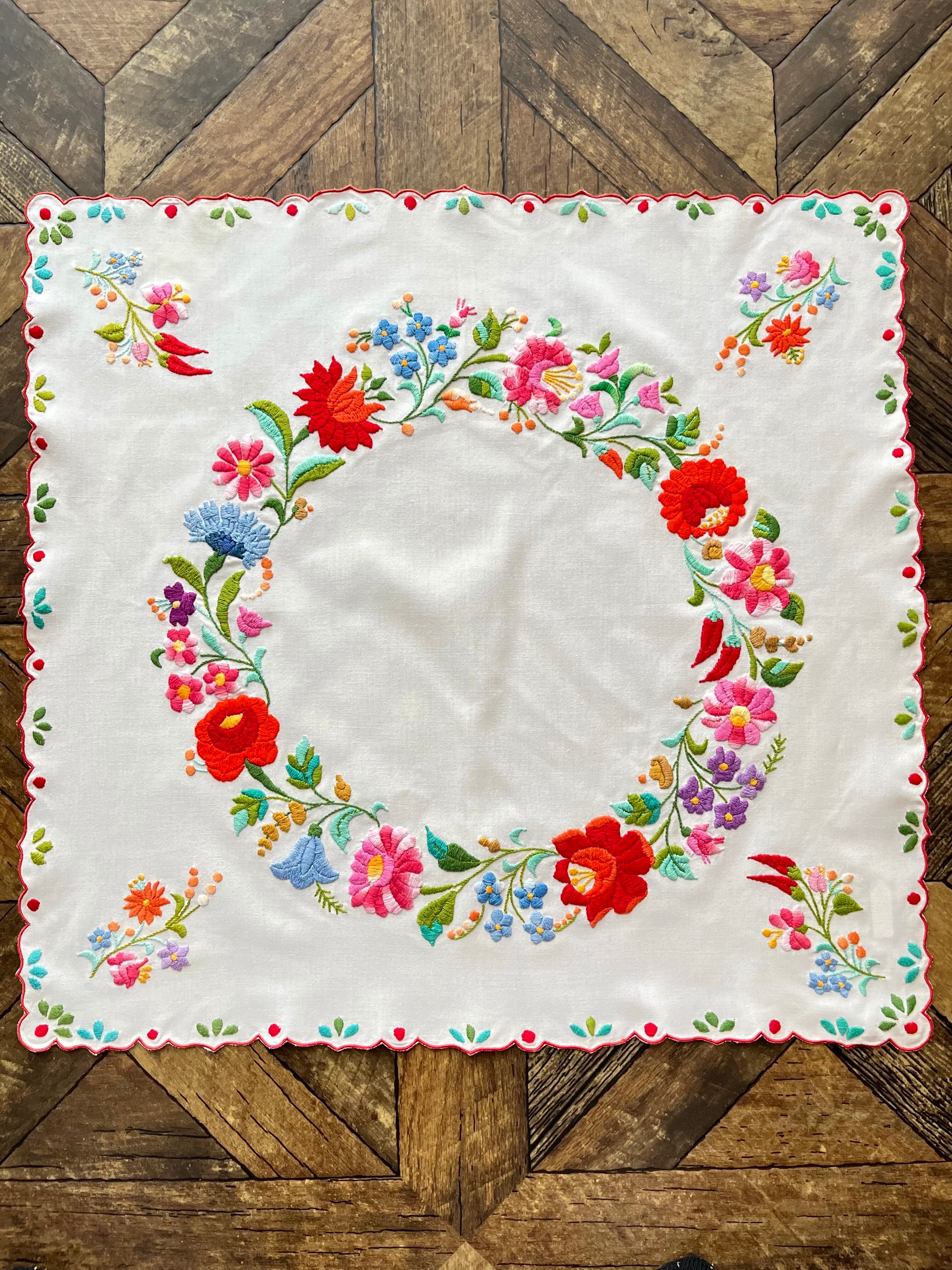 作り手のセンスを感じる個性派カロチャ刺繍の小さめテーブルクロスです。