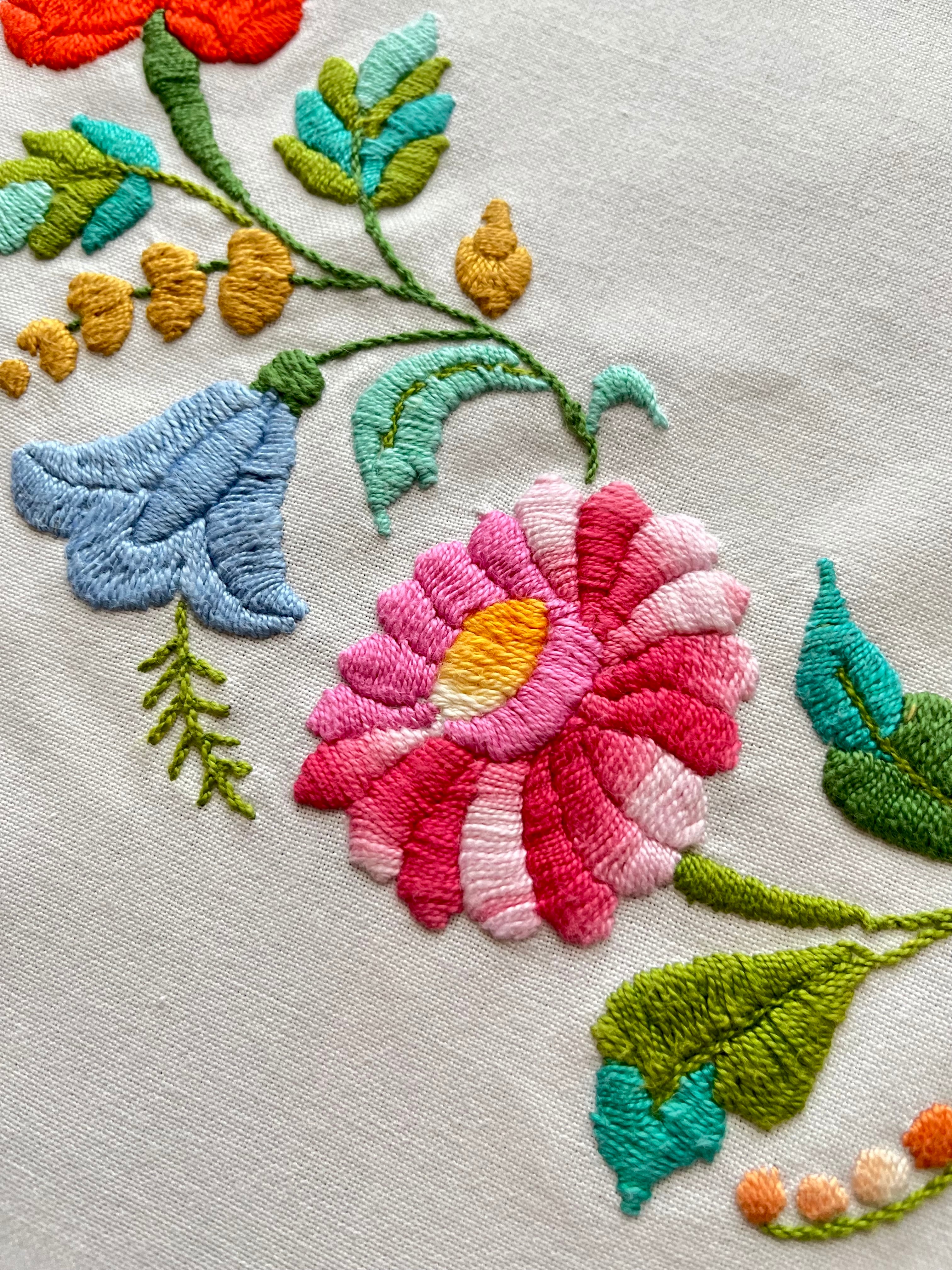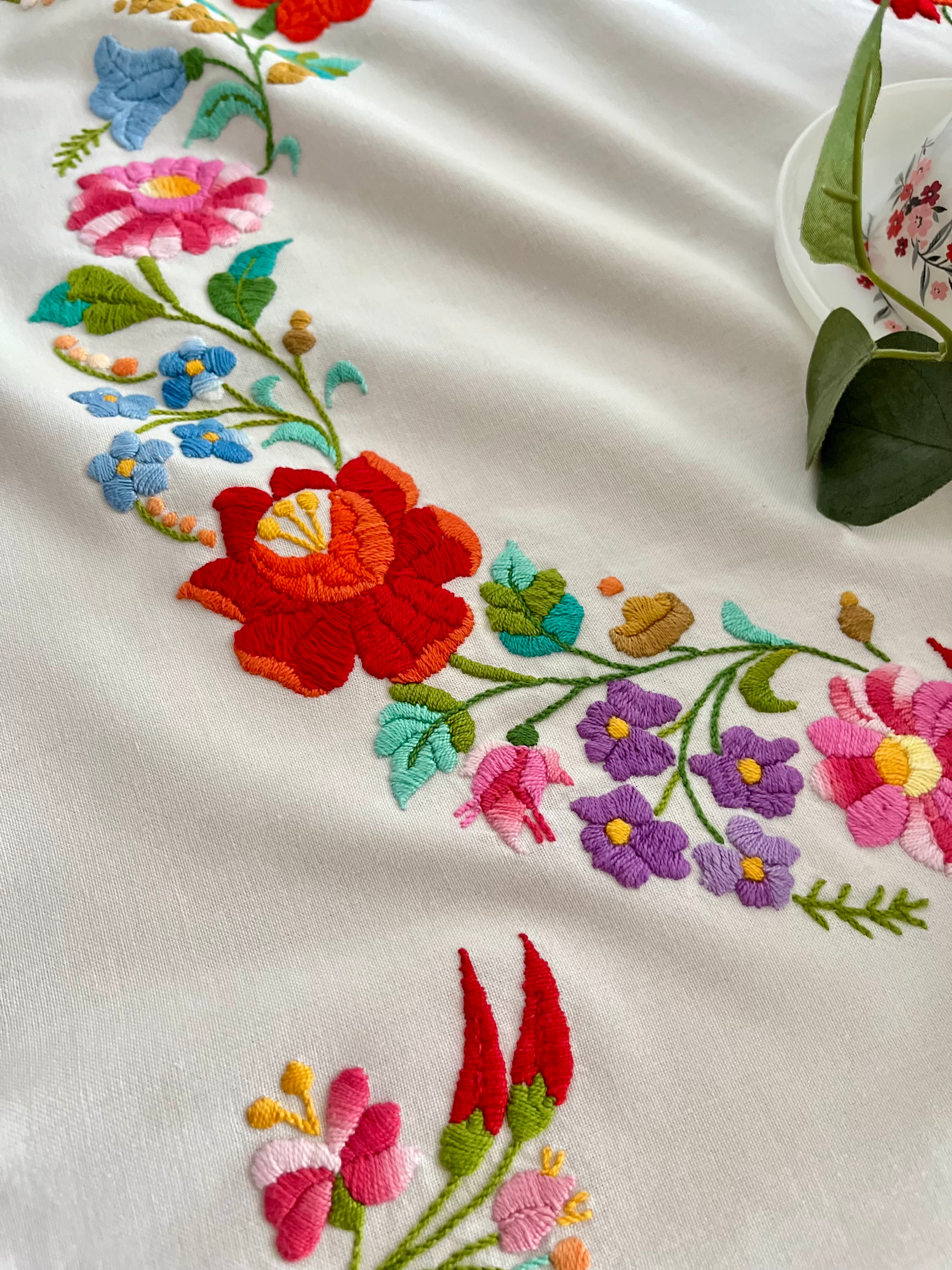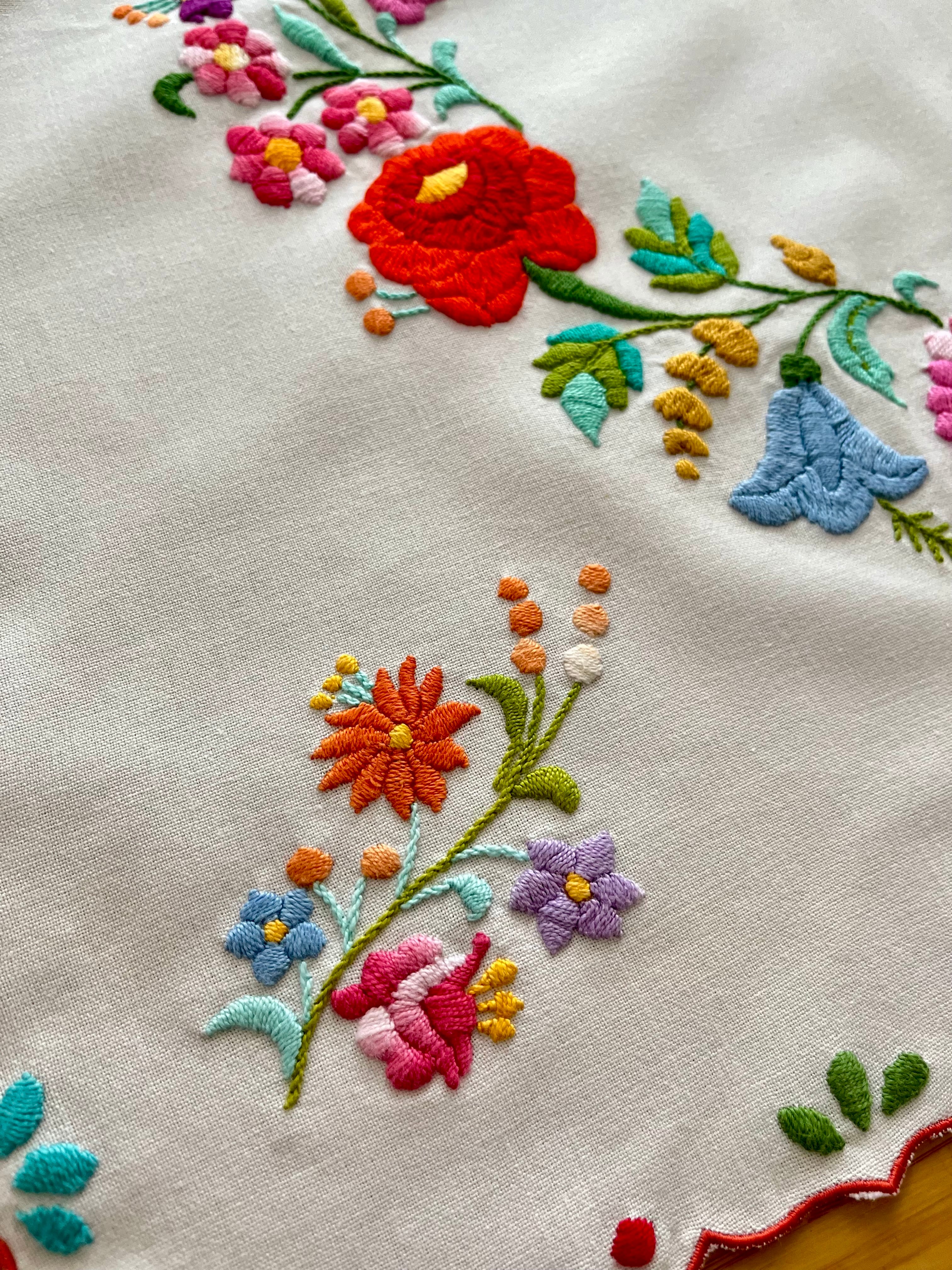 作り手のセンスを感じる個性派カロチャ刺繍の小さめテーブルクロスです。