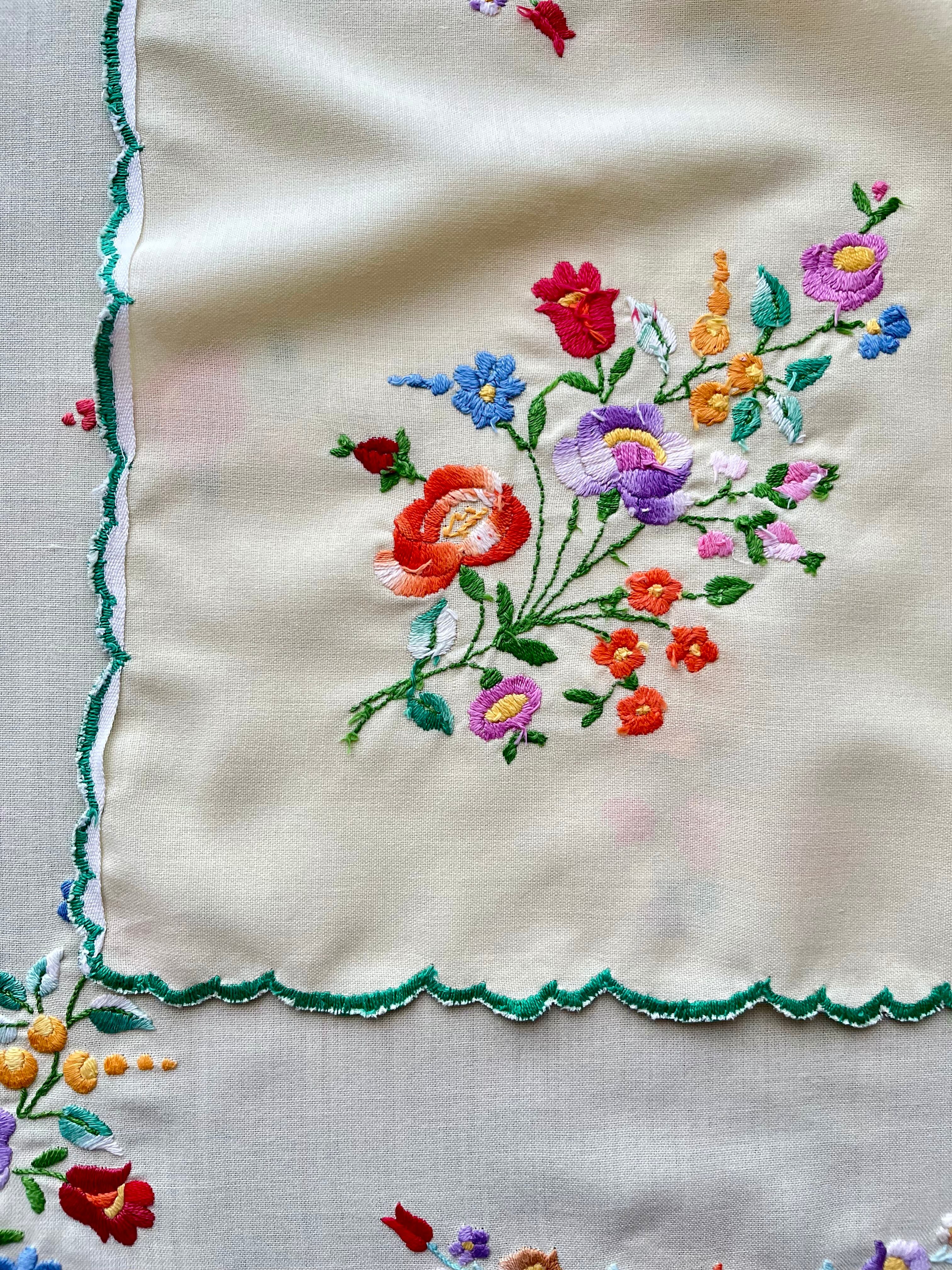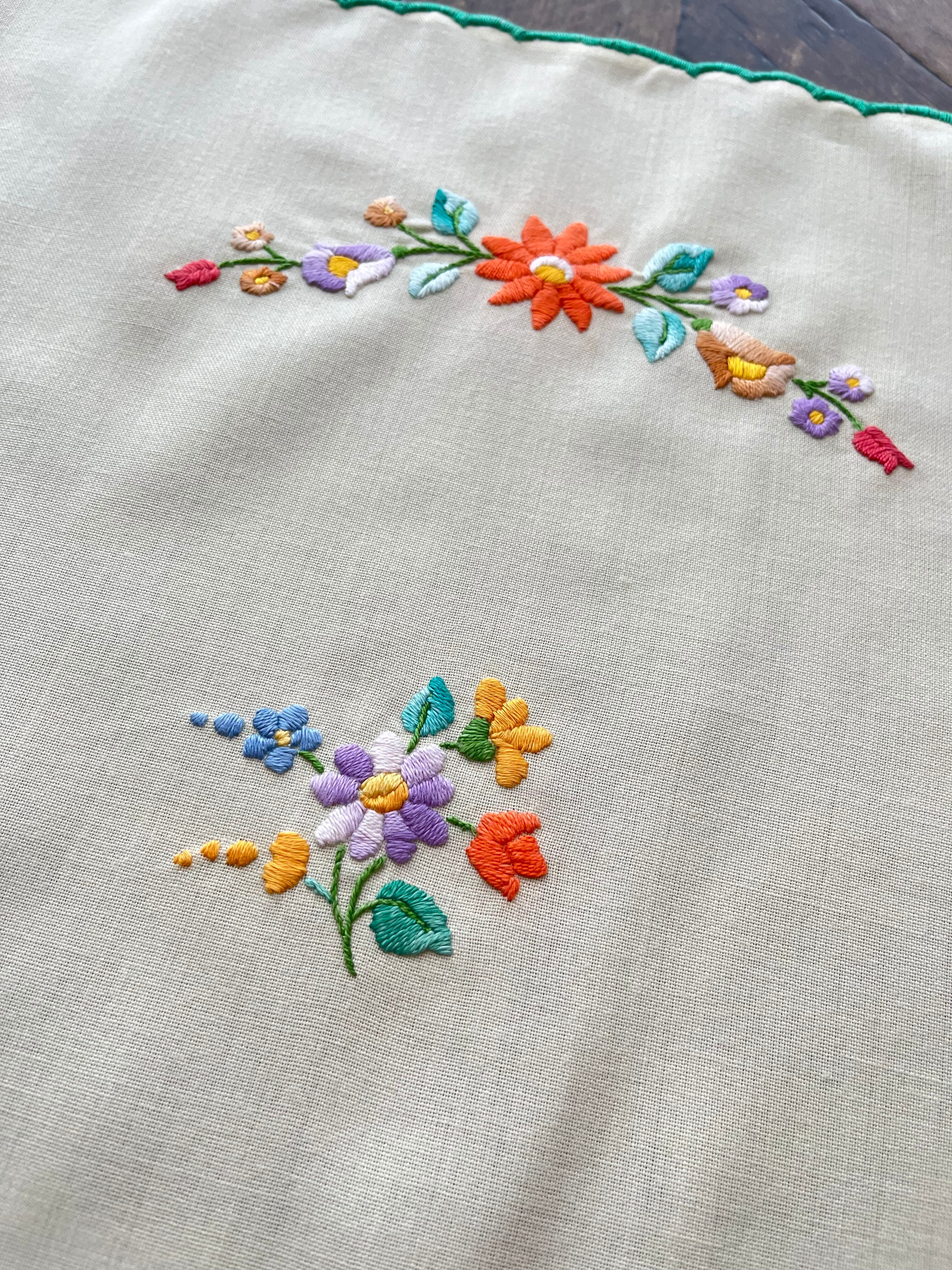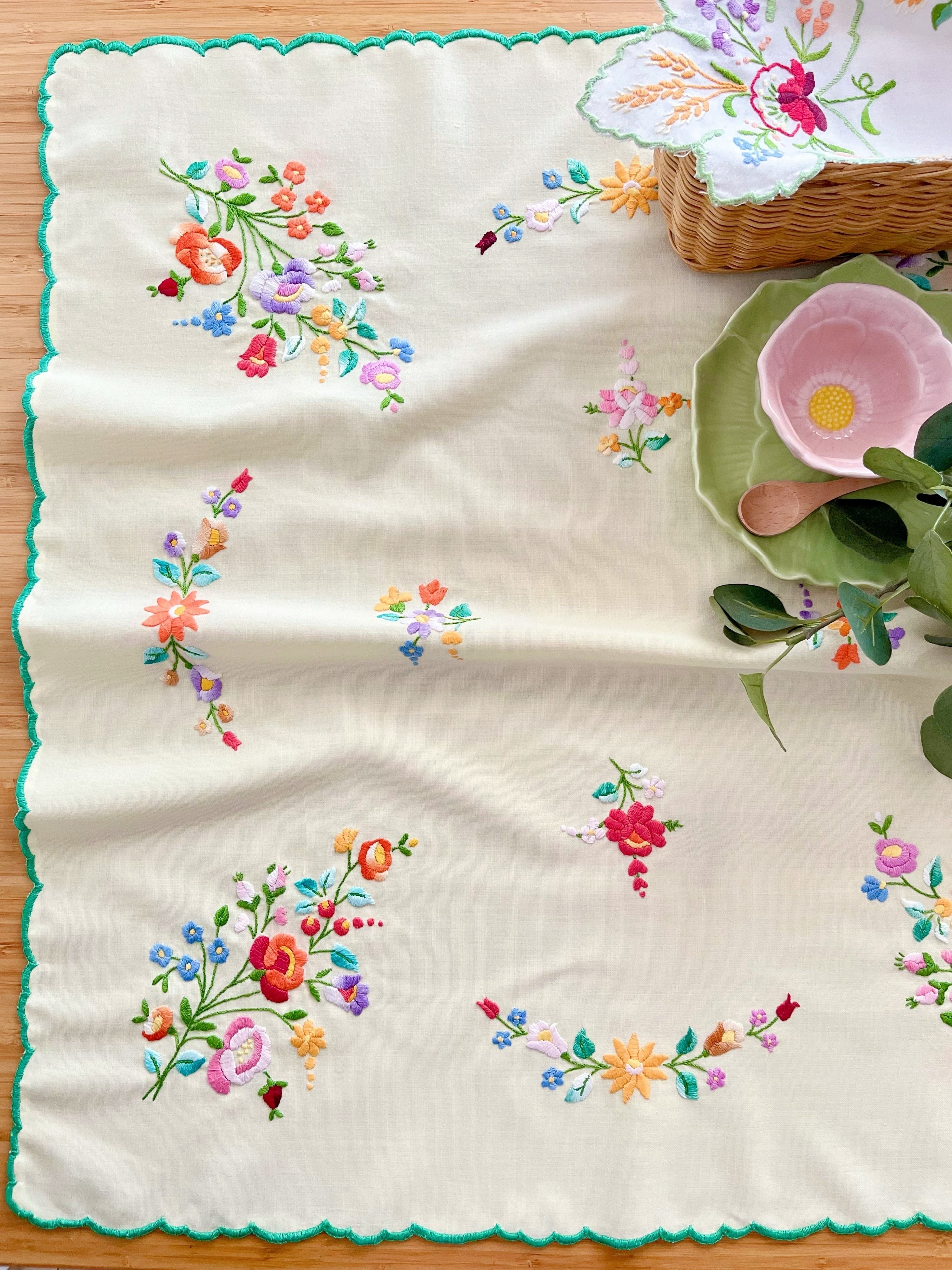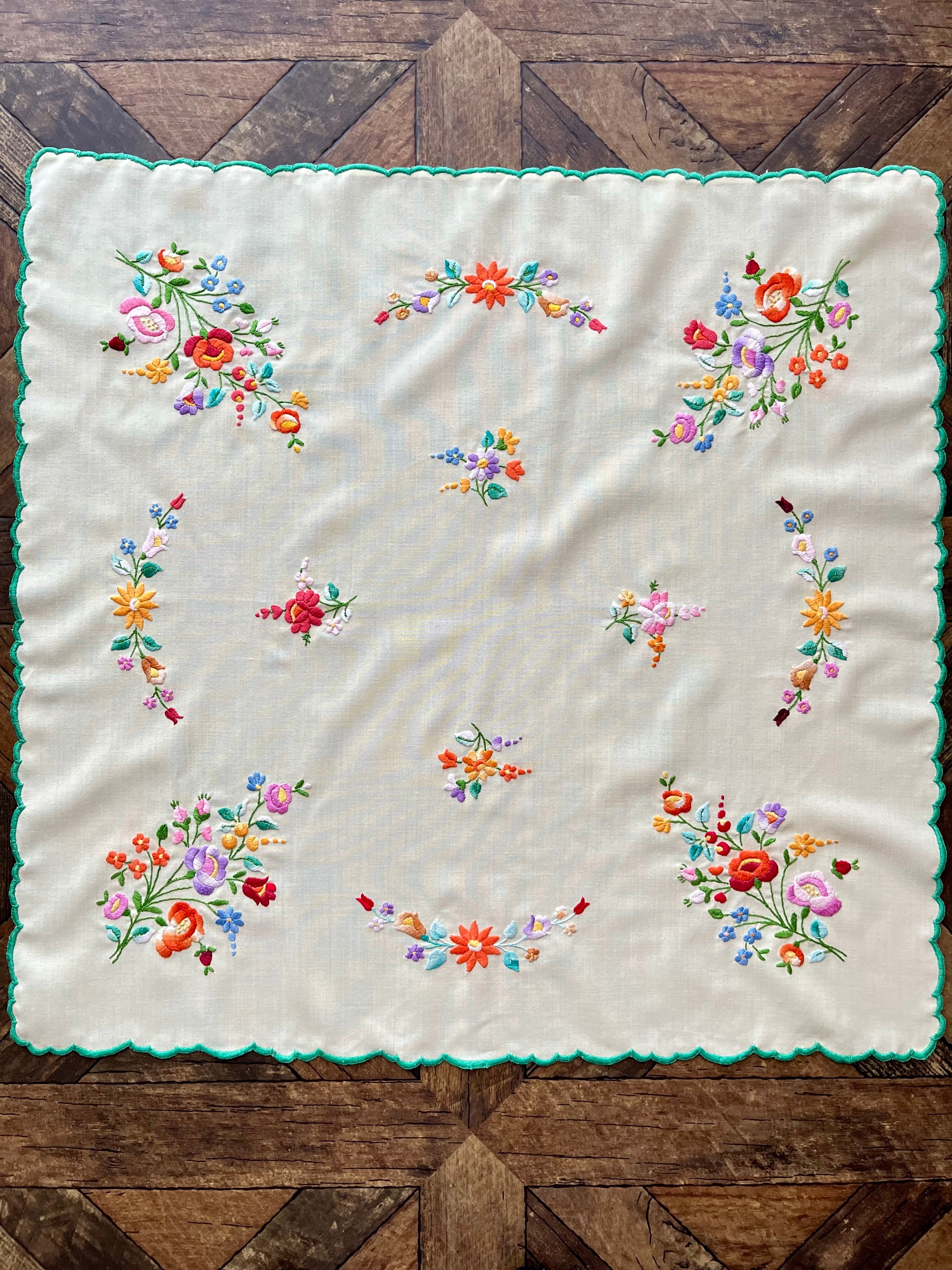グリーン×パステルカラーのテーブルクロス ヴィンテージ カロチャ刺繍 76×73.5 cm