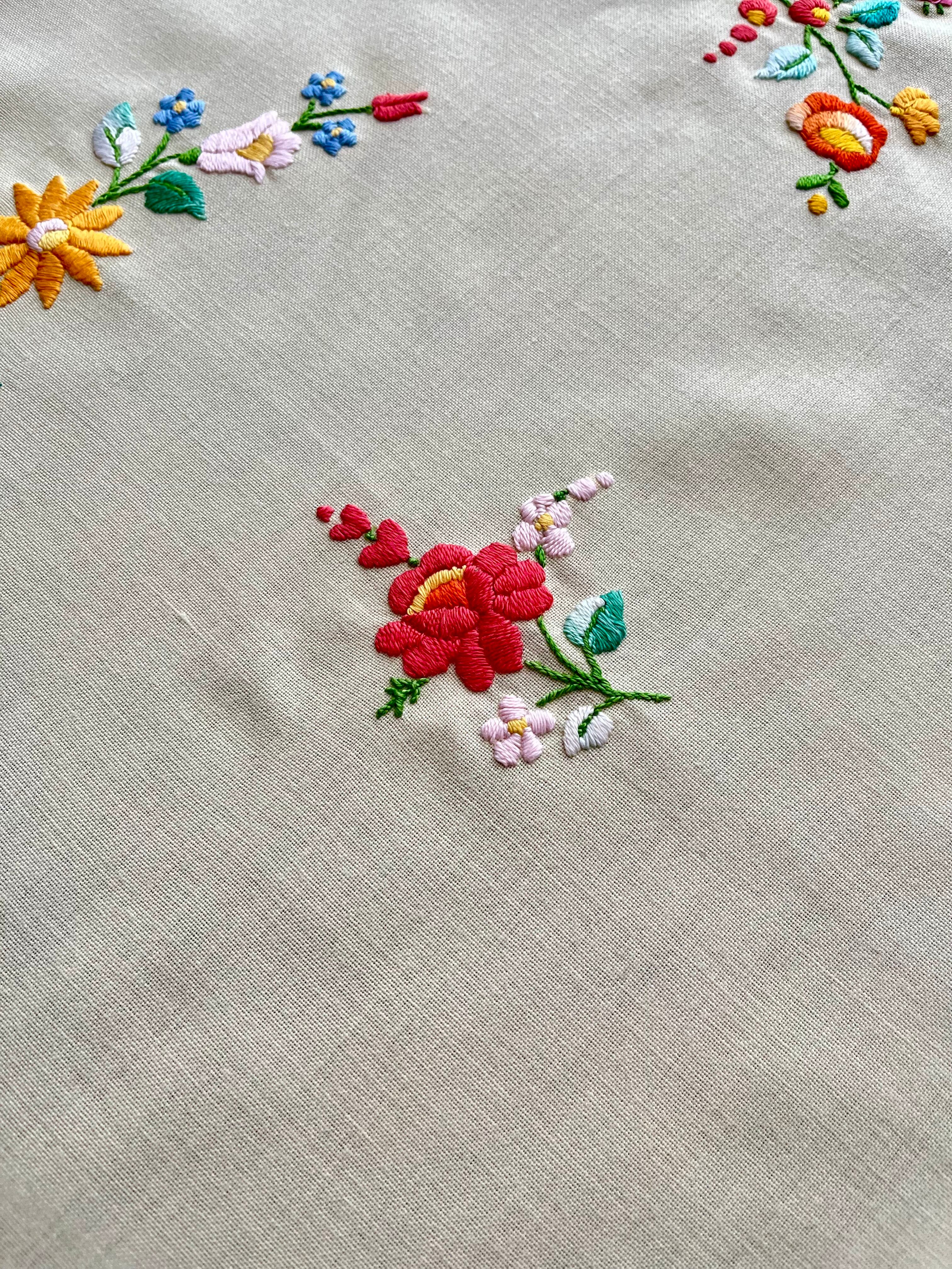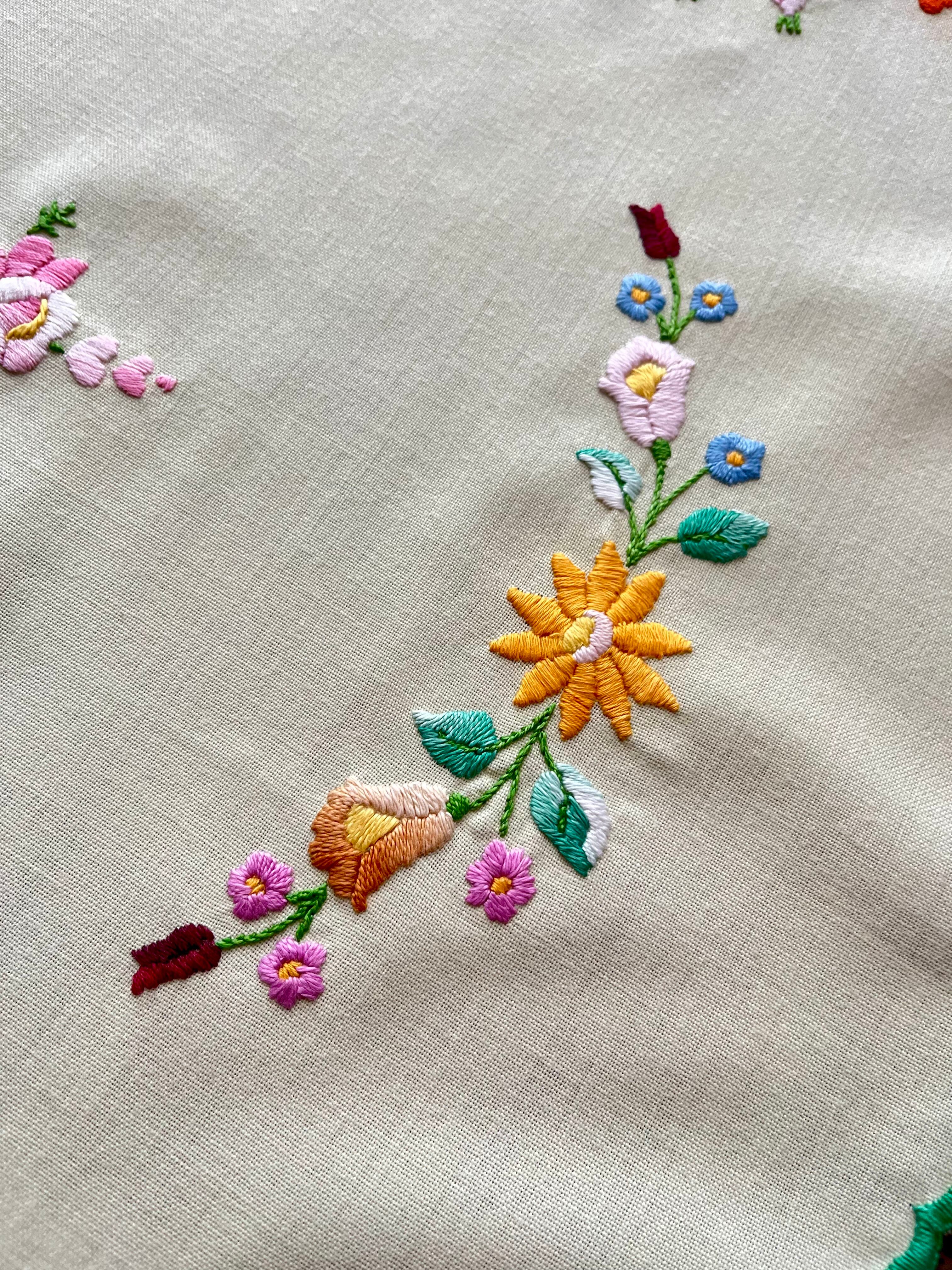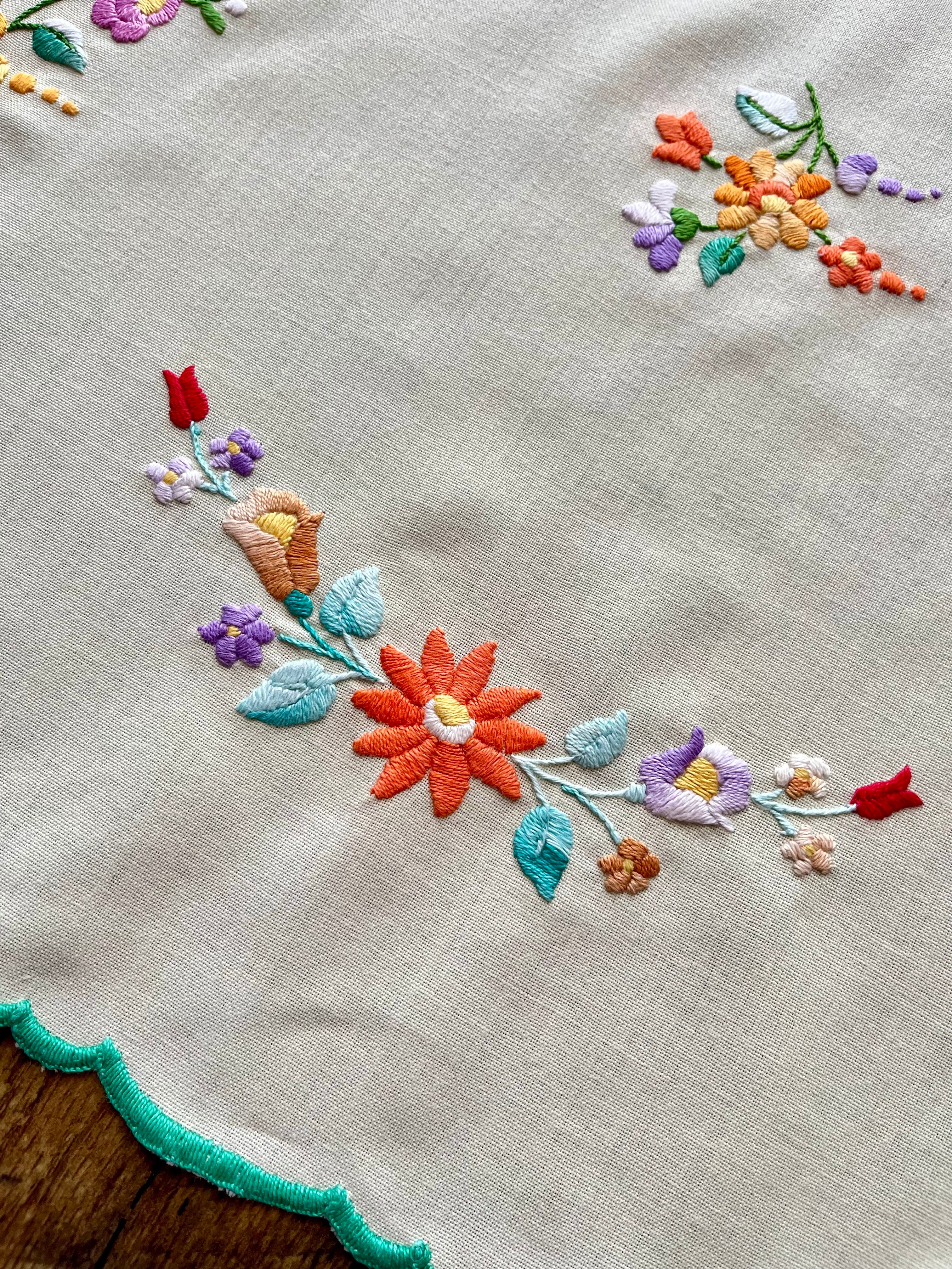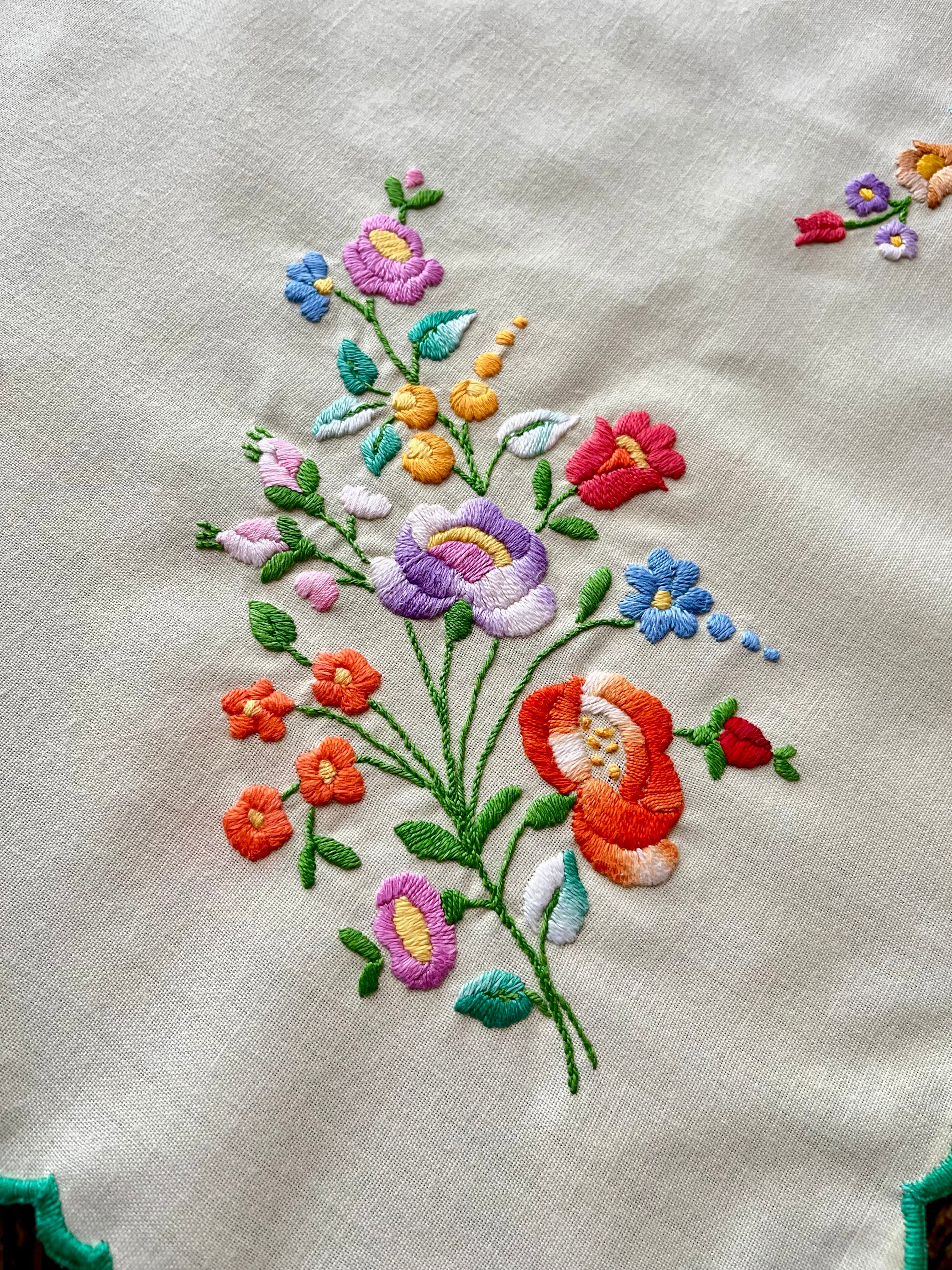 グリーン×パステルカラーのテーブルクロス ヴィンテージ カロチャ刺繍 76×73.5 cm