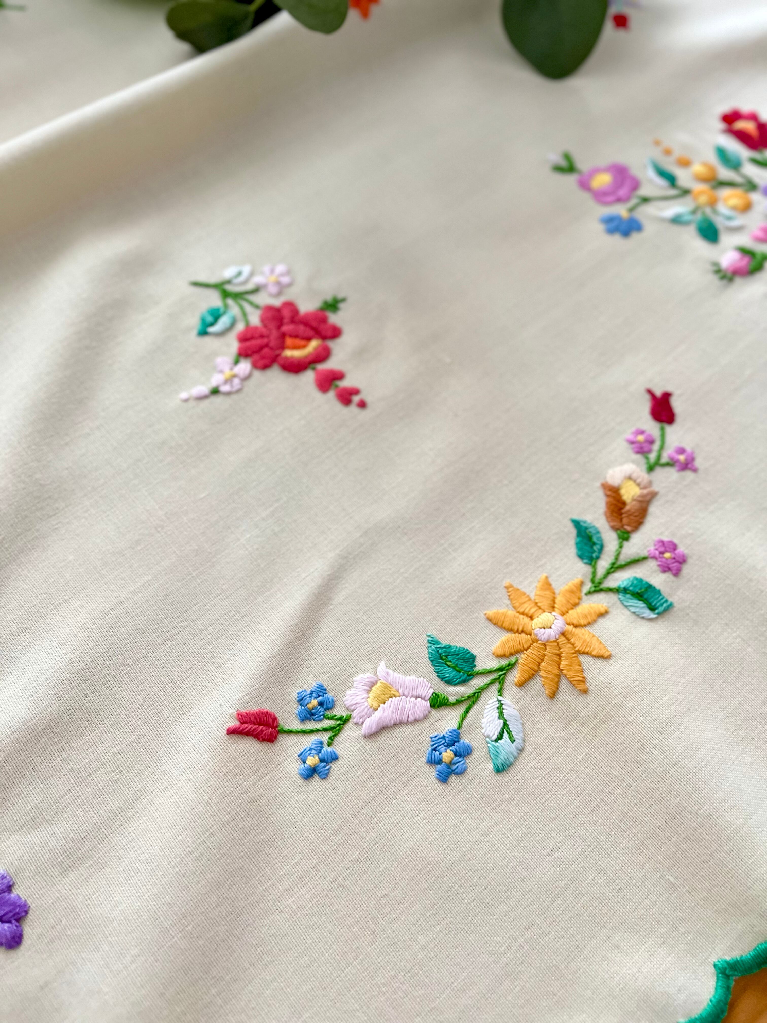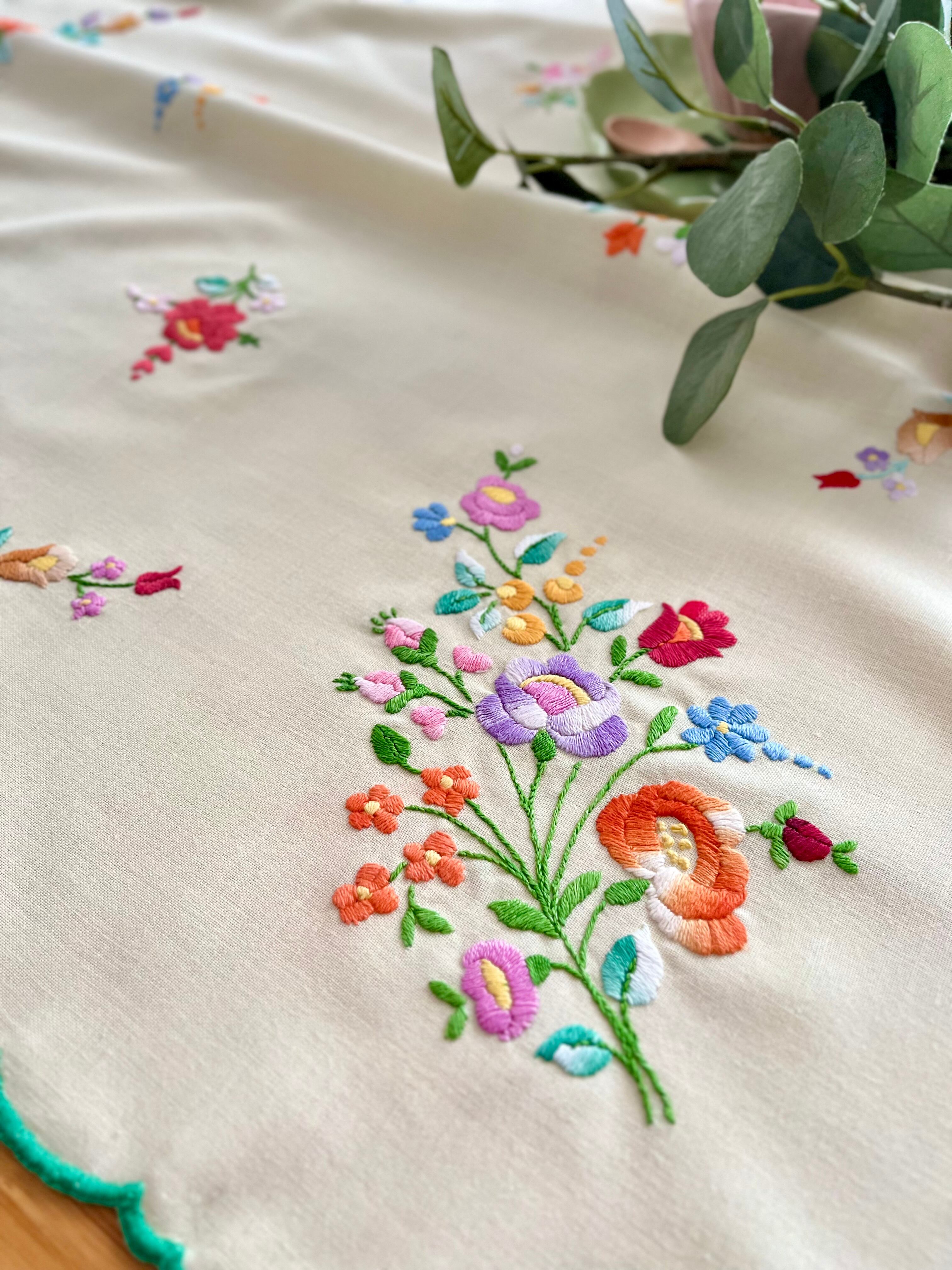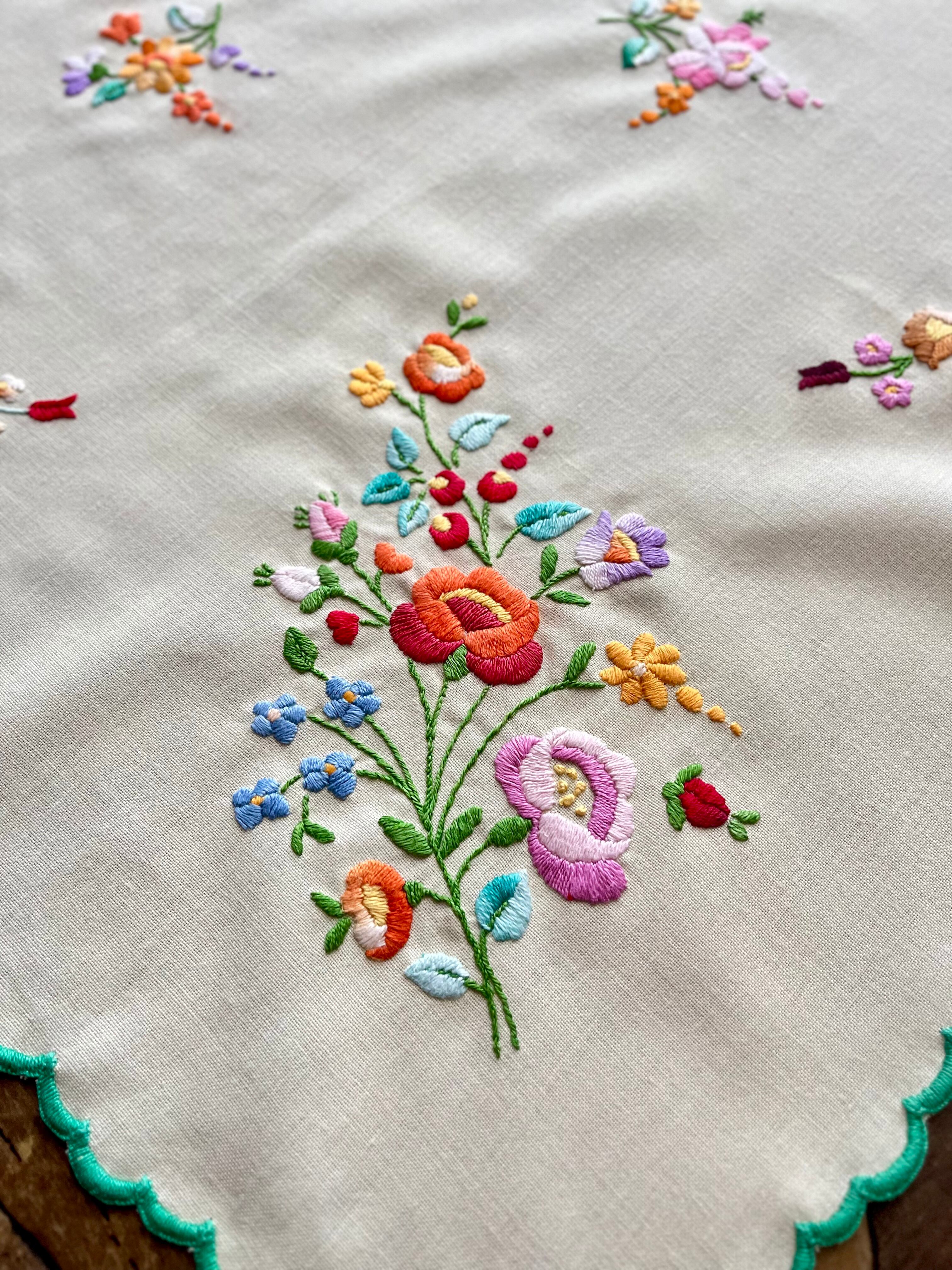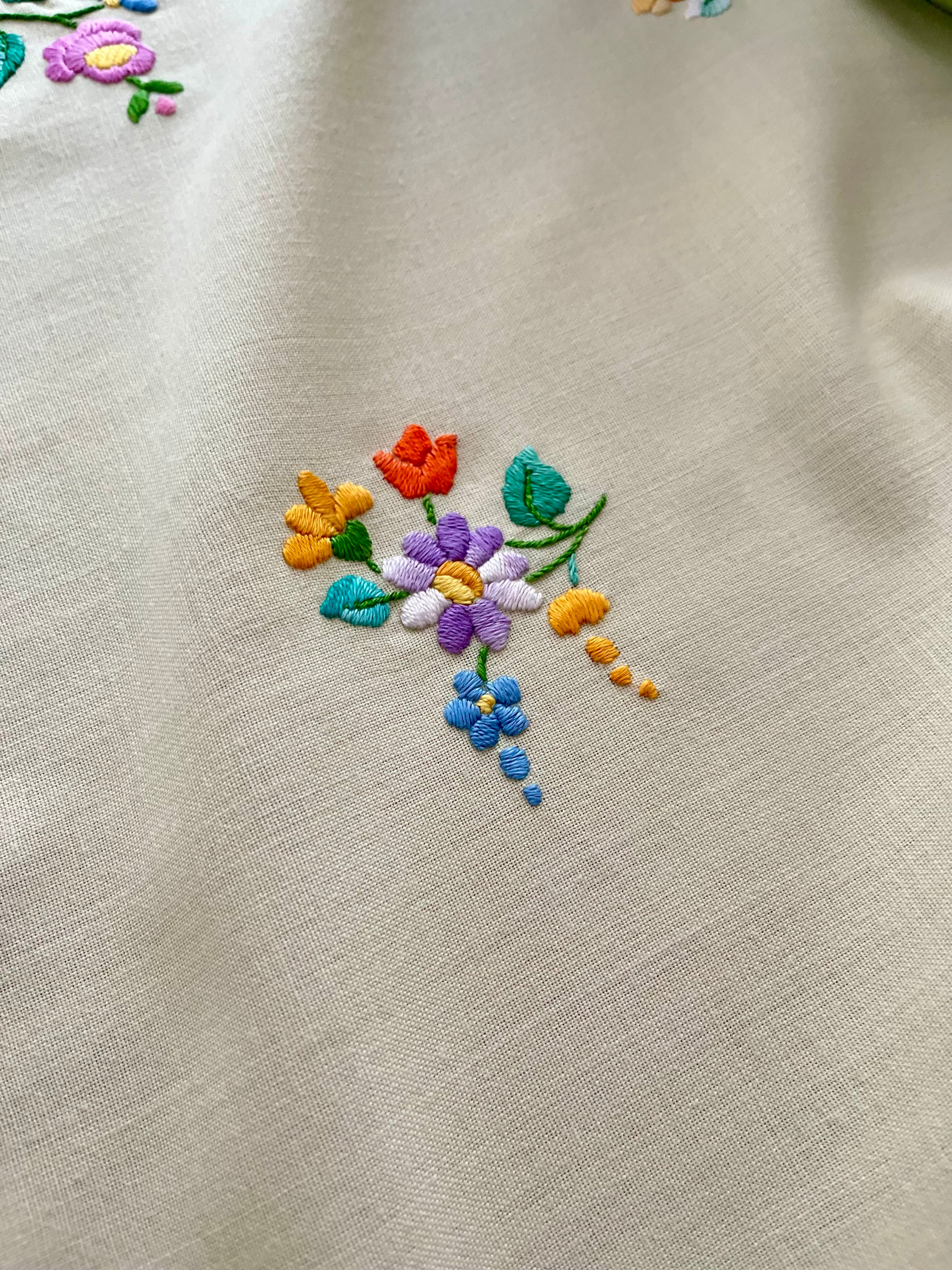 グリーン×パステルカラーのテーブルクロス ヴィンテージ カロチャ刺繍 76×73.5 cm