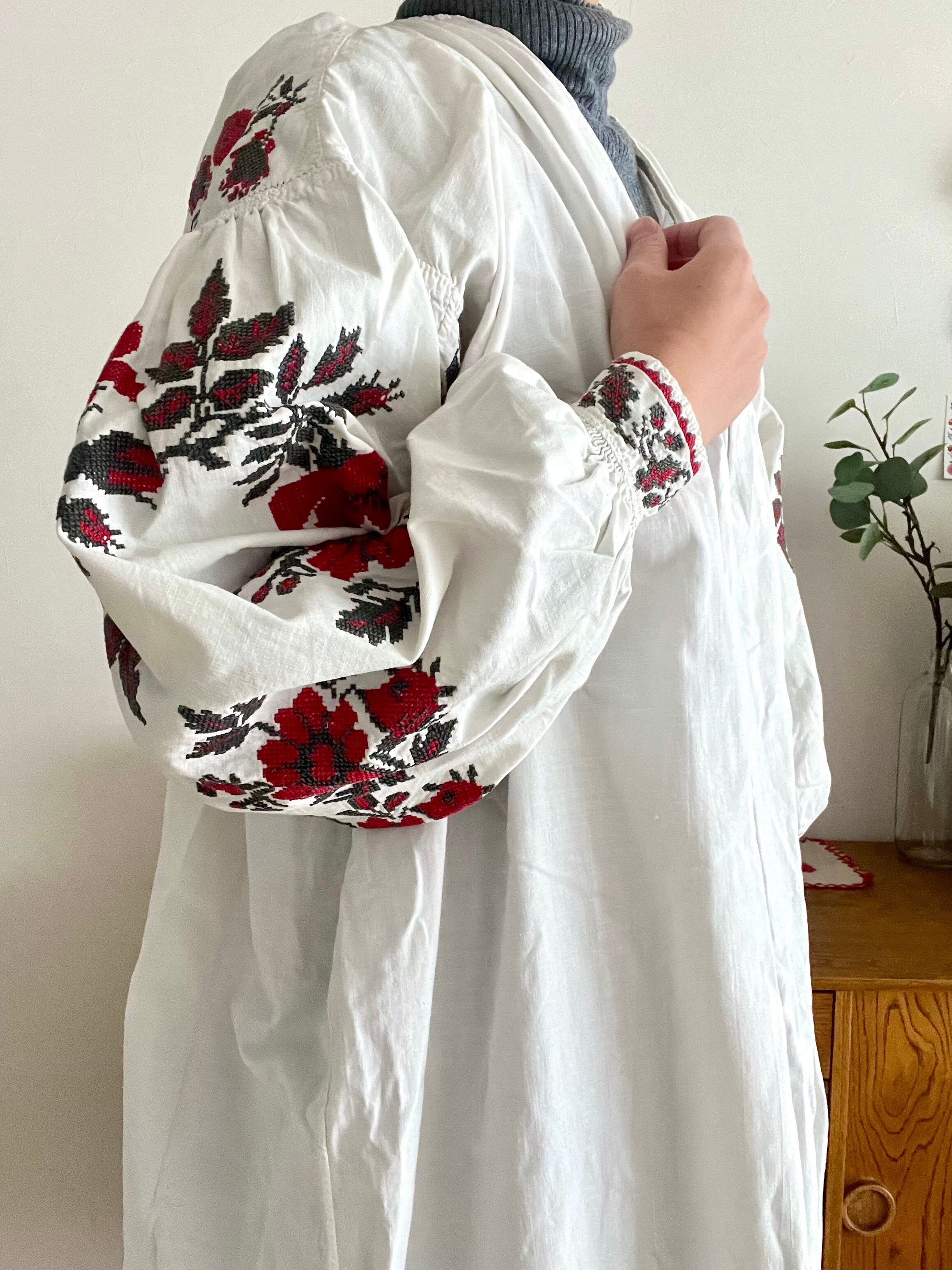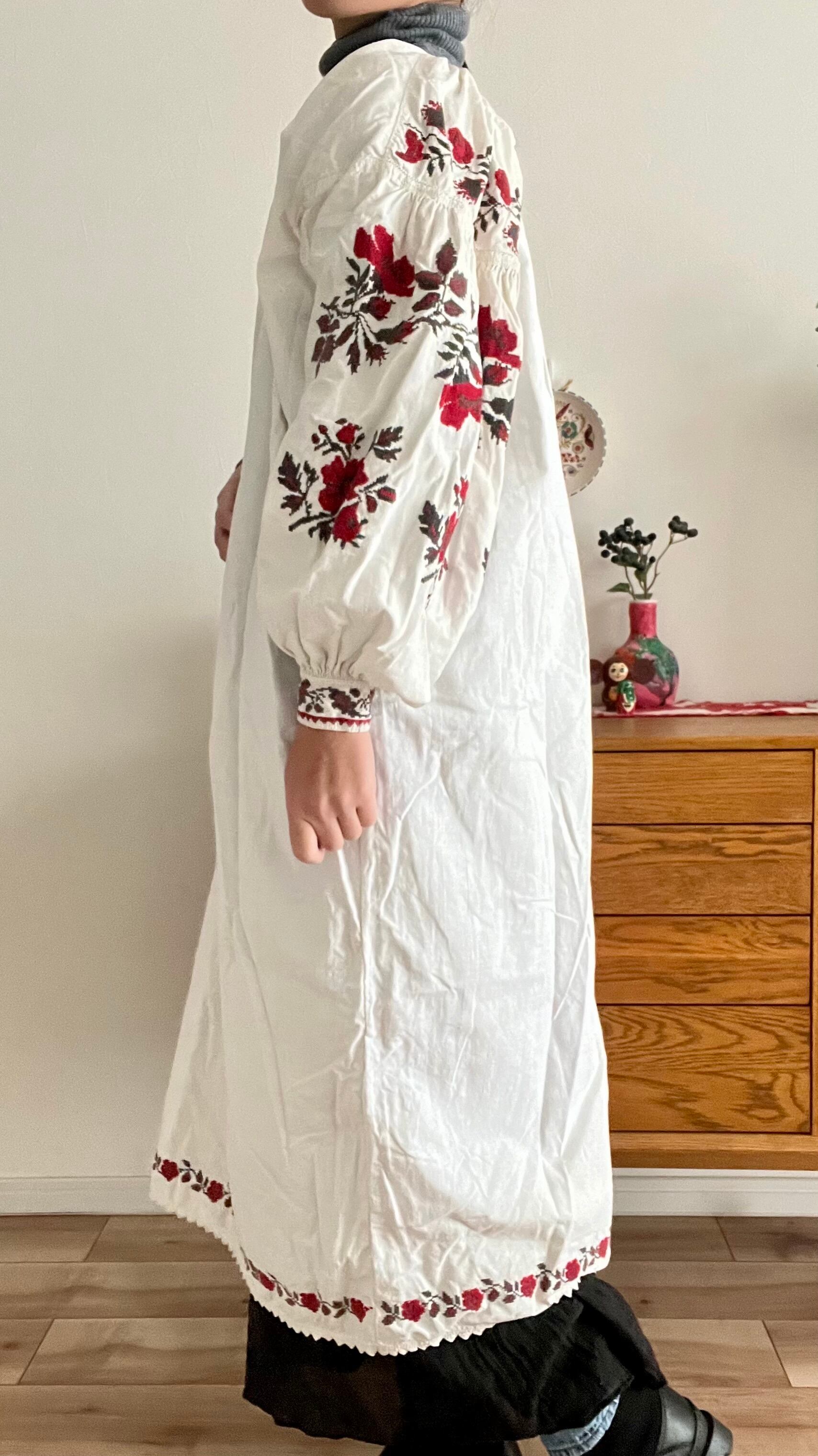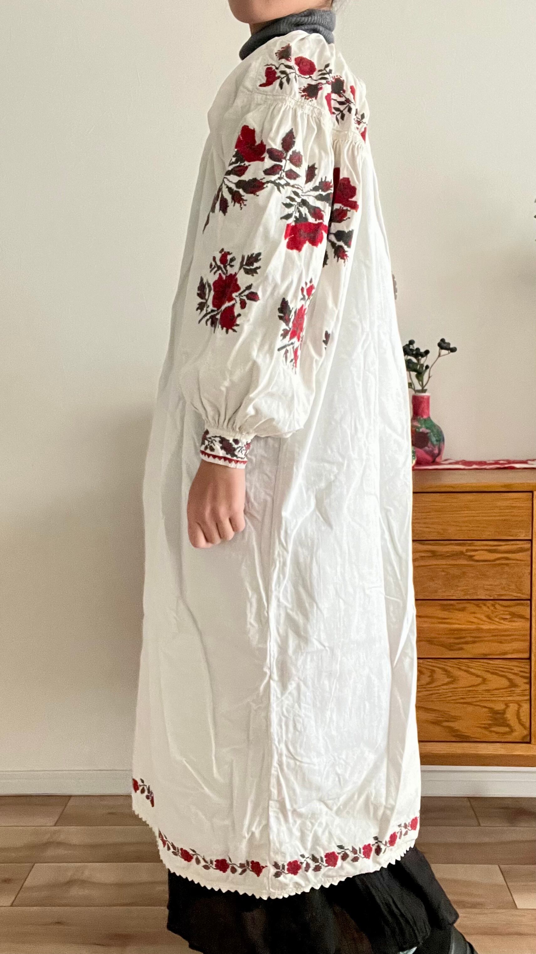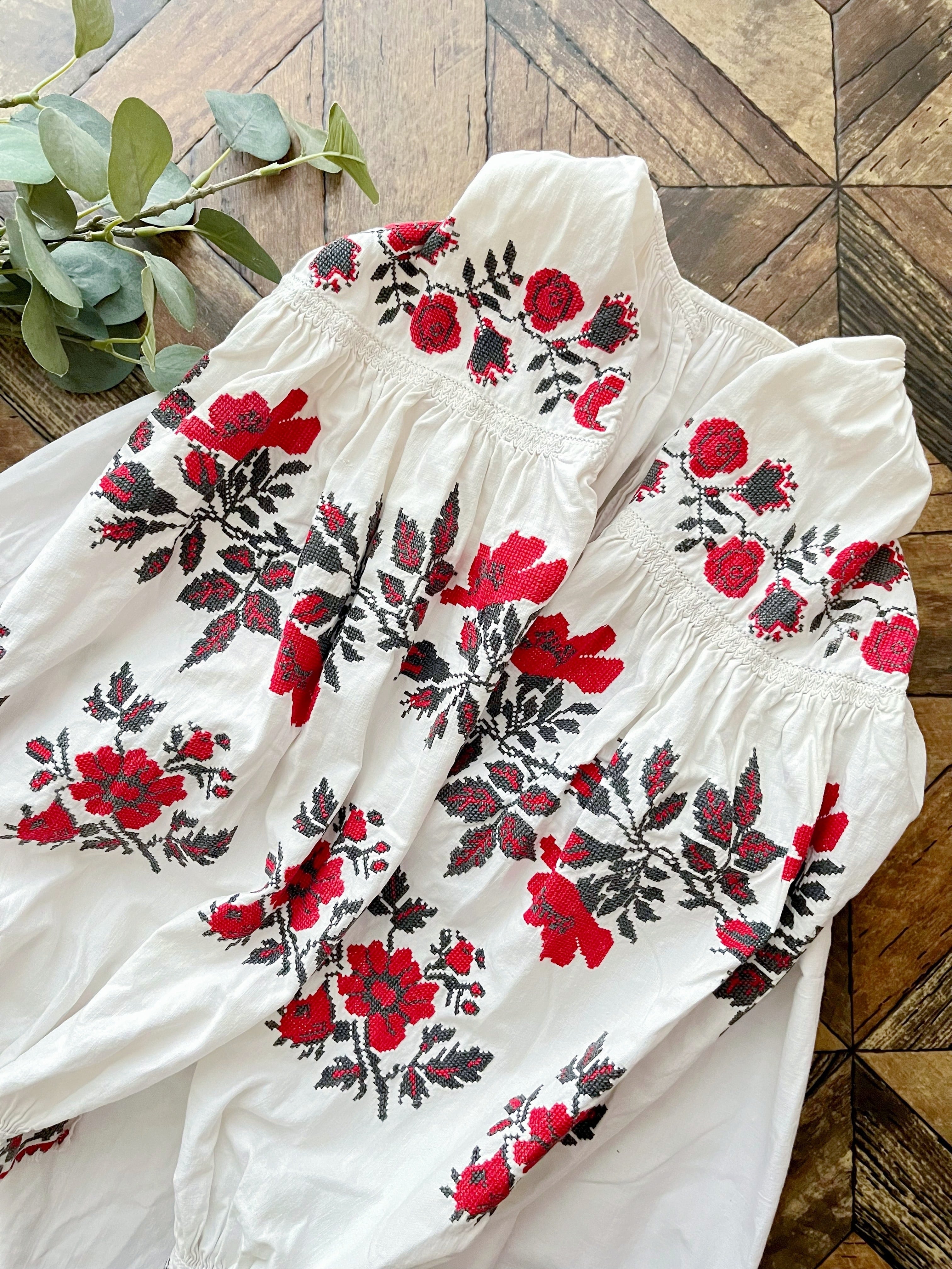 たっぷりボリューム袖の赤い花のウクライナ刺繍ワンピース ヴィシヴァンカ ソロチカ