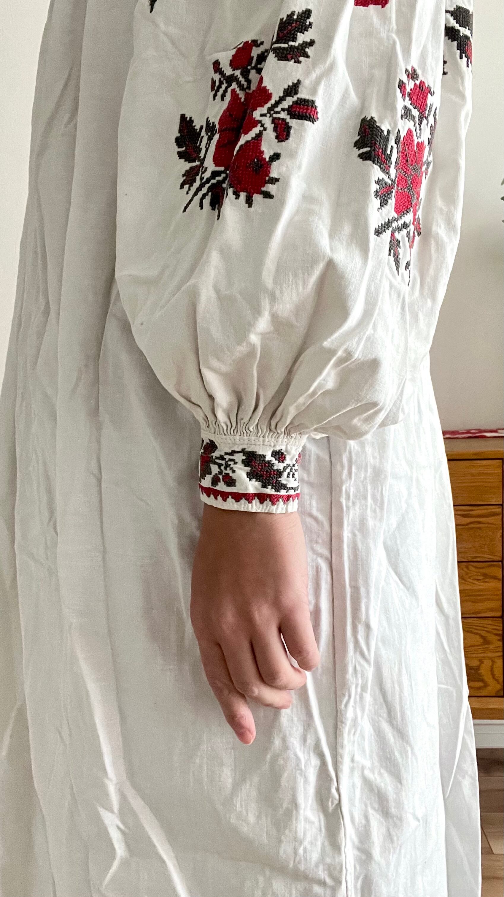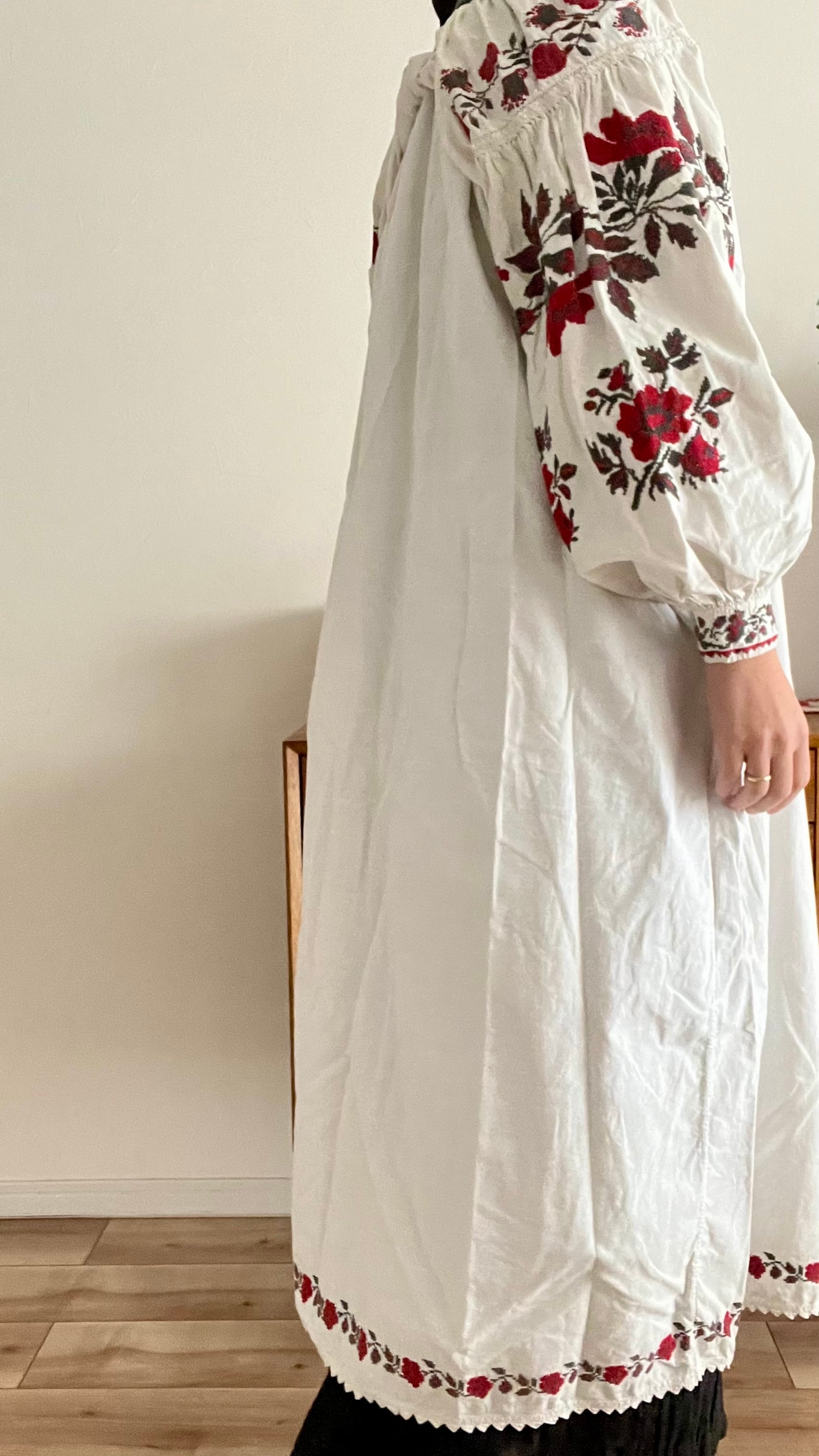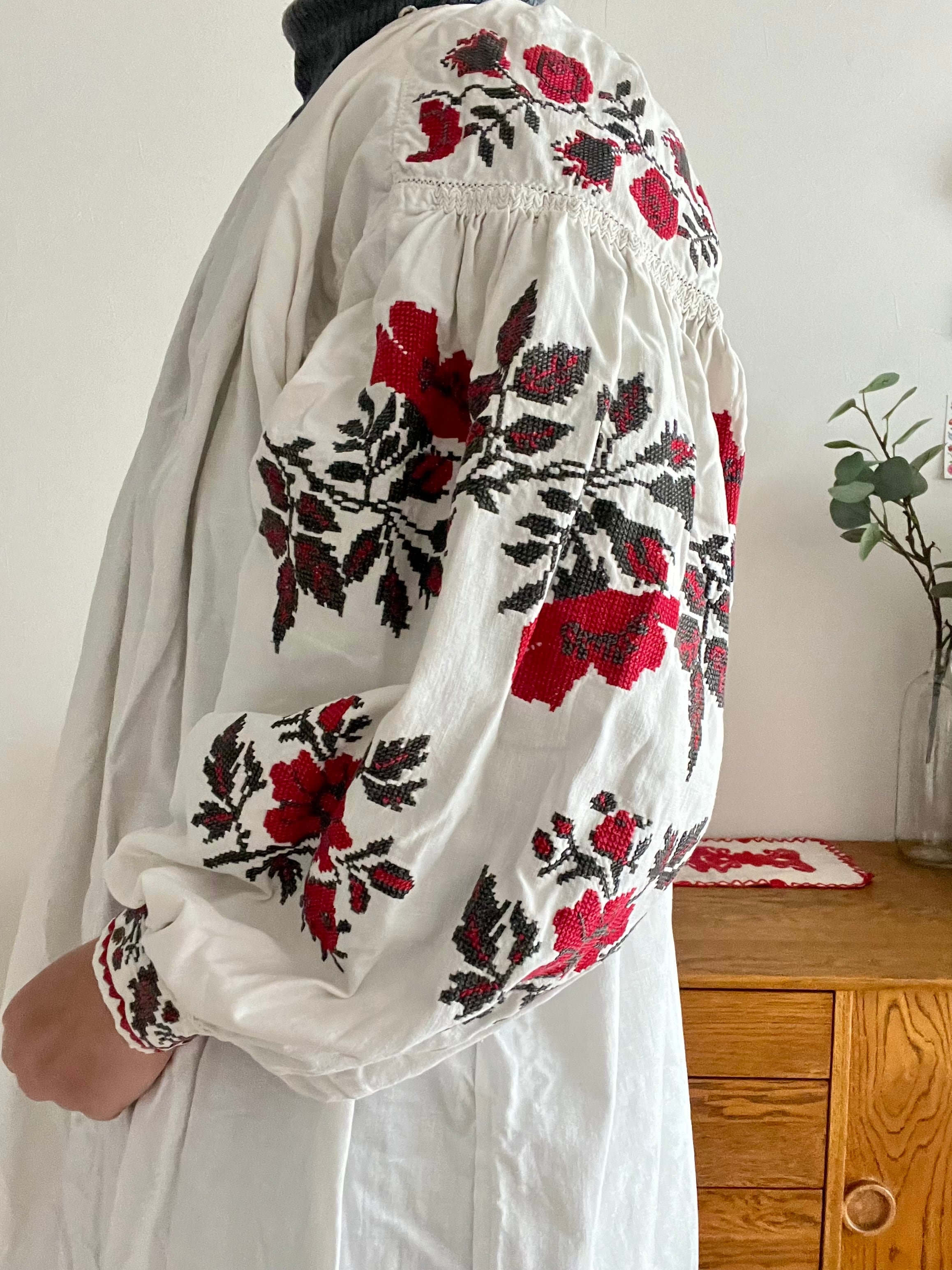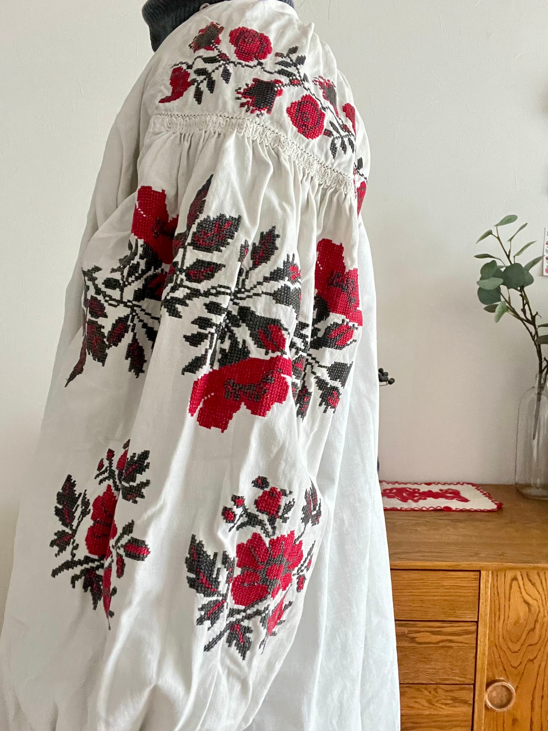 たっぷりボリューム袖の赤い花のウクライナ刺繍ワンピース ヴィシヴァンカ ソロチカ