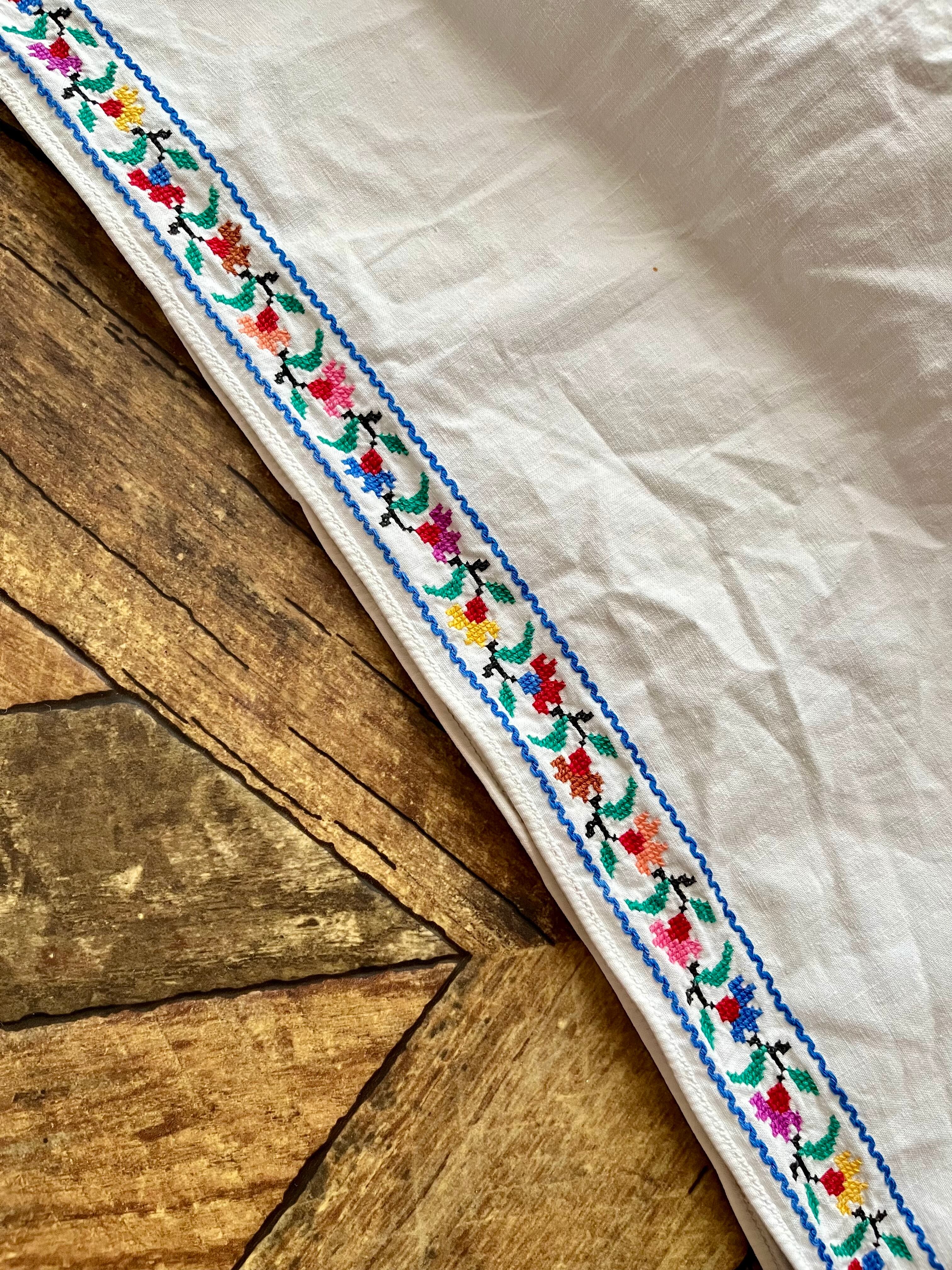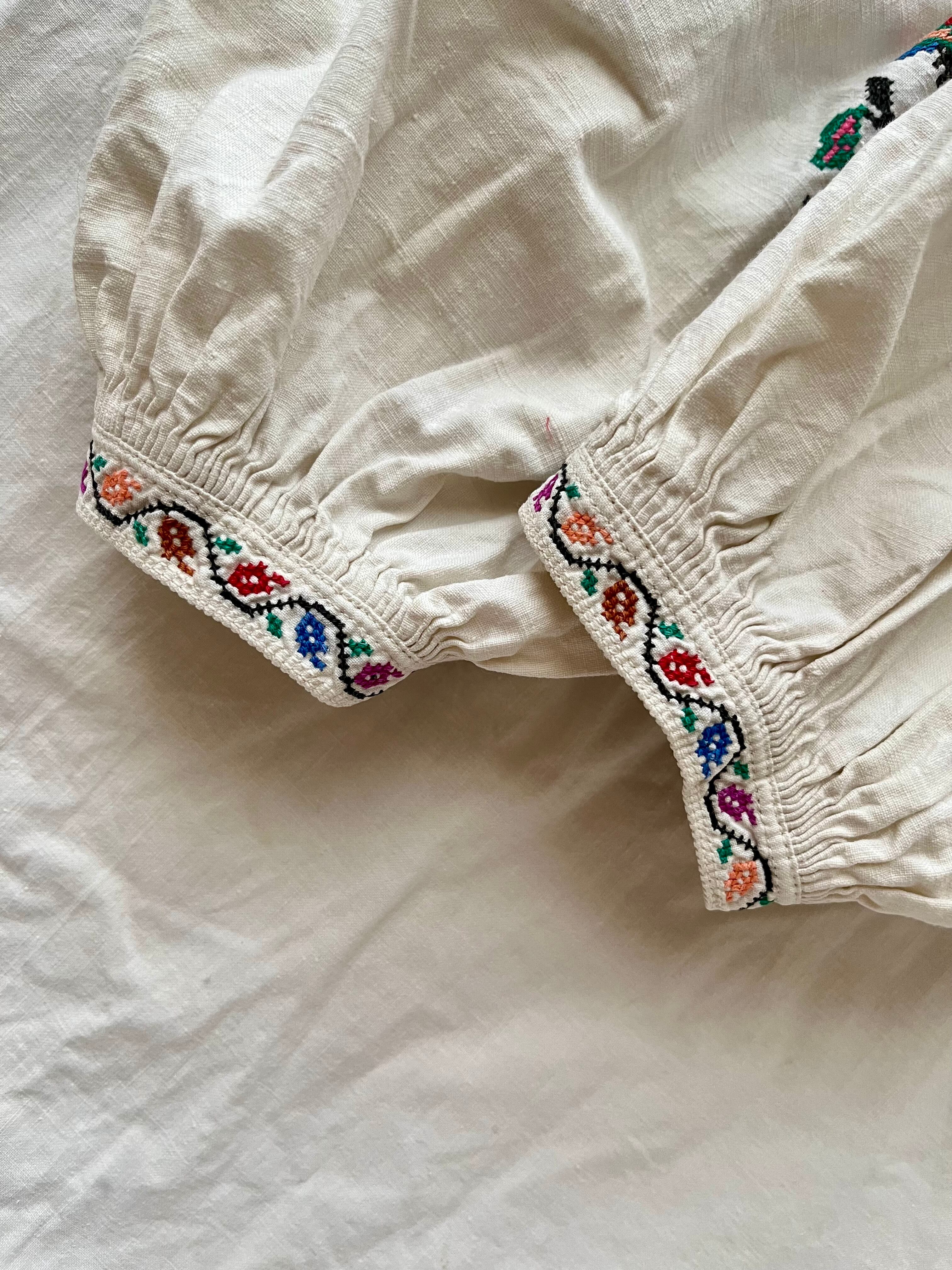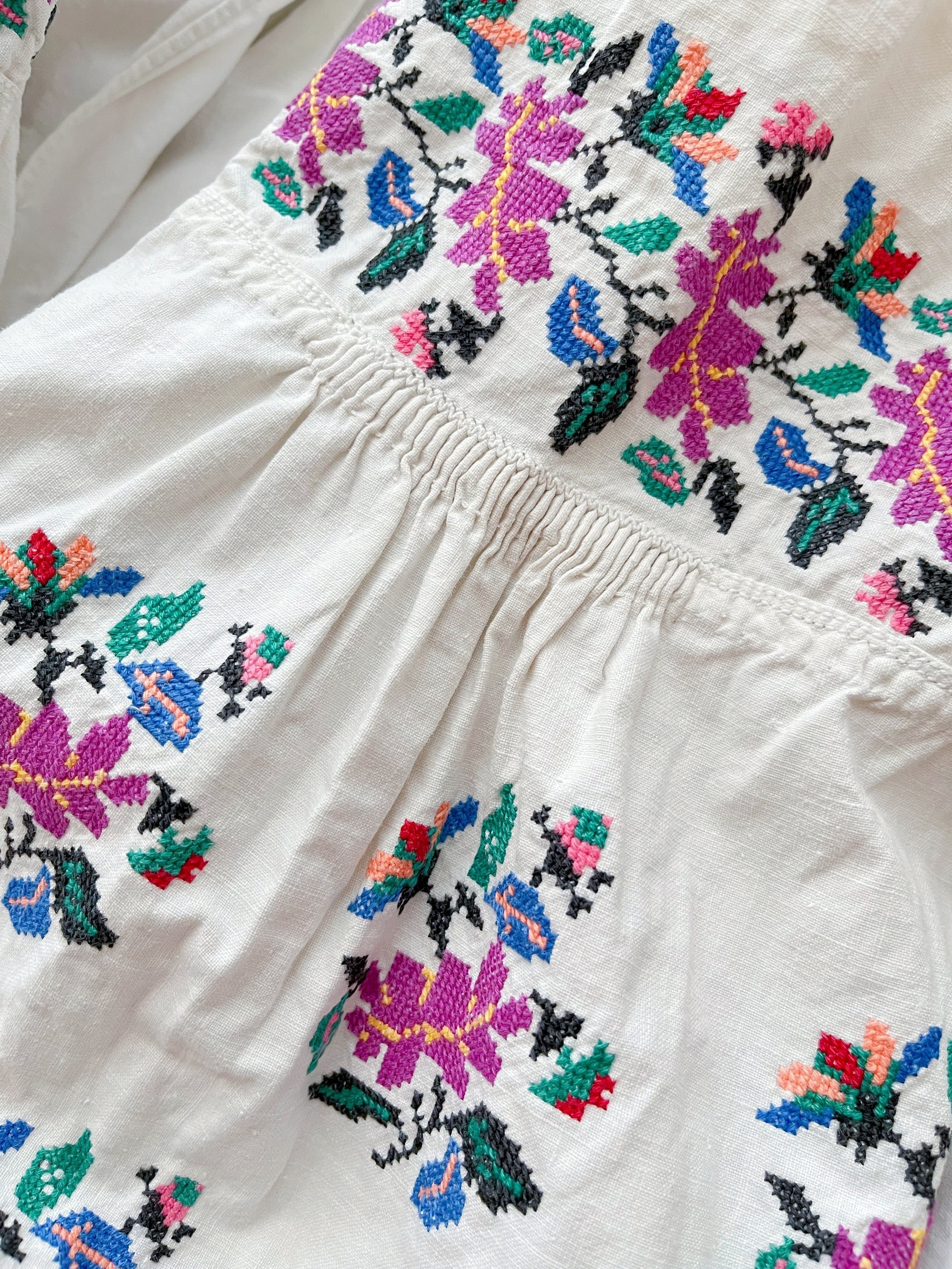 ウクライナ刺繍ワンピースではあまり見かけないピンクパープルの刺繍に、袖口・裾にもカラフルな植物の刺繍が丁寧にほどこされています。裾の刺繍は、どこかチロリアンテープを思わせるようなキュートなデザイン。