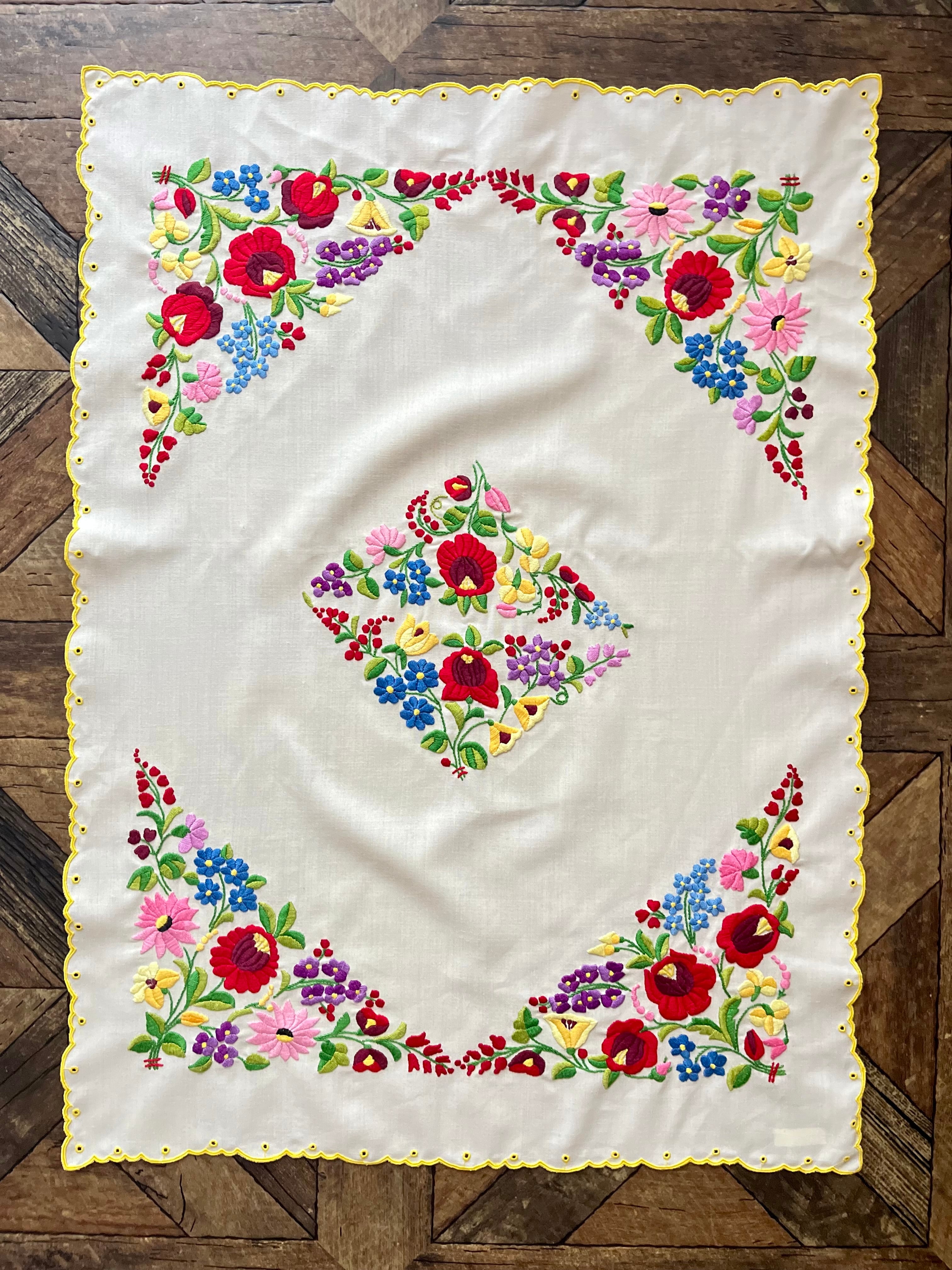イエロー縁の横長テーブルクロス ヴィンテージ カロチャ刺繍 81.5×58.5 cm
