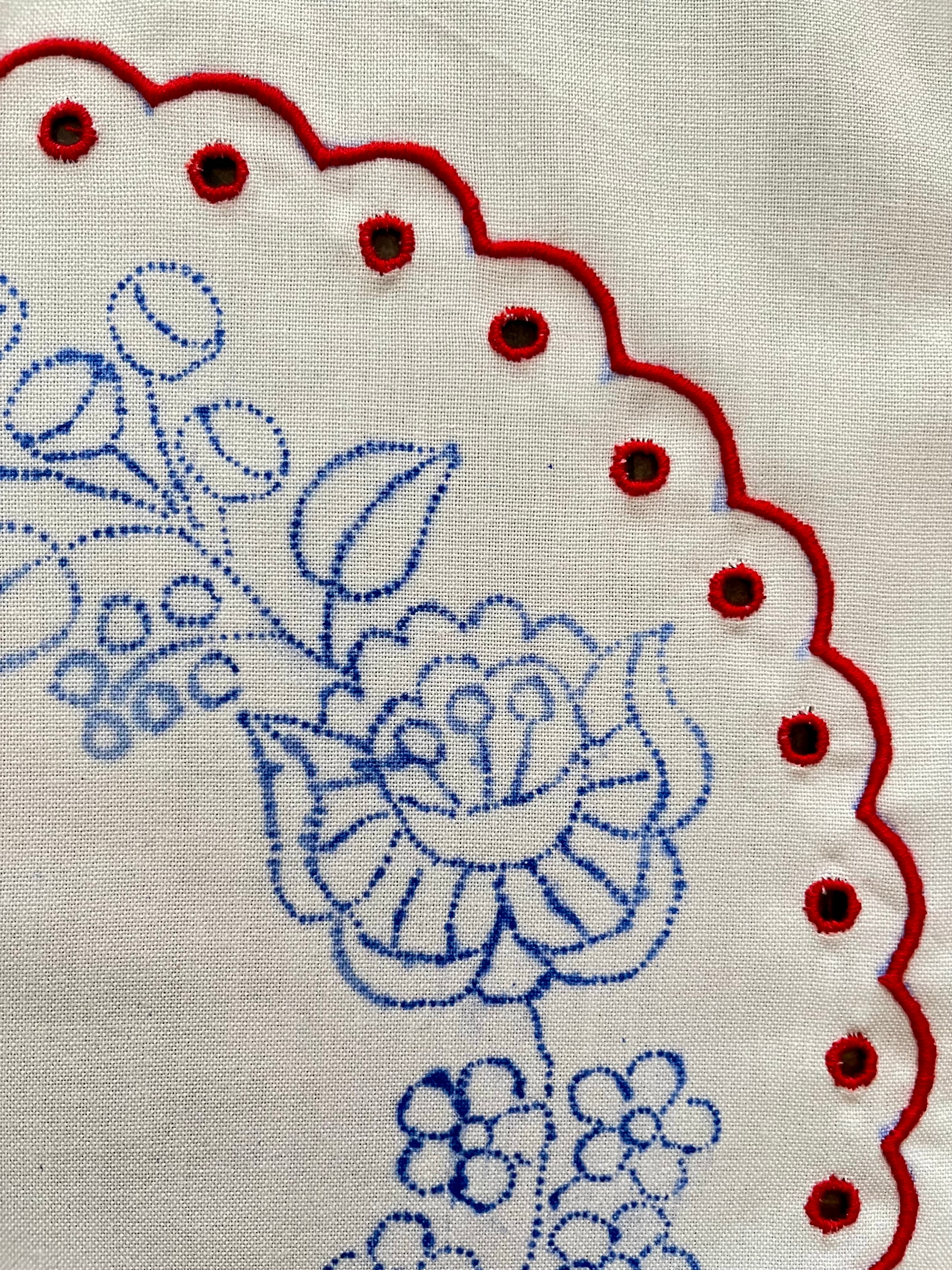 ・色落ち防止の布を使用しておりますが、赤やオレンジ色のハンガリーの刺繍糸は色移りをする可能性がございます。念のため商品とあわせて色移りを防ぐ方法を記載したものを同封いたします。