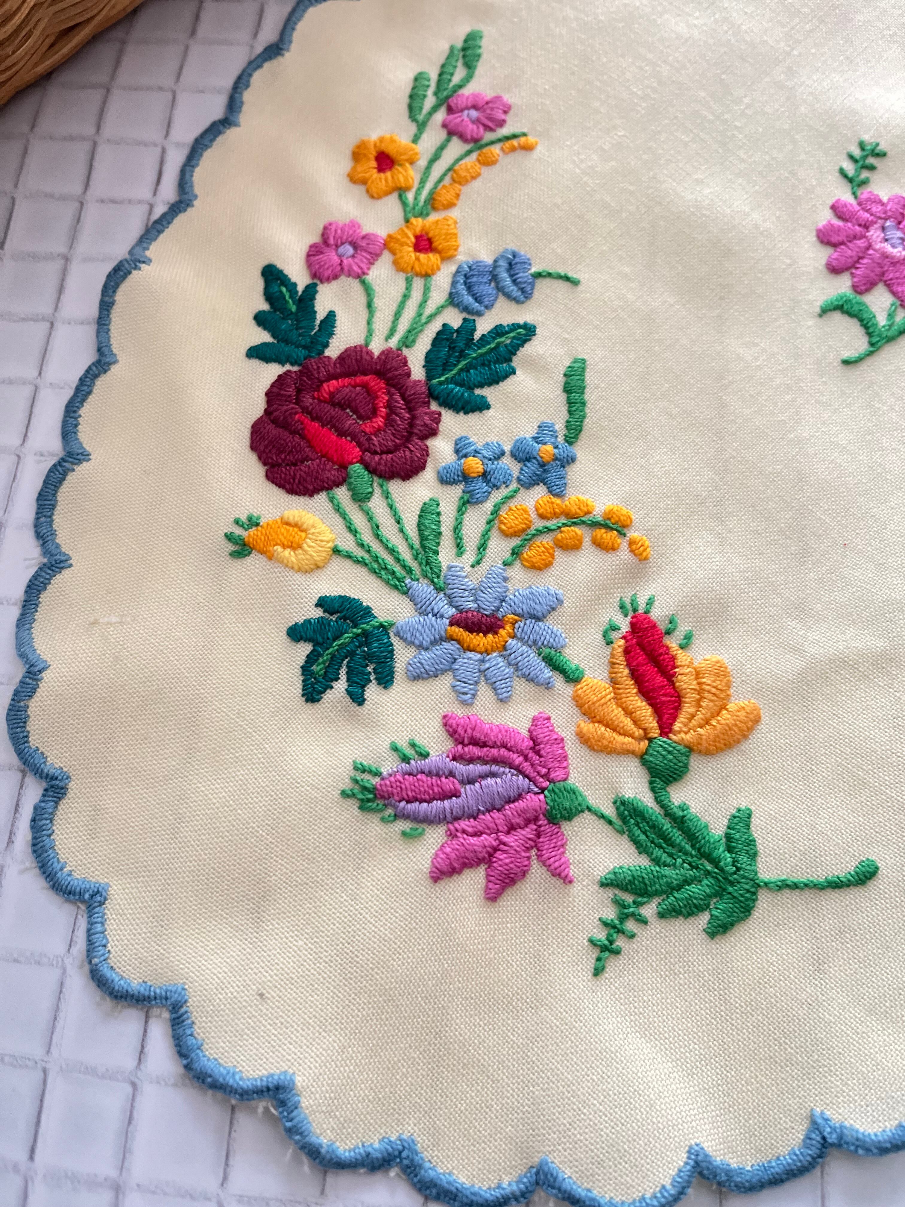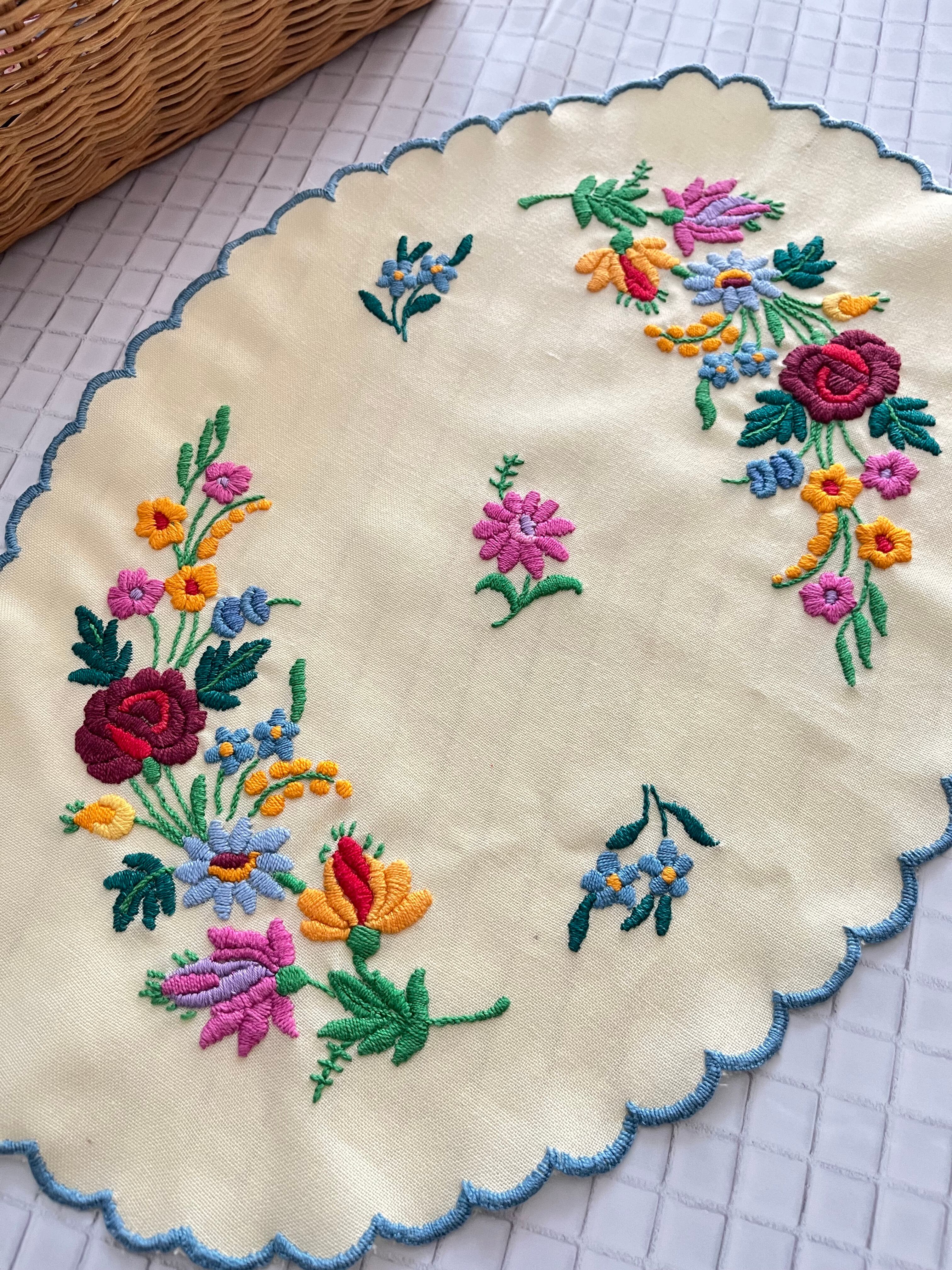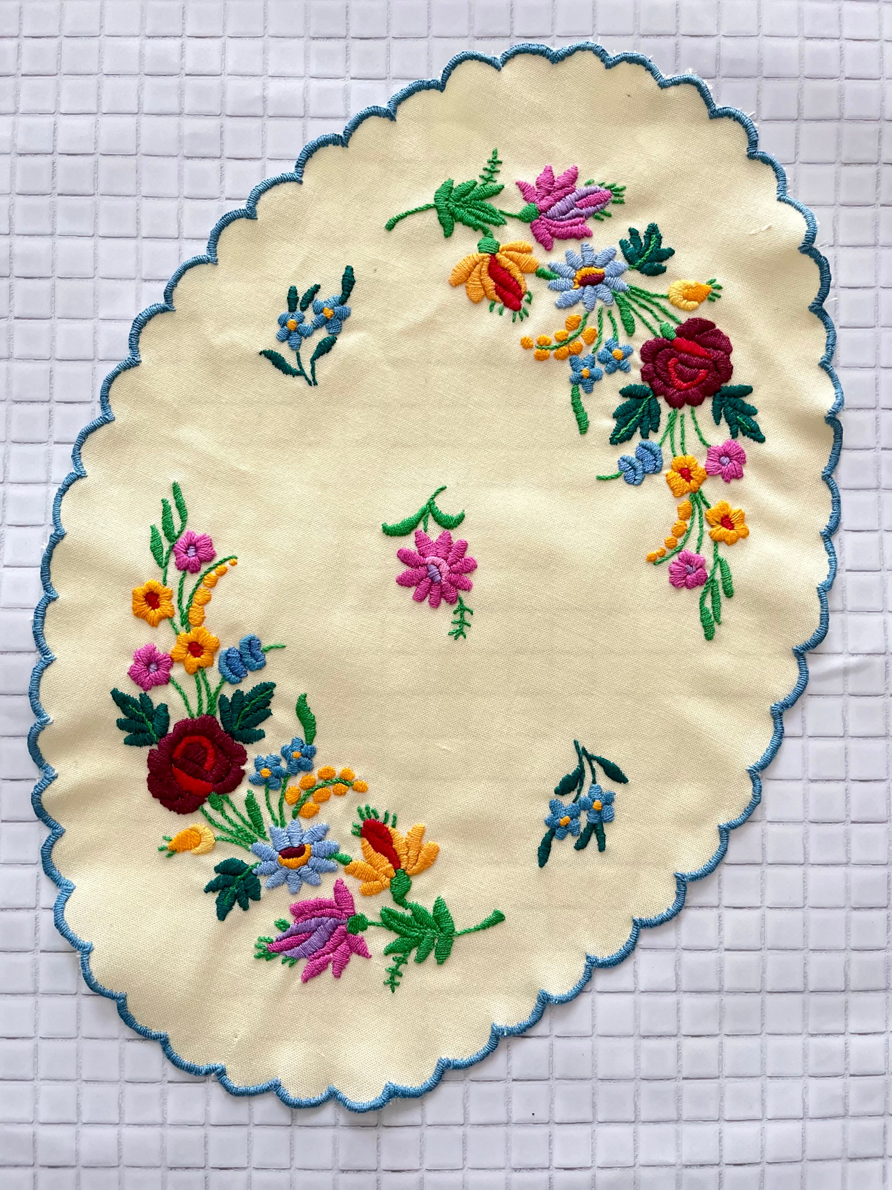【Mサイズ】青い縁のオーバルドイリー ヴィンテージハンガリー刺繍 約40×27.5cm