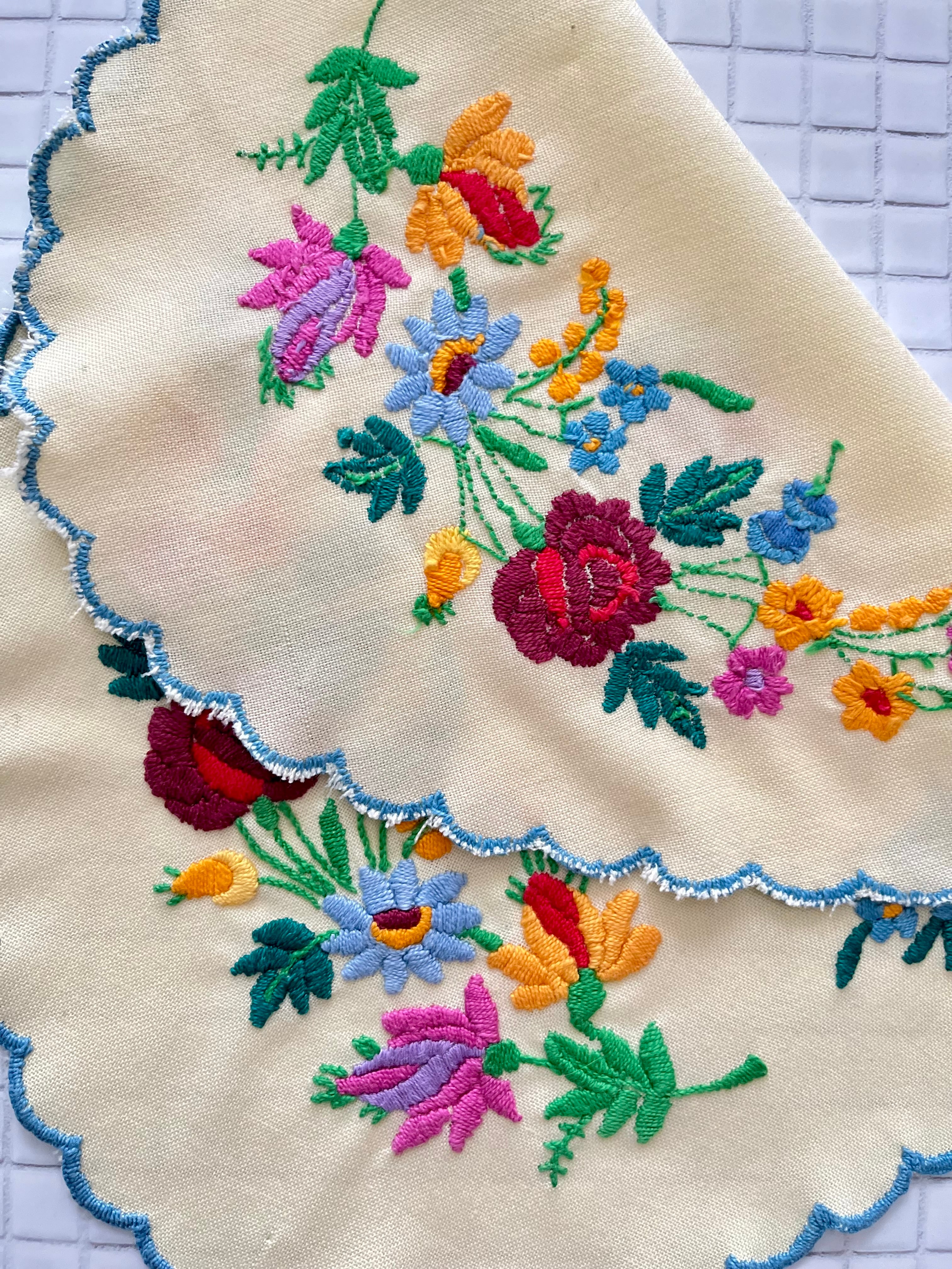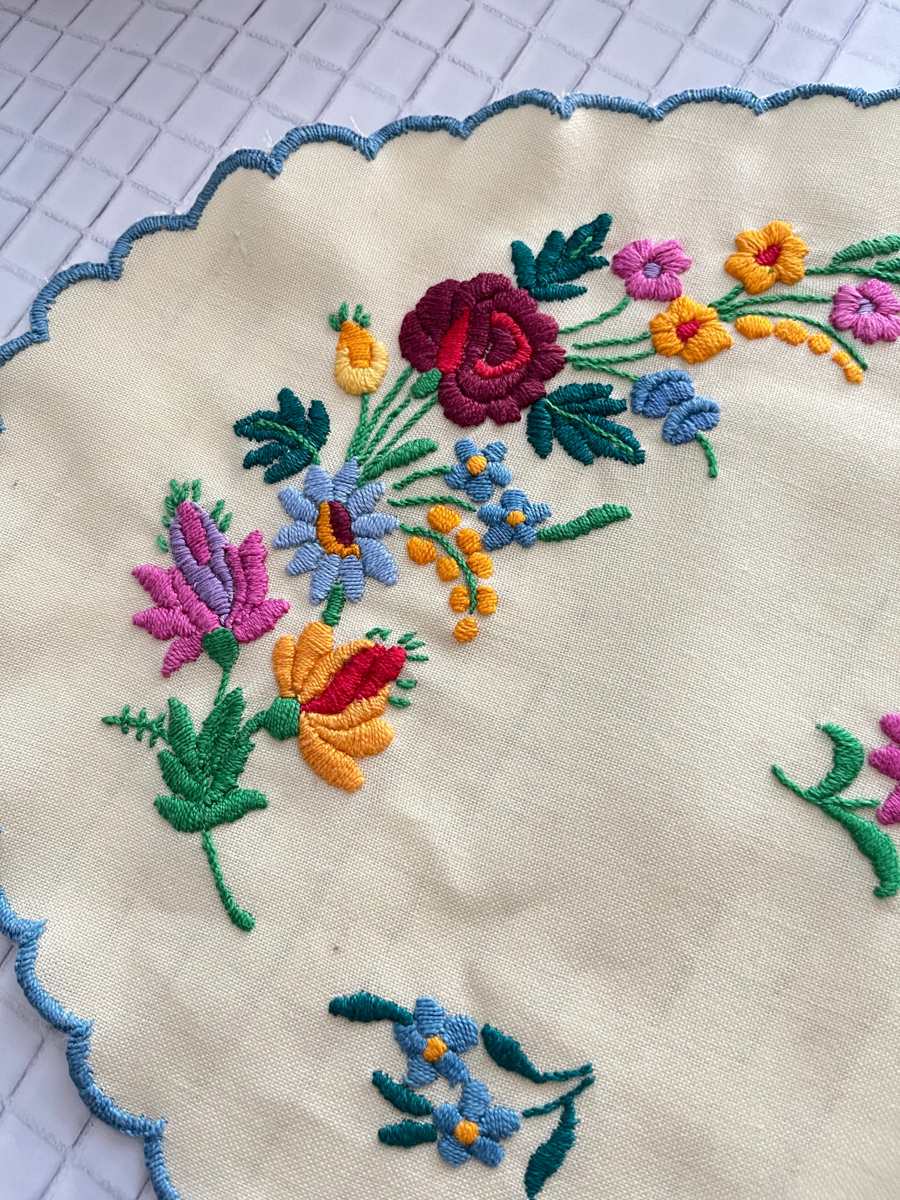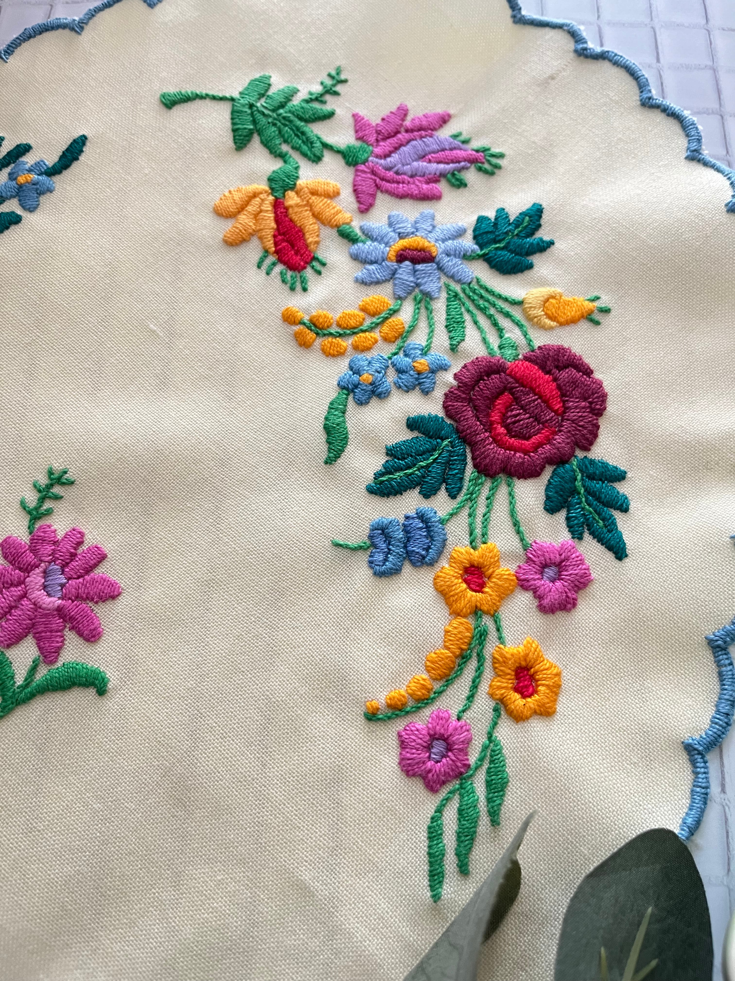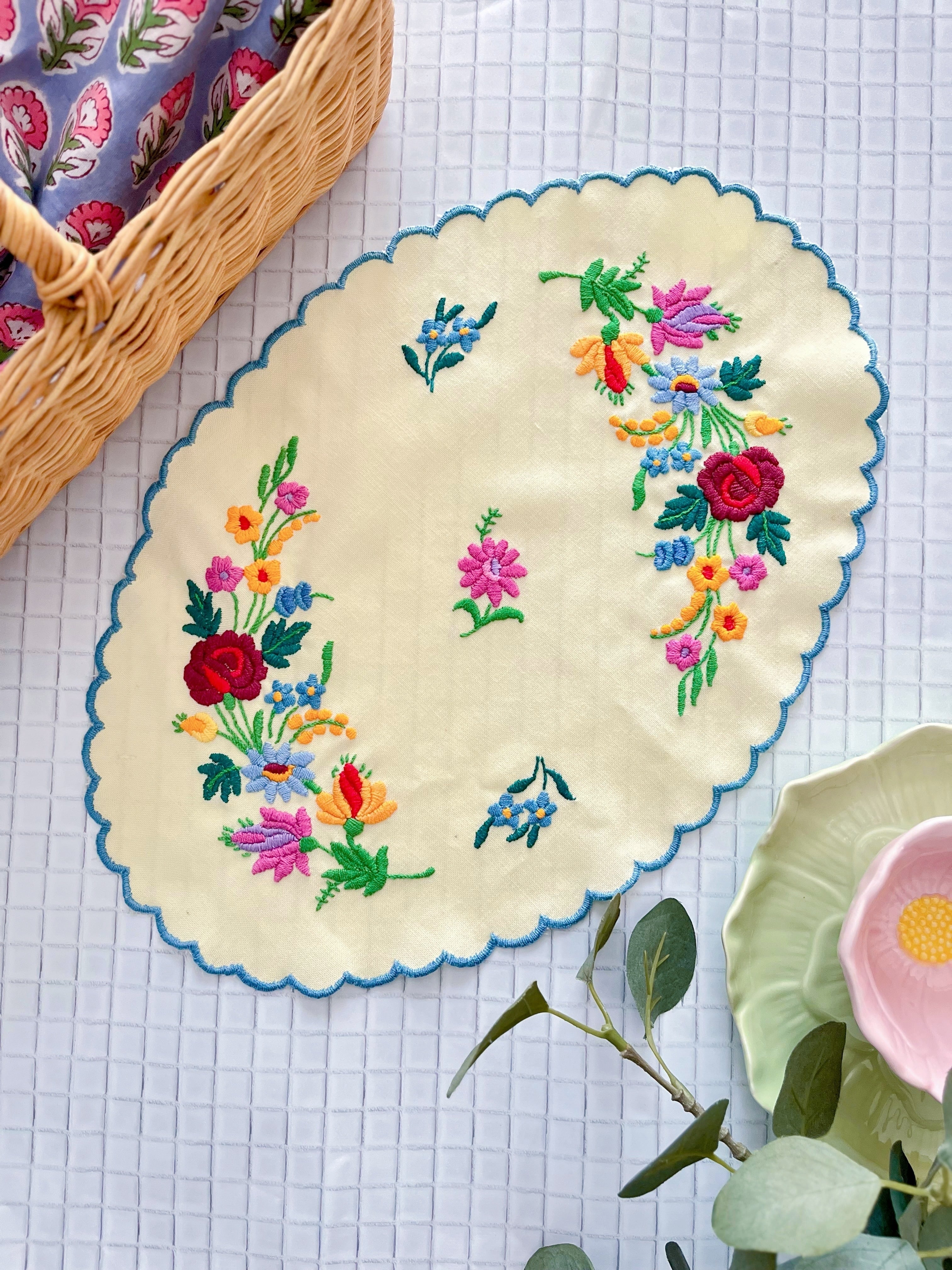 【Mサイズ】青い縁のオーバルドイリー ヴィンテージハンガリー刺繍 約40×27.5cm