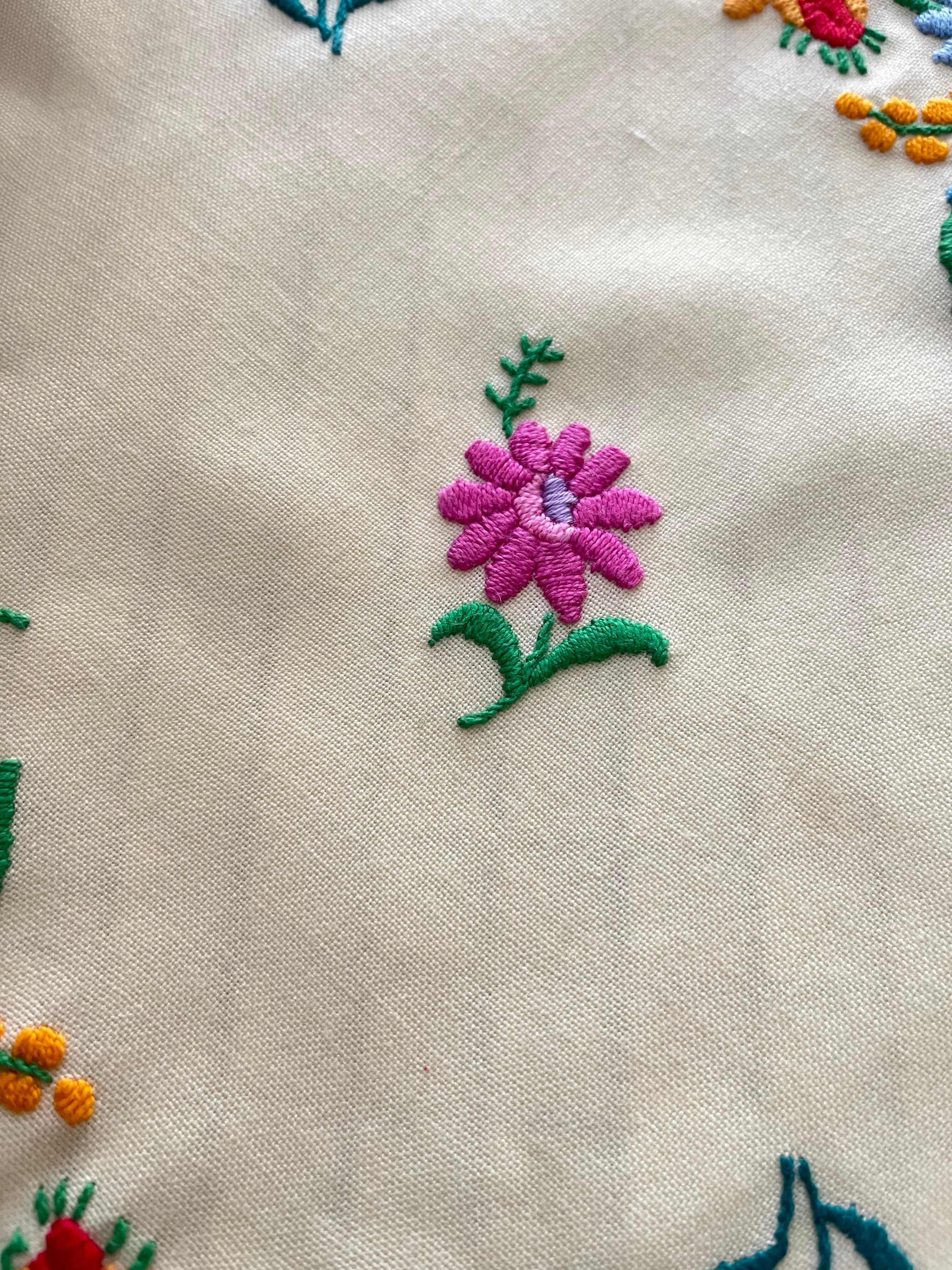 小さいけれど刺繍はとっても豪華。カラフルで様々な種類の花々が咲き何度もながめて楽しみたくなる1枚です♩