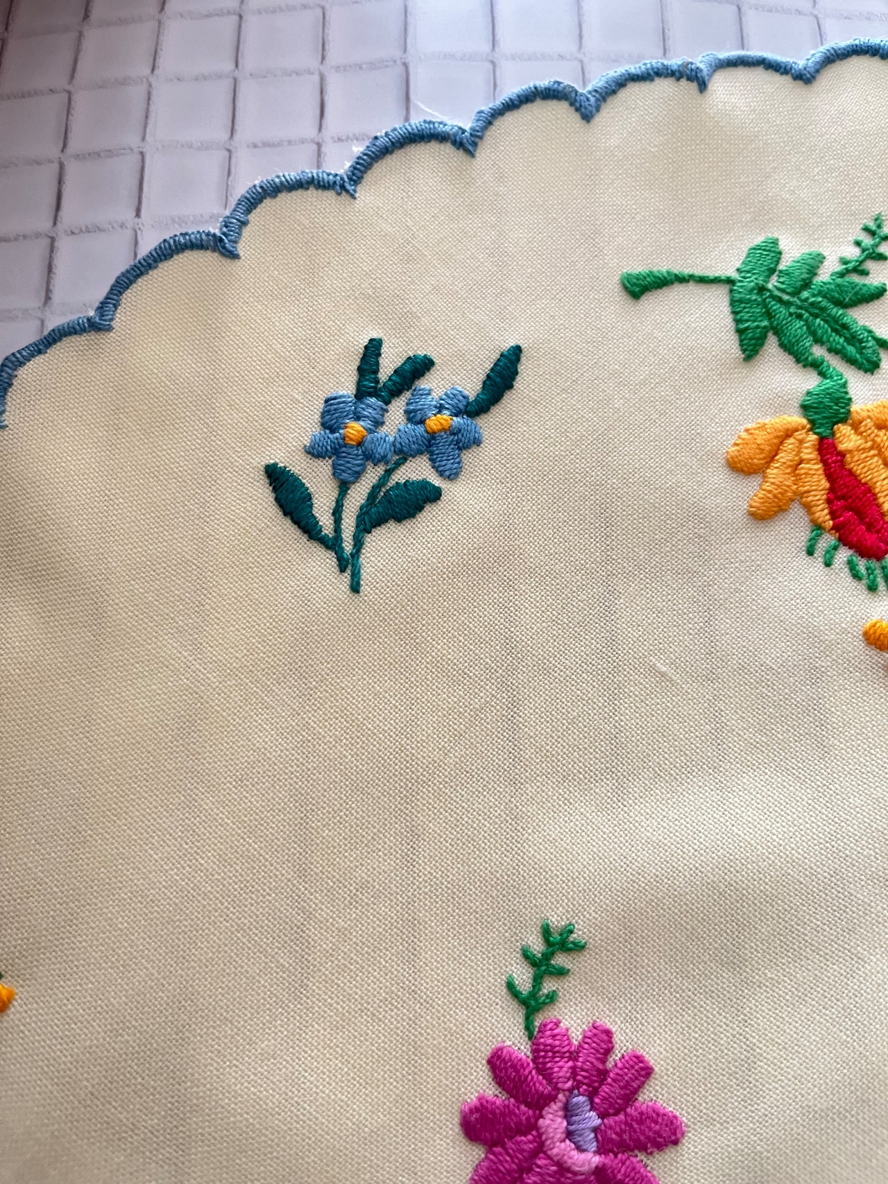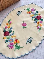 クリーム色の布地と、ブルーの縁が珍しくキュートな印象のドイリー。