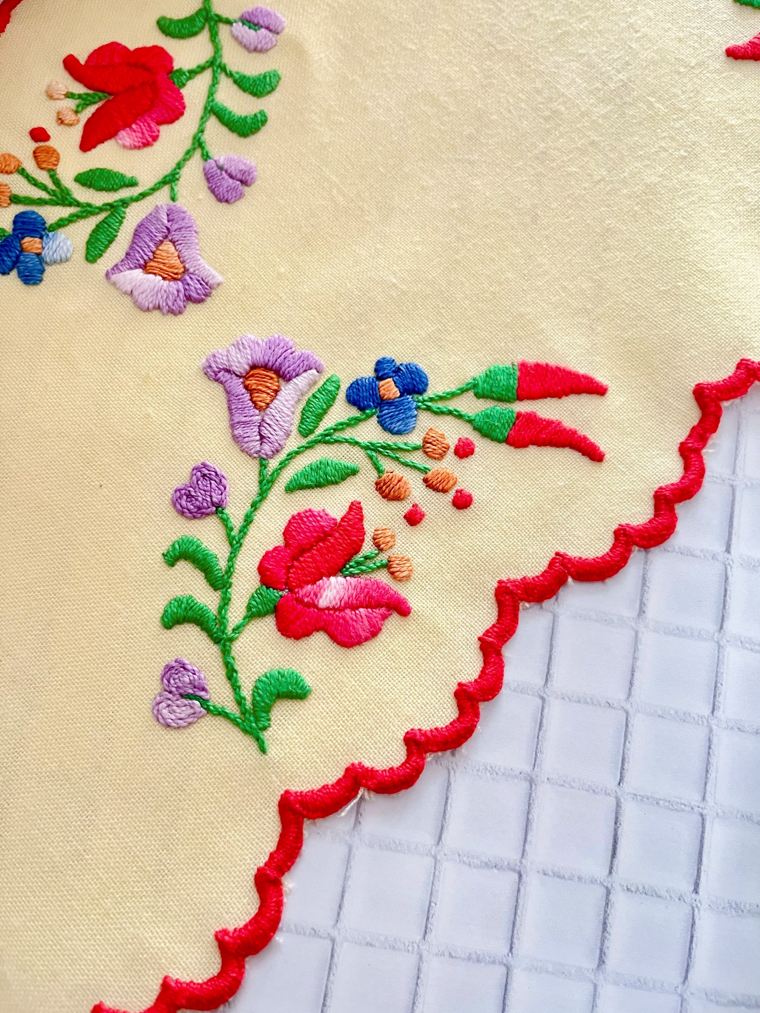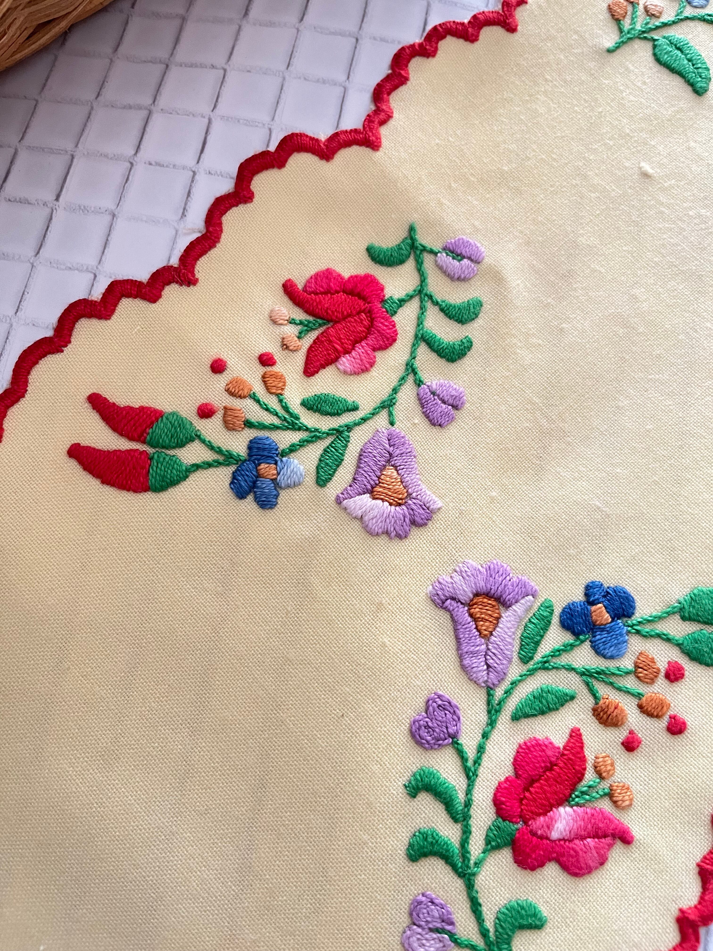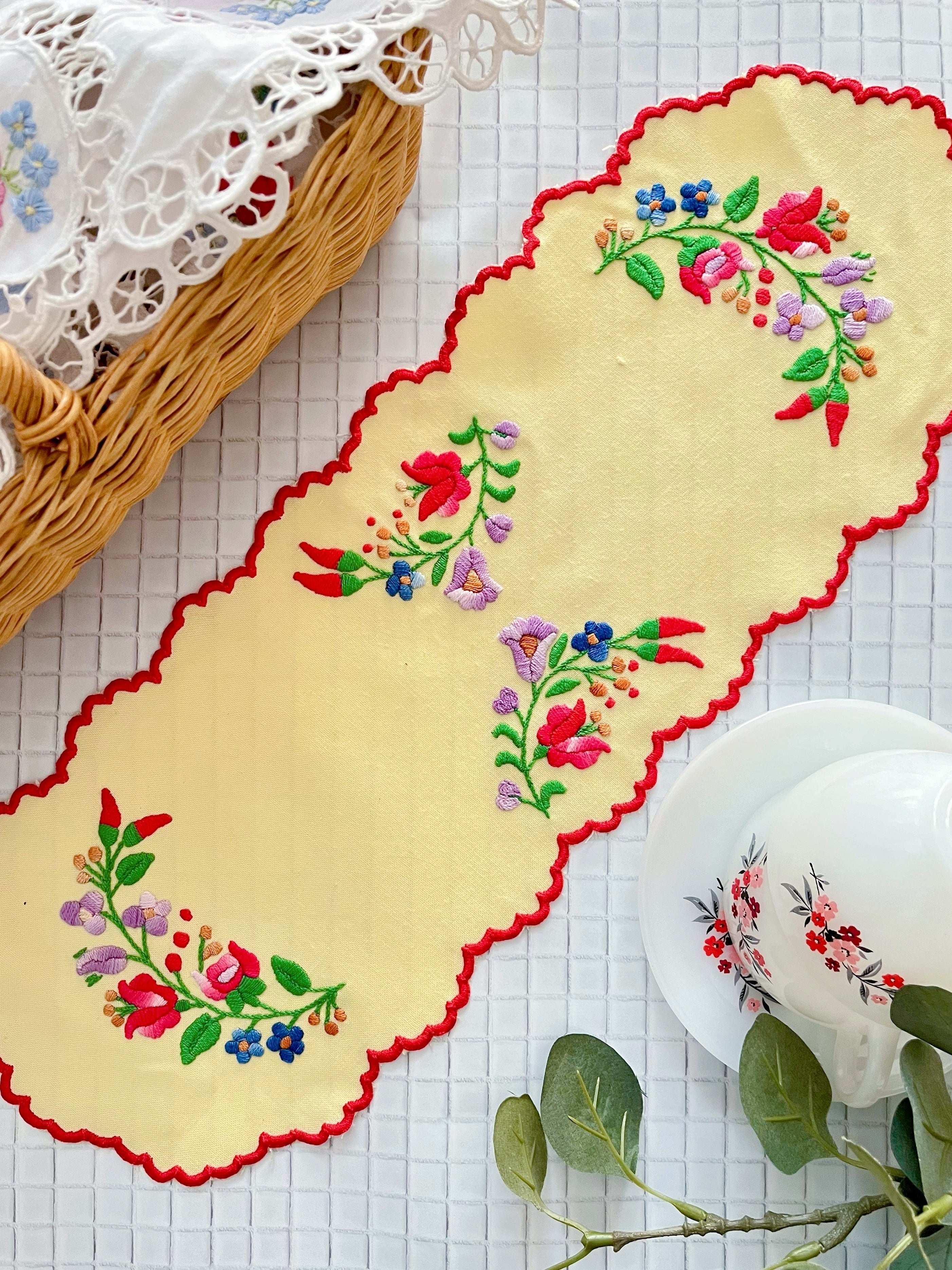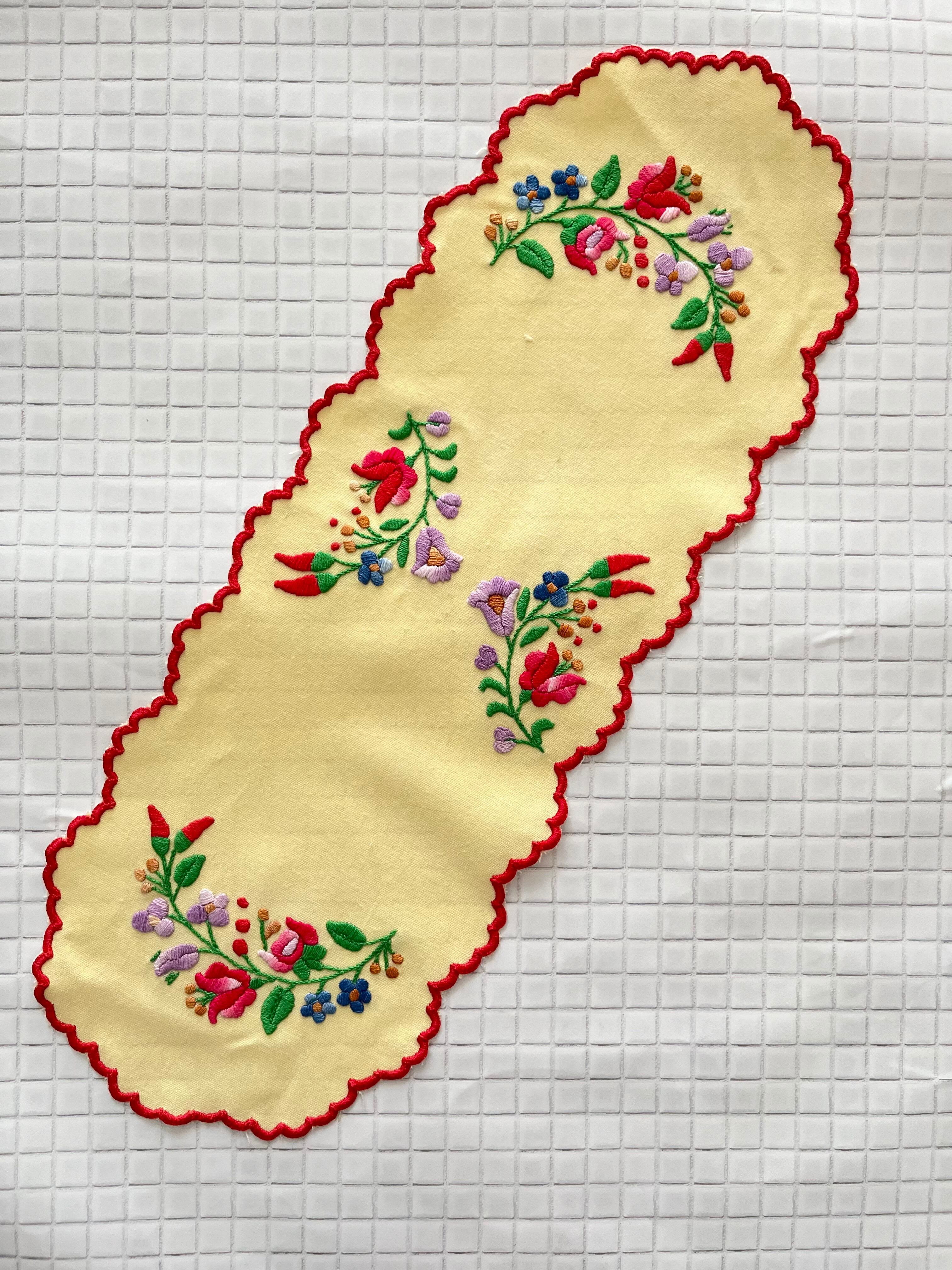 イエローベースの布地にカロチャ刺繍のモチーフが施された小さなテーブルランナー。
