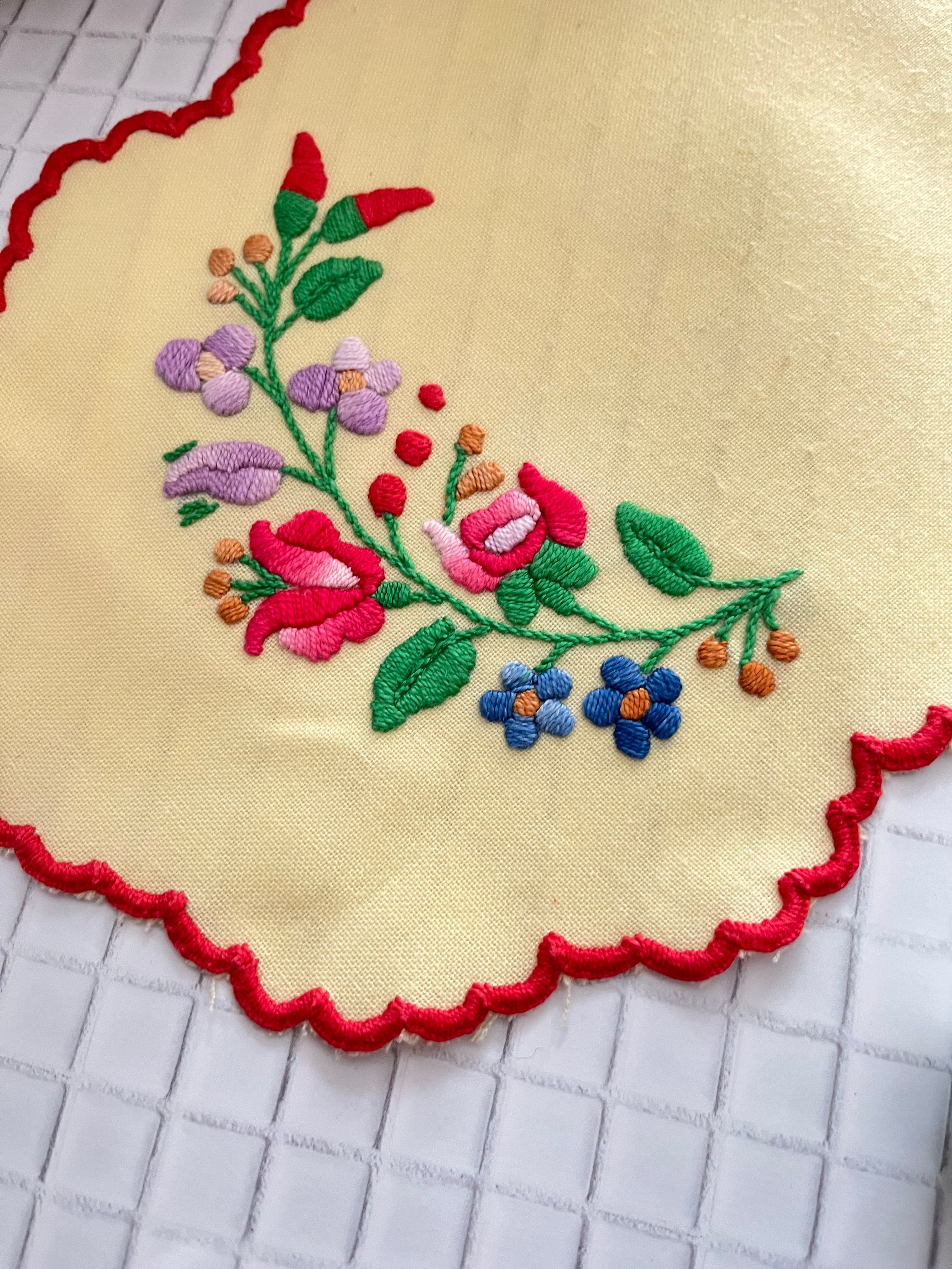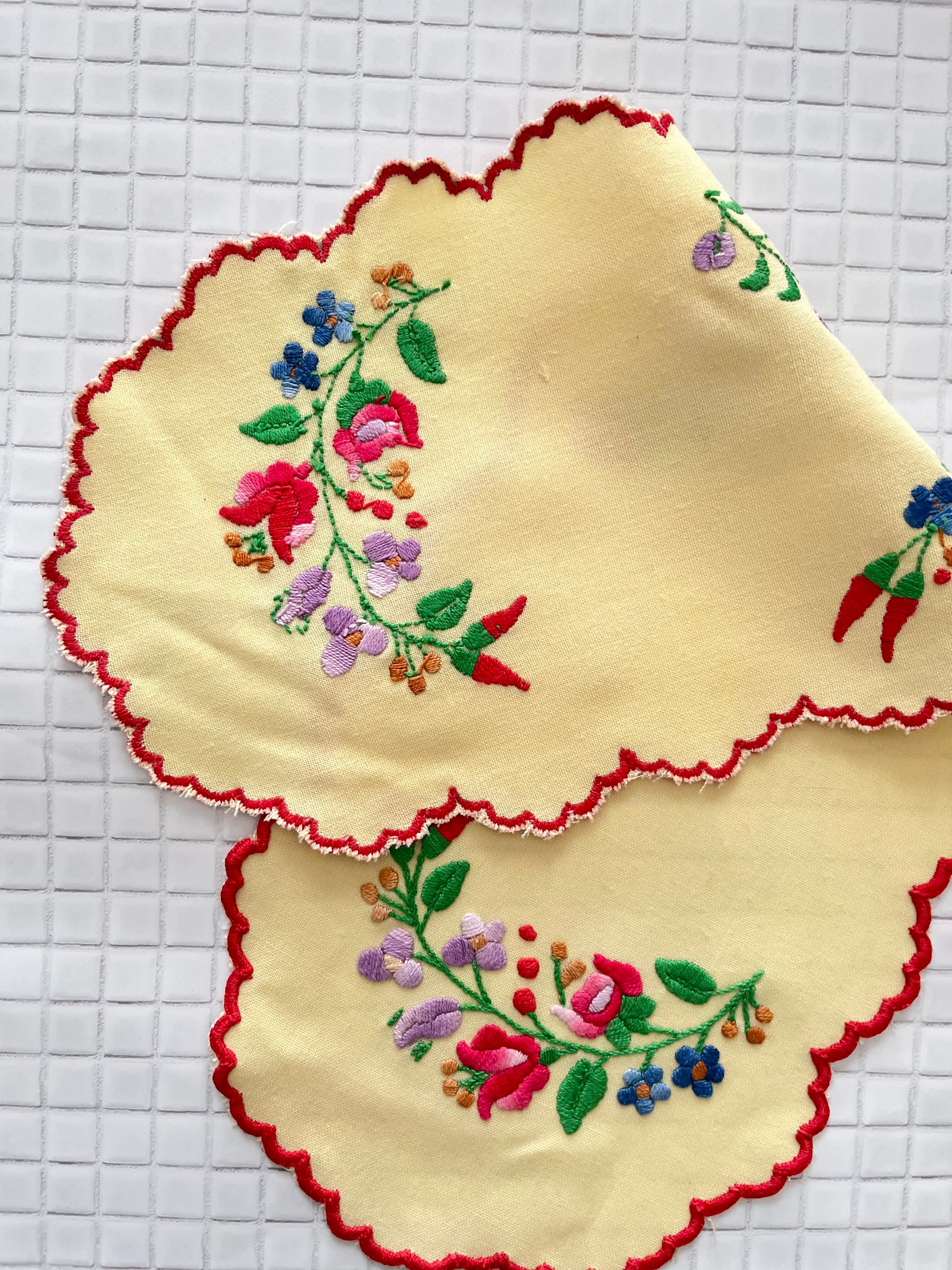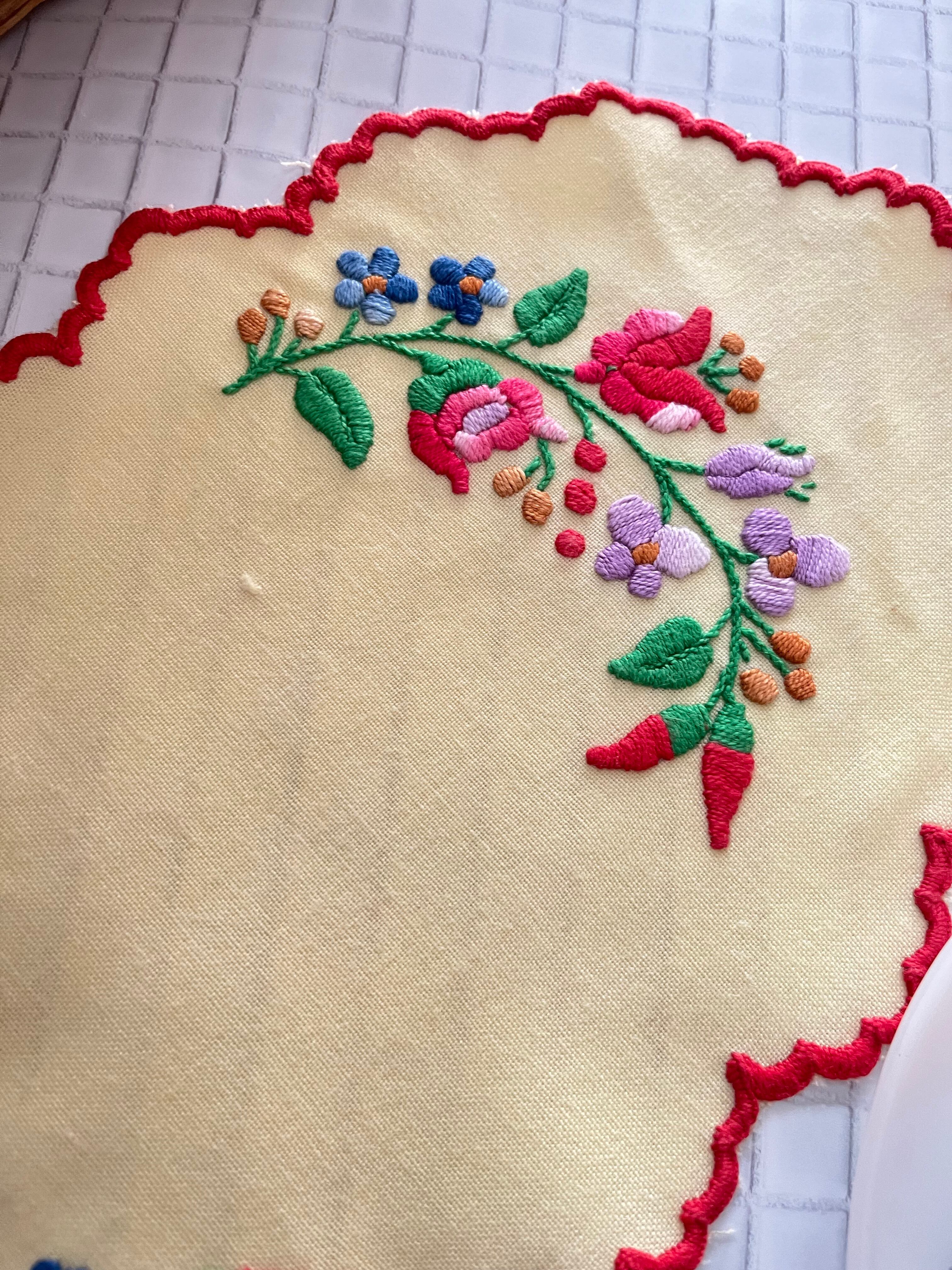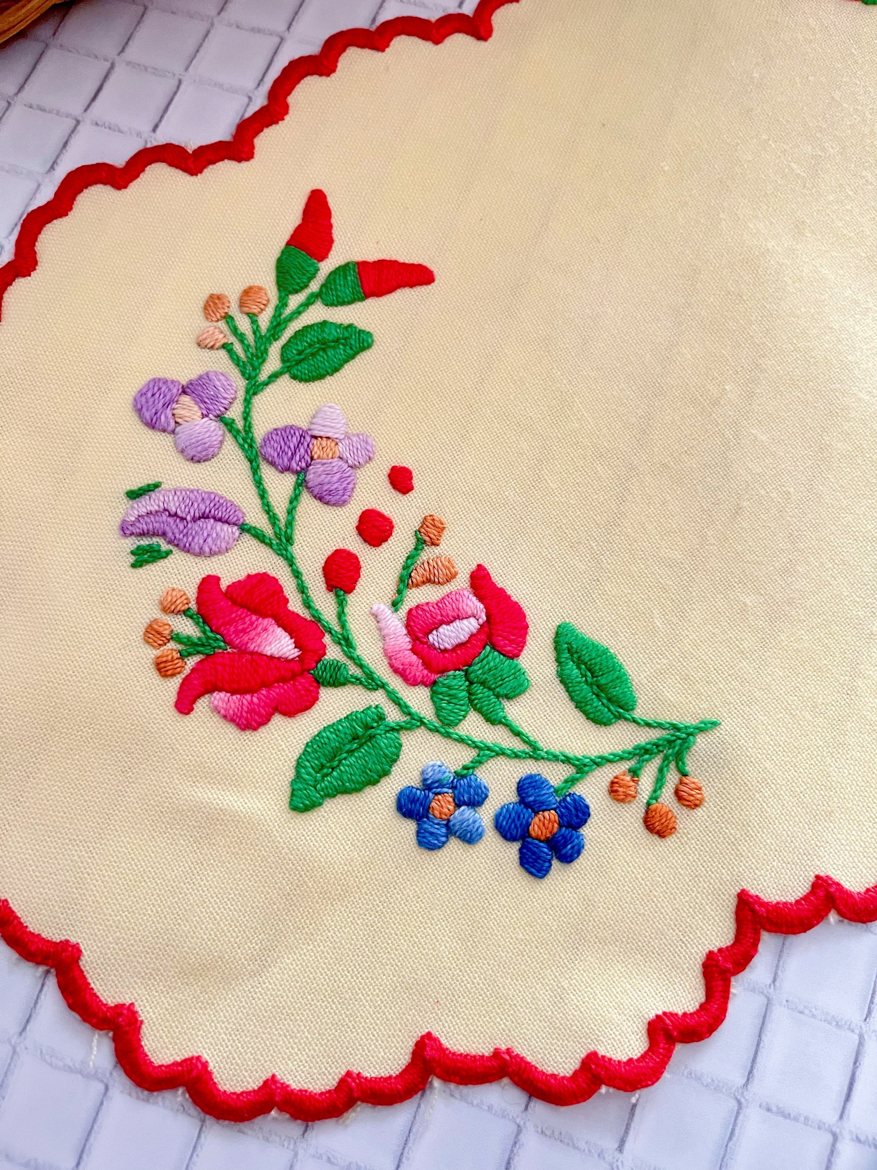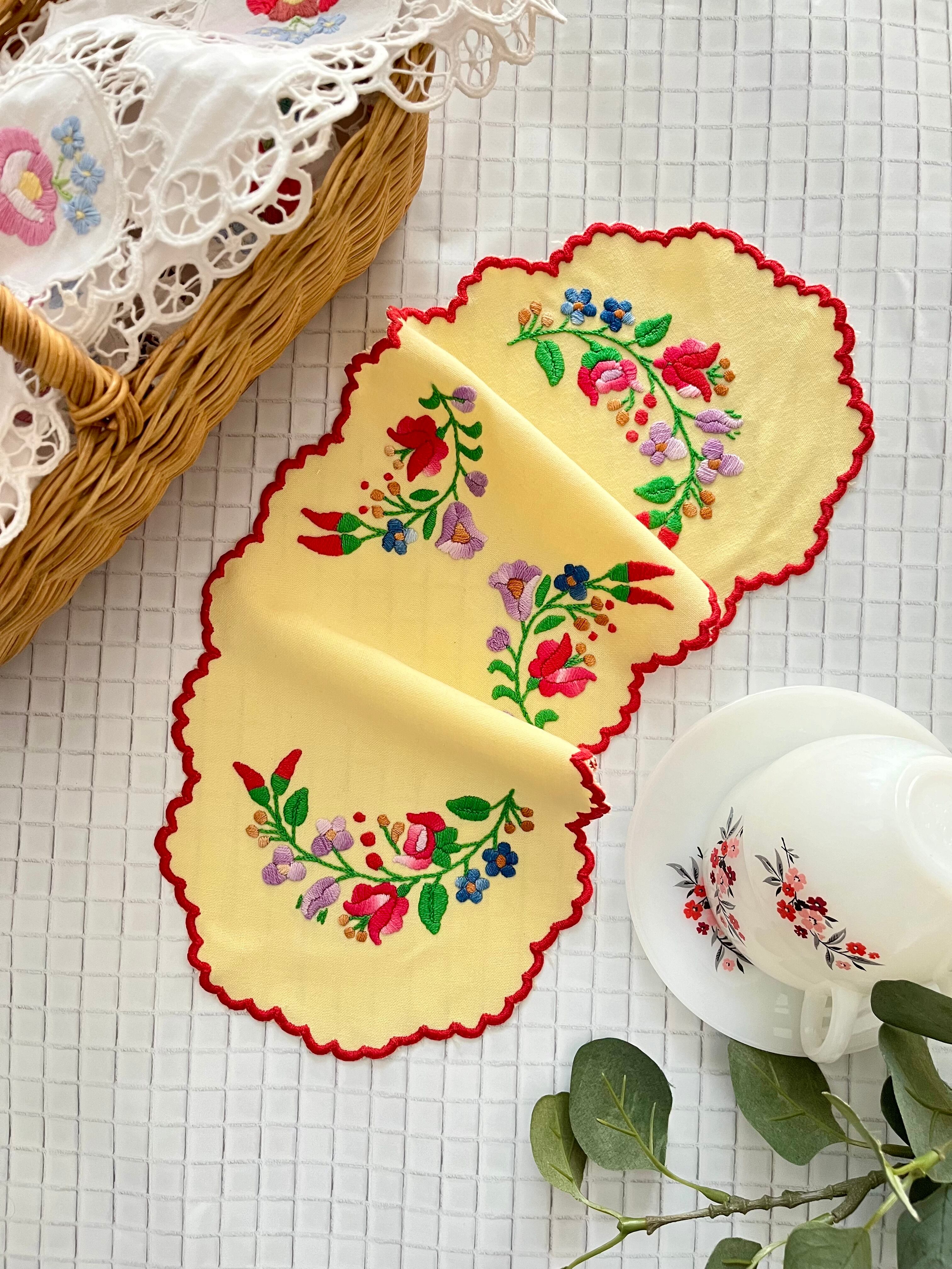 イエローベースの布地にカロチャ刺繍のモチーフが施された小さなテーブルランナー。