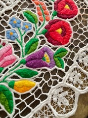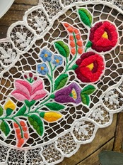 カロチャリシェリューは、ふだんのカロチャ刺繍を手縫いで仕上げた後にもうひと仕事。レースを作りたい部分を小さなはさみで切り取り、穴の周りを糸で縁取り、さらに花や車輪などの模様を描いていくのです。なんて気の遠くなる作業でしょうか…