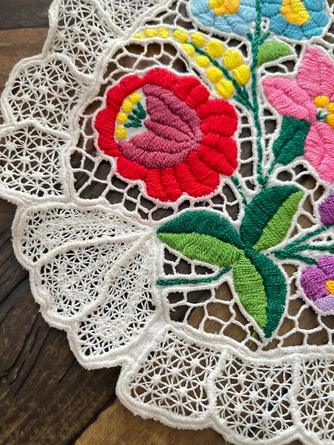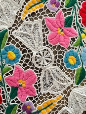 カロチャリシェリューは、ふだんのカロチャ刺繍を手縫いで仕上げた後にもうひと仕事。レースを作りたい部分を小さなはさみで切り取り、穴の周りを糸で縁取り、さらに花や車輪などの模様を描いていくのです。なんて気の遠くなる作業でしょうか…