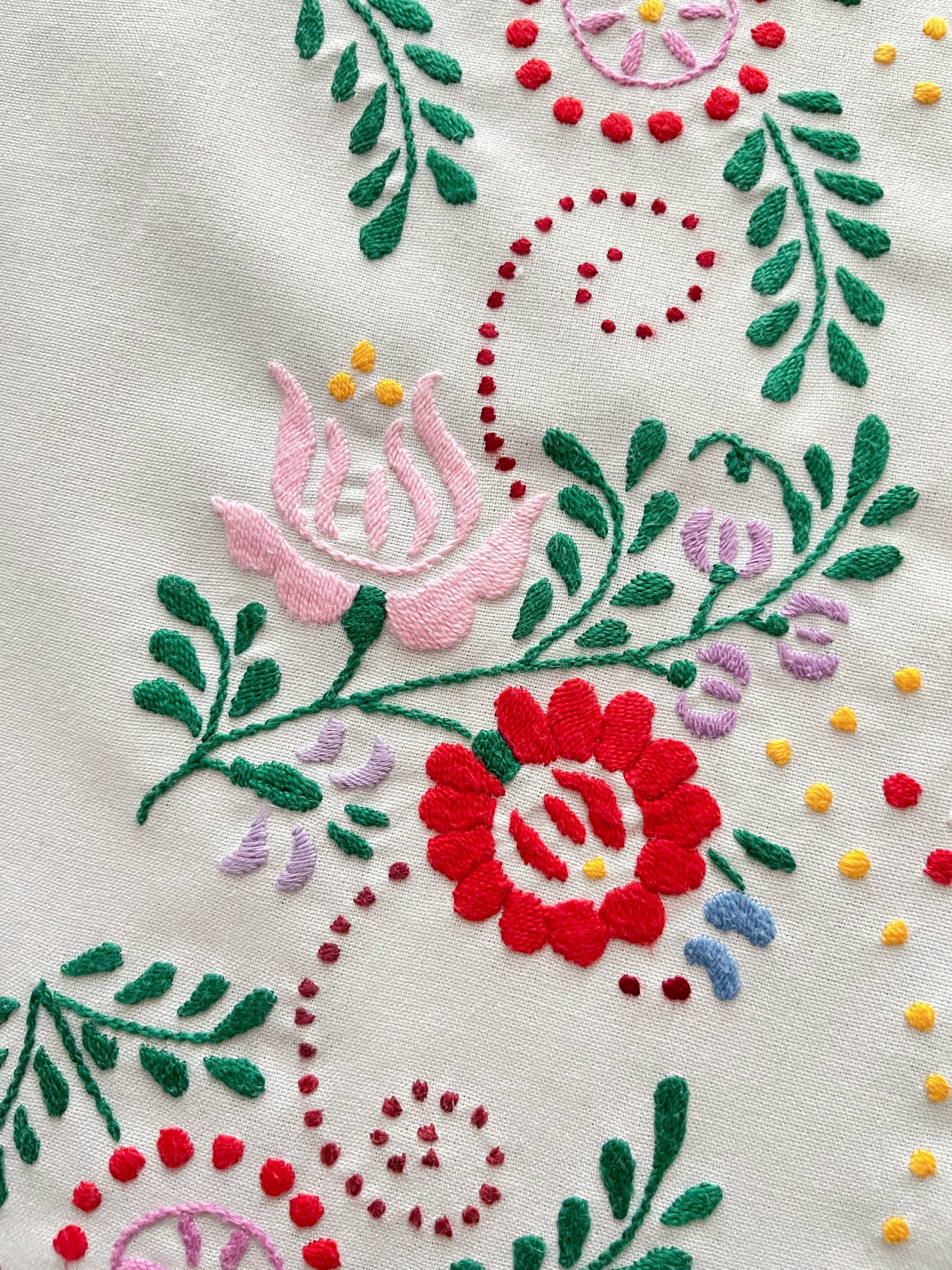 花のデザインを見ると、よく目にするカロチャ刺繍との違いがよく分かります。