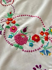 カロチャ刺繍の図案をベースに、作り手の好みの配色で楽しく作られたことが伝わります♩