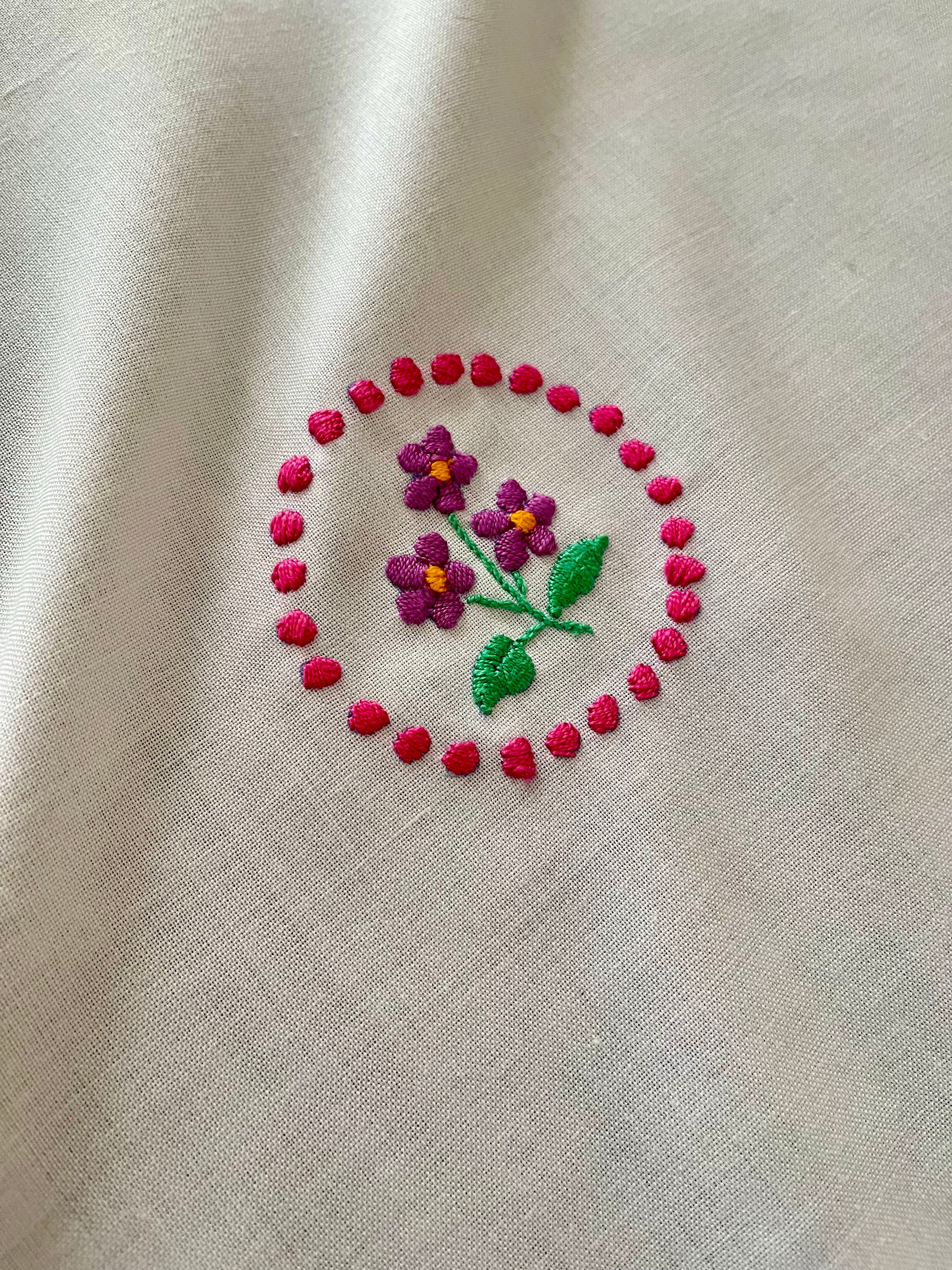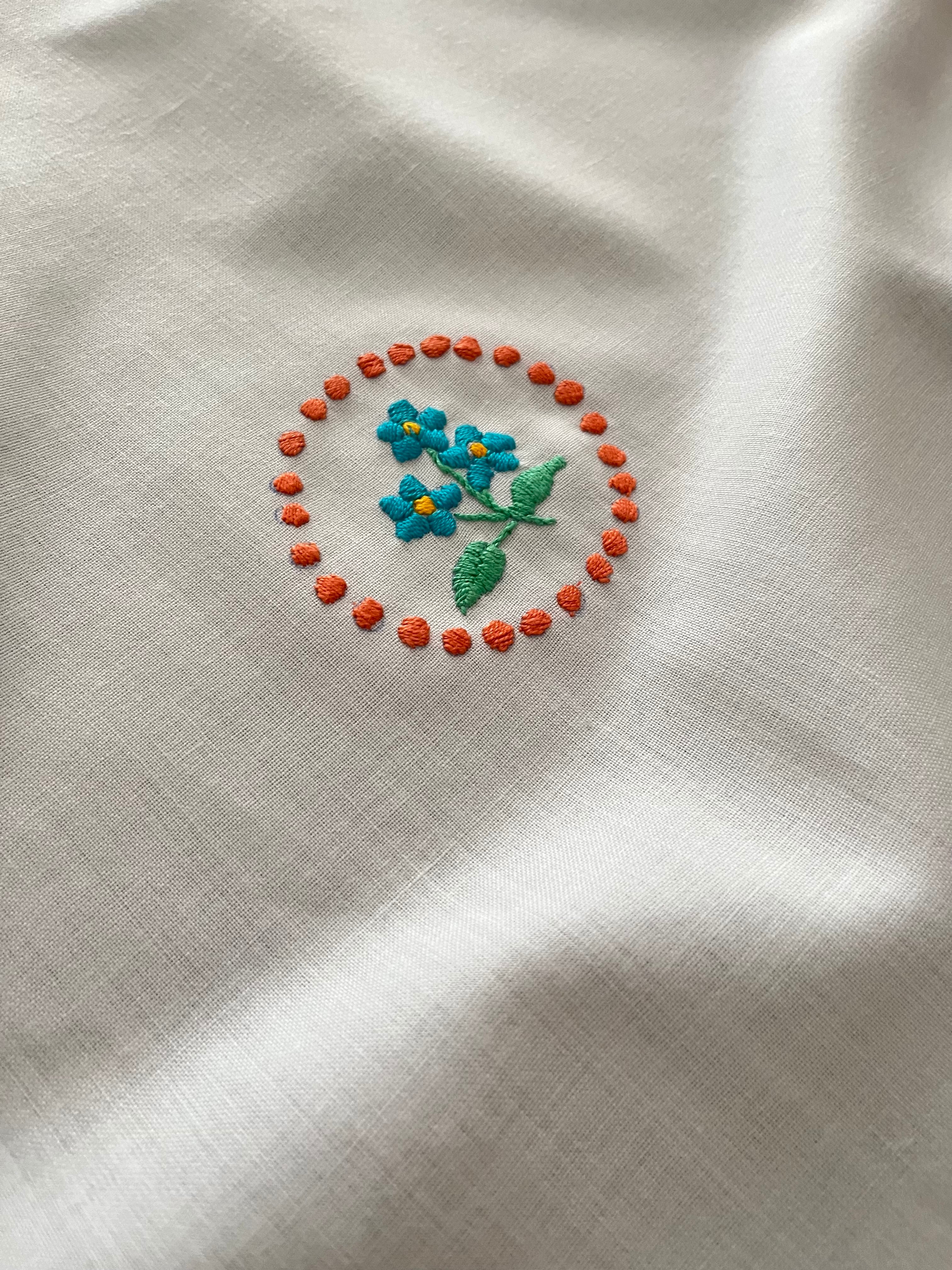 白い縁と対照的な虹色の刺繍。こんなにかわいくって愉しい1枚はなかなか出逢えません。