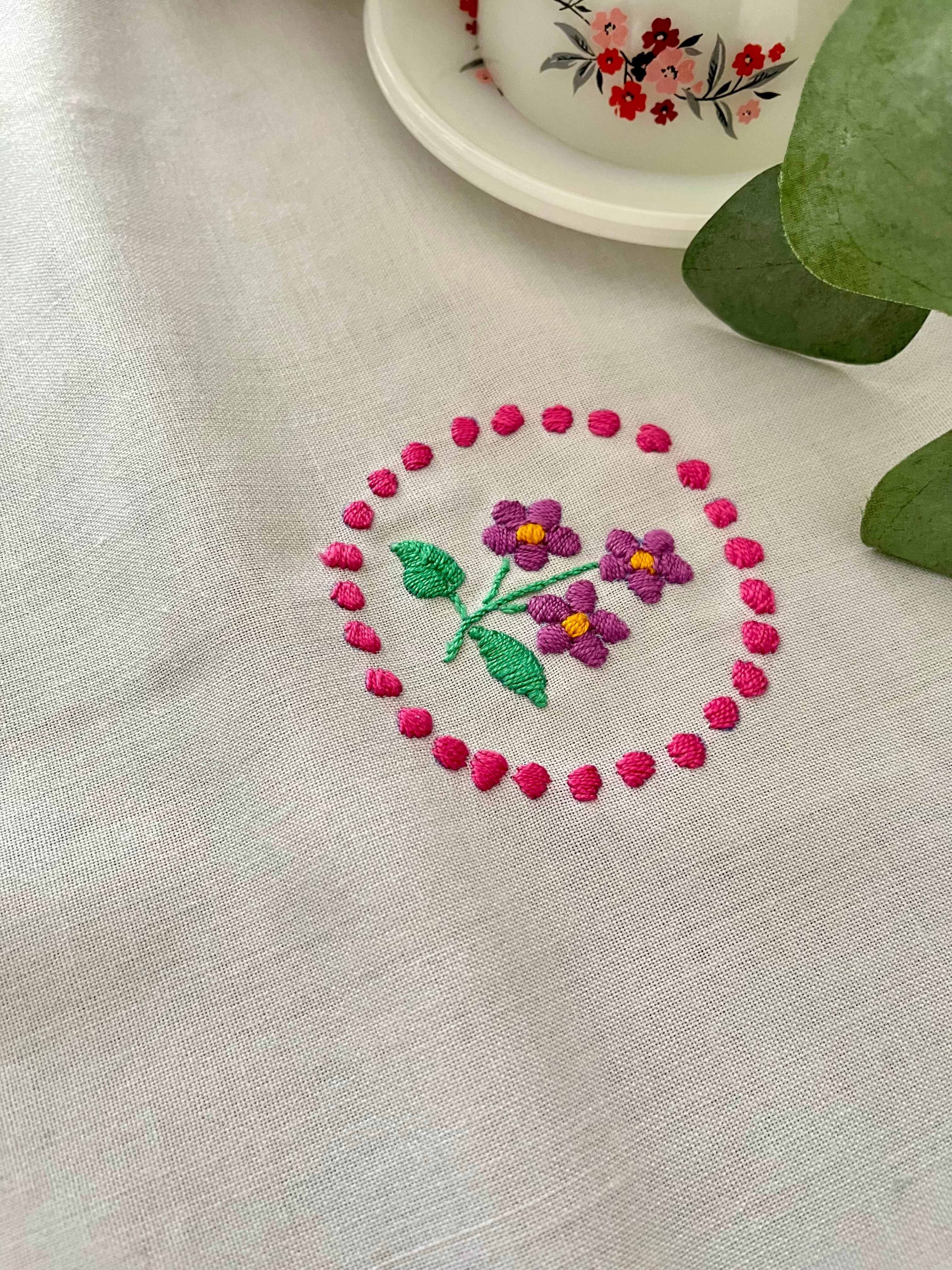 大きなクロスにぷっくり立体的なカラフル刺繍がキュートな1枚。